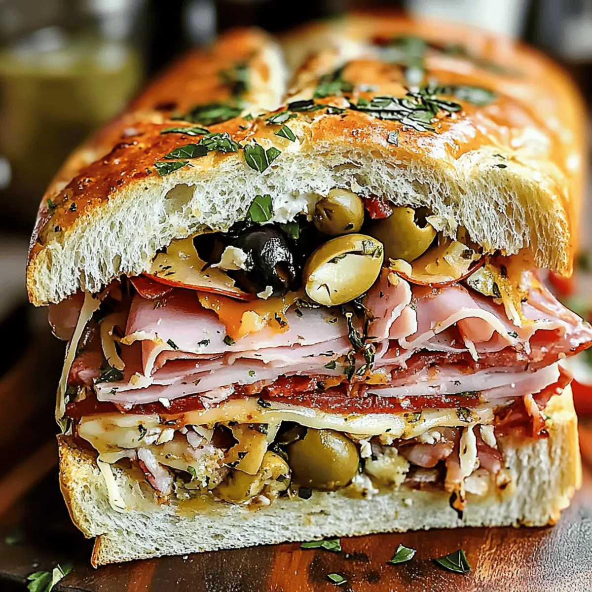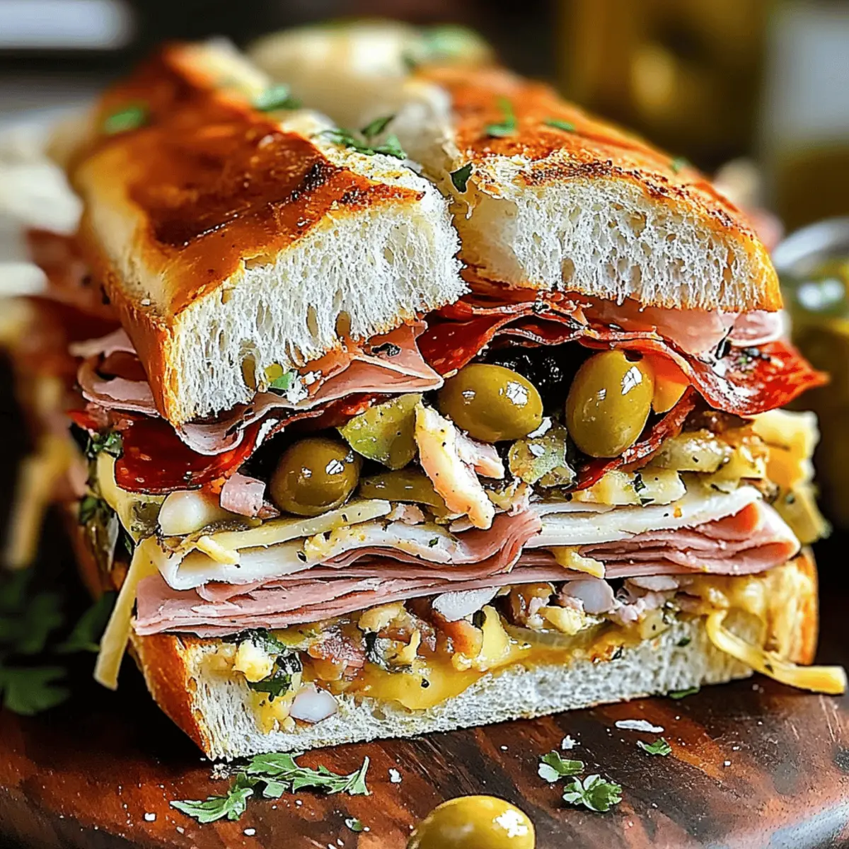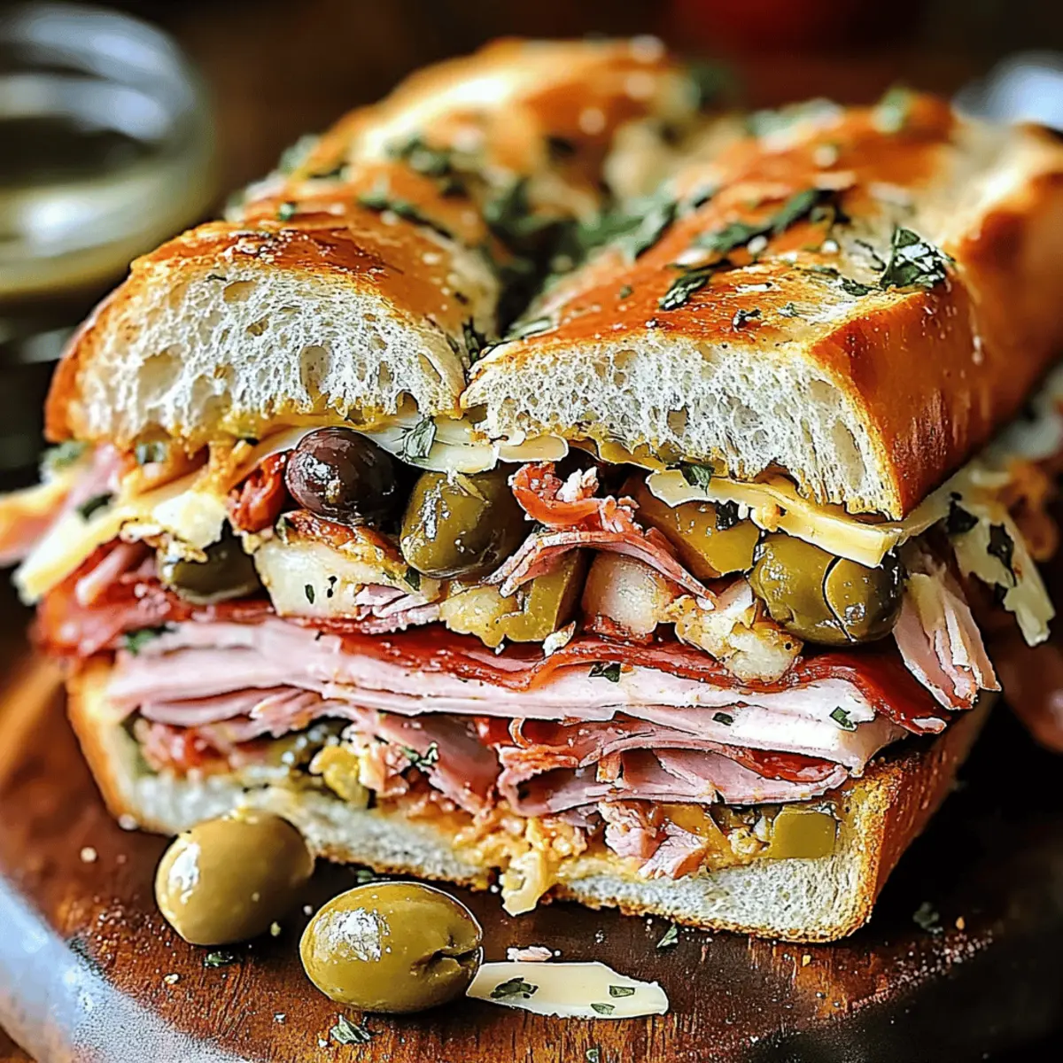 Jump to Recipe Print RecipeThe aroma of marinated olives and cured meats wafting from the kitchen is hard to resist. That’s the magic of the Authentic Muffaletta Sandwich, a beloved New Orleans classic that speaks to both food lovers and casual cooks alike. This easy make-ahead meal is not just about the robust flavors; it’s a crowd-pleaser that saves time during busy days, making it the perfect choice for picnics or game day gatherings. With layers of zesty olive salad, premium deli meats, and rich cheeses, each bite is a delightful experience that gets even better after a few hours in the fridge. Don’t you get excited to explore all those layers of flavor? Let’s dive into this delicious adventure together! Why is Muffaletta Sandwich So Special? Robust Flavors: Each layer blends premium meats and cheeses with a zesty olive salad, creating a bold taste that tantalizes your palate. Easy Make-Ahead Meal: Perfect for busy days, this sandwich improves as it sits, making meal prep a breeze. Crowd-Pleasing Delight: Whether you’re hosting a picnic or game day gathering, it’s a hit with family and friends alike. Versatile Options: Personalize it by swapping meats or cheeses to suit your taste, making it your own! Ambrosial Aroma: The enticing scent of marinated olives and savory meats transforms your kitchen into a culinary haven, inviting all to the table. Authentic Muffaletta Sandwich Ingredients For the Bread Muffaletta Bread – A sturdy base for holding fillings; if unavailable, use a large Italian loaf or ciabatta for great results. For the Olive Salad Black Olives – Adds richness and depth; slice or chop them for better integration into the salad. Green Olives – Brings tartness and contrast; any variety of green olives can work as a substitution. Roasted Red Peppers – Adds sweetness and color; jarred options are easy or roast fresh for deeper flavor. Pepperoncini Peppers – Provides mild heat; feel free to substitute with spicier pickled peppers for a kick. Red Wine Vinegar – Contributes acidity to the olive salad; white wine vinegar can be a substitute if needed. Olive Oil – Enhances flavor and moisture; avocado oil makes a lighter alternative if preferred. Dried Oregano & Dried Basil – Classic herbs that boost flavor; using fresh herbs grants a more vibrant taste. Garlic Powder – Infuses a rich, savory depth; for a more intense flavor, use fresh minced garlic instead. Salt & Pepper – Essential seasonings to enhance overall flavor. For the Assembly Deli Meats – Choose a mix of your favorites like ham, salami, and mortadella; personalize it to suit your taste. Cheeses – Layer with provolone or any cheese style you enjoy for added richness; gouda or aged cheddar can offer a nicely varied taste. With these ingredients in hand, you’re well on your way to creating an Authentic Muffaletta Sandwich that’s packed with flavor and perfect for any occasion! Step‑by‑Step Instructions for Authentic Muffaletta Sandwich Step 1: Prepare the Olive Salad In a mixing bowl, combine sliced black olives, green olives, diced roasted red peppers, and chopped pepperoncini. Drizzle with red wine vinegar and olive oil, then sprinkle in dried oregano, dried basil, garlic powder, salt, and pepper. Mix well until the ingredients are evenly coated, and let the olive salad marinate for at least 30 minutes at room temperature to allow the flavors to mingle beautifully. Step 2: Slice the Bread Take your Muffaletta bread and carefully slice it in half horizontally, creating a top and bottom layer. Use a serrated knife for clean edges, revealing the soft interior. Feel free to scoop out a bit of the bread from the center if you’d like, allowing for extra olive salad and fillings to fit comfortably, ensuring a sturdy base for your sandwich. Step 3: Assemble the Sandwich On the bottom half of the sliced Muffaletta bread, layer your choice of deli meats, starting with ham, followed by salami, and finishing with mortadella. Next, add slices of provolone cheese, ensuring each layer is evenly distributed. Spoon generous amounts of the olive salad over the cheese, making sure to cover every inch for those robust flavors characteristic of the Authentic Muffaletta Sandwich. Step 4: Top and Press Place the top half of the Muffaletta bread gently over the layered ingredients, pressing down slightly to compact the fillings. This pressure helps meld the flavors together during the resting phase. If desired, you can wrap the sandwich tightly in plastic wrap or parchment paper, which helps the ingredients stick together while enhancing the overall taste infusion. Step 5: Wrap and Rest Once assembled and pressed, securely wrap the Muffaletta sandwich in plastic wrap or foil. Allow it to rest in the refrigerator for at least 2 hours or ideally overnight. This resting period lets the flavors fully develop and blend, making each bite of your Authentic Muffaletta Sandwich even more delicious when it’s time to serve. Step 6: Serve and Enjoy When ready to serve, unwrap the sandwich and place it on a cutting board. Slice the Muffaletta into wedges or halves, revealing the vibrant layers inside. Serve it chilled or at room temperature, and watch as your family and friends delight in this iconic New Orleans creation, filled with tempting flavors and textures! Make Ahead Options These Authentic Muffaletta Sandwiches are perfect for meal prep enthusiasts! You can prepare the olive salad up to 24 hours in advance, allowing the flavors to marry beautifully. Simply combine the sliced olives, roasted red peppers, and seasonings and refrigerate. Additionally, you can layer the meats and cheeses in the bread and wrap the assembled sandwich, letting it rest for up to 3 days for optimal flavor blending. Just remember to keep it tightly wrapped in plastic wrap to prevent dryness. When it’s time to serve, simply slice into wedges and enjoy the delightful, robust flavors that have only intensified over time! How t