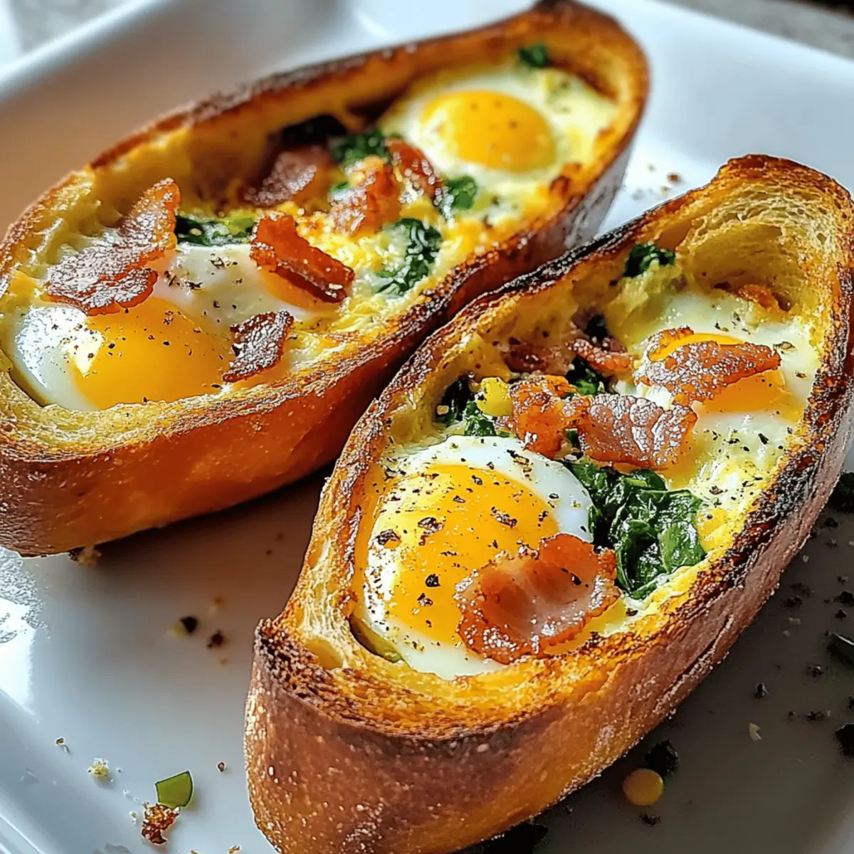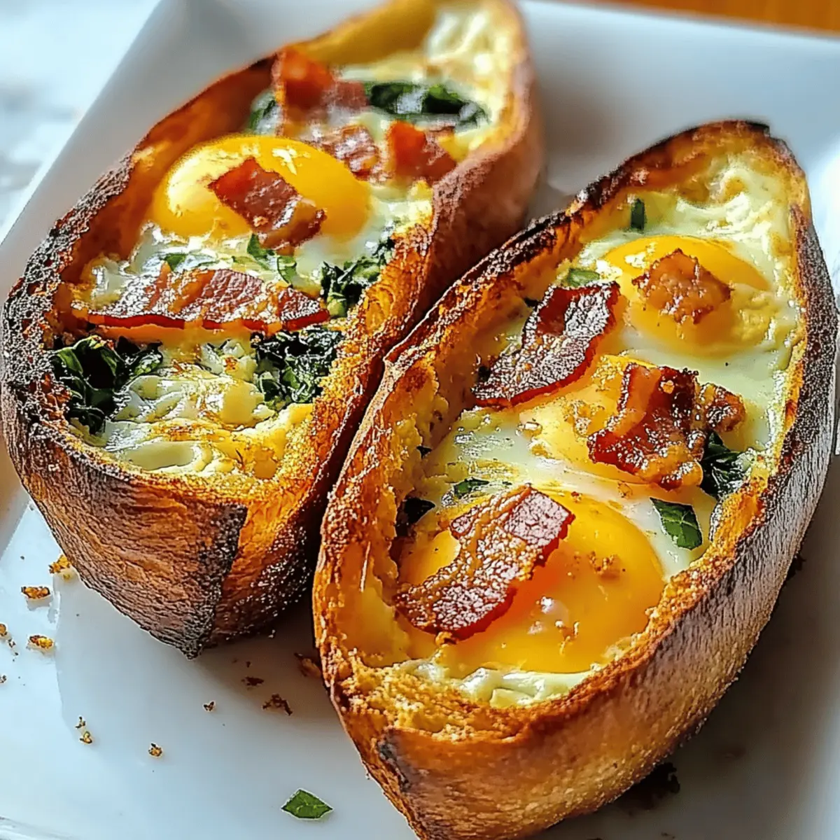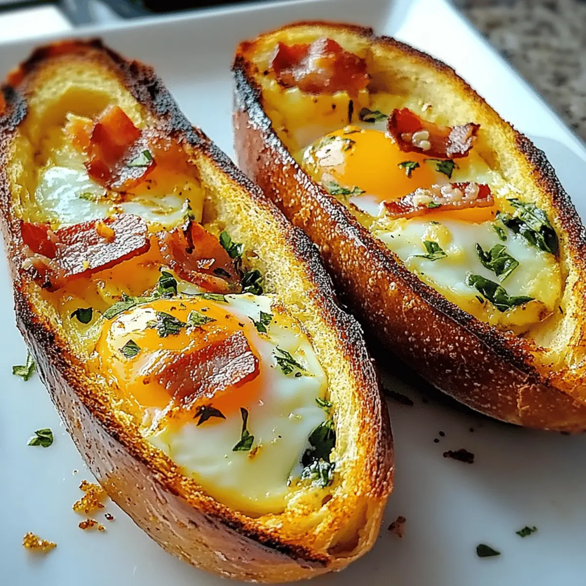 Jump to Recipe Print RecipeAs I stood in my kitchen on a lazy Sunday morning, the delightful aroma of turkey bacon sizzling on the stove made my stomach rumble. That’s when the idea hit me: why not take breakfast up a notch with these vibrant Baked Egg Boats? This savory treat not only lifts the spirits with its colorful filling of spinach and bell peppers but also caters to both rushed weekdays and leisurely brunches. They’re a protein-rich comfort food, providing a warm, hearty start to your day while keeping prep shockingly simple. Plus, with the flexibility to switch up ingredients based on preferences or leftovers, these baked delights encourage creativity in the kitchen. Curious how to make your mornings more delicious? Let’s dive into these scrumptious Baked Egg Boats together! Why are Baked Egg Boats a must-try? Flavor Explosion: Every bite of these Baked Egg Boats delivers a medley of savory goodness, thanks to the turkey bacon and fresh vegetables. Simple to Prepare: In just minutes, you can assemble the ingredients and pop them in the oven—perfect for busy mornings or weekend brunches. Total Comfort Food: Warm and satisfying, these boats provide a delightful way to start your day, turning the ordinary into something extraordinary. Customizable Delight: Feel free to experiment with different fillings! Whether you prefer ham or want a vegetarian option, your creativity can shine here. Impressive Presentation: Set these colorful boats on the table and watch your friends and family’s eyes light up—perfect for impressing guests at gatherings! For more easy breakfast ideas, check out our Baked Smashed Potatoes with Garlic Parmesan for a fun side, or indulge in some flavorful Parmesan Deviled Eggs for an appetizer that pairs beautifully with your baked egg boats. Baked Egg Boats Ingredients For the Boats Crusty Bread – A rustic loaf like sourdough works best as it holds the filling without getting soggy. Large Eggs – Provides a rich, creamy texture; organic or free-range eggs enhance flavor. For the Filling Turkey Bacon – Adds a savory kick; feel free to use pork bacon or omit for a vegetarian option. Fresh Spinach – Packed with nutrients and adds a vibrant color; either fresh or frozen works perfectly. Bell Peppers – Sweet and crunchy; mix and match colors or switch to zucchini or mushrooms. Shredded Cheese – Provides delightful meltiness; cheddar or mozzarella are fantastic choices, or use dairy-free cheese for a vegan version. For the Egg Mixture Milk or Cream – Enhances the creaminess; pick full-fat milk or a non-dairy alternative for vegans. Salt & Pepper – Essential for flavor; season to your taste for a perfectly balanced dish. With these simple yet versatile ingredients, you can whip up delightful Baked Egg Boats that make breakfast feel special every day! Step‑by‑Step Instructions for Baked Egg Boats Step 1: Bread Preparation Preheat your oven to 375°F (190°C). While the oven is heating, take your crusty bread and carefully hollow out the insides, creating ‘boats’ for the Baked Egg Boats. Be sure to leave enough bread at the bottom and sides to hold the filling without leakage. Set aside the removed bread for potential later use in a stuffing or bread pudding. Step 2: Filling Cooking In a skillet over medium heat, cook diced turkey bacon until it becomes crispy, about 5-7 minutes. As the bacon cooks, add chopped spinach and bell peppers, sautéing for an additional 3-4 minutes until the vegetables are tender and vibrant. This step ensures your filling is packed with flavor and nutrients, a perfect complement to your egg boats. Step 3: Egg Mixture In a mixing bowl, whisk together large eggs with a splash of milk or cream. Season the mixture generously with salt and pepper to taste. Make sure the eggs are fully combined and light in color, which indicates they’re ready to create a rich, creamy filling for your Baked Egg Boats. Set this mixture aside while you assemble the boats. Step 4: Assembly Take the hollowed bread boats and fill each one generously with the sautéed turkey bacon and vegetable mixture. Carefully pour the egg mixture over the filling, allowing it to settle and combine with the ingredients. Finally, sprinkle your choice of shredded cheese on top, ensuring even coverage for that delightful melty texture everyone loves. Step 5: Baking Place the assembled Baked Egg Boats on a baking sheet and put them in the preheated oven. Bake for approximately 25-30 minutes, or until the eggs are set and the tops are golden and bubbly. Keeping an eye on them will help you achieve that perfect golden color and a well-cooked interior. Step 6: Serving Once baked, let the Baked Egg Boats cool for a few minutes before serving. This resting time helps set the filling, making it easier to slice and serve. You can serve them whole or cut them in half, perfect for sharing or enjoying at your own pace. Expert Tips for Baked Egg Boats Bread Choice: Make sure to use sturdy crusty bread to prevent sogginess. Sourdough, French, or artisanal loaves work best for these Baked Egg Boats. Don’t Rush: Allow the egg boats to rest for about 5 minutes post-baking. This helps the filling set, making for easier slicing and serving. Ingredient Substitutes: Feel free to swap out turkey bacon for ham or veggies based on your pantry. This flexibility keeps meal prep exciting and tailored to your tastes. Veggie Prep: Sauté your vegetables thoroughly to enhance flavor and ensure they’re tender. Avoid adding raw veggies, as they may not cook through in the oven. Check for Doneness: Keep an eye on the baking time; ovens can vary. The egg should be set, and the cheese should melt and bubble for perfect results. Customize Seasoning: Adjust the salt and pepper to suit your palate. Don’t hesitate to add herbs or spices to personalize your Baked Egg Boats further! Make Ahead Options These Baked Egg Boats are a wonderful meal prep option for busy mornings! You can as