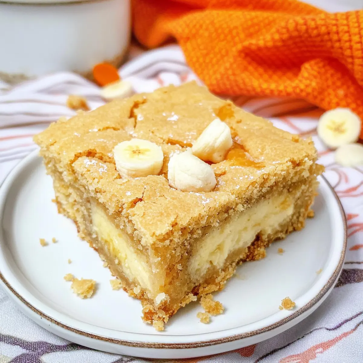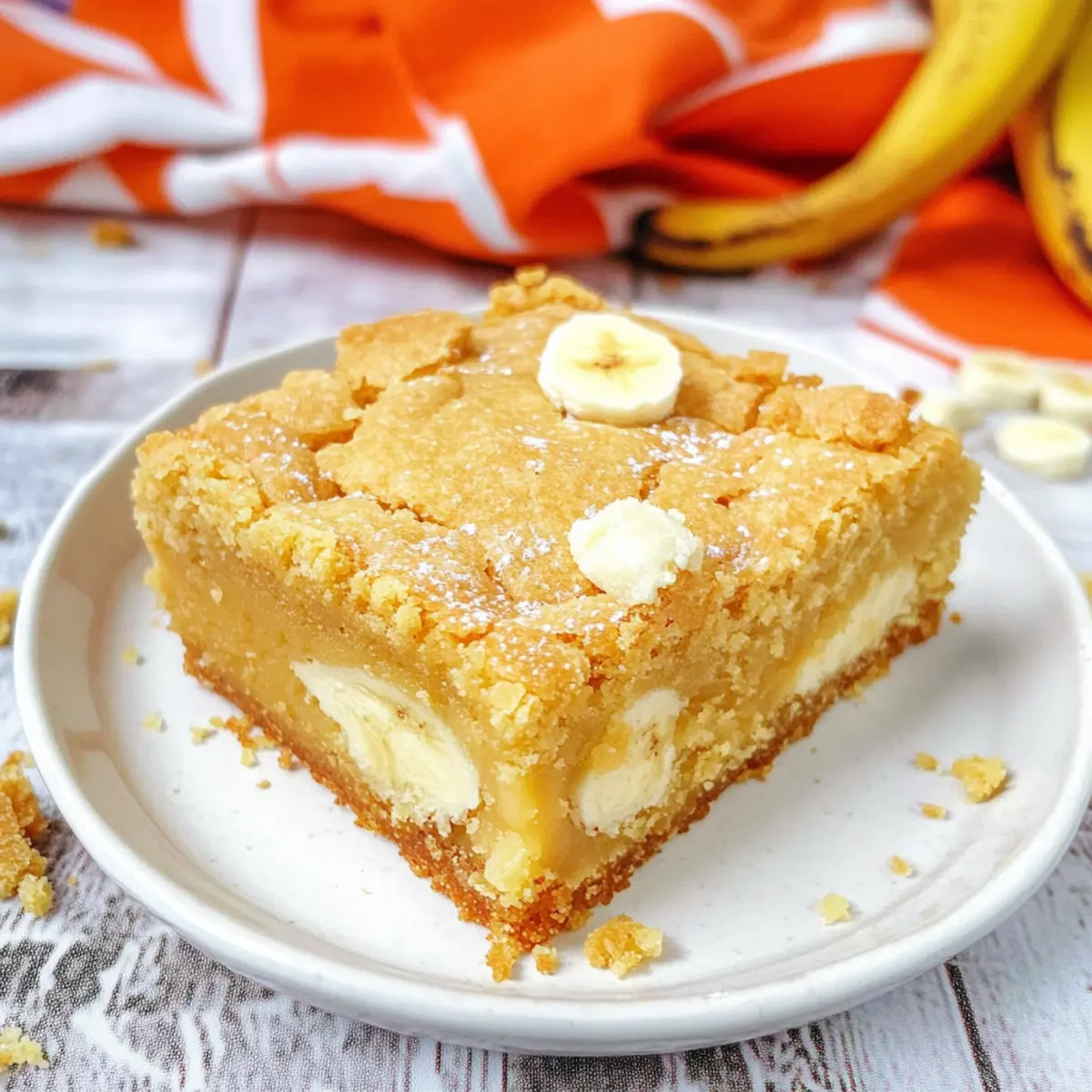 Jump to Recipe Print RecipeThe aroma of sweet bananas wafts through the kitchen, instantly transporting me back to summer picnics where desserts were the undeniable stars. My Soft and Chewy Banana Blondies are a twist on classic banana pudding, cleverly baked into luscious bars that are both fun and comforting. With the delightful crunch of a buttery vanilla wafer crust, these blondies are not only a fantastic homemade treat but also a quick dessert solution for unexpected guests or a satisfying after-school snack. You’ll love how effortlessly they come together, and who can resist that soft, chewy center paired with bursts of sweet white chocolate? Ready to experience a new favorite? Let’s dive into this delicious recipe! Why Are These Banana Blondies So Special? Irresistible Flavor: Each bite features a delightful mix of banana and creamy white chocolate, reminiscent of your favorite banana pudding. Quick to Make: Prep and bake in just about 30 minutes, making them perfect for impromptu gatherings. Textures That Wow: The buttery vanilla wafer crust adds a satisfying crunch, beautifully contrasting the soft, chewy blondie. Customizable Goodness: Try variations like dark chocolate chips or nuts for a personal touch. You can even make a fun twist with our Chunky Monkey Banana version! Crowd Favorite: These blondies are loved by both kids and adults, ensuring they’ll disappear at any gathering. Easy Storage: Keep them fresh in an airtight container, perfect for enjoying throughout the week! Banana Blondies Ingredients For the Crust Vanilla Wafers – About 1 ½ boxes needed; crushed for texture creates a flavorful base. Unsalted Butter – Provides richness; substitute with coconut oil or margarine if needed. For the Blondie Base All-Purpose Flour – Essential for structure; spoon it into the measuring cup for accuracy. Baking Soda – This leavening agent helps the blondies rise, giving them a delightful texture. Salt – Enhances flavor; if using salted butter, adjust accordingly. Granulated Sugar – Balances sweetness and moisture; can replace with brown sugar for a deeper flavor. Instant Banana Pudding Mix – Adds luscious banana flavor and moisture; avoid cook-and-serve pudding varieties. Eggs – Binds ingredients together; use room temperature eggs for better mixing. Vanilla Extract – Infuses aromatic flavor; opt for pure for the best taste. White Chocolate Chips – Adds sweetness and creaminess; semi-sweet chocolate can be an alternative. These Banana Blondies are sure to become a beloved addition to your dessert repertoire! Step‑by‑Step Instructions for Banana Blondies Step 1: Preheat and Prepare the Pan Start by preheating your oven to 400°F (200°C). While the oven warms up, grab a 9×13 inch baking pan and generously coat it with cooking spray to ensure easy removal of your delicious Banana Blondies later on. Step 2: Crush the Vanilla Wafers Place about 1 ½ boxes of vanilla wafers into a resealable plastic bag and crush them using a rolling pin or your hands until they become fine crumbs. Set aside 1 cup of the crushed wafers for later use; the rest will form the base of your crunchy, buttery crust. Step 3: Make the Crust In a large mixing bowl, combine the remaining crushed vanilla wafers with ¾ cup of melted unsalted butter. Stir the mixture well until all crumbs are coated, then press it firmly into the bottom of the prepared baking pan. Bake this crust in the preheated oven for about 5 minutes until it’s lightly golden and fragrant. Step 4: Mix the Dry Ingredients While the crust is baking, take another bowl and whisk together 1 cup of all-purpose flour, ½ teaspoon of baking soda, ¼ teaspoon of salt, 1 cup of granulated sugar, and 1 package of instant banana pudding mix. Ensure everything is evenly blended, as this step helps create the perfect texture for your Banana Blondies. Step 5: Combine Wet Ingredients In a separate bowl, beat together 2 room-temperature eggs, 1 teaspoon of vanilla extract, and the remaining ¼ cup of melted butter. Mix until well incorporated, and then gently fold this wet mixture into the dry ingredients, stirring only until just combined to keep your blondies light and airy. Step 6: Fold in Chips and Reserved Wafers Now, carefully fold in 1 cup of white chocolate chips along with the reserved 1 cup of crushed vanilla wafers. Be gentle during this step to maintain the fluffiness of the batter, which will create the soft, chewy texture your Banana Blondies are known for. Step 7: Bake the Blondies Spread the blondie batter evenly over the pre-baked crust in the pan, smoothing the top with a spatula. Return the pan to the oven and bake for 15 to 20 minutes. Keep an eye on them, as they will be done when the edges are golden brown and a toothpick inserted in the center comes out with a few moist crumbs. Step 8: Cool and Slice Once your Banana Blondies are baked to perfection, remove them from the oven and let them cool in the pan on a wire rack. This cooling time allows them to set properly. After about 30 minutes, slice them into squares and enjoy this delightful treat, bursting with flavor and nostalgia! Expert Tips for Banana Blondies Room Temperature Ingredients: Using eggs and butter at room temperature helps create a smoother batter, yielding a softer texture for your Banana Blondies. Gentle Mixing: Avoid overmixing the batter; stir until just combined to prevent a dense outcome. This lightness is key for the perfect blondie! Watch the Oven: Keep a close eye on your blondies while they bake. Overbaking can lead to dryness—remove them when the edges turn golden and a toothpick comes out with moist crumbs. Cooling Time: Allow your Banana Blondies to cool completely in the pan before slicing. This ensures cleaner cuts and helps them hold their shape. Customize Wisely: When adding mix-ins like nuts or chocolate, go easy on the extras. Balance is essential; you want the banana flavor to shine through! Banana Blondies Customiza