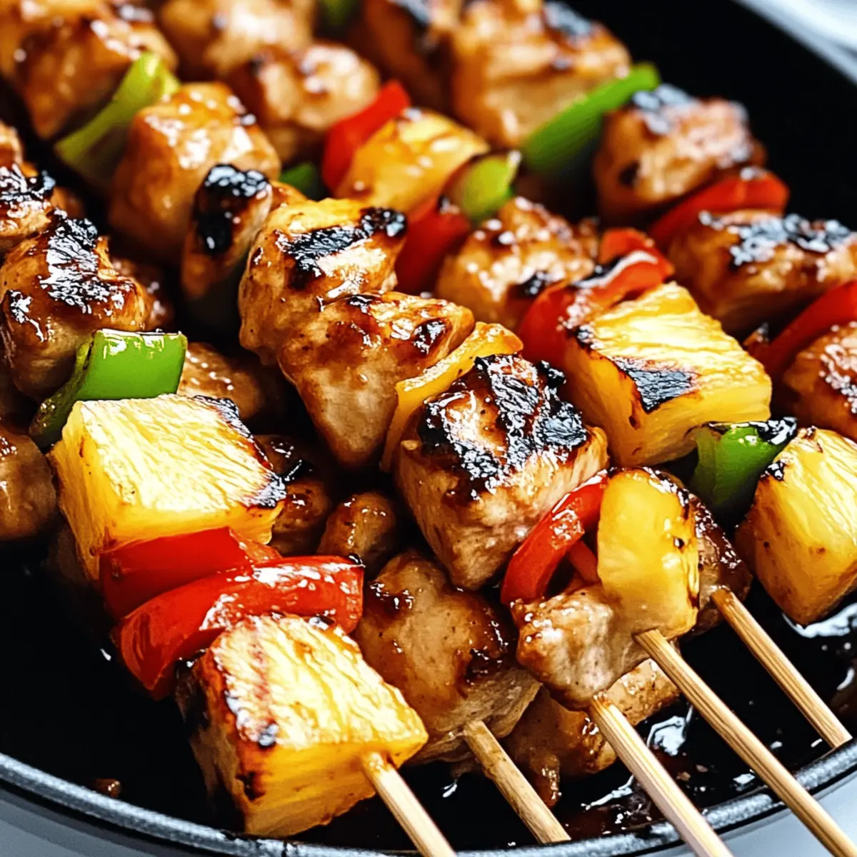 Jump to Recipe Print RecipeAs the sun dips low and the scent of the grill fills the air, there’s something undeniably magical about summer evenings. I’m always on the lookout for ways to elevate our backyard gatherings, and these BBQ Pineapple Chicken Kabobs have become my secret weapon. A feast that beautifully showcases the juicy sweetness of pineapple intertwined with tender, grilled chicken and vibrant veggies, this dish is amazing for any summer celebration. What’s even better? They come together in a flash, making them perfect for weeknight meals or impromptu get-togethers—all while being gluten-free! Whether you’re feeding family or impressing friends, these kabobs are a guaranteed crowd-pleaser that’ll keep everyone coming back for seconds. Ready to fire up the grill? Let’s dive into this delicious recipe that will have your taste buds dancing! Why are BBQ Pineapple Chicken Kabobs a Must-Try? Flavor Explosion: These kabobs are a vibrant mix of sweet, smoky, and savory flavors that elevate any meal. Each bite showcases juicy pineapple and tender chicken, making them irresistible! Quick and Easy: With minimal prep and grill time, you’ll be serving up this delight in under 30 minutes—ideal for busy weeknights or last-minute gatherings. Versatile Substitutions: While the classic version shines, feel free to swap in peaches or mango for a twist or add a kick of jalapeño. Health-Conscious Choice: These kabobs are not just delicious; they’re also gluten-free and packed with protein and vitamins, making them a guilt-free indulgence. Crowd-Pleasing Appeal: Perfect for any summer barbecue, these kabobs are sure to have your guests raving. Serve alongside a fresh salad or some grilled corn for a complete meal! Ready to explore more flavorful options? Check out my Honey BBQ Chicken for another delicious grilling adventure! BBQ Pineapple Chicken Kabob Ingredients For the Kabobs Chicken Breast – the main protein source; ensure it’s cubed evenly for uniform cooking. Pineapple – adds sweetness and moisture; can be replaced with peaches or mango for variety. Red Bell Pepper – contributes color and crunch; substitute with yellow or orange peppers for sweetness. Green Bell Pepper – offers a slight bitterness and freshness; can be omitted if preferred. Red Onion – adds a sweet and tangy flavor; white or yellow onion can be used instead. For the Marinade Barbecue Sauce – provides flavor; choose your favorite brand for a sweet or smoky kick. Olive Oil – helps in cooking and adds richness. Garlic Powder – enhances flavor; fresh garlic may be substituted if desired. Onion Powder – complements garlic; can be omitted if not available. Salt & Black Pepper – seasoning essentials for enhancing overall taste. Elevate your summer grilling experience with these BBQ Pineapple Chicken Kabobs that blend sweet and savory bliss! Step‑by‑Step Instructions for BBQ Pineapple Chicken Kabobs Step 1: Preheat the Grill Begin by preheating your grill to medium-high heat, around 400°F (200°C). If you’re using wooden skewers, soak them in water for about 30 minutes to prevent burning. This ensures your BBQ Pineapple Chicken Kabobs have a nice char without the skewer catching fire, creating the perfect canvas for your flavorful ingredients. Step 2: Prepare the Ingredients In a large mixing bowl, combine evenly cubed chicken breast, fresh pineapple chunks, and colorful bell peppers, along with red onion pieces. Toss them gently to ensure everything is coated evenly. This step is crucial as it allows the flavors to mingle, setting up a delicious base for your kabobs. Step 3: Assemble the Kabobs Thread the marinated chicken, pineapple, and vegetable pieces onto the soaked skewers, alternating them for a vibrant display. Aim for a balanced mix with each skewer holding 2-3 pieces of chicken followed by a piece of pineapple and veggies. This arrangement not only looks attractive but also helps in even cooking during grilling. Step 4: Mix the Marinade In a separate bowl, whisk together your favorite barbecue sauce, a splash of olive oil, garlic powder, onion powder, salt, and black pepper. This marinade will enhance the flavor of your BBQ Pineapple Chicken Kabobs. Make sure it’s well-blended, as each skewer should receive a good coating for that irresistible smoky taste. Step 5: Marinate the Kabobs Generously coat the assembled skewers with the marinade you just prepared. Allow the kabobs to sit for at least 15 minutes; this step helps infuse the flavors into the chicken and vegetables. If you have time, marinate them longer in the refrigerator for an even deeper flavor profile. Step 6: Grill the Kabobs Place the kabobs on the preheated grill and cook them for about 10-15 minutes. Turn them occasionally to ensure even cooking and monitor their progress. They’re done when the chicken reaches an internal temperature of 165°F (74°C) and the pineapple is caramelized with a slight char. Step 7: Rest and Serve Once cooked, remove the kabobs from the grill and let them rest for a few minutes. This step allows the juices to redistribute, keeping the chicken moist. Serve warm, perhaps alongside a fresh salad or grilled corn, making your BBQ Pineapple Chicken Kabobs the highlight of your summer gathering! BBQ Pineapple Chicken Kabobs: Creative Twists Feel free to let your imagination run wild and give these kabobs your personal touch! Dairy-Free: Eliminate any cheese toppings to keep it dairy-free. Enjoy the fruity and savory goodness without compromising your dietary needs! Spicy Heat: Add jalapeños to the skewers for a burst of heat that pairs beautifully with sweet pineapple. Extra spice will definitely wake up your taste buds! Fruity Variation: Swap out the pineapple for mango or peaches for a completely different flavor profile. The natural sugars in these fruits caramelize nicely on the grill, adding that summer vibe! Veggie Boost: Toss in zucchini or cherry tomatoes for added nut