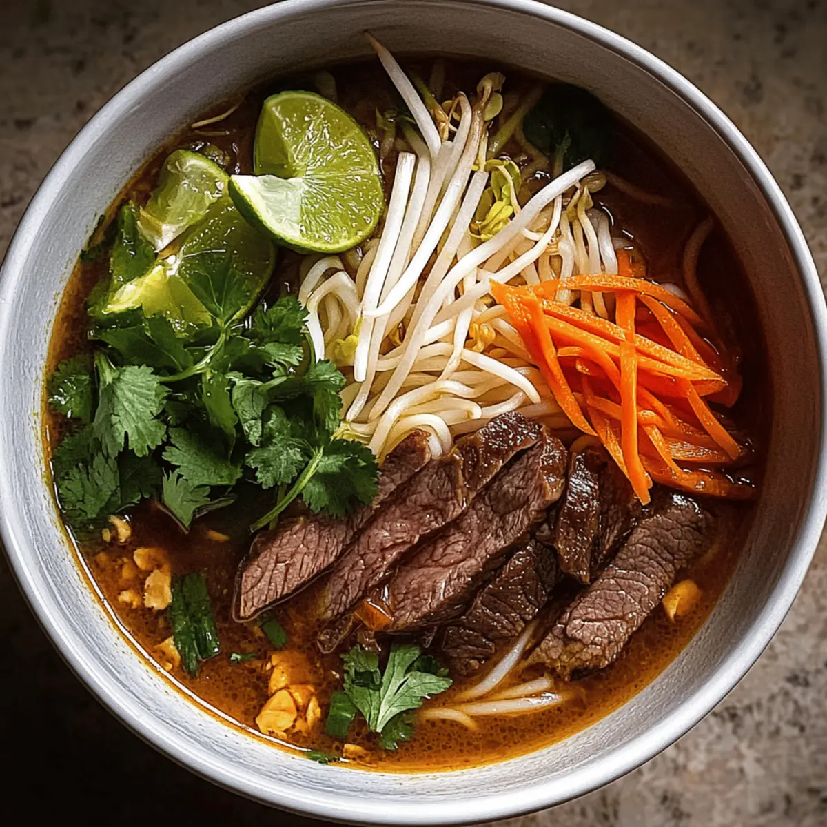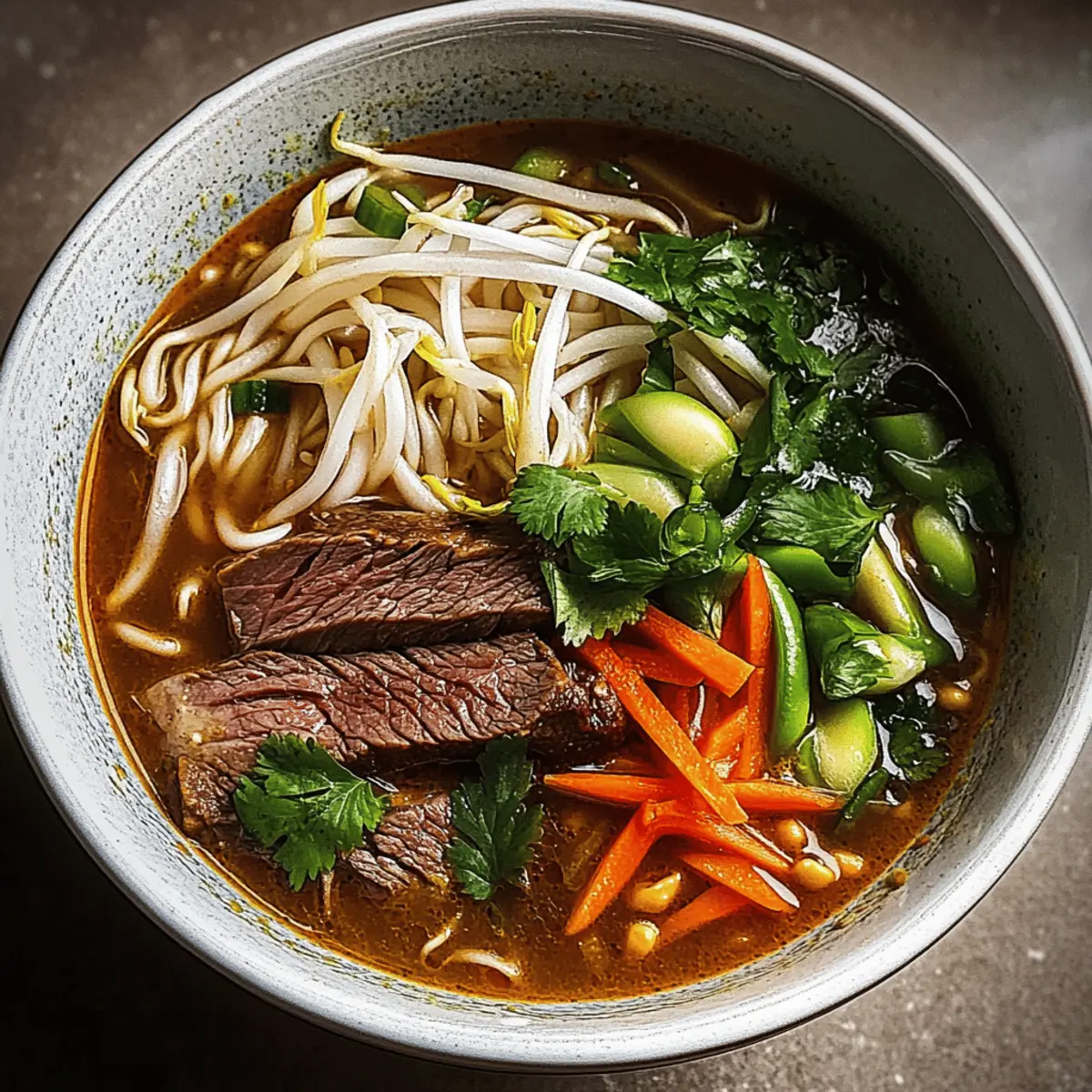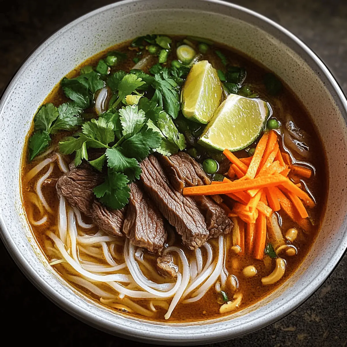 Jump to Recipe Print RecipeThe aroma of a simmering pot instantly stirs the senses, evoking memories of bustling night markets and comforting family dinners. This comforting Satay Beef Noodle Soup combines tender beef sirloin with delicate rice noodles, all nestled in a lavishly rich, peanut-infused broth. As the warm, nutty flavors unfold, you’ll discover it’s the perfect remedy for hectic weeknights or cozy afternoons. What makes this dish even more delightful? It’s not only quick to prepare but also effortlessly adaptable for anyone looking to customize their meal. Whether you’re swaying towards a plant-based twist or sticking with an Asian-inspired classic, this Beef Noodle Soup is a comforting hug in a bowl. Ready to whip up a steaming batch of comfort food magic? Let’s dive into the details! Why Will You Love This Beef Noodle Soup? Comforting Flavors: This Beef Noodle Soup is a warm hug for your taste buds, featuring the rich, nutty notes of satay that balances beautifully with fresh vegetables. Quick & Easy: With just a handful of ingredients, you’ll have a delicious meal on the table in no time—perfect for those busy weeknights! Versatile Recipe: Not a beef fan? Switch to tofu or whole wheat noodles, creating a delightful vegan variant while still savoring that satisfying broth. Crowd-Pleasing Dish: Serve it family-style, letting everyone customize their bowls—bean sprouts, fresh lime, and herbs, all create a fun dining experience! Hearty & Nourishing: Each bowl offers a nourishing blend of protein, carbs, and flavor, with around 450 calories per serving, making it a wholesome option. Sip on this deliciously comforting soup when you’re seeking warmth, or check out our Chilli Beef Rice for another hearty meal option! Beef Noodle Soup Ingredients For the Soup Base • Beef Sirloin or Flank Steak – Use thinly sliced meat against the grain for a tender texture; opt for flank steak for richer flavors. • Beef Stock – Provides depth and warmth; homemade or store-bought works well. • Vegetable Oil – Essential for sautéing aromatics; sesame oil can enhance the dish’s flavor profile. For the Noodles • Rice Noodles – The main carbohydrate that gives chewiness; substitute with egg noodles for a twist. For the Aromatics • Onion – A sweet base layer; yellow onion is a versatile choice for enhancing flavor. • Garlic (Minced) – Fresh garlic adds a pungent kick, and adjusts the quantity to match your preference. • Ginger (Grated) – Fresh ginger contributes warmth and balances the soup nicely. For Flavoring • Satay Sauce – The star ingredient that brings nutty, spicy notes; ensure it’s not overly sweet for best results. • Soy Sauce – Adds umami; low-sodium options are available for a healthier alternative. • Fish Sauce – Offers a deep savory flavor; use sparingly depending on your taste. • Sugar – Just a dash balances the intense flavors, rounding out the broth. For Vegetables and Garnishes • Carrot (Julienned) – Adds sweetness, and maintains its crunch when added late in cooking. • Bean Sprouts – For a fresh crunch; add them just before serving to keep their texture. • Spring Onions – A fresh garnish that provides a mild onion flavor. • Fresh Coriander Leaves – Brightens the dish, enhancing the overall flavor profile. • Lime Wedges – Serve on the side to add brightness with acidity; a perfect complement to the salty flavors. To Taste • Salt and Pepper – Essential for seasoning; add to achieve your desired taste. This Beef Noodle Soup not only warms you from the inside out but is also a delightful meal that invites endless customization! Step‑by‑Step Instructions for Comforting Satay Beef Noodle Soup Step 1: Prepare Beef Thinly slice the beef sirloin against the grain, ensuring uniform pieces for tenderness. This will allow the meat to cook evenly in the broth. Set the sliced beef aside on a clean cutting board to prevent contamination while you prepare the rest of the ingredients. Step 2: Cook Noodles Bring a pot of water to a rolling boil, and add the rice noodles according to the package instructions. Usually, they will need about 3-5 minutes to become tender yet chewy. Once done, drain the noodles and rinse them briefly under cold water to stop the cooking process, then set aside in a bowl. Step 3: Sauté Aromatics In a large pot, heat 2 tablespoons of vegetable oil over medium heat. Once the oil is shimmering, add the chopped onion, minced garlic, and grated ginger. Sauté for about 3-4 minutes until the onion is translucent and fragrant, stirring occasionally to prevent browning. Step 4: Incorporate Satay Sauce Stir in the satay sauce, mixing well with the sautéed aromatics. Allow the mixture to cook for another 1-2 minutes, letting the flavors meld together. The aroma will begin to deepen, signaling that it’s time to move on to the next stage of your comforting Beef Noodle Soup. Step 5: Add Stock and Seasoning Pour in 4 cups of beef stock, along with 2 tablespoons of soy sauce, 1 tablespoon of fish sauce, and 1 teaspoon of sugar. Stir to combine and bring the mixture to a gentle simmer over medium-high heat for about 2 minutes. The broth should become fragrant and ready to embrace the beef. Step 6: Cook Beef Introduce the sliced beef to the simmering broth, allowing it to cook for 2-3 minutes. Watch as the beef turns lightly browned and is just cooked through, remaining tender. Make sure not to overcook, as you want each slice to maintain its juiciness in your delightful Beef Noodle Soup. Step 7: Add Vegetables Stir in the julienned carrots and bean sprouts into the pot. Continue simmering for an additional 2 minutes, allowing the veggies to soften slightly while still retaining their crunch. This addition will elevate the texture and flavor, making the soup even more satisfying. Step 8: Adjust Seasoning Taste your soup and adjust the seasoning as needed with salt and pepper. This is your moment 