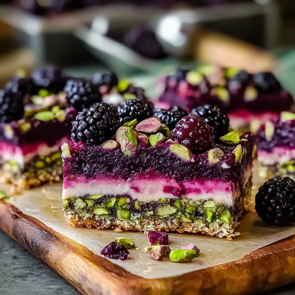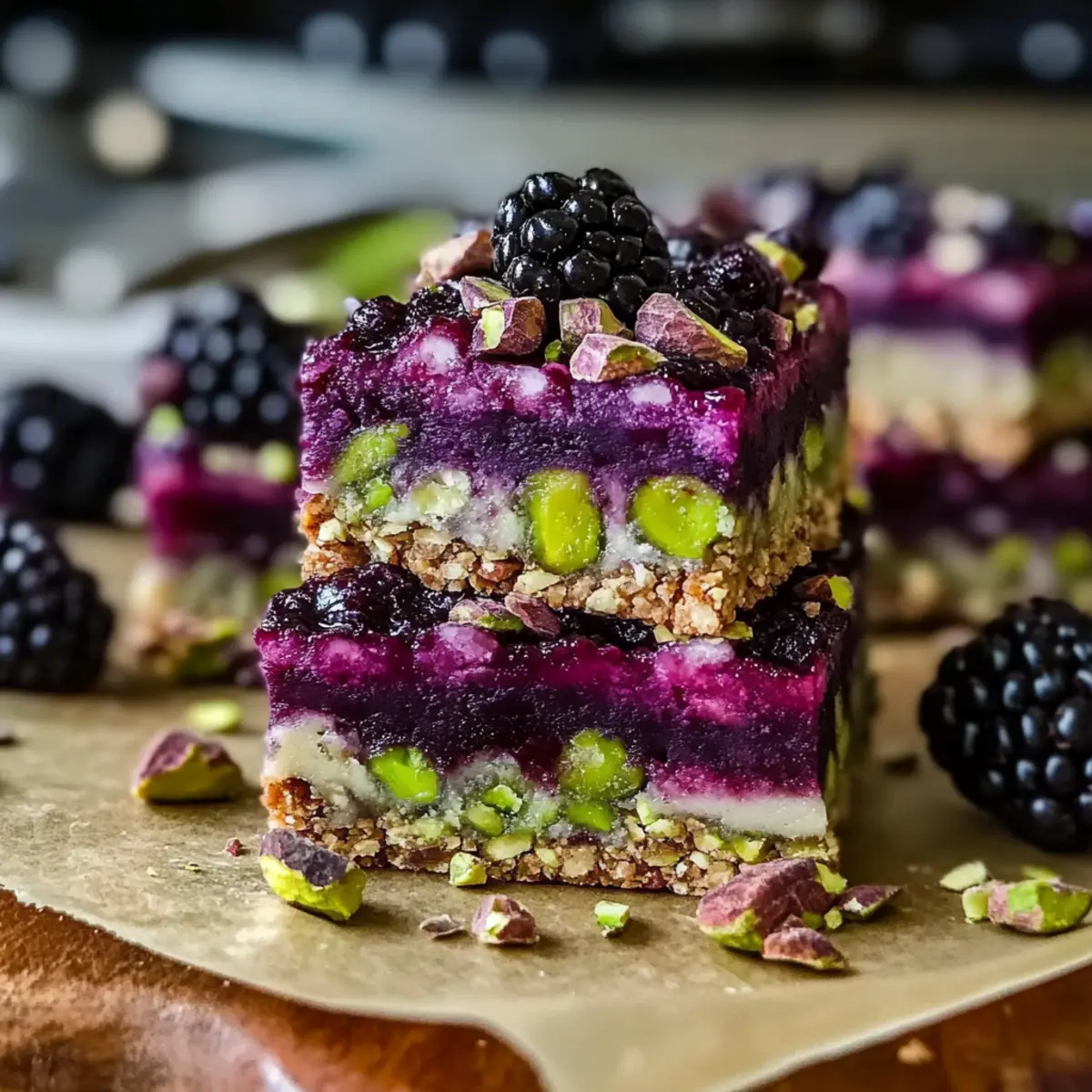 Jump to Recipe Print RecipeAs the sun sets and a gentle breeze wafts through the kitchen, I find myself drawn to a delightful sweet escape: Blackberry Pistachio Dream Bars. These no-bake wonders are not just a feast for the eyes; they are a perfect symphony of rich pistachio creaminess and the vibrant tartness of fresh blackberries. With their creamy layers and striking appearance, they are sure to impress at any gathering, making them an irresistible crowd-pleaser. Plus, they require minimal effort—ideal for those of us who prefer homemade indulgence over fast food. Are you ready to elevate your dessert game and treat yourself? Let’s dive into this easy recipe that’s bound to become a favorite! Why Will You Adore These Bars? Irresistible Layers: The combination of creamy pistachio and tart blackberry creates a taste experience that lingers with each bite. No-Bake Delight: Enjoy the simplicity of making these bars without turning on the oven, saving you time and energy. Visually Stunning: Their vibrant colors make these bars a showstopper at any gathering, sure to impress family and friends. Adaptable Ingredients: With options to substitute ingredients, like using raspberries or cashew cream, you can easily personalize the recipe to your taste. Ideal for Any Occasion: Whether it’s a casual family dinner or a festive celebration, these bars are the perfect sweet ending. Pair these treats with a refreshing glass of Whipped Pink Lemonade for an uplifting dessert experience! Blackberry Pistachio Dream Bars Ingredients For the Base • Digestive Biscuits – Provides structure and a crunchy base; substitute with crushed graham crackers for a sweeter flavor. • Pistachios (ground) – Adds rich, earthy flavor and creaminess; pulse shelled nuts in small batches to avoid over-processing. • Heavy Cream – Binds the pistachio mixture while providing a smooth texture; use cold cream straight from the fridge for best results. For the Cream Layer • Cream Cheese – Contributes creaminess and tanginess to the bars; bring to room temperature naturally for a lump-free mixture. For the Topping • Fresh Blackberries – Adds vibrant color and tartness to the topping; ensure they are rinsed and dried to avoid excess moisture. • Cornstarch – Used for thickening the berry topping; whisk with sugar first to prevent clumping. • Pistachios (chopped) – Adds texture and visual appeal to the garnish; chop by hand for varied piece sizes. Get ready to whip up these stunning Blackberry Pistachio Dream Bars that will leave everyone craving more! Step‑by‑Step Instructions for Blackberry Pistachio Dream Bars Step 1: Prepare the Base Begin by crushing the digestive biscuits in a food processor until they resemble fine crumbs. In a mixing bowl, combine the crushed biscuits with ground pistachios, then pour in the cold heavy cream. Stir the mixture together until it’s thoroughly combined and has a workable consistency that holds when pressed together. This will form the delicious base for your Blackberry Pistachio Dream Bars. Step 2: Layer the Mixture Spread the pistachio mixture evenly in a 9×9 inch or similar-sized pan, pressing it down firmly with a spatula to ensure an even layer. Place the pan in the refrigerator to chill for about 15 to 20 minutes, allowing the base to firm up slightly. The chilling time helps create a sturdy foundation for the luscious layers to come. Step 3: Create the Blackberry Topping In a medium saucepan over medium heat, combine the fresh blackberries, sugar, and cornstarch. Stir frequently until the mixture begins to boil and thicken, around 5 to 7 minutes, turning from a juicy consistency to a beautifully thickened topping. Remove from heat and let it cool slightly to avoid melting the cream cheese layer when spreading. Step 4: Assemble the Layers After the pistachio base has chilled, take it out of the refrigerator and prepare the cream cheese layer. In a separate bowl, beat softened cream cheese until smooth and creamy. Gently spread the cream cheese evenly over the chilled pistachio base, ensuring a luscious layer that complements the cookies below. This layer should be smooth and inviting. Step 5: Add the Blackberry Layer Carefully spoon the cooled blackberry topping over the cream cheese layer, spreading it evenly to cover. The bright, vibrant blackberries will create an eye-catching contrast against the creamy layers beneath. Once layered, place the assembled bars back in the refrigerator for at least 4 hours, preferably overnight, to allow them to chill and set beautifully. Step 6: Cut and Serve Once set, remove the Blackberry Pistachio Dream Bars from the refrigerator. Use a warm knife to slice them into squares, which will ensure clean edges and a perfect presentation. Serve the bars chilled or at room temperature, garnished with a sprinkle of chopped pistachios for an extra burst of flavor and color. Enjoy your delightful creation! Blackberry Pistachio Dream Bars Variations Feel free to let your creativity run wild with these delightful variations that will make your Blackberry Pistachio Dream Bars uniquely yours! Berry Swap: Replace blackberries with raspberries for a tart, tangy twist that adds a vibrant splash of color. This simple change elevates the flavor profile while keeping the essence of the dessert intact. Dairy-Free Delight: Swap out cream cheese for cashew cream to create a luscious yet dairy-free version of these delectable bars. Blend soaked cashews with a touch of lemon juice for that creamy texture. Nutty Aroma: Boost the flavor by adding almond extract to the pistachio layer, creating a delightful aromatic undertone that deepens the nutty essence of the bars. Everyone will be reaching for seconds! Coconut Cream: For a tropical touch, substitute heavy cream with coconut cream. This will impart a subtle coconut flavor that pairs beautifully with pistachios and blackberries while adding an exotic flair. Chocolate Bliss: Drizzle melted da