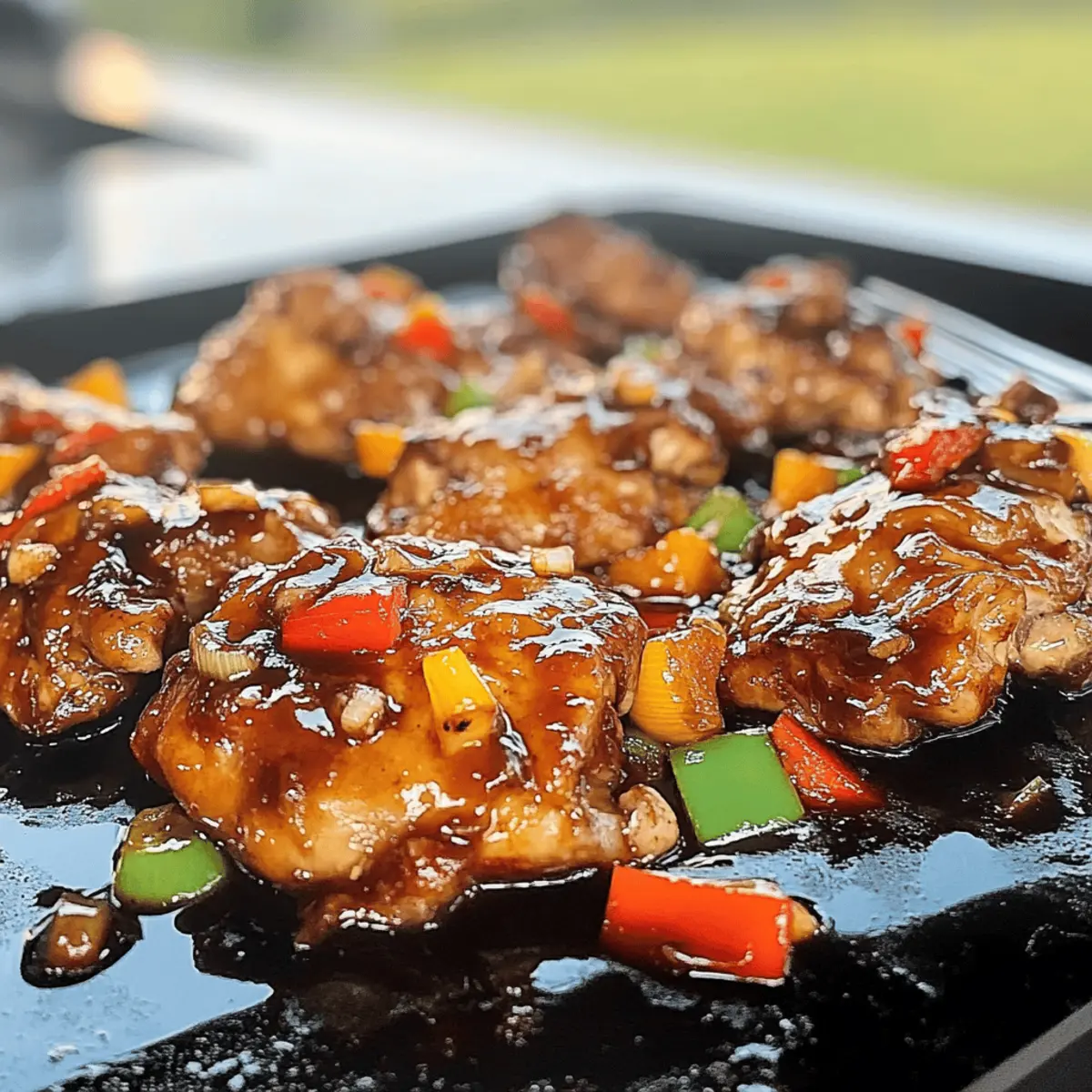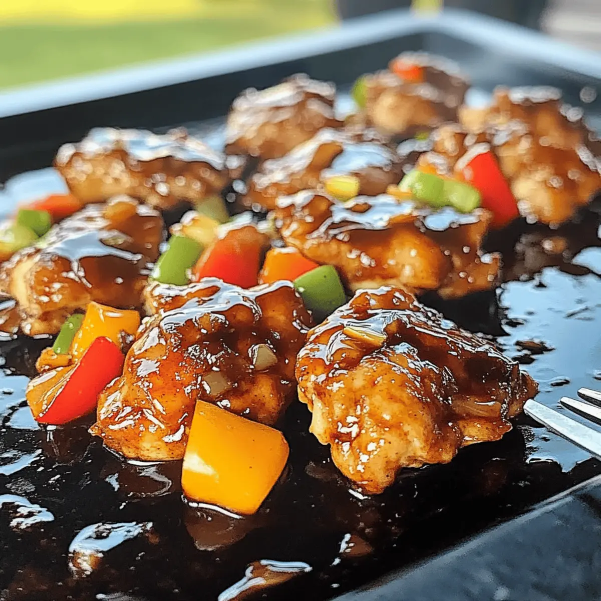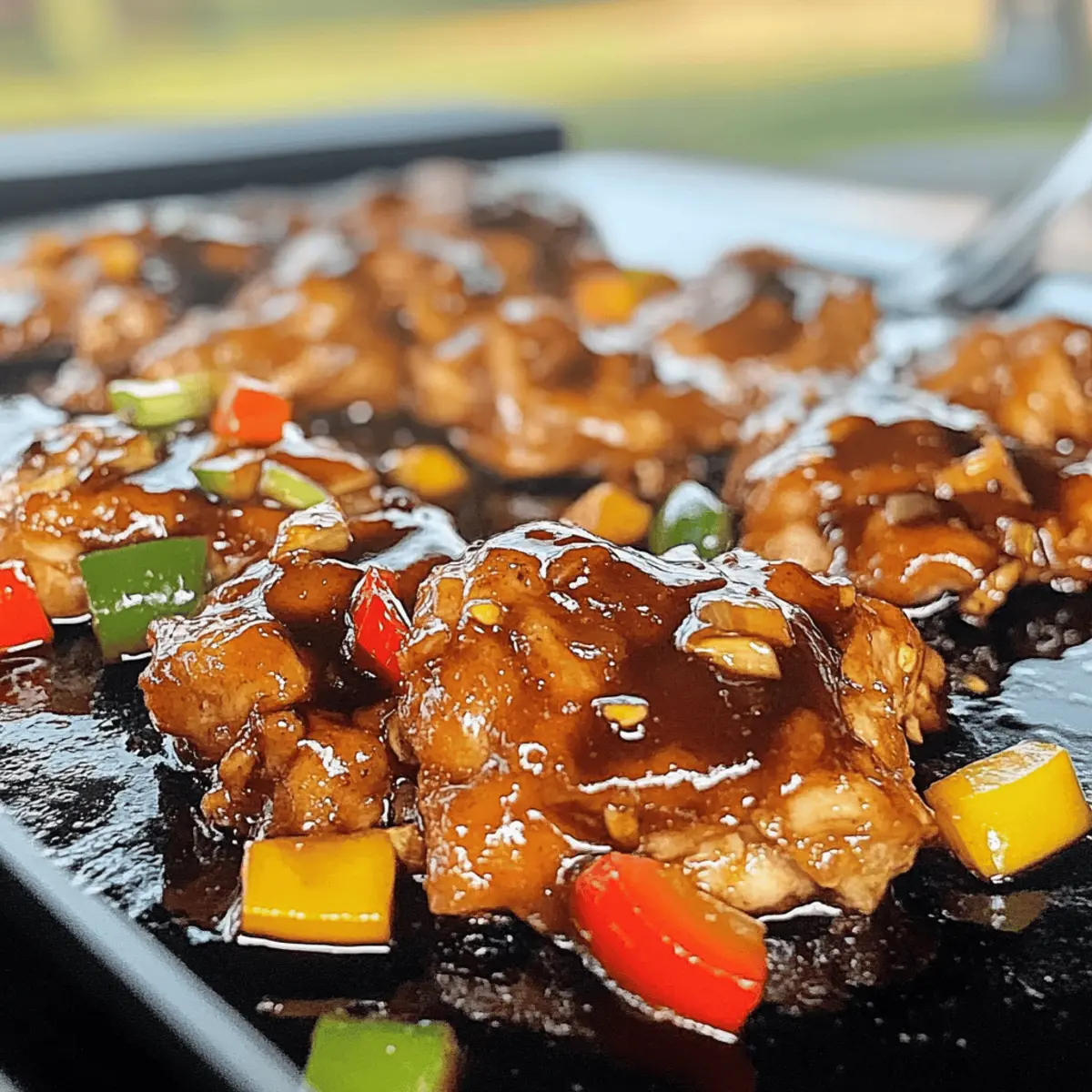 Jump to Recipe Print RecipeNothing quite compares to the satisfying sizzle of chicken on a hot griddle, don’t you think? With my Quick and Flavorful Blackstone Bourbon Chicken, you’ll create a smoky masterpiece in under an hour that impresses both family and friends. This dish embraces the comforting allure of a sweet and tangy bourbon sauce, effortlessly bringing everyone to the table for a delicious meal. Plus, it’s incredibly versatile—whether you’re after a quick lunch or a family-friendly dinner, you can whip it up with minimal effort and customize it to fit dietary needs. How about serving it over fluffy rice or crisp veggies? The aroma alone will have everyone’s mouths watering before even sitting down. Ready to fire up the griddle and fill your kitchen with delightful scents? Let’s dive into this amazing recipe! Why Is Blackstone Bourbon Chicken So Special? Sizzle and Smoke: There’s nothing like the tantalizing sound of chicken sizzling on a hot griddle, making this recipe a delight to prepare. Quick Preparation: In under an hour, you can create a dish that is both simple and satisfying—perfect for busy weeknights or surprise guests. Versatile Ingredients: Customize with your favorite veggies or swap chicken for shrimp or tofu to cater to all taste preferences. Comforting Flavors: The sweet and tangy bourbon sauce elevates this dish to comfort food status, making it an instant family favorite. Perfect Meal Prep: Marinate ahead of time and store leftovers easily—great for quick lunches later in the week. If you enjoy meals that can be easily prepared and look fabulous, you’ll also love recipes like Garlic Parmesan Chicken and Honey BBQ Chicken. Enjoy! Blackstone Bourbon Chicken Ingredients For the Marinade Soy Sauce – Provides umami flavor; try using low-sodium soy sauce to control saltiness. Bourbon – Adds a rich, smoky flavor; for a non-alcoholic substitute, mix apple cider with a touch of vanilla extract. Brown Sugar – Balances the savory and tangy elements; you can swap this for honey or maple syrup for a different sweetness. Garlic – Enhances the dish with aromatic depth; minced for even flavor distribution. Ginger – Lends a bit of warmth; ensure it’s finely minced for maximum impact. For the Chicken & Veggies Chicken Thighs – Juicy and flavorful; opt for chicken breasts if you prefer leaner meat but be mindful of cooking time. Bell Peppers – Adds color and a slight crunch; feel free to use any vibrant colors or substitute with snap peas. Onion – Sweetens as it caramelizes; yellow or red onions work wonderfully in this dish. For Cooking & Garnishing Vegetable Oil – Necessary for high-heat cooking; can substitute with any high smoke point oil like canola or grapeseed. Salt & Pepper – Season to taste, adjusting based on the saltiness of the soy sauce. Green Onions – Use as a fresh garnish for flavor and color; they add a lovely crunch when sprinkled on top. Sesame Seeds – Optional, but they add a lovely texture and nutty taste when sprinkled over the finished dish. With these ingredients, you’ll be well on your way to making a sumptuous Blackstone Bourbon Chicken on the griddle! Step‑by‑Step Instructions for Blackstone Bourbon Chicken On The Griddle Step 1: Prepare the Marinade In a large bowl, whisk together soy sauce, bourbon, brown sugar, minced garlic, and ginger until the sugar mostly dissolves. This mix creates a flavorful marinade for the Blackstone Bourbon Chicken. Ensure all ingredients are well combined, and the aroma starts to waft as you blend them together. Step 2: Marinate the Chicken Add your chicken thighs to the bowl, making sure each piece is generously coated with the marinade. Allow the chicken to sit for at least 30 minutes at room temperature. For enhanced flavor, refrigerate it for a few hours. During this time, the chicken absorbs all the delicious bourbon-infused goodness. Step 3: Preheat the Griddle Preheat your griddle to medium-high heat (around 400°F). Add a tablespoon of vegetable oil to the surface, spreading it evenly to ensure the chicken doesn’t stick. You’ll know the griddle is ready when oil shimmers and flows smoothly across the surface, setting the stage for the savory flavors to come. Step 4: Sauté the Vegetables Once the griddle is hot, add diced onions and bell peppers. Cook for about 3-4 minutes, stirring occasionally, until the vegetables are softened and fragrant. Their colors will brighten and edges will caramelize slightly, creating a delicious base for your Blackstone Bourbon Chicken. Step 5: Cook the Chicken Push the sautéed vegetables off to one side of the griddle and add the marinated chicken. Cook for 6-8 minutes, stirring frequently, until the chicken is caramelized and cooked through. Look for a golden-brown surface and an internal temperature of 165°F for optimal juiciness and safety. Step 6: Combine and Finish Mix the sautéed vegetables back into the chicken on the griddle, cooking for an additional 2 minutes to blend the flavors. Stir until everything is heated through and well combined. The enticing aroma should fill your kitchen, hinting at the delightful meal awaiting you. Step 7: Season and Garnish Season the dish with salt and pepper to taste, keeping in mind the saltiness of the soy sauce. Garnish with chopped green onions and a sprinkle of sesame seeds for added flavor and visual appeal. These final touches will elevate the presentation of your Blackstone Bourbon Chicken. Step 8: Serve and Enjoy Serve your delicious Blackstone Bourbon Chicken over a fluffy bed of rice or alongside sautéed greens for a balanced meal. The contrasting textures and flavors will surely delight everyone at the table. Storage Tips for Blackstone Bourbon Chicken Fridge: Store leftovers in an airtight container for up to 3 days. Make sure it’s completely cooled before sealing to preserve freshness. Freezer: For longer storage, freeze portions in freezer-safe bags or container