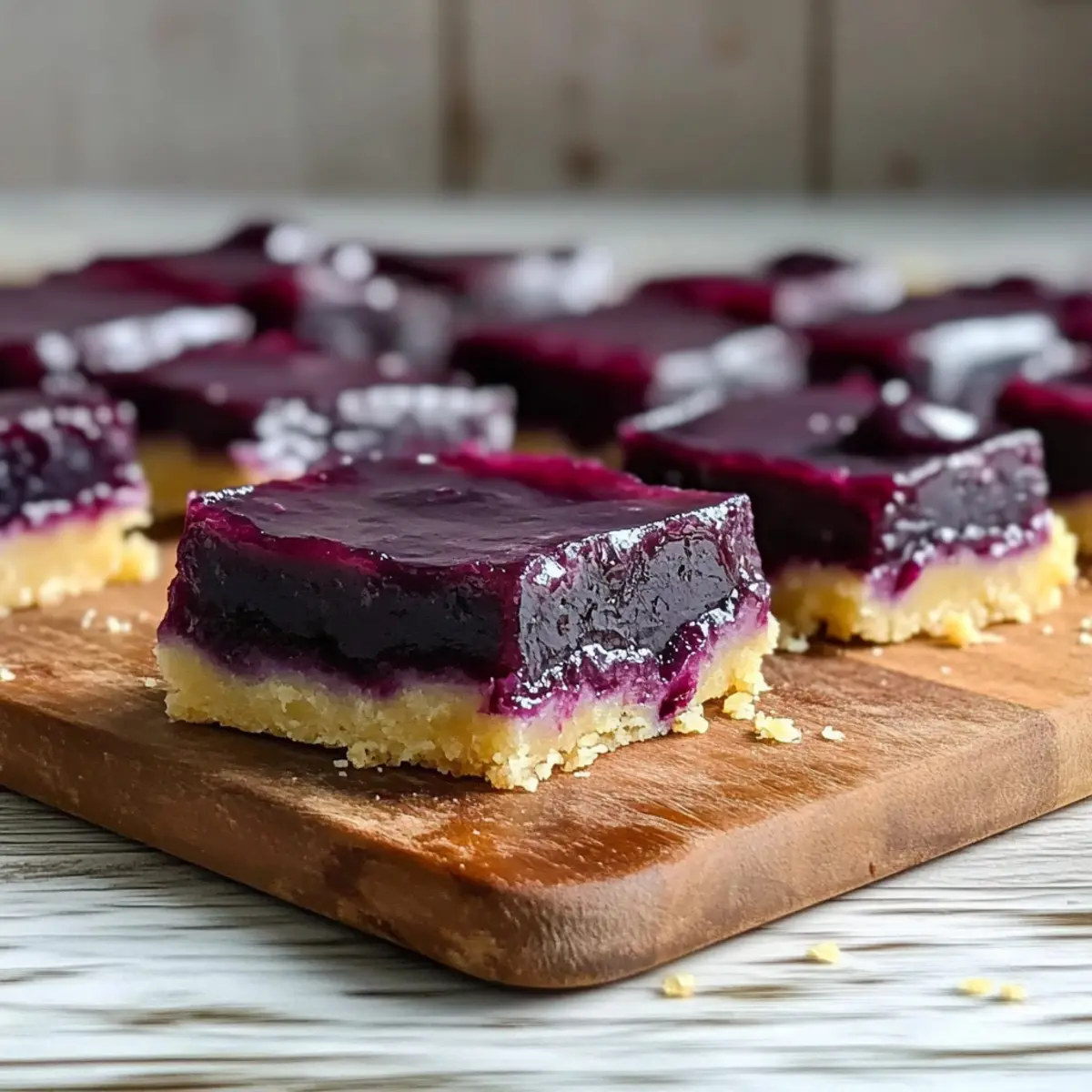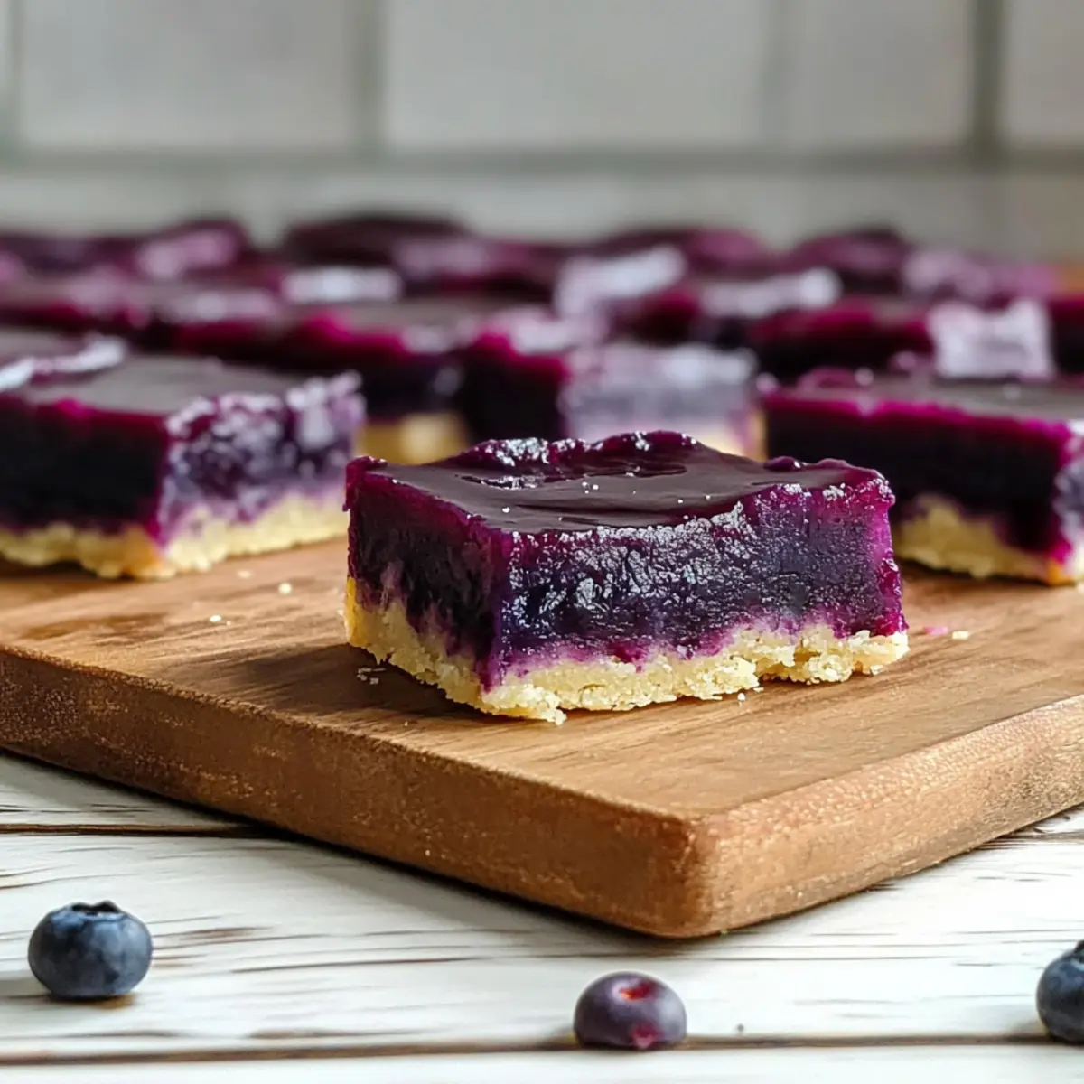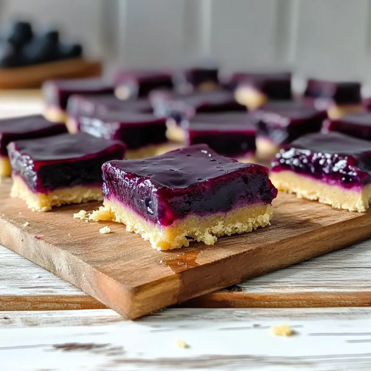 Jump to Recipe Print RecipeAs I was standing in my kitchen, surrounded by the sweet and tangy scent of fresh blueberries, I had a lightbulb moment that sparked the creation of these delightful Blueberry Curd Bars. These bars have a silky smooth blueberry filling, perfectly nestled onto a rich, buttery lemon shortbread crust. Not only are they a blissful treat for summer gatherings, but they also strike an irresistible balance between sweet and tart flavors. Plus, the prep is surprisingly quick, making them a fantastic option for those busy weeknights or last-minute dessert cravings. Are you ready to elevate your dessert game and impress your friends with these stunning bars? Let’s dive into this heavenly recipe! Why are Blueberry Curd Bars a must-try? Irresistible Flavor: The combination of silky blueberry filling and buttery lemon shortbread is a match made in dessert heaven. Fresh and Fruity: With the essence of ripe blueberries, these bars bring a refreshing twist to traditional desserts. Effortlessly Elegant: Impress your guests with a stunning dessert that requires minimal effort—perfect for summer gatherings. Versatile Options: Experiment with other flavors like raspberry curd or add meringue for a unique touch! Quick and Easy: With just a few simple steps and short baking time, you can whip these up in no time. For another fruit-infused delight, consider trying my Blueberry Crumble Cheesecake or the refreshing Lemon Blueberry Muffins to keep the fruity theme going! Blueberry Curd Bars Ingredients For the Shortbread Crust All-Purpose Flour – Provides structure for a satisfying crunch; feel free to substitute with gluten-free flour for a gluten-free version. Granulated Sugar – Adds the perfect sweetness to balance the rich flavors. Powdered Sugar – Ensures a tender texture, making each bite melt in your mouth. Fine Sea Salt – Enhances the overall flavor of the crust; regular salt is an acceptable substitute. Lemon Zest (from 2 lemons) – Infuses a bright, citrusy note that’s essential for the shortbread; use fresh zest for the best results. Unsalted Butter (140 g, cold and sliced) – Binds everything together and maintains a flaky texture when cold; swap with vegan butter for a dairy-free treat. For the Blueberry Filling Blueberry Curd (from linked recipe) – This is the star of the show, providing a luscious, fruity filling; you can replace it with raspberry curd, increasing the starch slightly for the best set. Tapioca or Cornstarch (½ tablespoon) – Helps the blueberry curd hold its shape; arrowroot starch works well as a substitute if needed. Enjoy crafting these delightful Blueberry Curd Bars, where the balance of buttery crust and fruity filling is sure to brighten any gathering! Step‑by‑Step Instructions for Blueberry Curd Bars Step 1: Prepare Blueberry Curd Start by making your blueberry curd, as it needs time to cool before layering it on the crust. You can prepare the curd in advance and store it in the refrigerator; it’s best when made a day or up to two weeks ahead. Allow it to reach room temperature before using it for your blueberry curd bars. Step 2: Preheat Oven Preheat your oven to 350°F (175°C), ensuring it’s fully heated for the best baking results. This temperature is ideal for creating a perfectly golden shortbread crust. While the oven heats, you can prepare the shortbread base, which will be baked first in this delightful recipe. Step 3: Make Shortbread Base In a food processor, combine all-purpose flour, granulated sugar, powdered sugar, fine sea salt, and lemon zest. Pulse until well mixed, approximately 10-15 seconds. Add the cold, sliced unsalted butter and blend until the mixture resembles a rough ball—about 30 seconds. Transfer the dough into an 8×8” or 9×9” lined pan, pressing it evenly across the bottom. Step 4: Bake Place the shortbread crust in the preheated oven and bake for 25-30 minutes. Look for the edges to turn a light golden brown, signaling that the crust is ready. Keep an eye on it as you want a crunchy texture but not overdone; it will add a rich base for your blueberry curd bars. Step 5: Combine and Bake Curd Once your shortbread has baked and cooled slightly, whisk the tapioca or cornstarch into the previously prepared blueberry curd until smooth. Pour this luscious blueberry mixture over the hot shortbread crust, spreading it evenly. Return the pan to the oven and bake for an additional 15-20 minutes until the edges firm up, and the center jiggles slightly. Step 6: Cool and Chill After baking, remove your blueberry curd bars from the oven and let them cool at room temperature for about 30 minutes. Then, refrigerate them for at least a couple of hours, or until completely chilled. This step is crucial for achieving clean, firm slices when you’re ready to cut into your delicious blueberry curd bars! How to Store and Freeze Blueberry Curd Bars Room Temperature: These bars are best stored in the refrigerator to maintain freshness. However, if you must keep them out for a short time, they can be at room temperature for no longer than 2 hours. Fridge: Store your blueberry curd bars in an airtight container in the refrigerator for up to 1 week. This helps preserve their silky filling and buttery crust for a delightful dessert every time. Freezer: For longer storage, freeze the bars in an airtight container for up to 3 months. You can layer parchment paper between bars to prevent sticking. Thaw in the fridge before serving. Reheating: To enjoy chilled bars quickly, you can place them in the microwave for about 10-15 seconds; just be careful not to overheat, as that may soften the filling. Blueberry Curd Bars Variations Feel free to get creative and personalize your Blueberry Curd Bars with these delicious twists that’ll awaken your taste buds! Raspberry Curd: Substitute blueberry curd with raspberry curd, adjusting starch to 1 tablespoon for a luscious, fruity twist. The tartness of raspberries complement