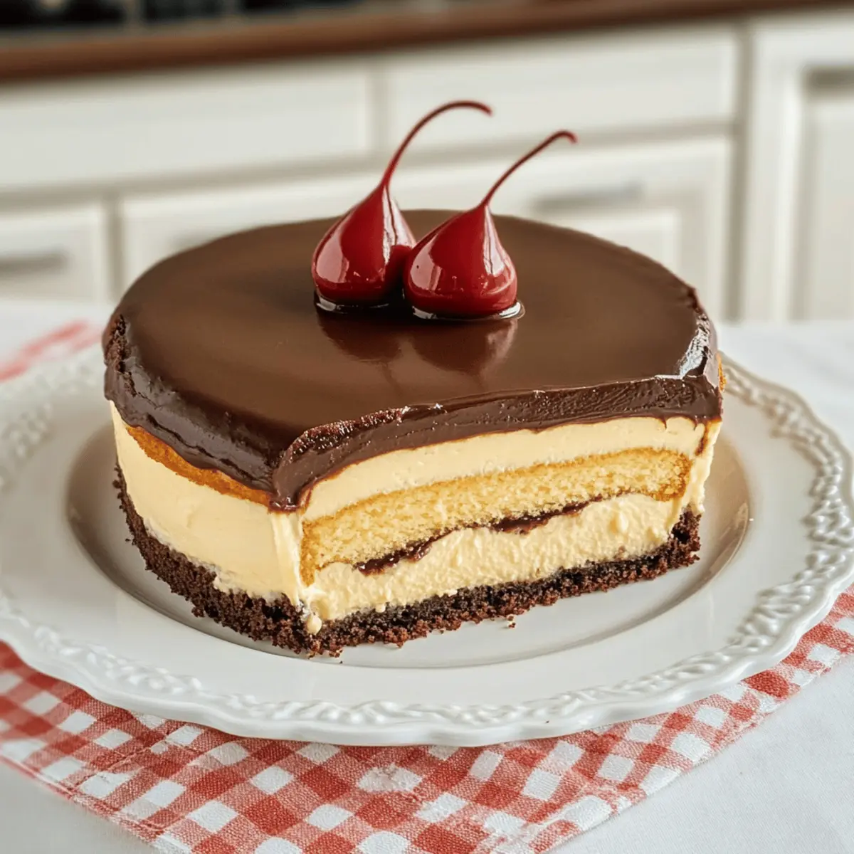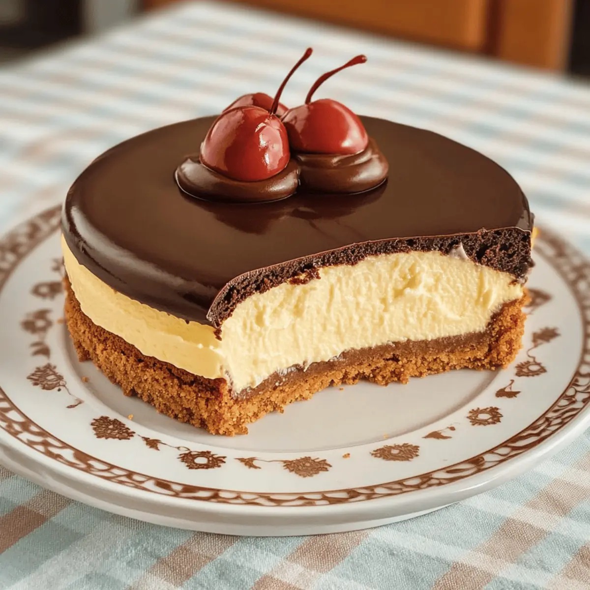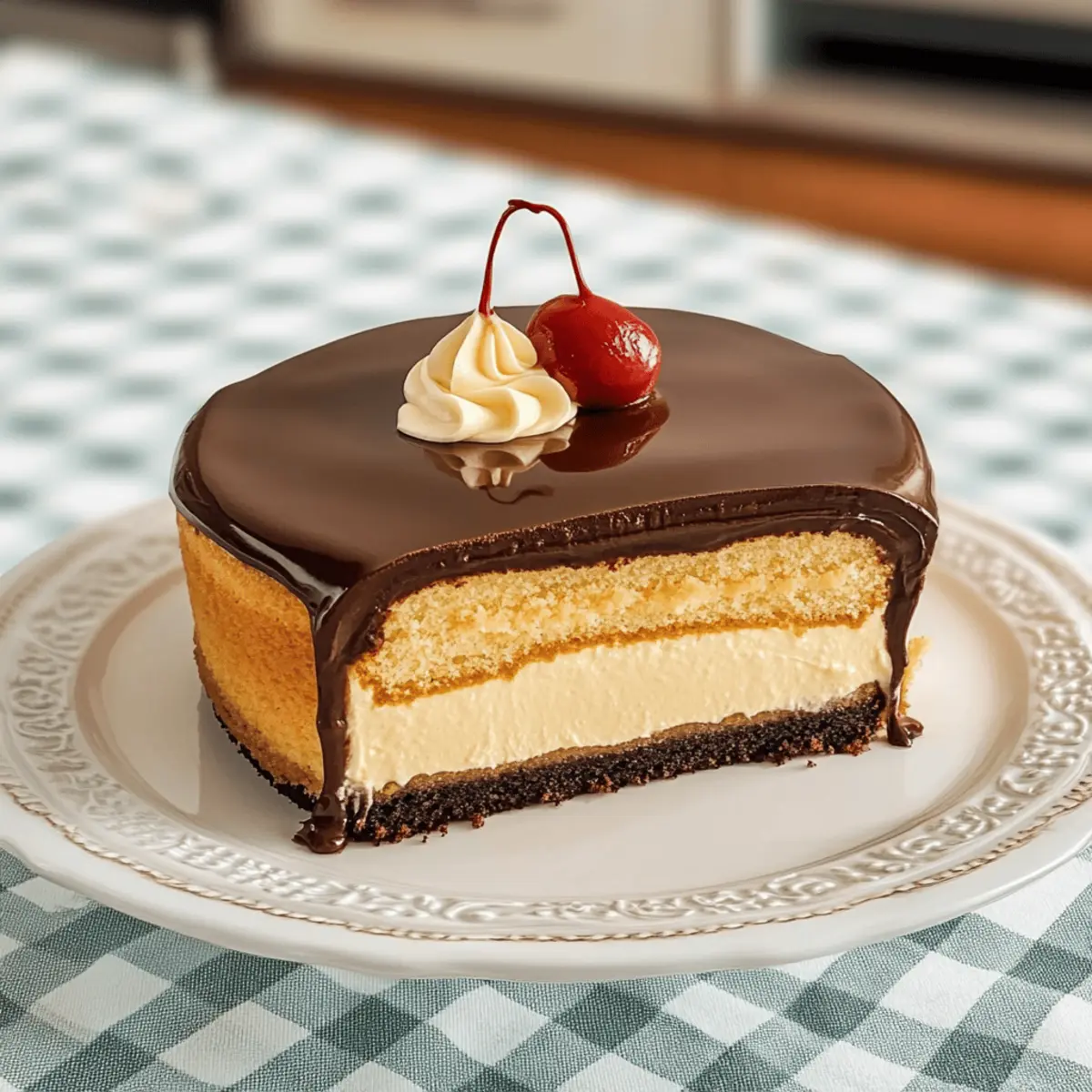 Experience pure comfort with this Boston Cream Pie, combining light cake, smooth custard, and rich chocolate ganache.