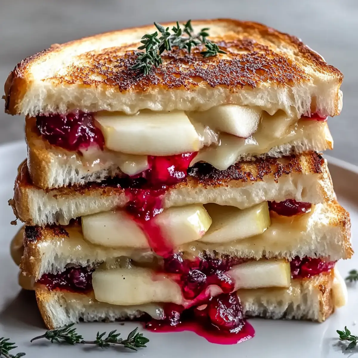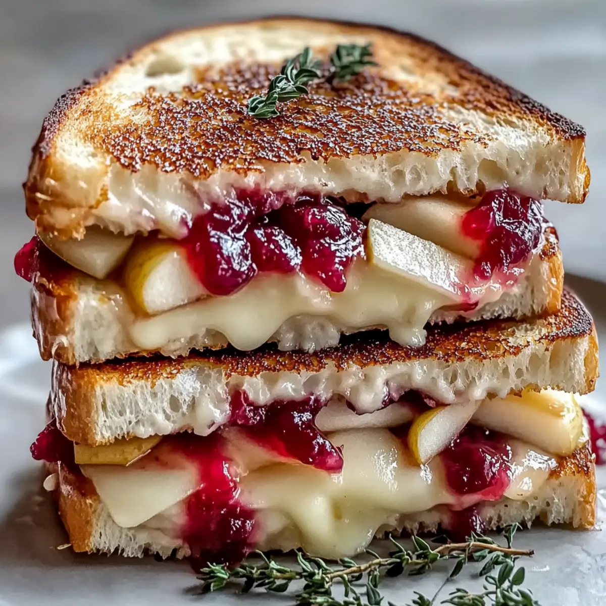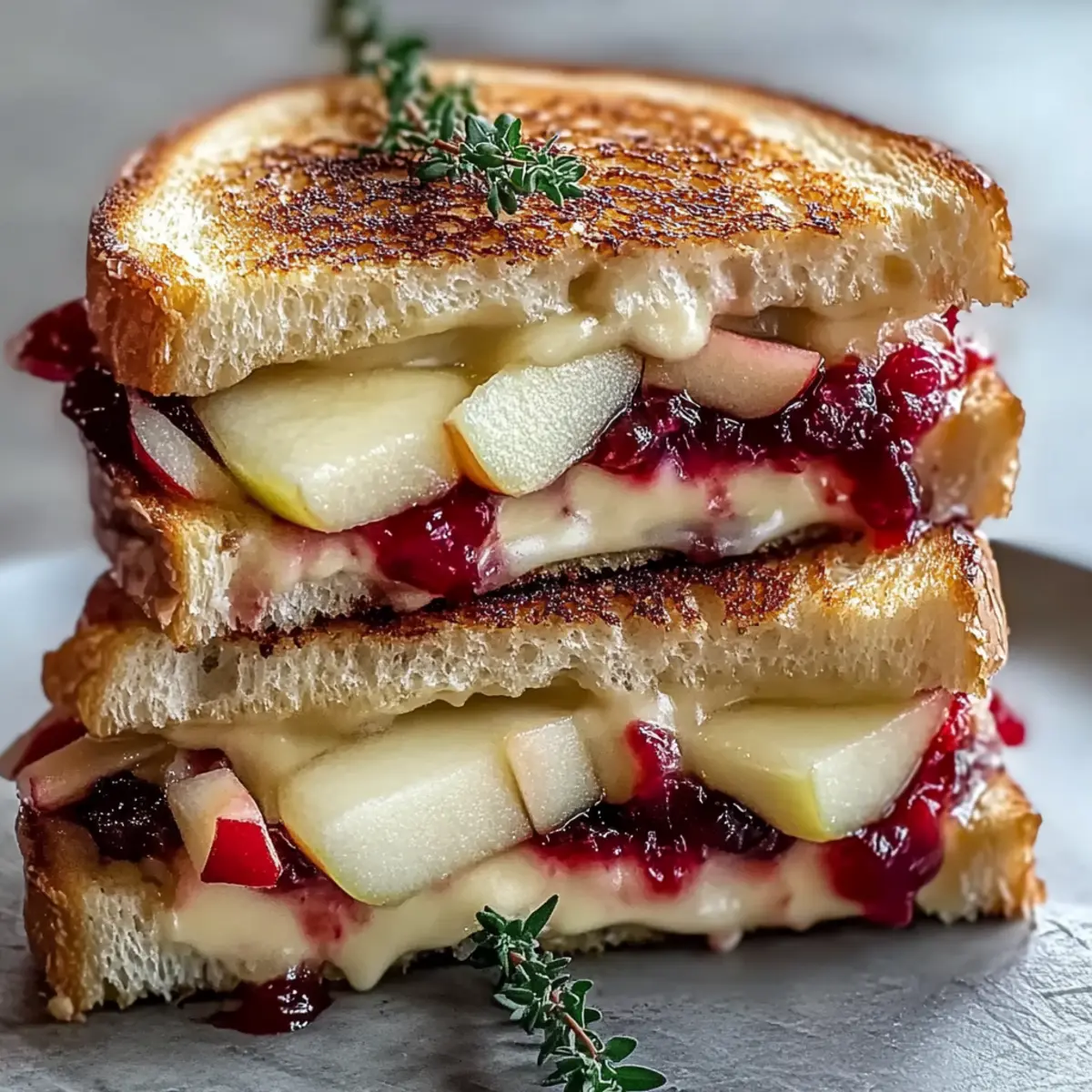 Jump to Recipe Print RecipeThere’s something magical about transforming a simple grilled cheese into a gourmet delight, and today, I’m excited to share my favorite recipe for Brie, Apple & Cranberry Grilled Cheese. This dish is all about balance—creamy brie pairs perfectly with crisp apples and a pop of tart cranberry sauce, making it a delicious and visually stunning comfort food. Not only is it an easy way to impress guests at a cozy gathering, but it also delivers on flavor without the fuss of lengthy prep. Whether you’re treating yourself to a midday indulgence or experimenting in the kitchen, this sandwich is sure to elevate your lunch game. Are you ready to get toasty? Let’s dive into this delightful creation! Why is this grilled cheese unforgettable? Gourmet Experience: This Brie, Apple & Cranberry Grilled Cheese transforms a classic into a culinary delight, making each bite feel indulgent. Balanced Flavors: The blend of creamy brie, sweet apples, and tangy cranberry offers a perfect harmony of tastes that will leave you craving more. Versatile Options: Want to mix it up? Try adding nuts for crunch or swap out the cheese for a sharp blue variant! Quick & Easy: With minimal prep, you can whip this up in no time—ideal for a cozy lunch or an impressive snack. Crowd-Pleaser: Whether it’s a casual gathering or a festive occasion, this sandwich is sure to impress guests just like Cheese Grape Skewers or Crispy Broccoli Cheese Rounds. Brie, Apple & Cranberry Grilled Cheese Ingredients • Get ready to create a gourmet delight! For the Sandwich Brie Cheese – Adds creaminess and richness; feel free to substitute with gouda or cheddar for different flavors. Apples – Provides crispness and natural sweetness; use sweet varieties like Fuji or Honeycrisp for the best taste. Cranberry Sauce – Contributes tartness; consider making your own for a fresher taste experience. Bread – Forms the base; whole grain bread adds fiber and flavor, or go gluten-free if needed. Butter – Adds flavor & aids in browning the bread; swap for vegan butter if desired. Optional Additions Honey – Enhances sweetness and can be omitted if you prefer less sweetness; maple syrup is a lovely alternative. Fresh Thyme – Adds an herbal aroma; feel free to substitute with rosemary or skip it altogether. Prepare to delight your taste buds with this beautiful Brie, Apple & Cranberry Grilled Cheese creation! Step‑by‑Step Instructions for Brie, Apple & Cranberry Grilled Cheese Step 1: Prep Your Ingredients Begin by thinly slicing the brie cheese and the crisp apples—aim for about 1/4 inch thick to ensure they melt and soften nicely. Set aside the cranberry sauce, which will add that sweet and tart kick to your Brie, Apple & Cranberry Grilled Cheese. Having everything prepped allows for a smooth assembly later on. Step 2: Assemble the Sandwich Take two slices of whole grain bread and spread softened butter generously on one side of each. On the unbuttered side of one slice, layer a generous amount of brie, followed by a beautiful arrangement of apple slices, and spoon some cranberry sauce over the top. Place the other slice of bread butter-side up on top, creating a delicious sandwich ready for cooking. Step 3: Heat the Skillet Place a skillet on the stove and set it to medium heat. Allow the skillet to warm for about 2 minutes, ensuring that it’s hot enough to achieve that golden-brown crust. This step is crucial to obtaining a crispy exterior while the cheese inside your Brie, Apple & Cranberry Grilled Cheese melts to perfection. Step 4: Cook to Perfection Gently place the assembled sandwich onto the heated skillet. Cook for 4-5 minutes until the underside is golden brown and crispy. Carefully flip the sandwich to the other side, allowing it to cook for another 4-5 minutes. You’ll know it’s ready when both sides are beautifully toasted, and the cheese begins to ooze out, creating that indulgent melt. Step 5: Finish & Serve Once cooked, remove the sandwich from the skillet and let it rest for a minute. For an extra touch of flavor, drizzle honey over the top and sprinkle fresh thyme, if desired. Cut the sandwich in half for easy serving and to reveal the delicious layers of creamy brie, sweet apples, and tangy cranberry, making your Brie, Apple & Cranberry Grilled Cheese a visual delight. Expert Tips for Brie, Apple & Cranberry Grilled Cheese Softened Butter: Ensure your butter is softened before spreading; this helps to avoid tearing the bread while making your Brie, Apple & Cranberry Grilled Cheese. Watch the Heat: Keep the skillet at medium heat; too high, and the bread will burn before the cheese melts. Layer Wisely: Don’t overload the sandwich; a balanced layer of brie, apples, and cranberry sauce ensures even melting and a perfect bite. Take Your Time: Let the sandwich cook slowly and gently; this helps develop a rich, crispy texture without overcooking the cheese. Experiment with Ingredients: Try adding different fruits or nuts for added texture; the versatility of the Brie, Apple & Cranberry Grilled Cheese encourages creativity! What to Serve with Gourmet Brie, Apple & Cranberry Grilled Cheese Elevate your meal experience by pairing this delightful sandwich with complementary sides and beverages that enhance its flavors. Mixed Greens Salad: A light and refreshing salad balances the richness of the grilled cheese while adding a crisp texture. Toss with a lemon vinaigrette for a zesty touch. Sweet Potato Fries: Their natural sweetness complements the savory flavors, creating a satisfying contrast in textures; the crunch pairs wonderfully with the sandwich’s gooeyness. Butternut Squash Soup: A warm, velvety soup brings comforting warmth and a touch of seasonal sweetness, enhancing the overall dining experience. Cranberry Juice: The tartness of cranberry juice echoes the sandwich’s flavors, making it a delightful drink pairing that keeps the palate refreshed. Fresh Fruit Platter: Ser