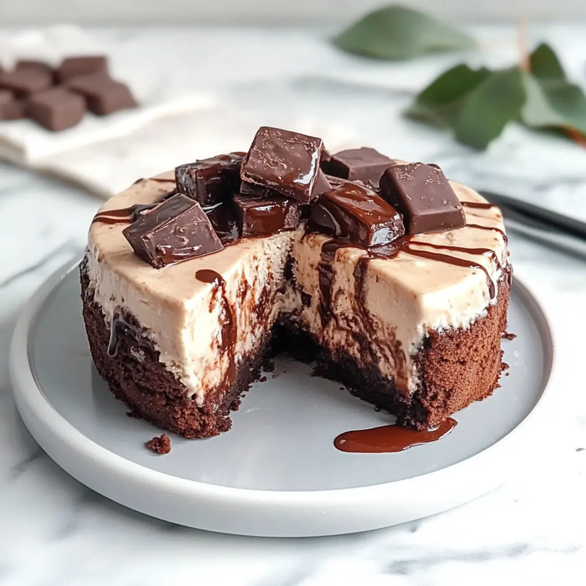 7. Warm chocolate fudge sauce in the microwave until just liquid. Drizzle over the top of the cake and sprinkle leftover brownie pieces if desired.
