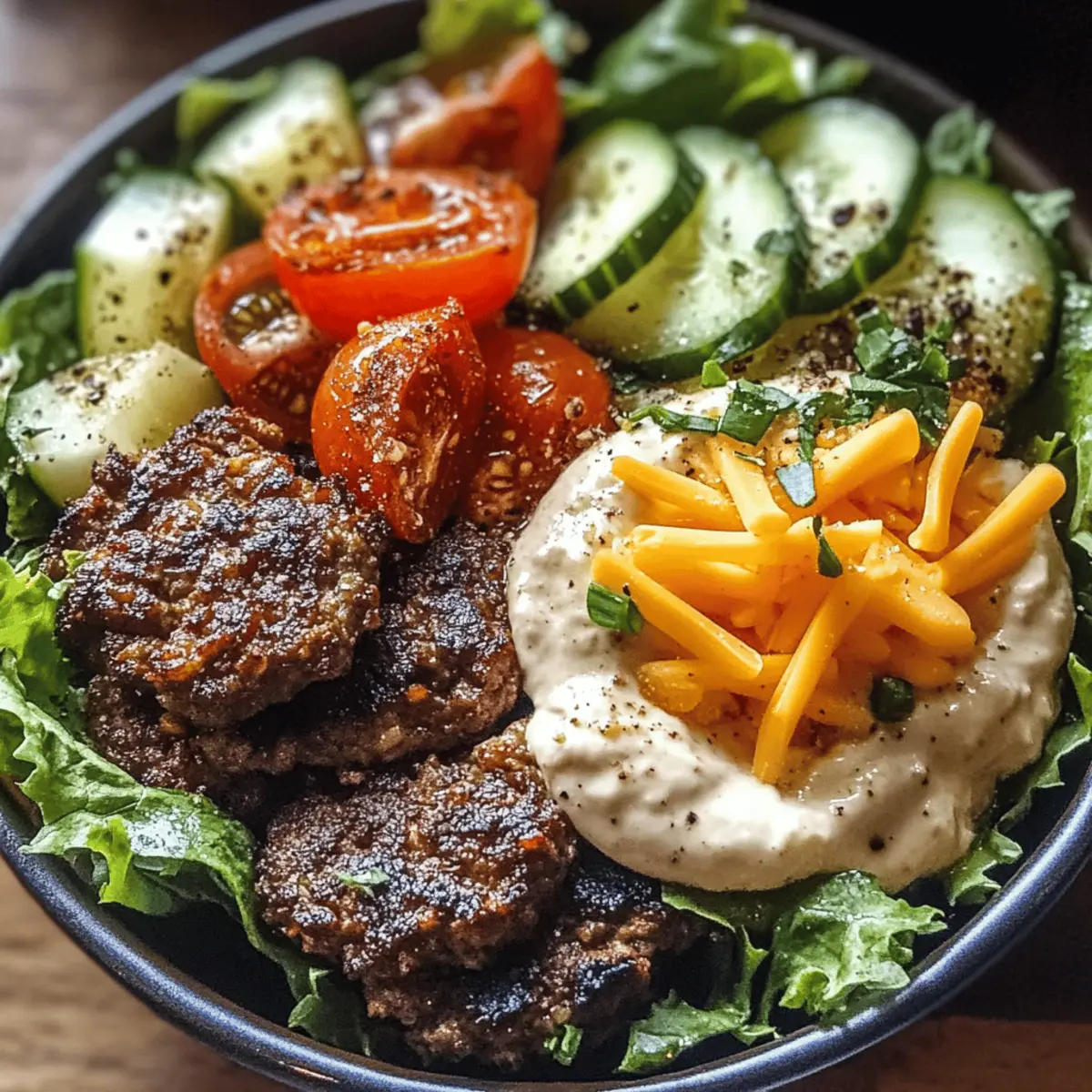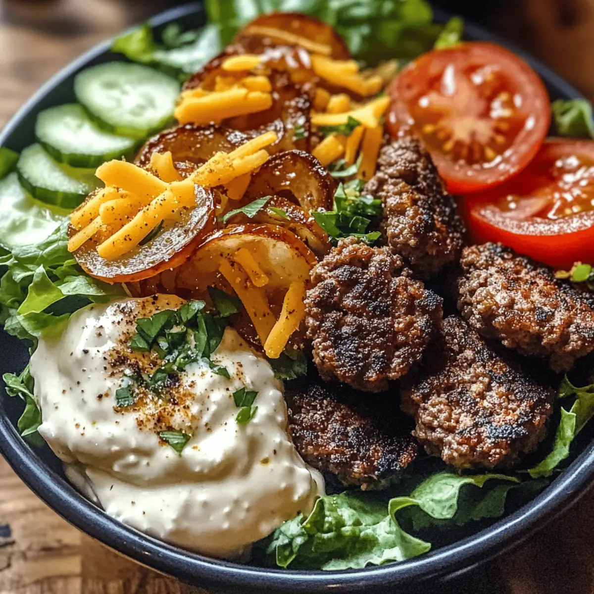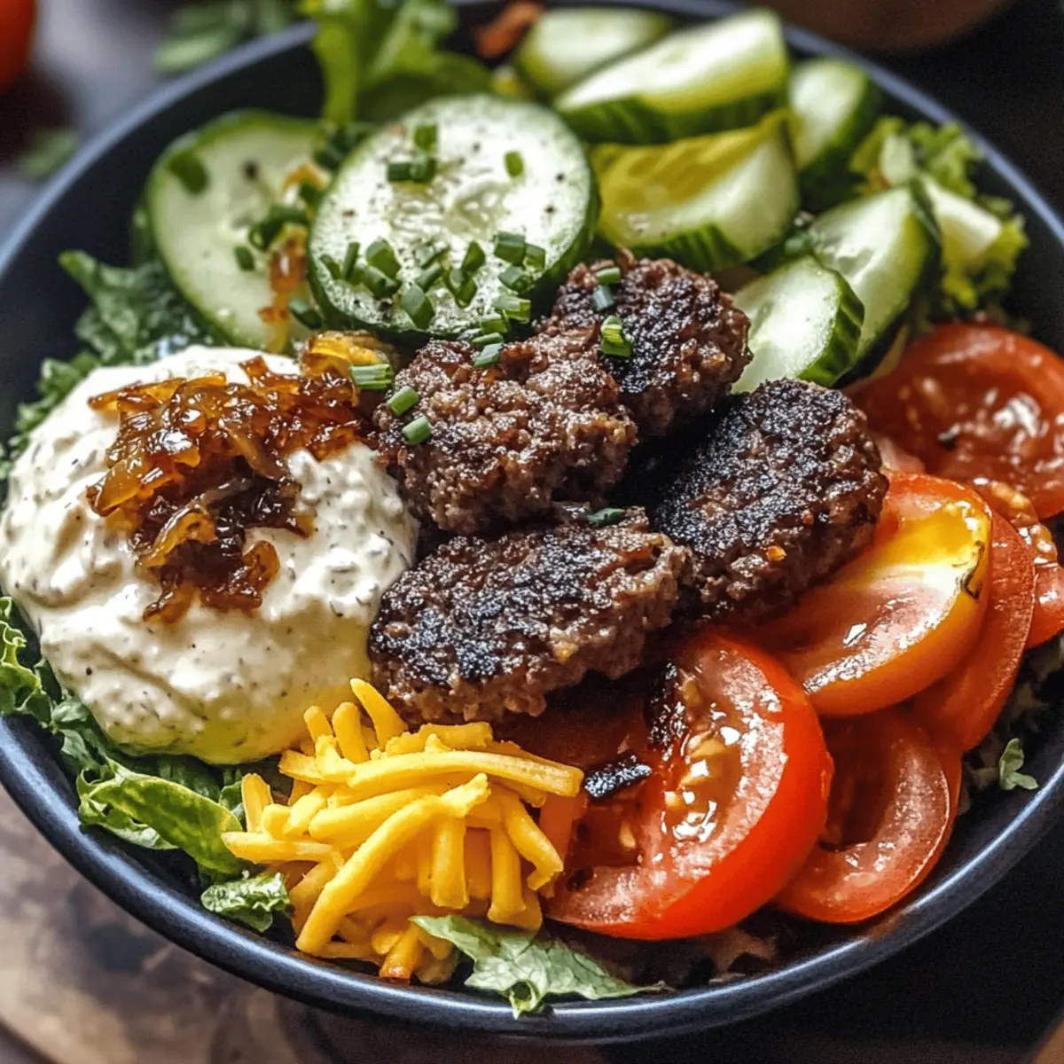 Jump to Recipe Print RecipeThe aroma of caramelized onions wafted through my kitchen, instantly transporting me to sunny backyard barbecues. Who doesn’t miss the joy of a classic burger, but sometimes the heaviness of bread just doesn’t feel right? That’s why I’m excited to share my delicious Hearty Burger Bowls with Caramelized Onion Aioli—your new go-to for a healthier burger option! Packed with perfectly seasoned ground beef on a bed of fresh greens, vibrant vegetables, and topped with a creamy aioli, this recipe brings all the satisfaction without the carbs. Not only is it meal prep-friendly, but it’s also completely customizable to fit your taste buds and dietary preferences. Curious about how to make these bowls your own? Let’s dive in! Why Make Burger Bowls Tonight? Flavorful Freedom: These Burger Bowls offer a delightful twist on traditional burgers, allowing you to indulge in comfort food while skipping the bread. Customizable Components: Enjoy the flexibility to swap proteins with ground turkey, chicken, or even plant-based options! Easy Meal Prep: Perfectly suited for busy schedules, prep components in advance to whip up a delicious meal in no time. Healthy Satisfaction: Each bite is packed with nutrients and wholesome ingredients, making it a low-carb and keto-friendly option. Crowd-Pleaser: Serve at gatherings and watch friends and family rave about this deliciously unique take on the classic burger! For more fresh flavors, try Sriracha Salmon Bowls or Creamy Garlic Parmesan Chicken. Burger Bowls with Caramelized Onion Aioli Ingredients For the Beef • Ground Beef (80/20 blend) – Provides flavor and juiciness; freshly ground is best for rich taste. • Worcestershire Sauce – Adds umami and richness; quality makes a big difference, so choose Lea & Perrins. • Garlic Powder – Enhances savory depth; ensure it’s fresh for the best aroma. • Onion Powder – Complements beef with subtle savory notes; lump-free is ideal for even mixing. • Smoked Paprika – Introduces a delightful smoky flavor; Hungarian varieties are preferred. • Salt & Black Pepper – Essential seasoning; use kosher salt and freshly ground black pepper for the best results. • Olive Oil – For browning the beef; regular olive oil is best at higher cooking temperatures. For the Aioli • Yellow Onions – Caramelized to add sweet jamminess; firm and pungent when raw is best. • Butter – Aids in caramelizing onions; unsalted helps control the overall saltiness. • Brown Sugar – Helps caramelize onions and deepen their flavor. • Mayonnaise & Sour Cream – Forms the creamy base of the aioli; high-quality brands yield the best texture. • Fresh Garlic & Lemon Juice – Adds brightness and sharpness; use freshly minced garlic for the best flavor. For the Bowl • Mixed Greens/Romaine Lettuce – Crisp base for the bowl, providing crunch and freshness. • Tomatoes (Diced or Cherry) – Freshness and color enhancer; choose the best quality based on the season. • Cucumber (Diced) – Offers a crisp texture; English cucumbers have a thin skin for easy eating. • Red Onion (Thinly Sliced) – For color and bite; soak in water to reduce sharpness if desired. • Cheddar Cheese (Shredded) – Adds creaminess and flavor; shredding fresh provides the best melt. • Dill Pickle Slices – Essential for that authentic burger flavor; opt for crisp varieties. • Fresh Chives (Chopped) – Garnish with a mild onion flavor; green onion tops can be a substitute. Embrace this burger bowl adventure with our Burger Bowls with Caramelized Onion Aioli—a healthier option that will satisfy all your cravings! Step‑by‑Step Instructions for Burger Bowls with Caramelized Onion Aioli Step 1: Caramelize the Onions Begin by slicing two yellow onions thinly. In a large skillet over medium-low heat, melt 2 tablespoons of unsalted butter and add the onions along with 1 tablespoon of brown sugar. Cook for 25–30 minutes, stirring occasionally, until the onions are golden brown and jammy. The low heat allows for sweet caramelization, so be patient and enjoy the aroma wafting through your kitchen. Step 2: Prepare the Burger Meat While the onions caramelize, mix together one pound of ground beef (80/20 blend), 1 tablespoon of Worcestershire sauce, 1 teaspoon of garlic powder, 1 teaspoon of onion powder, 1 teaspoon of smoked paprika, and salt and pepper in a bowl. Use your hands to gently combine without overmixing, as this keeps the beef tender. This seasoned meat will be the star in your Burger Bowls with Caramelized Onion Aioli. Step 3: Make the Aioli Once the onions have caramelized, let them cool for a few minutes. In a mixing bowl, combine the cooled onions with ½ cup of mayonnaise, ¼ cup of sour cream, 1 minced garlic clove, and 1 tablespoon of lemon juice. Season with salt and pepper to taste, mixing until smooth. This creamy aioli will add a delightful richness to your burger bowls. Step 4: Prep the Vegetables As the aioli cools, wash and prepare your fresh vegetables. Dice one cucumber and two tomatoes, and thinly slice half a red onion. If desired, soak the red onion in cold water to reduce its sharpness. Arrange all vegetables separately on a platter, making assembly of your Burger Bowls quick and easy. Step 5: Cook the Ground Beef In your skillet over medium-high heat, add 1 tablespoon of olive oil and allow it to heat until shimmering. Carefully add the prepared ground beef mixture, cooking for 8–10 minutes. Avoid stirring too often to create a nice sear. The beef should be browned on the outside, while remaining juicy on the inside, contributing to the overall savory flavor of the burger bowls. Step 6: Assemble the Burger Bowls To assemble your Burger Bowls, start with a generous bed of mixed greens or romaine lettuce in each bowl. Layer the cooked ground beef on top, followed by the diced vegetables, and drizzle with the caramelized onion aioli. Finish off with a sprinkle of shredde