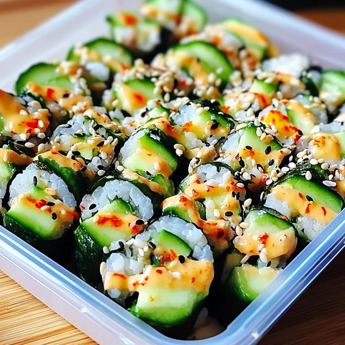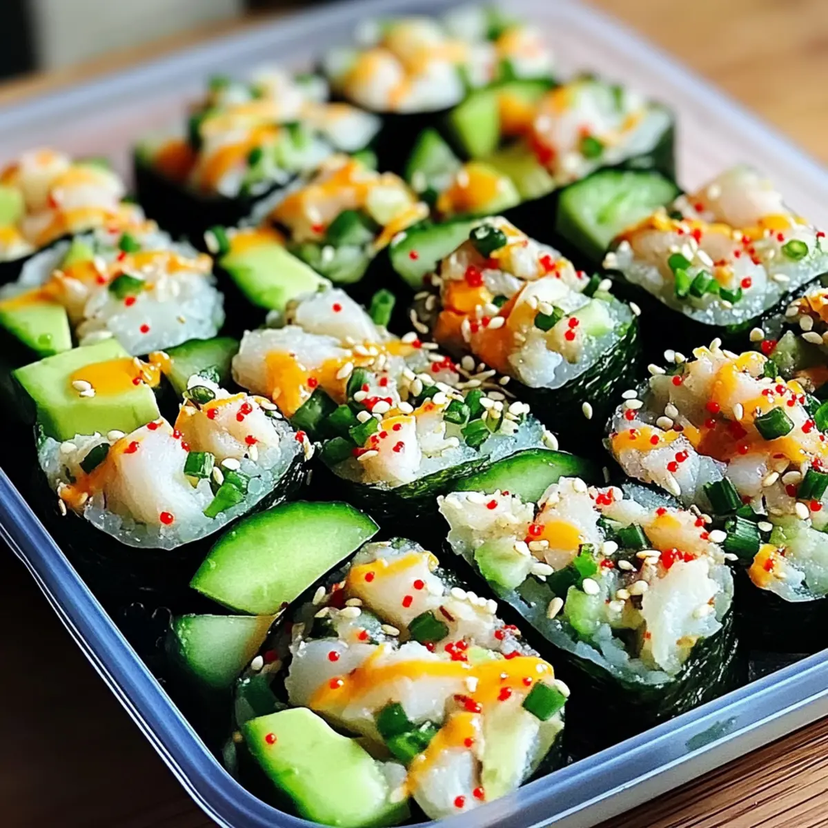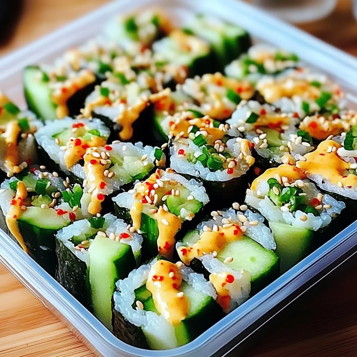 Jump to Recipe Print RecipeAs I stood in my kitchen, the tantalizing aroma of fresh cucumbers and ripe avocados swept me away, igniting my desire for something vibrant and satisfying. Enter the California Roll Cucumber Salad—a delightful twist on sushi that captures all the best flavors without the fuss of rolling. In just 15 minutes, you can whip up this dish that combines crunchy cucumbers, creamy avocado, and sweet crab, elevating your lunch or side dish game in a snap. This salad is not only quick to prepare but also naturally gluten-free when you choose the right soy sauce. Whether you’re planning a picnic, a cozy dinner at home, or simply need a fresh pick-me-up from mundane meals, this colorful salad has got you covered. Curious to see how this simple recipe transforms ordinary ingredients into a sushi-inspired masterpiece? Let’s dive in! Why will you adore this salad? Freshness reigns supreme: The combination of juicy cucumbers, creamy avocado, and sweet crab creates a refreshing moment for your taste buds. Quick Prep delight: With just 15 minutes needed, this salad fits perfectly into even the busiest of schedules. Versatility shines: Ideal as a side for BBQs or a light lunch, it adapts to any occasion effortlessly. Nutrition-packed goodness: Rich in healthy fats and low in calories, it’s a guilt-free indulgence. Crowd-pleaser guaranteed: Serve it at gatherings, and watch your friends and family rave about this unique yet familiar flavor profile! If you’re looking to make it extra special, pair it with a delightful Peach Feta Salad for a colorful spread! California Roll Cucumber Salad Ingredients For the Salad English Cucumbers – These provide the perfect crunch; use 2 large ones, thinly sliced, for that refreshing bite. Avocado – Adds creamy texture and healthy fats; make sure it’s ripe for the best flavor. Imitation Crab Meat (or Real Crab) – Offers a sweet seafood taste; use 1 cup of shredded imitation or real crab to achieve that California roll essence. For the Dressing Rice Vinegar – Essential for a sushi-like tang; it brings acidity to the mix beautifully. Sesame Oil – Adds nutty depth; just a tablespoon gives flavor a delightful boost. Soy Sauce – Delivers umami goodness; opt for tamari for a gluten-free option. Honey (or Sugar) – Balances the acidity with a hint of sweetness; feel free to substitute with sugar if preferred. Optional Garnishes Sesame Seeds – Sprinkle on top for added crunch and visual appeal. Nori – Torn seaweed can enhance the sushi flavor, but skip it if you’re not a fan. Red Pepper Flakes – A pinch adds the perfect amount of heat to the salad; adjust according to your spice preference. Fresh Cilantro or Green Onions – These herbs lend a burst of freshness; sprinkle them on just before serving. This California Roll Cucumber Salad is a vibrant addition to your dining experience, effortlessly bringing the flavors of sushi right to your table! Step‑by‑Step Instructions for California Roll Cucumber Salad Step 1: Prepare the Cucumbers Start by washing 2 large English cucumbers under cool water, then thinly slice them using a sharp knife or a mandoline for even cuts. Place the slices in a large mixing bowl, making sure they are evenly distributed. This forms the crisp base of your California Roll Cucumber Salad, adding that refreshing texture you crave. Step 2: Shred the Crab Next, take 1 cup of imitation crab meat (or real crab) and shred it into bite-sized pieces. Add the shredded crab into the bowl with the cucumber slices, combining these two key ingredients. The crab will bring a touch of sweetness and seafood flavor to your salad, making it taste like a California roll without the fuss of rolling. Step 3: Dice the Avocado Now, grab a ripe avocado and carefully slice it in half, removing the pit. Dice the flesh into small cubes, then gently add the avocado to your bowl of cucumbers and crab. The creamy avocado will enhance the overall texture of the California Roll Cucumber Salad, providing that luscious mouthfeel with every bite. Step 4: Whisk the Dressing In a separate small bowl, whisk together 2 tablespoons of rice vinegar, 1 tablespoon of sesame oil, 1 teaspoon of soy sauce, and 1 teaspoon of honey (or sugar). Mix until well combined, then taste and adjust the flavors, adding red pepper flakes for a kick if desired. This tangy dressing will elevate the entire salad, bringing everything together beautifully. Step 5: Toss Everything Together Pour the dressing over the salad mixture carefully, and use a spatula or large spoon to gently toss the ingredients together. Be cautious not to mash the avocado while mixing; you want to maintain the integrity of each component. The vibrant colors and textures of your California Roll Cucumber Salad should now be coming together beautifully! Step 6: Chill and Serve For optimal flavor infusion, let the salad sit for about 15 minutes in the refrigerator, allowing all the ingredients to meld. When ready to serve, you can optionally garnish with sesame seeds, torn nori, fresh cilantro, or green onions for an extra touch of flair. Enjoy your delightful California Roll Cucumber Salad right away! Expert Tips for California Roll Cucumber Salad Perfectly Ripe Avocado: Make sure your avocado is just ripe enough; a too-firm avocado won’t blend well, while an overripe one can turn mushy. Uniform Cucumber Slices: Use a mandoline slicer for even cucumber slices to ensure a consistent crunch throughout your California Roll Cucumber Salad. Gentle Tossing: Avoid mixing too vigorously! Gently toss the salad to keep the delicate avocado from becoming mushy and to maintain crispness. Adjusting Spice Level: If you prefer less heat, start with fewer red pepper flakes and increase gradually; you can always add more but can’t take it out once mixed. Storage Tip: To prevent browning, store avocado separately if making in advance; combine ingredients right before serving for maximum freshness. M