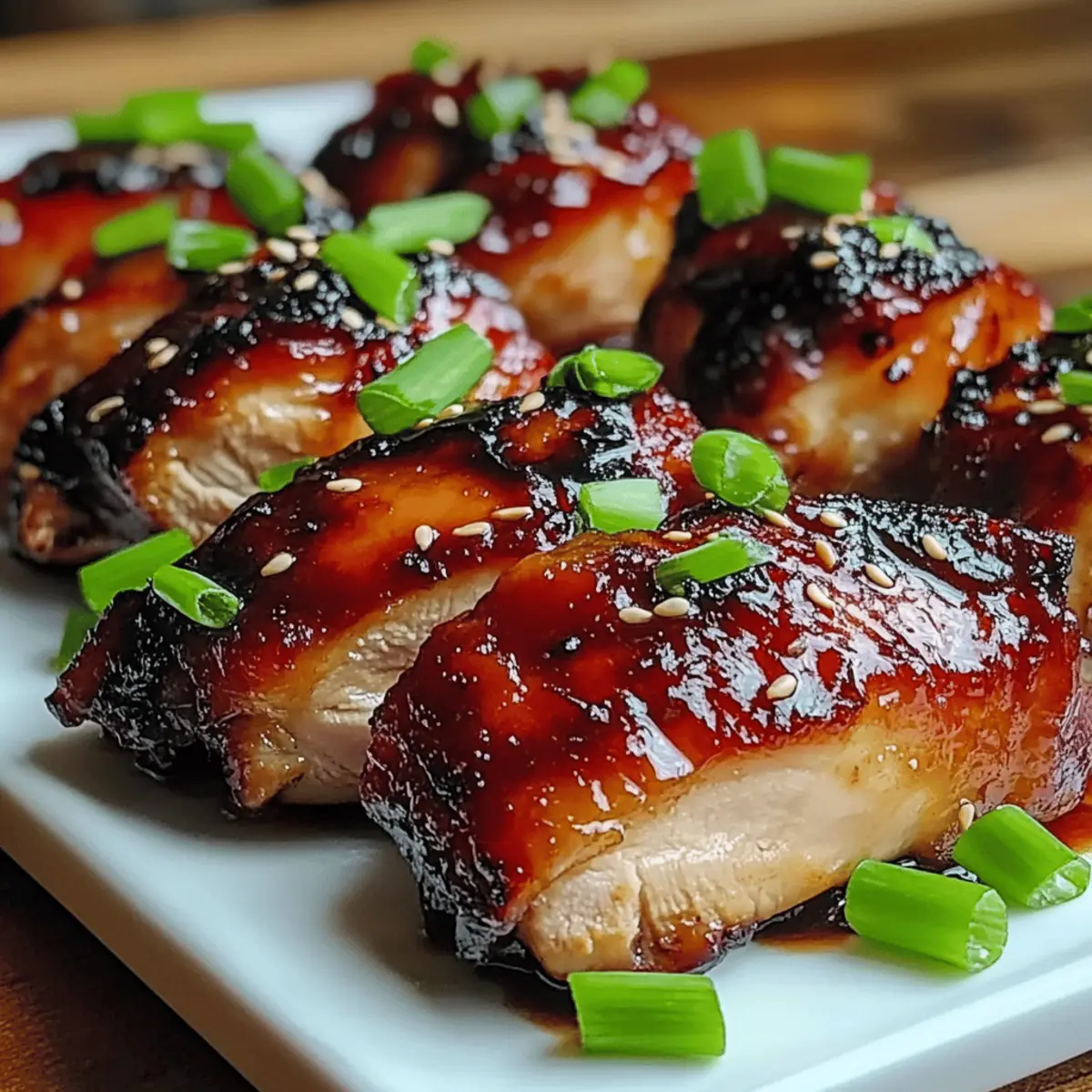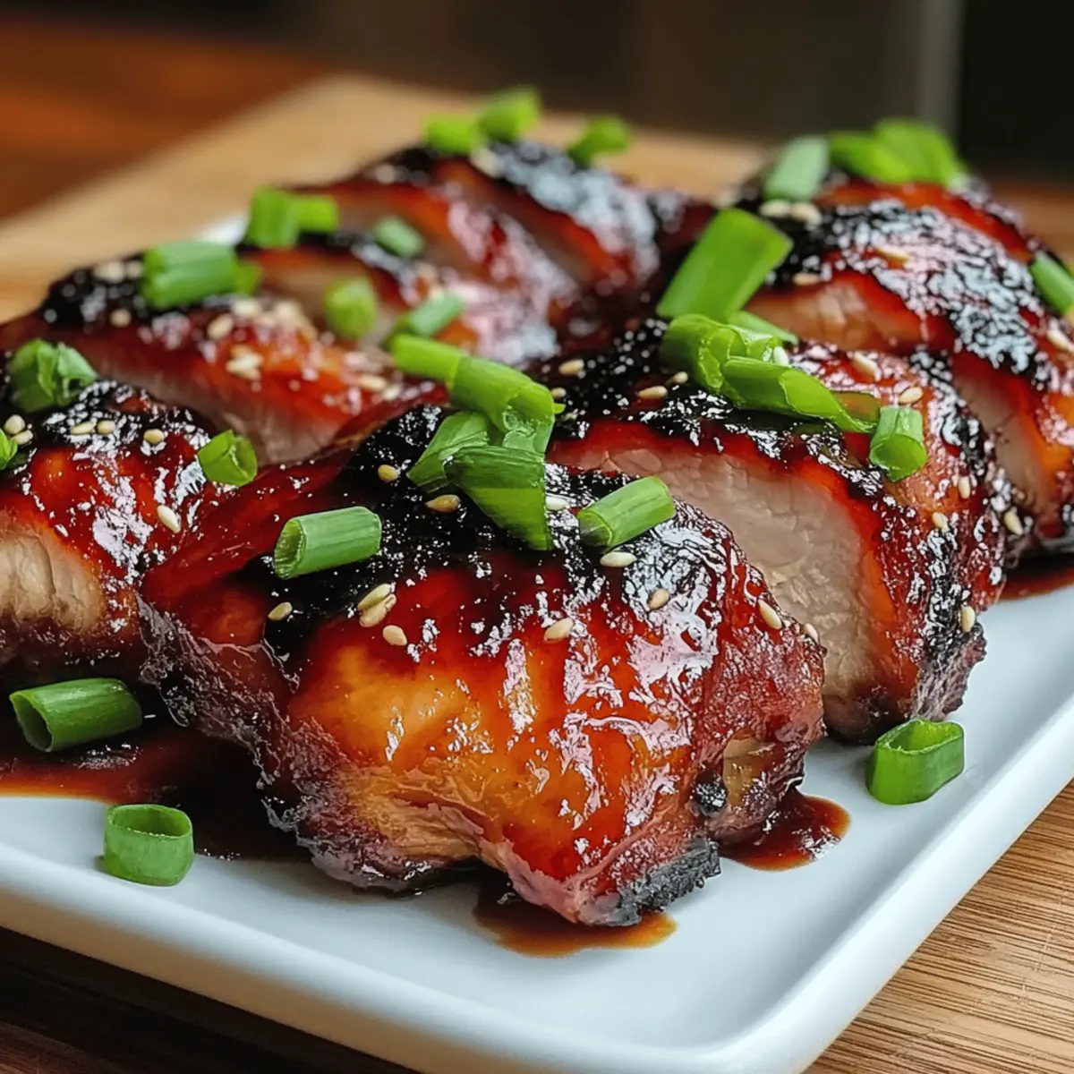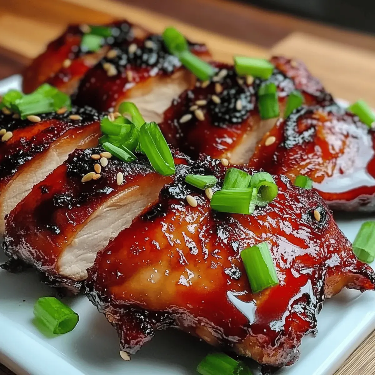 Jump to Recipe Print RecipeAs I stood at my kitchen counter, the smell of sizzling spices began to transport me straight to the bustling streets of Hong Kong, where the vibrant allure of Char Siu Chicken reigns supreme. This dish—with its perfect marriage of sweet and savory notes—offers a delightful twist that can elevate weeknight dinners or become the star of your next gathering. Packed with flavor and surprisingly easy to whip up, my Char Siu Chicken recipe provides both traditional bone-in, skin-on options and a lighter variation using boneless, skinless thighs. Whether you’re a dedicated home chef or just looking for a delicious escape from takeout, this dish brings the essence of authentic Asian cuisine right to your table. What are you waiting for? Let’s dive into the flavors that will make your taste buds sing! Why is Char Siu Chicken a must-try? Irresistible Aroma: The captivating scent that fills your kitchen while this dish cooks will have everyone eagerly waiting for dinner. Flavor Explosion: Sweet, savory, and slightly smoky notes combine for a taste sensation that’s hard to resist. Easy to Prepare: With just a simple marinade and a short bake time, you’ll have a delicious meal ready in no time. Versatile Options: Choose between traditional bone-in or a lighter boneless version—perfect for any dietary preference! Pair it with steamed white rice or fresh veggies for a complete meal, or switch things up with my Garlic Parmesan Chicken for a different flavor adventure. Crowd-Pleasing Delight: Impress your friends and family with a dish that embodies the heart of Asian cooking while being incredibly simple to make! Char Siu Chicken Ingredients For the Chicken • Chicken Thighs – Bone-in, skin-on thighs provide juiciness, while boneless, skinless pieces make for a lighter option. For the Marinade • Soy Sauce – Adds a savory umami depth; substitute with tamari for a gluten-free version of Char Siu Chicken. • Hoisin Sauce – Contributes a delightful sweetness and tang to the glaze. • Rice Vinegar – Balances the flavors with a touch of acidity for a well-rounded profile. • Honey – Creates a luscious caramelized coating; feel free to use maple syrup for a different sweetness. • Five-Spice Powder – Infuses warm, aromatic flavors typical of traditional Chinese dishes. Aromatic Enhancements • Garlic – Elevates the overall taste with its unmistakable depth. • Ginger – Adds a warm and zesty kick to the marinade. For Cooking • Vegetable Oil – Ideal for cooking the chicken; can also use grapeseed or canola. For Garnish • Green Onions – Provide a fresh crunch and vibrant color on top. • Sesame Seeds – Add texture and a nutty flavor to your dish. Step‑by‑Step Instructions for Char Siu Chicken Step 1: Marinate Chicken In a large bowl, combine soy sauce, hoisin sauce, rice vinegar, honey, five-spice powder, minced garlic, and ginger. Whisk the marinade until well mixed. Add the chicken thighs, ensuring each piece is thoroughly coated in the marinade. Cover the bowl with plastic wrap and refrigerate for at least 30 minutes, but for best flavor, aim for 24 hours to let the Char Siu Chicken absorb those delightful flavors. Step 2: Preheat Oven Preheat your oven to 325°F (165°C) if you’re using bone-in, skin-on thighs for a traditional cook, or to 425°F (220°C) for a quicker version with boneless, skinless thighs. The right temperature will ensure your chicken cooks evenly while achieving that signature sticky glaze. Step 3: Prepare Baking Sheet Line a baking sheet with parchment paper or aluminum foil to simplify cleanup later. This step is vital as it allows the marinade to caramelize and collect in the tray without sticking. Make sure the paper or foil fits snugly to catch any drippings for a delicious dipping sauce later. Step 4: Arrange Chicken Take the marinated chicken out of the refrigerator and place it spaced apart on the prepared baking sheet. Ensure no pieces are overlapping to allow even cooking and browning. This arrangement is key for achieving that glorious glaze we love in Char Siu Chicken. Step 5: Roast Bake the chicken in the preheated oven, basting every 15 minutes with the leftover marinade. If using traditional thighs, roast for 45-55 minutes, or 15-18 minutes for the boneless option. Check that the thickest part reaches 165°F (75°C) using a meat thermometer, ensuring it’s cooked yet juicy. Step 6: Rest and Serve Once cooked, remove the Char Siu Chicken from the oven and allow it to rest for about 5 minutes. This resting period helps retain the juices. Garnish with freshly sliced green onions and a sprinkle of sesame seeds for added color and flavor before serving, bringing your delectable creation to life! What to Serve with Char Siu Chicken When it comes to crafting the perfect meal around your enticing Char Siu Chicken, the possibilities are deliciously endless! Steamed White Rice: The classic companion, its fluffy texture soaks up the sticky glaze, making every bite a delight. Sautéed Bok Choy: This veggie adds a crisp, fresh crunch and balances the dish’s richness with its light, peppery taste. Cucumber Salad: Refreshing and cool, it offers a delightful contrast to the savory chicken while adding a pop of color. Stir-Fried Vegetables: A medley of colorful bell peppers, carrots, and snap peas not only brings nutrition but enhances the overall flavor experience. Chilled Sesame Noodles: These tangy, nutty noodles complement the sweetness of the chicken, making each forkful a satisfying treat. Garlic Breadsticks: Golden and buttery, they provide a comforting, familiar touch while allowing you to mop up savory juices. Crisp Green Salad: Tossed with sesame dressing, it adds brightness and a refreshing crunch to balance the robust flavors. Iced Green Tea: The lightness of this drink pairs perfectly with the rich tastes of Char Siu Chicken, enhancing your dining experience. Mango Sorbet: A fruity, refreshin