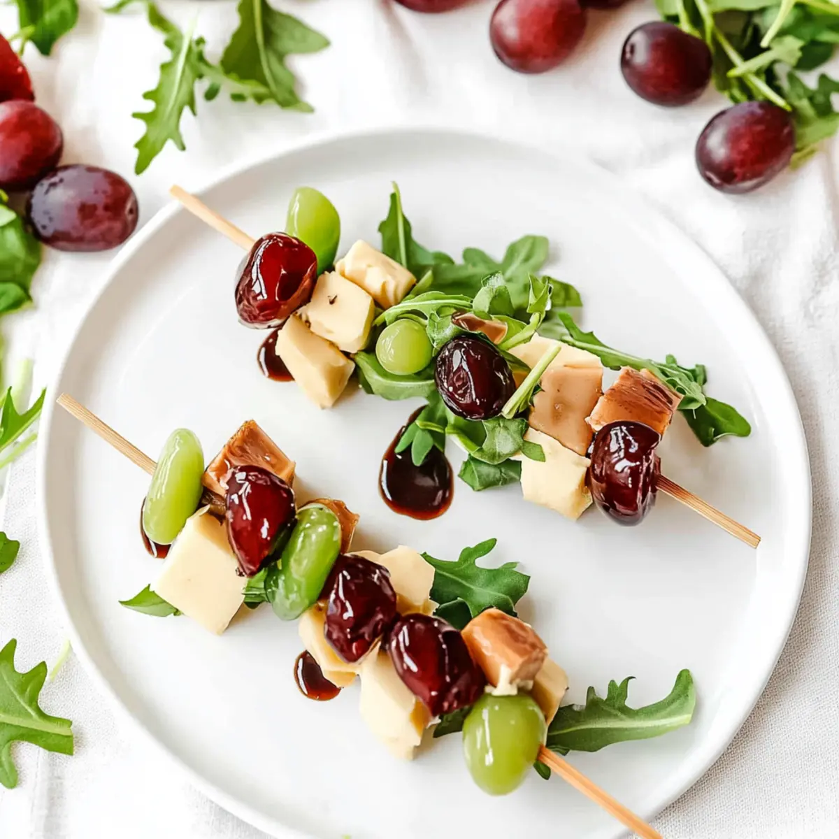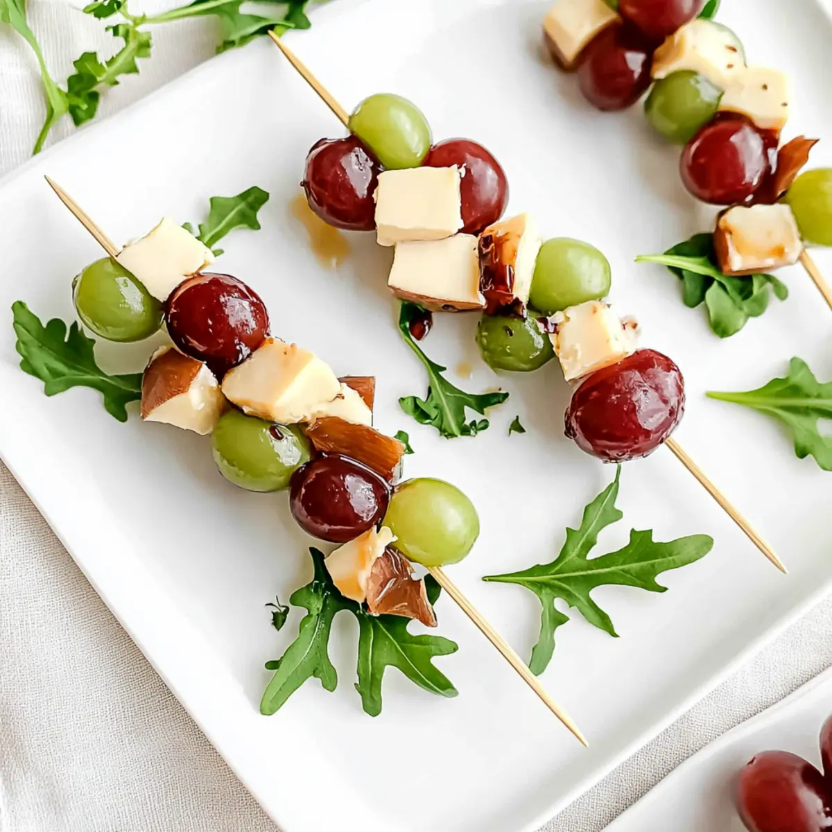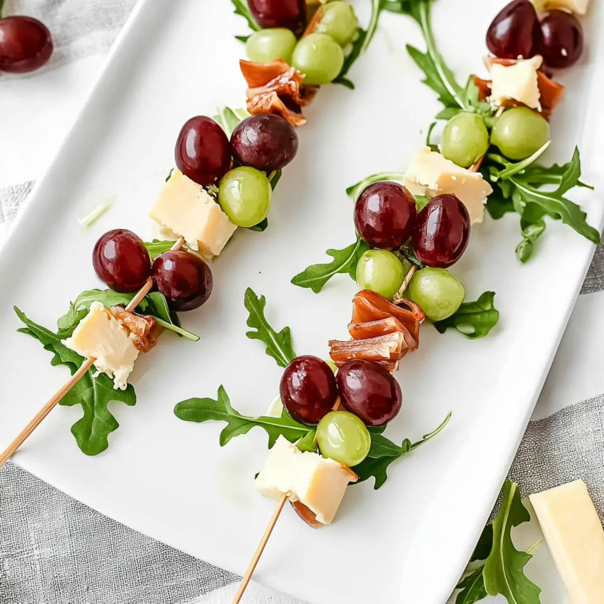 Jump to Recipe Print RecipeAs I stood in my kitchen, the summer sun streaming through the window, inspiration struck. I craved something light and refreshing to grace my next gathering, and then it hit me—these vibrant Cheese and Grape Skewers! With a delightful mix of juicy grapes, nutty gouda, and salty prosciutto, they’re not just beautiful to behold but also a breeze to whip up in just 15 minutes. These gluten-free appetizers are perfect for any occasion, whether it’s a backyard barbecue or a cozy evening with friends. Packed with flavor and color, they’re a wholesome option that feels indulgent without the guilt. Curious to learn how to bring this tasteful twist to your table? Let’s dive into this simple yet stunning recipe! Why Make Cheese and Grape Skewers? Simplicity at its finest: You can whip these up in just 15 minutes, making them a go-to for busy days or last-minute gatherings. Vibrant flavors of sweet grapes and savory prosciutto create an irresistible combination that your guests will rave about. Customizable to suit your taste, feel free to swap in different cheeses like sharp cheddar or experiment with fresh fruit alternatives such as seasonal pears. Healthy indulgence shines through these gluten-free skewers, with only 49 calories each, ensuring you can snack guilt-free. These skewers are perfect for serving at any event, just like my popular Broccoli Cheese Rounds or Oreo Cheesecake Decadent. Cheese and Grape Skewers Ingredients • Here’s everything you need! For the Skewers Red Seedless Grapes – Adds a delightful sweetness and vibrant color; try green grapes for a fun twist. Green Seedless Grapes – These tart grapes balance the sweetness of red ones perfectly. Arugula Leaves – Offers a peppery freshness; substitute with spinach or mixed greens if desired. Gouda Cheese – Provides nutty richness; feel free to use sharp cheddar or brie for variety. Prosciutto – Infuses a savory quality; swap with turkey bacon or omit for a vegetarian version. Wooden Appetizer Toothpicks – Essential for easy assembly; if you don’t have these, small skewers do the trick. Balsamic Glaze (Optional) – Enhances the dish with a sweet-tangy note; balsamic vinegar can be a lighter alternative. Let’s get ready to create these colorful Cheese and Grape Skewers that will impress every guest! Step‑by‑Step Instructions for Cheese and Grape Skewers Step 1: Prepare the Ingredients Start by washing the red and green seedless grapes under cool running water, then gently pat them dry with a clean kitchen towel. Ensure you remove any stems or bruised grapes. This prep will give you fresh, sweet grapes for your cheese and grape skewers, enhancing the overall flavor and appearance of your delightful appetizer. Step 2: Assemble the Skewers Take a wooden appetizer toothpick and thread one red grape onto it, leaving a little space at the top for ease of handling. This first grape will serve as the vibrant anchor point for your cheese and grape skewer and sets the tone for a colorful presentation that’s pleasing to the eye as well as the palate. Step 3: Add the Arugula Fold 1-2 arugula leaves in half, then carefully skewer them just beneath the red grape. This peppery green not only adds a delightful crunch but also a pop of color. The arugula complements the sweetness of the grapes, making your cheese and grape skewers even more flavorful and visually appealing. Step 4: Insert the Gouda Cheese Next, add a cube of gouda cheese below the arugula. Aim for a piece that’s roughly the same size as the grape for a balanced bite. The creamy, nutty richness of the gouda pairs perfectly with the grapes, creating a wonderful contrast in flavors as you build your delightful skewers. Step 5: Layer in the Prosciutto Take a slice of prosciutto, fold it neatly, and slide it onto the skewer right beneath the gouda. This salty addition elevates your cheese and grape skewers, contributing a savory depth that beautifully balances the sweetness of the fruits. The texture will vary with each bite, enhancing the overall experience. Step 6: Finish with the Green Grape Complete the skewer by threading a green grape beneath the prosciutto. This tart little gem will provide a refreshing contrast to the richness above it. As you assemble these skewers, the combination of hues and textures will ensure they are visually stunning, making them a standout appetizer. Step 7: Repeat the Process Continue the assembly process, creating additional skewers with the same layering method until all your ingredients are used. Aim for an attractive mix of red and green grapes alongside the gouda and prosciutto. As you build your cheese and grape skewers, the simplicity of the assembly allows for creativity in how you arrange each colorful piece. Step 8: Drizzle with Balsamic Glaze If desired, finish your assembled skewers with a light drizzle of balsamic glaze for a tangy, sweet note. This step is optional, but it adds a delightful touch that enhances the flavor. Arrange your cheese and grape skewers on a serving platter, and they are now ready to impress your guests at any gathering. Cheese and Grape Skewers Variations Feel free to personalize your cheese and grape skewers with these delightful twists and swaps to enhance flavors and textures! Seasonal Fruits: Substitute grapes with sliced apples or pears for a refreshing fall twist. The added sweetness pairs beautifully with cheese. Herbed Greens: Replace arugula with fresh basil or mint for an aromatic lift. These herbs will introduce a burst of freshness to every bite. Cheese Variety: Try blue cheese or goat cheese instead of gouda for a tangy kick. These choices create a bold flavor profile that’s sure to impress. Vegan Option: Leave out prosciutto and use marinated tofu or tempeh for heartiness. These alternatives make the skewers both satisfying and completely plant-based. Spicy Kick: Add sliced jalapeños or a sprinkle of red pepper flakes to the layering. 