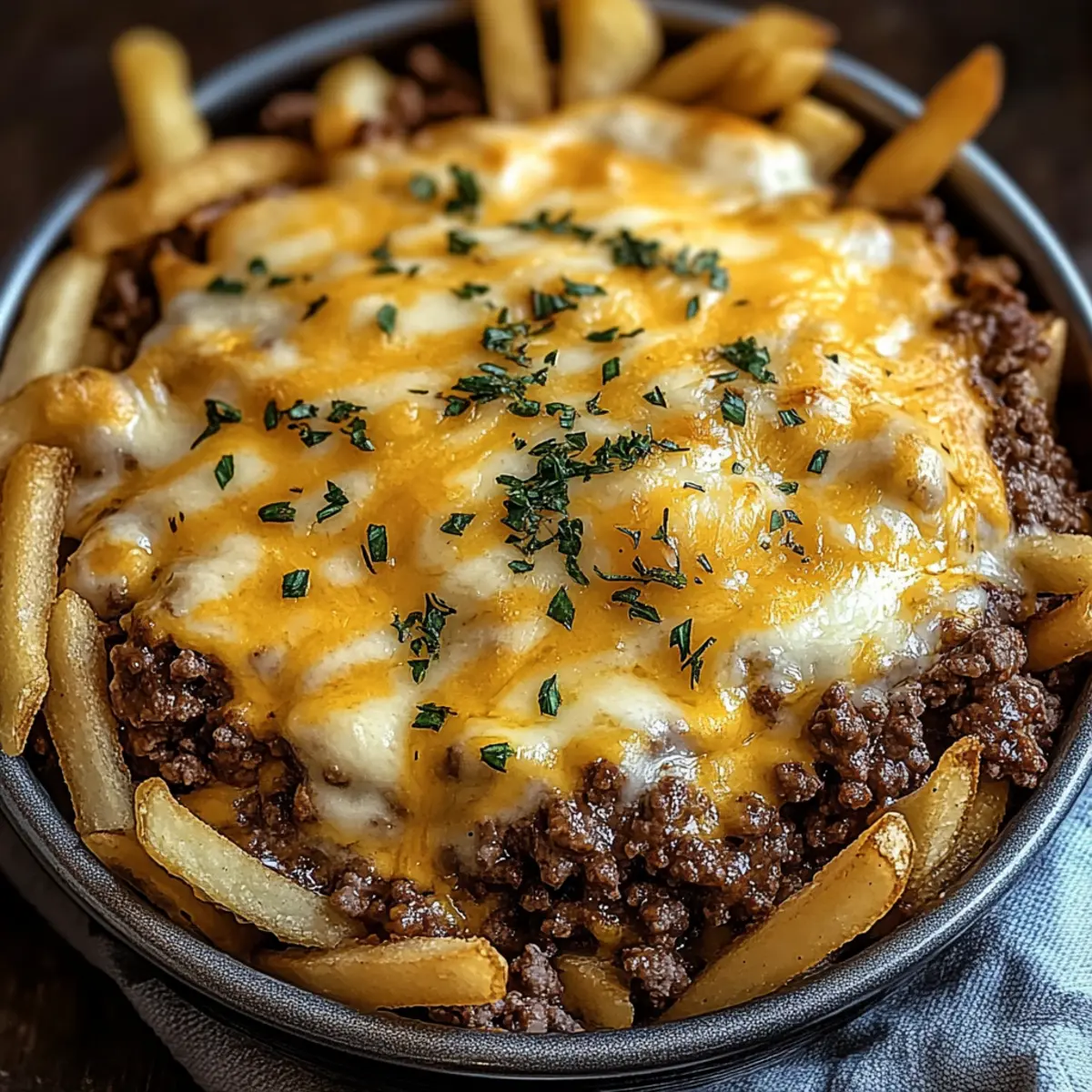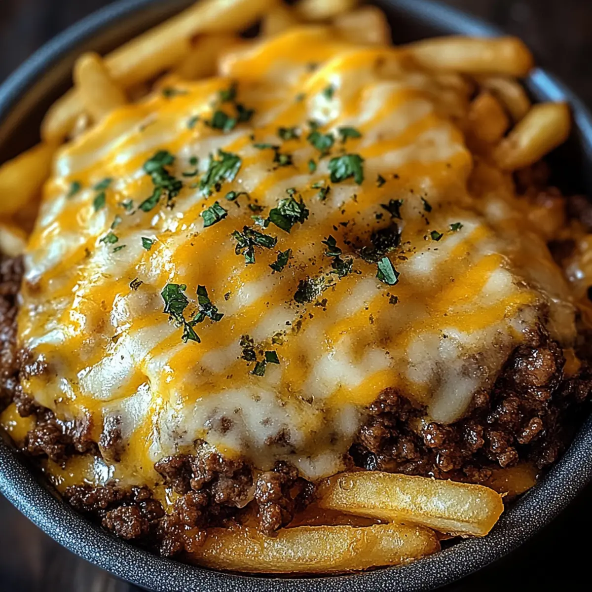 Jump to Recipe Print RecipeAs I pulled the bubbling dish from the oven, my kitchen filled with the irresistible aroma of a classic cheeseburger reimagined. Enter the Cheeseburger French Fry Casserole—a delightful medley of juicy beef, melty cheese, and crispy French fries that’s not just a recipe, but a cozy hug on a plate. This dish is perfect for those bustling weeknights or family gatherings when everyone craves comfort food. It’s also incredibly customizable, allowing you to swap ingredients and adjust flavors to suit your family’s preferences. Best of all, it’s an easy make-ahead option, so you can spend less time in the kitchen and more time enjoying the smiles of loved ones around the table. Ready to dive into this delicious adventure? Let’s get cooking! Why is this casserole a must-try? Comforting Combination: The Cheeseburger French Fry Casserole blends two favorites into one dish that feels familiar yet exciting. Easy Prep: With simple steps and less than an hour in the oven, dinner doesn’t get any easier than this! Customizable for Everyone: Swap out ground beef for turkey or veggies, and adjust toppings and spices to suit your family’s taste. Kid-Friendly Joy: This hearty meal is sure to please even the pickiest eaters, making mealtime a breeze. Make-Ahead Versatility: Prep it ahead of time and pop it in the oven when you’re ready—perfect for busy evenings! Plus, if you love make-ahead meals, check out my Ground Turkey Fry for another easy option. Get ready to impress your family with a dish that tastes like home cooked love! Cheeseburger French Fry Casserole Ingredients Prepare to whip up a delightful feast with these ingredients! For the Casserole • Ground Beef – Provides necessary protein and heartiness; swap for ground turkey or plant-based options for a lighter twist. • Frozen French Fries – Crisp and crunchy, acting as the perfect base; use tater tots for a fun texture change. • Shredded Cheddar Cheese – Adds creamy melt and flavor; American cheese or a cheese blend can be great alternatives. • Diced Onions (optional) – Enhances depth of flavor; feel free to omit if you’re not an onion fan. • Diced Pickles (optional) – Gives that tangy twist reminiscent of classic cheeseburgers; skip for a milder taste. • Ketchup and Mustard – Essential for that authentic cheeseburger taste, delivering moisture and zesty zing. • Milk – Adds creaminess; substitute with Greek yogurt for a lighter, tangy touch. • Mayonnaise – Ensures richness; sour cream works well if you prefer a change. • Spices (garlic powder, onion powder, salt, pepper) – Elevate the overall taste; modify to match your spice preference. • Fresh Parsley (optional) – Adds a pop of color and freshness; omit if not on hand. Get ready to enjoy a comforting masterpiece with your customized Cheeseburger French Fry Casserole! Step‑by‑Step Instructions for Cheeseburger French Fry Casserole Step 1: Preheat the Oven Start by preheating your oven to 375°F (190°C). This is an essential step to ensure that your Cheeseburger French Fry Casserole bakes evenly, resulting in a deliciously bubbly top. While the oven warms up, take a moment to gather all your ingredients on the counter to streamline your cooking process. Step 2: Cook the Ground Beef In a large skillet, add 1 pound of ground beef over medium heat. Season it with salt, pepper, garlic powder, and onion powder. Cook for 6-7 minutes, using a spatula to break the meat apart as it browns. Once fully cooked and no longer pink, drain the grease and allow the flavorful beef to rest in the skillet. Step 3: Mix the Beef Ingredients Stir in ketchup, mustard, mayonnaise, diced onions, and pickles into your cooked ground beef. This mixture will incorporate all the classic cheeseburger flavors that make this casserole special. Cook for an additional 2 minutes, stirring until everything is well combined and heated through, allowing the savory aromas to fill your kitchen. Step 4: Prepare the Baking Dish Grease a 9×13-inch baking dish with cooking spray or olive oil to ensure your casserole doesn’t stick. Spread an even layer of frozen French fries across the bottom of the dish. This crispy base will provide the perfect foundation for your Cheeseburger French Fry Casserole, creating a delightful contrast in textures. Step 5: Layer the Beef Mixture Spoon the savory beef mixture evenly over the bed of French fries in the baking dish, ensuring every fry gets a taste of the delicious flavor. Don’t worry about perfection; just try to distribute it as uniformly as you can. This layering is crucial for every bite being full of that irresistible cheeseburger essence. Step 6: Add the Cheese Generously sprinkle the shredded cheddar cheese over the beef and fries, allowing the melty goodness to blanket the casserole. The cheese will melt beautifully during baking, forming a gooey, golden topping that will be the star of your dish. Use as much cheese as your heart desires for a truly indulgent experience! Step 7: Bake It to Perfection Place the casserole in the preheated oven and bake for 25-30 minutes. Keep an eye on it; when the cheese is perfectly melty and the edges are bubbly and golden, it’s ready! The delightful aroma wafting through your home will surely have everyone buzzing with anticipation. Step 8: Cool and Garnish Once baked, remove the casserole from the oven and let it cool for about 5 minutes. This resting time allows the layers to set slightly, making it easier to serve. For a pop of color and freshness, garnish with chopped fresh parsley before serving. Enjoy your comforting Cheeseburger French Fry Casserole hot! Cheeseburger French Fry Casserole Variations Feel free to make this comforting casserole your own with these tasty twists and substitutions! Dairy-Free: Substitute dairy cheese with cashew cheese or vegan cheese shreds for a plant-based option. Spicy Kick: Add diced jalapeños or a sprinkle of cayenne 