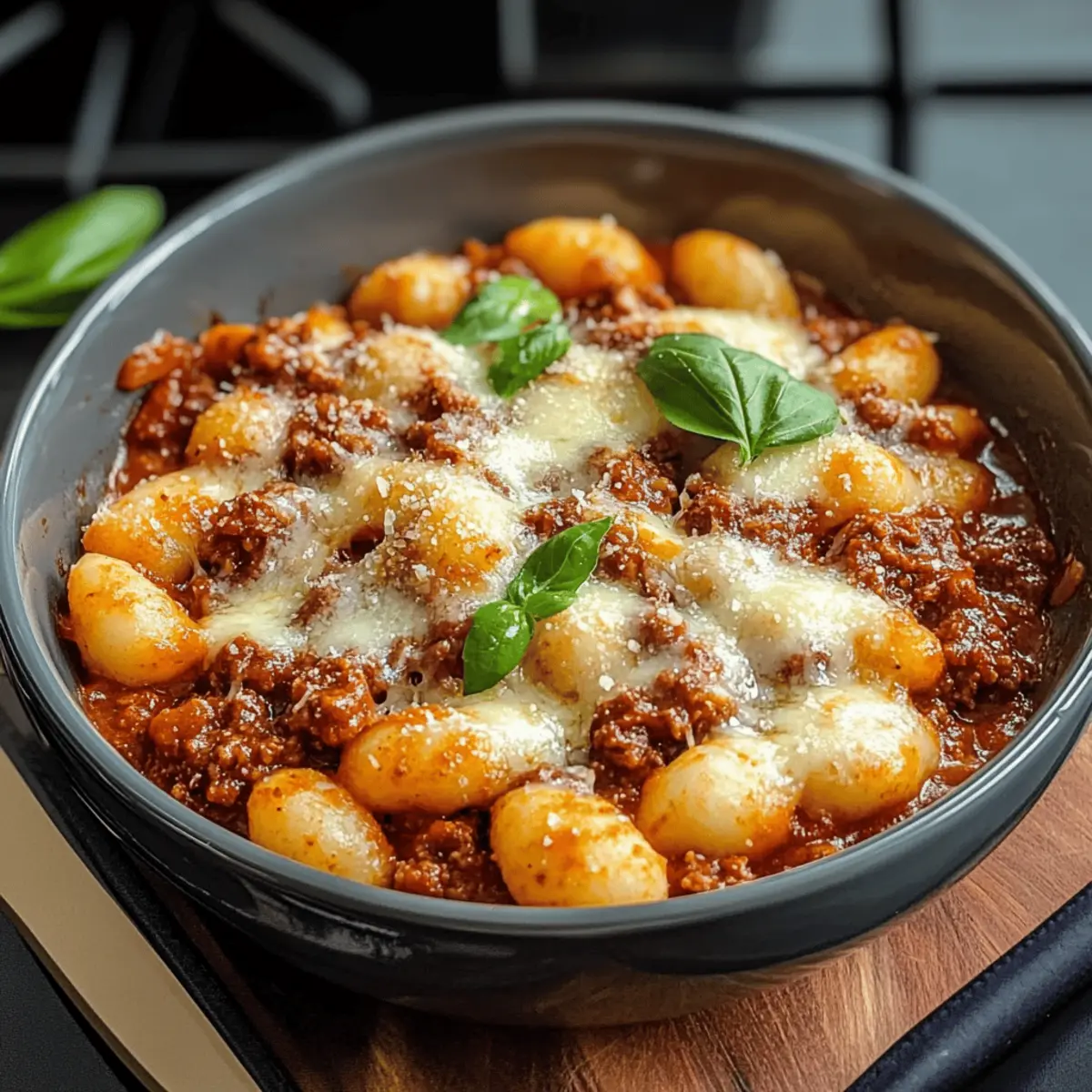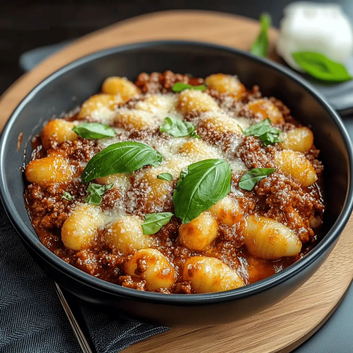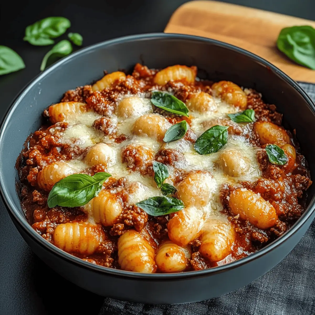 Jump to Recipe Print RecipeThere’s something magical about the way the scent of garlic and onion dancing in a hot skillet can instantly transport me to a sun-soaked Italian kitchen. Today, I’m excited to share my Cheesy Bolognese Gnocchi Bake—a dish that wraps pillowy gnocchi in a robust bolognese sauce, all topped with gooey mozzarella. This recipe strikes the perfect balance between comfort food and family-friendly fare, making it an ideal choice for busy weeknights when you crave something both satisfying and easy to prepare. Plus, it’s a great way to sneak in some veggies for the little ones without them noticing! Ready to turn your kitchen into a cozy bistro? Let’s dive in! Why is this recipe a must-try? Comforting Warmth: This Cheesy Bolognese Gnocchi Bake is like a warm hug on a plate, ideal for chilly evenings or family gatherings. Quick & Easy: With easy-to-find ingredients and straightforward steps, you can whip it up in no time—perfect for busy weeknights! Kid-Approved Flavor: Kids love the cheesy, hearty goodness, making it a surefire way to keep everyone at the table happy. Consider pairing it with a fresh salad or some crusty garlic bread for a delightful meal. Flavor Packed: The rich bolognese sauce, infused with aromatic garlic and herbs, complements the soft gnocchi beautifully, ensuring each bite is bursting with flavor. Versatility: Feel free to customize with your favorite veggies or alternative cheeses; it’s a dish that adapts to every taste, much like our Cheesy Taco Potatoes! Cheesy Bolognese Gnocchi Bake Ingredients For the Gnocchi Base • Gnocchi – Soft potato dumplings that serve as a hearty base; can be replaced with pasta like penne or shells for a different texture. For the Bolognese Sauce • Ground Beef – Adds protein and depth to the bolognese sauce; use ground turkey or a plant-based alternative for a lighter or vegetarian option. • Onion – Provides aromatic flavor; sauté until translucent; yellow or white onions work best. • Garlic – Enhances overall aroma and flavor; sauté until fragrant; garlic powder can be used in a pinch. • Crushed Tomatoes – Forms the tangy base of the sauce; fresh tomatoes can be blended, though canned is easier. • Tomato Paste – Deepens flavor and balances acidity; increased paste adds richness; adjust to taste. • Italian Seasoning – Blends herbs like oregano and basil for warm notes; fresh herbs can be used for better flavor. • Red Pepper Flakes (optional) – Adds spice for those who enjoy a kick; adjust according to heat preference. For the Cheesy Topping • Mozzarella Cheese – Melts into a gooey topping for a golden finish; provolone or fontina can be mixed in for additional flavor. • Parmesan Cheese – Contributes a nutty, salty element and assists in browning; freshly grated is preferred for best results. For Cooking • Olive Oil – Used for sautéing the aromatics; any vegetable oil can work as a substitute. • Salt & Pepper – Basic seasonings that enhance all flavors; adjust quantities based on taste. Step‑by‑Step Instructions for Cheesy Bolognese Gnocchi Bake Step 1: Preheat the Oven Begin by preheating your oven to 375°F (190°C). This ensures an even baking temperature for your Cheesy Bolognese Gnocchi Bake. Allow the oven to fully heat while you prepare the other components, so everything comes together perfectly when it’s time to bake. Step 2: Sauté Aromatics In a large skillet, heat 2 tablespoons of olive oil over medium heat. Add 1 diced onion, cooking for about 5 minutes or until it turns translucent. Then, stir in 2 minced garlic cloves and continue cooking for an additional 1-2 minutes until fragrant, filling your kitchen with a savory aroma that sets the tone for your savory dish. Step 3: Brown the Beef Next, add 1 pound of ground beef to the skillet, breaking it apart with a spatula. Season with salt and pepper, cooking for about 7-10 minutes until the beef is browned and fully cooked. Make sure there’s no pink remaining to ensure delicious flavor and proper safety, as this forms the hearty base of your bolognese sauce. Step 4: Build the Sauce Stir in 2 tablespoons of tomato paste, allowing it to meld with the cooked beef for about a minute. Then, add 1 can (28 ounces) of crushed tomatoes along with 1 teaspoon of Italian seasoning and optional red pepper flakes. Let the sauce simmer for about 10 minutes, stirring occasionally, until it thickens and the flavors blend beautifully together. Step 5: Prepare the Gnocchi Meanwhile, cook 1 package of gnocchi according to the package instructions, usually around 2-3 minutes in boiling water. Once they float to the top, they are ready! Drain the gnocchi and set them aside momentarily while you await the sauce’s completion, ensuring they stay tender and pillowy. Step 6: Assemble the Bake In a large baking dish, combine the drained gnocchi with the bolognese sauce, tossing gently to coat all the gnocchi. Top the mixture generously with mozzarella cheese and a sprinkle of grated Parmesan for that irresistible cheesy layer. This assembly prepares your flavors for a luscious bake that will delight everyone around the table. Step 7: Bake Until Bubbling Place your assembled Cheesy Bolognese Gnocchi Bake into the preheated oven. Bake for 20-25 minutes, or until the cheese is bubbling and golden, creating that enticing golden crust. You may optionally turn on the broiler for the last 2-3 minutes for extra crispness, but watch carefully so it doesn’t burn! Step 8: Cool & Garnish Before Serving Once you pull the bake from the oven, allow it to cool for a few minutes. This helps set the layers while making it easier to serve. Finish by garnishing with freshly chopped parsley or basil for a pop of color and flavor, and then dig into this comforting dish that promises to be a family favorite! How to Store and Freeze Cheesy Bolognese Gnocchi Bake Fridge: Store leftovers in an airtight container for up to 4 days. Be s