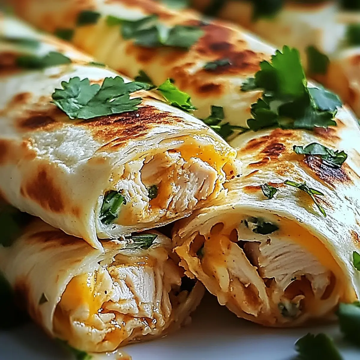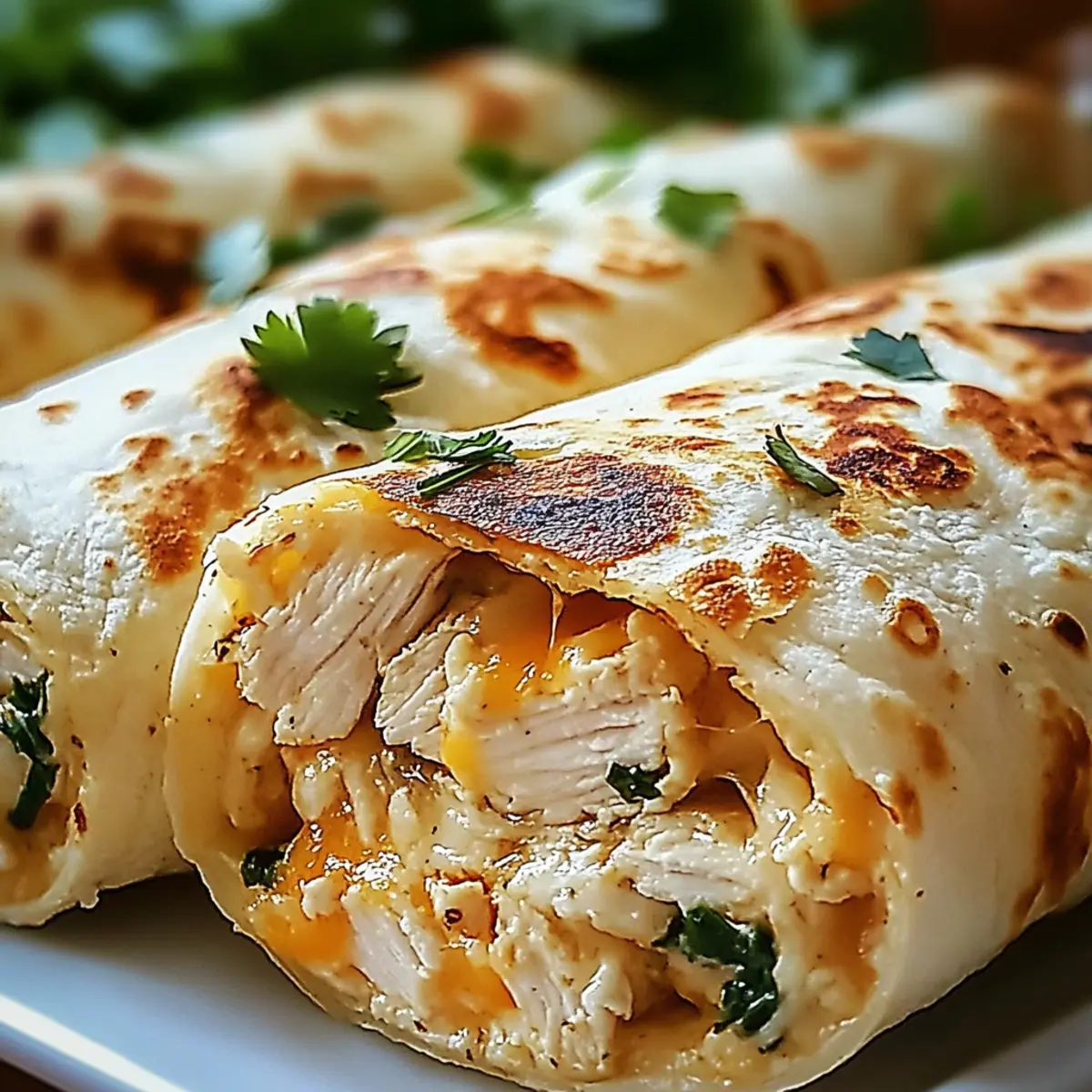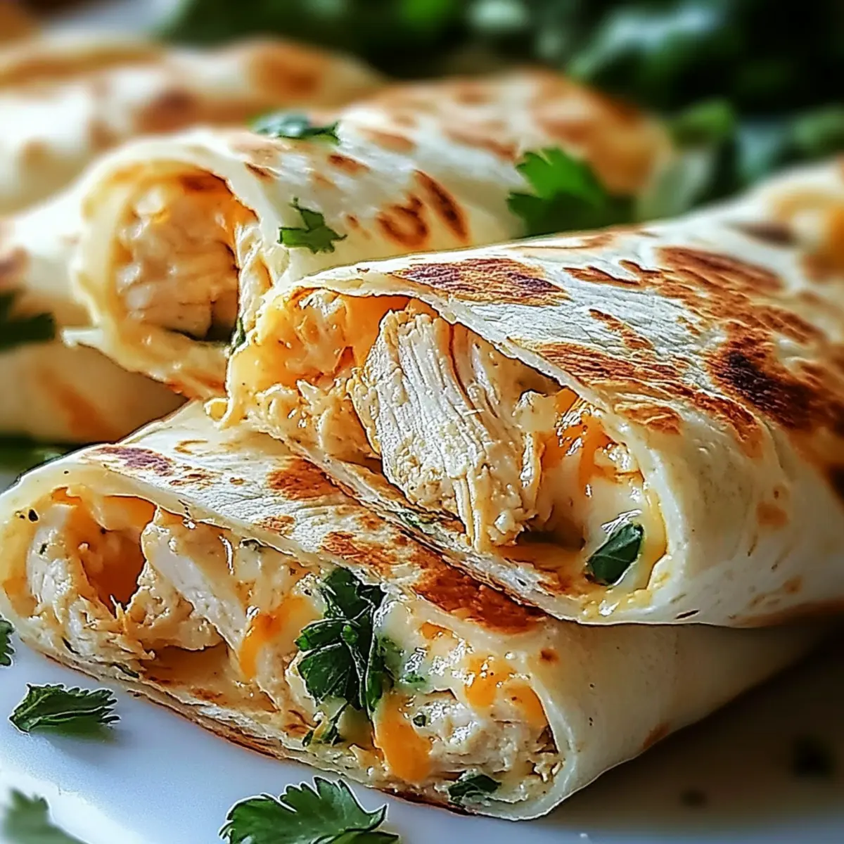 Jump to Recipe Print RecipeThe aroma of sizzling garlic wafting through the kitchen instantly transports me back to my childhood, where family dinners were a delicious adventure. These Cheesy Chicken Garlic Wraps are not just a meal; they’re a speedy way to whip up something special when time is tight. Ideal for those busy weeknights or casual family gatherings, this quick dinner option has quickly become a crowd favorite. The best part? You can customize these wraps to suit your taste, whether you’re adding fresh spinach, swapping out proteins, or dialing up the cheese for extra gooeyness. So, who’s ready to roll up their sleeves and create something deliciously satisfying? Why Are Cheesy Chicken Garlic Wraps Perfect? Quick and Easy: This recipe is designed for those hectic weeknights when you need a meal ready in no time. Packed with Flavor: The savory blend of garlic, melty cheese, and tender chicken creates an irresistible taste that will have everyone asking for seconds. Customizable Delights: Whether you’re sneaking in some spinach for added nutrition or swapping chicken for turkey, these wraps adapt to your personal preferences. Crowd-Pleaser: They’re perfect for family gatherings or casual get-togethers, reminiscent of beloved comfort foods like Chicken Caesar Wraps. Crispy Texture: The perfectly cooked tortillas provide that satisfying crunch, making each bite a delightful experience that balances gooey and crunchy. Time-Saver: With minimal prep and cook time, you can enjoy a delicious homemade meal without the hassle of fast food. Cheesy Chicken Garlic Wraps Ingredients For the Filling Chicken Breasts – Use boneless, skinless to keep it simple and tender. Mozzarella Cheese – Provides that creamy, melty texture; try provolone for a different taste. Cheddar Cheese – Adds a sharp flavor that beautifully complements mozzarella; customize with your favorite cheese. Minced Garlic – This aromatic ingredient infuses the chicken with fantastic flavor; fresh garlic is best, but garlic powder works too. Paprika – Gives a mild smokiness and enhances the color; consider smoked paprika for an extra depth of flavor. Dried Oregano – Imparts a delightful herbaceous note; Italian seasoning can be a great substitute. Olive Oil – Aids in cooking and adds a touch of richness; feel free to use avocado oil instead. Salt and Pepper – Essential for bringing all the flavors together; season to taste. For the Wraps Flour Tortillas – The perfect base for your fillings; whole wheat tortillas can be a healthier choice. Fresh Spinach (optional) – Boosts nutrition and adds vibrant color; swap with kale or other greens if desired. For Serving Sour Cream – Offers a cool, creamy counterpoint to the wraps; Greek yogurt is a wholesome alternative. Chopped Fresh Cilantro – Brightens your dish with a fresh burst; parsley is a great substitute if cilantro isn’t your favorite. Dive into these Cheesy Chicken Garlic Wraps for a quick dinner that will leave your family delighted! Step‑by‑Step Instructions for Cheesy Chicken Garlic Wraps Step 1: Preheat Oven Begin your culinary adventure by preheating your oven to 375°F (190°C). This ensures a perfectly welcoming environment for your Cheesy Chicken Garlic Wraps, allowing the flavors to meld beautifully as they bake later on. Step 2: Prepare Chicken Rinse and pat dry your boneless, skinless chicken breasts, then slice them into 1-inch strips. This size not only facilitates even cooking but also makes it easier to wrap them in the tortillas later. Set them aside as we move on to the marinating step. Step 3: Marinate Chicken In a mixing bowl, combine minced garlic, olive oil, paprika, onion powder, dried oregano, salt, and pepper to create a fragrant marinade. Add the chicken strips and toss to coat thoroughly. Let the mixture marinate for 15-20 minutes, allowing the flavors to penetrate the chicken fully. Step 4: Cook Chicken In a skillet over medium-high heat, add a splash of olive oil and allow it to heat up. Once shimmering, add the marinated chicken strips, cooking them for about 5-7 minutes. Stir occasionally, watching for a golden-brown color and ensuring they are cooked through to an internal temperature of 165°F (75°C). Step 5: Sauté Optional Spinach If you choose to include fresh spinach, add it to the skillet after the chicken is cooked. Sauté for 1-2 minutes until it wilts down, enriching your Cheesy Chicken Garlic Wraps with added nutrition and color. Remove the skillet from the heat and prepare to assemble. Step 6: Assemble Wraps Lay out your flour tortillas on a clean surface or plate. Distribute the cooked chicken (approximately a quarter portion per wrap) evenly, then sprinkle generously with mozzarella and cheddar cheese. If using, layer in some wilted spinach before folding the sides and rolling the tortillas tightly. Step 7: Cook Wraps Return the skillet to medium heat, placing the assembled wraps seam-side down. Cook for about 3-4 minutes on each side until they’re golden and crispy, ensuring the cheese melts perfectly within. Adjust the heat as needed to avoid burning while achieving that delightful crunch. Step 8: Serve Once crispy and perfectly cooked, transfer your Cheesy Chicken Garlic Wraps to a cutting board. Allow them to cool slightly, then slice in half for easy serving. Pair with a dollop of sour cream and a sprinkle of chopped cilantro for added freshness as you delve into this mouthwatering dish! Cheesy Chicken Garlic Wraps Variations Feel free to make these Cheesy Chicken Garlic Wraps your own with these delightful twists! Dairy-Free: Substitute dairy cheese with vegan cheese for a plant-based delight that’s friendly for lactose intolerant family members. Spice It Up: Add jalapeños or crushed red pepper flakes to the filling for an exciting kick of heat that will tantalize your taste buds! Veggie-Packed: Toss in some diced bell peppers or mushrooms for an extra crunch and a medley of flavor