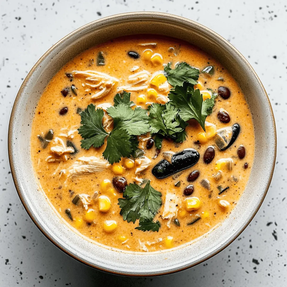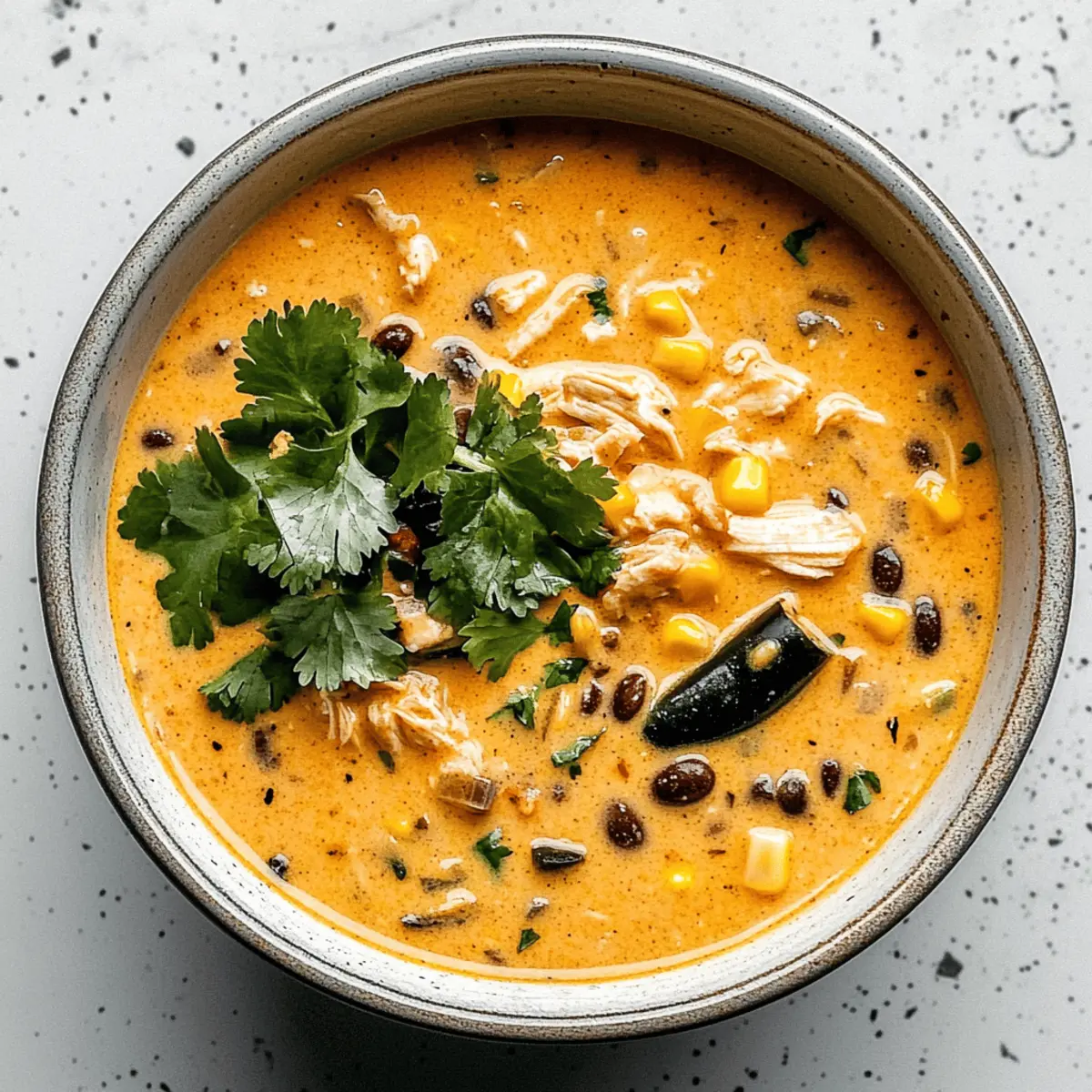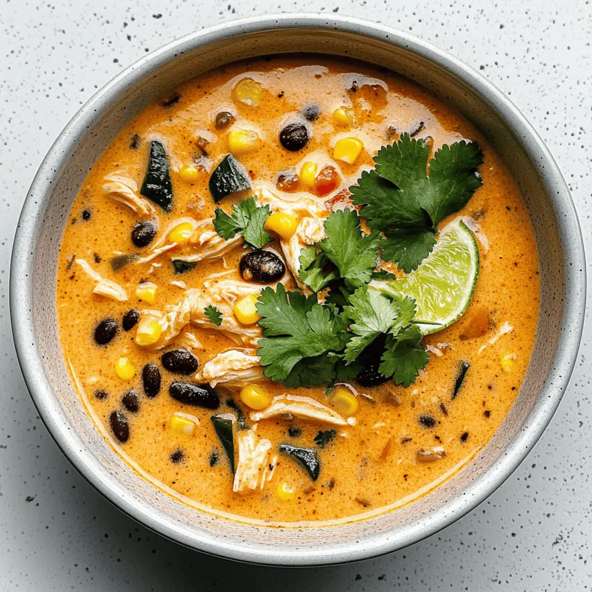 Jump to Recipe Print RecipeThe aroma of smoky poblano peppers filled my kitchen as I prepared a comforting bowl of Creamy Chicken Poblano and Black Bean Soup, the perfect antidote to a long day. This delightful recipe showcases tender shredded chicken, cozy black beans, and a rich creaminess that wraps around you like a warm hug. Designed for small batches, it makes about 1 ½ quarts—ideal for an intimate dinner or leftover lunches for the week! With quick prep time, you’ll be savoring each delicious spoonful in just about an hour. Whether you’re assembling a cozy night in or need a tasty way to fuel your day, this soup balances warmth and flavor with a delightful Southwestern twist. What’s your favorite topping to make your soup experience even better? Why is This Soup a Must-Try? Comforting, there’s nothing quite like a warm bowl of this Chicken, Poblano, and Black Bean Soup to make your day brighter. Small Batch Perfection lets you enjoy hearty flavors without excessive leftovers, making it perfect for couples or small families. Flavor Packed, the combination of smoked poblanos and rich cream meld together beautifully, providing a taste sensation. Quick and Easy to prepare, you’ll have this delicious soup on the table in under an hour. Versatile, feel free to customize it with your favorite toppings like avocado or crumbled cheese, making every bowl uniquely yours. For even more delightful combinations, check out my Cheesy Ranch Sausage or Ground Beef Skillet. Chicken, Poblano, and Black Bean Soup Ingredients • Here’s what you’ll need to create this comforting dish! For the Soup Base Unsalted Butter or Olive Oil – Adds richness to the soup; substitute with coconut oil for a dairy-free option. Yellow Onion (1/2 cup, chopped) – Provides a sweet base flavor; shallots can be used for a milder taste. Poblano Pepper (1, chopped) – Adds mild heat and smoky flavor; opt for red bell peppers for a sweeter alternative. Shredded Chicken (2 cups) – Forms the protein base; rotisserie chicken is recommended for convenience, or tofu for a vegetarian version. Black Beans (1 can, drained, 15 oz) – Contributes creaminess and fiber; pinto beans can substitute if necessary. Frozen Corn (1/2 cup) – Adds sweetness and texture; fresh corn is great when in season. Chicken Broth (3 cups) – Provides a flavorful liquid base; vegetable broth can substitute for a vegetarian option. Heavy Cream (1/2 cup) – Creates a rich, creamy texture; half-and-half or whole milk can be used for a lighter soup. For the Flavor Boost Seasoning Blend (homemade or 1 tbsp Chicken Taco/Fajita seasoning) – Enhances depth of flavor; adjust to your taste preferences. Fresh Lime Juice (2 tsp) – Adds brightness; can replace with lemon juice for a tangy twist. Cilantro (for garnish) – Offers a fresh flavor contrast; omit if undesired or use parsley instead. For Extra Seasoning Garlic Powder (1/2 tsp) – Adds savory depth. Onion Powder (1/2 tsp) – Enhances onion flavor. Chili Powder (1/2 tsp) – Provides warmth and a mild kick. Dried Oregano (1/2 tsp) – Contributes earthiness. Kosher Salt and Freshly Cracked Black Pepper (1/2 tsp each) – Essential for seasoning. Cumin (1/4 tsp) – Adds a warm, earthy flavor profile. Gather these ingredients and prepare to make the most delightful Chicken, Poblano, and Black Bean Soup you’ve ever tasted! Step‑by‑Step Instructions for Chicken, Poblano, and Black Bean Soup Step 1: Sauté the Base In a medium pot, melt 2 tablespoons of unsalted butter or olive oil over medium heat. Add ½ cup of chopped yellow onion and 1 chopped poblano pepper to the pot, and sauté for 5-6 minutes, stirring occasionally, until the onion is translucent and lightly browned. This step builds the aromatic foundation of your Chicken, Poblano, and Black Bean Soup. Step 2: Add Hearty Ingredients Next, stir in 2 cups of shredded chicken, 1 can of drained black beans, and ½ cup of frozen corn into the pot. Pour in 3 cups of chicken broth along with the remaining seasoning blend to enhance flavor. Increase the heat to medium-high, bringing the mixture to a gentle simmer. Cook uncovered for about 15 minutes, allowing the flavors to meld and develop. Step 3: Make It Creamy Once simmered, lower the heat slightly, and stir in ½ cup of heavy cream alongside ½ cup of shredded cheese. Allow the cheese to melt fully into the soup, creating a luscious texture. Keep an eye on the pot, bringing it back to a gentle simmer for 5 minutes. This step brings the creamy goodness to your Chicken, Poblano, and Black Bean Soup. Step 4: Enhance Flavor To deepen the flavors of your soup, let it simmer for an additional 15 minutes. Stir in 2 teaspoons of fresh lime juice and taste for seasoning adjustments, adding kosher salt and freshly cracked black pepper as needed. This critical step infuses your Chicken, Poblano, and Black Bean Soup with bright, zesty notes that elevate the dish. Step 5: Serve and Garnish Ladle the steaming soup into warmed bowls, then garnish each serving with fresh cilantro and any additional toppings you desire, such as avocado or sour cream. This final touch enhances both the visual appeal and flavor profile of your delightful Chicken, Poblano, and Black Bean Soup, making it a heartwarming meal. Make Ahead Options This Creamy Chicken Poblano and Black Bean Soup is a fantastic option for meal prep, making your busy weeknights much easier! You can chop the onions and poblano, as well as shred the chicken, up to 24 hours in advance and store them in the refrigerator in airtight containers. Additionally, you can measure and mix the seasoning blend ahead of time. When you’re ready to enjoy your soup, simply sauté the prepped vegetables, add in the chicken and remaining ingredients, and simmer as directed. This ensures that your flavors meld beautifully and your soup remains just as delicious as when freshly made! Expert Tips for the Best Chicken, Poblano, and Black Bean Soup Shred