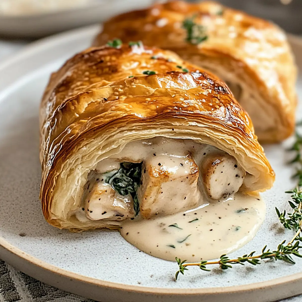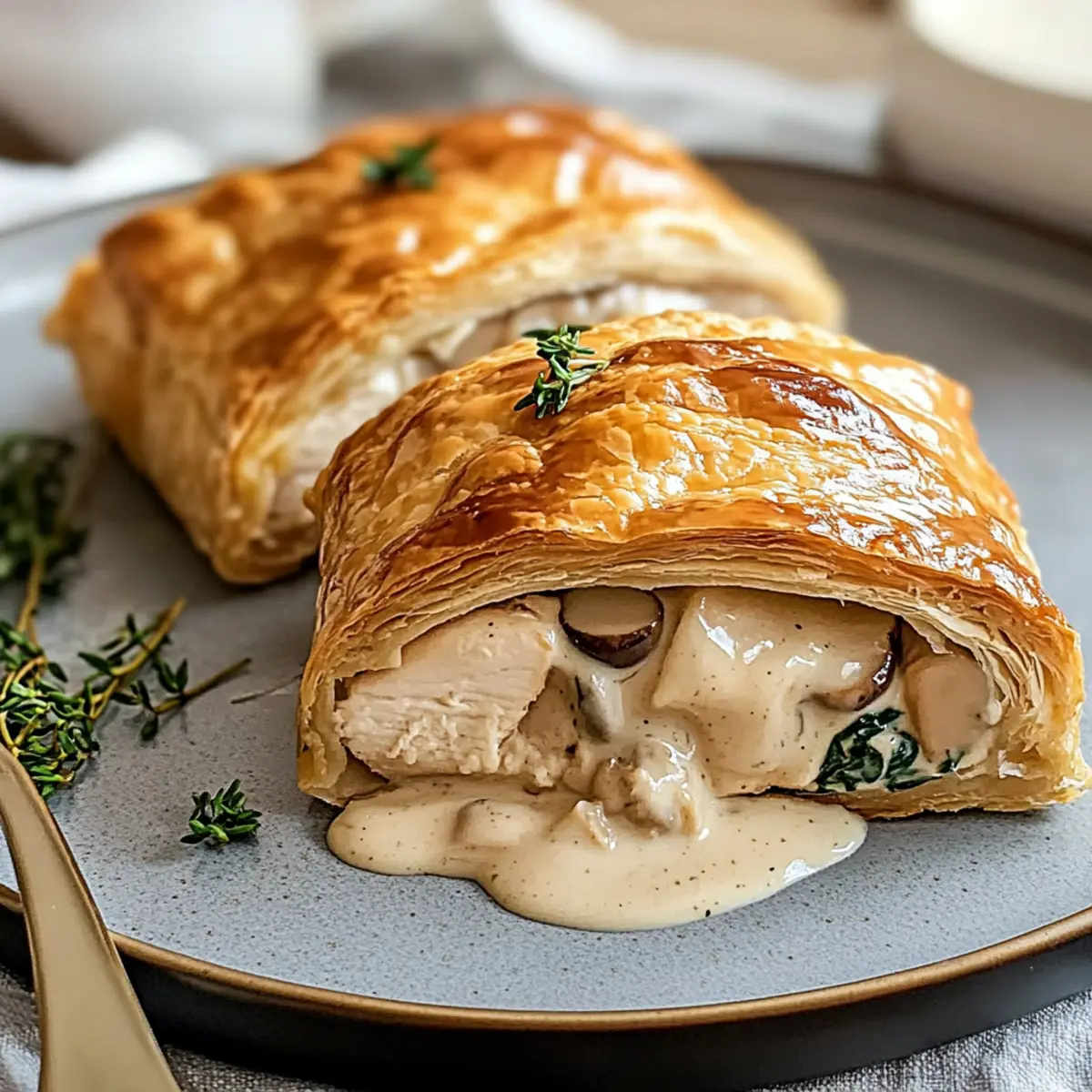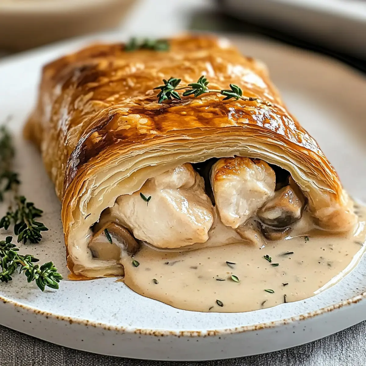 Jump to Recipe Print Recipe“Gather ’round the table, my friends! There’s something special brewing in the kitchen today—Chicken Wellington with Dijon Cream Sauce. This delightful dish is a culinary hug, wrapping succulent chicken and fresh spinach in flaky pastry, guaranteed to warm both heart and home. The aroma of sautéed mushrooms mingling with the sharp kiss of Dijon sauce truly elevates this recipe, making it a fantastic choice for any dinner occasion. You’ll love how it straddles the line between comfort food and elegance, perfect for impressing guests or enjoying a cozy family night in. Plus, it’s a great make-ahead option, allowing you to spend less time in the kitchen and more time with your loved ones. Curious to discover how to create this cozy culinary delight? Let’s dive in!” Why is Chicken Wellington a Must-Try? Decadent, Cozy Comfort: Chicken Wellington with Dijon Cream Sauce embraces the perfect balance of elegance and heartiness, making it a go-to for any gathering. Flaky Goodness: The buttery puff pastry envelops juicy chicken and vibrant spinach, ensuring each bite is a delightful texture experience. Flavor Explosion: Don’t forget the rich mushroom filling and the creamy Dijon sauce, which elevates this dish to gourmet status right from your kitchen. Impressive Presentation: Serve it at your next dinner party, and watch as your guests are wowed by this stunning centerpiece. Easy Make-Ahead: Prep it in advance and bake it fresh when your guests arrive. It’s like setting a culinary trap to impress! If you’re also into other delicious options like Garlic Parmesan Chicken or need a quick weeknight recipe, check out my other favorites that will surely satisfy your taste for homemade goodness! Chicken Wellington Ingredients • Discover the key elements for making the perfect Chicken Wellington with Dijon Cream Sauce. For the Pastry Puff Pastry – A flaky and buttery outer layer; make sure it’s completely thawed for best results. For the Filling Boneless Chicken Breasts – The main protein source, seasoned to perfection; can be swapped with turkey for a lighter dish. Mushrooms – Adds earthiness and texture; opt for finely chopped cremini or button varieties. Fresh Spinach – Offers a nutritional boost and vibrant color; you can substitute it with kale or Swiss chard if desired. Dijon Mustard – Provides a sharp kick of flavor; whole grain mustard adds delightful texture. For the Sauce Heavy Cream – Creates a rich, luxurious sauce; half-and-half can be used for a lighter alternative. Chicken Broth – A flavorful base for the sauce; low-sodium varieties help control salt levels. For Cooking Olive Oil – Ideal for sautéing vegetables; any mild cooking oil can be substituted if needed. Get ready to create a warm and unforgettable dining experience with this Chicken Wellington with Dijon Cream Sauce! Step‑by‑Step Instructions for Chicken Wellington with Dijon Cream Sauce Step 1: Preheat the Oven Begin by preheating your oven to 400°F (200°C) and prepare a baking sheet by lining it with parchment paper. This setup ensures even baking and a perfect golden finish for your Chicken Wellington. While the oven heats up, gather all your ingredients and equipment, making your cooking process smoother and more enjoyable. Step 2: Prepare the Filling In a skillet over medium heat, add a splash of olive oil, then sauté finely chopped mushrooms until they turn golden brown, about 5-7 minutes. Next, toss in the fresh spinach and sauté until wilted, which should take another 2 minutes. Season generously with salt and pepper, then let the mixture cool before combining it with your seasoned chicken to ensure a cohesive filling. Step 3: Season the Chicken Take your boneless chicken breasts and trim any excess fat for a tidy presentation. Season the chicken on both sides with salt and pepper, then spread a thin layer of Dijon mustard on each piece to infuse flavor. This step not only intensifies the taste but also complements the creamy Dijon sauce that will accompany your Chicken Wellington. Step 4: Assemble Wellington On a lightly floured surface, roll out your thawed puff pastry into a rectangle. Place a generous layer of the cooled spinach and mushroom mixture in the center, then lay the seasoned chicken on top. Carefully fold the pastry over the filling, sealing the edges by pinching and crimping to ensure no filling escapes during baking. It’s important to keep it snug but not overly tight to allow for pastry expansion. Step 5: Bake Transfer the assembled Chicken Wellington onto the prepared baking sheet. Brush the top with an egg wash for a beautiful golden finish, then place it in the preheated oven. Bake for 30-35 minutes, or until the puff pastry is golden brown and the chicken reaches an internal temperature of 165°F (75°C). Keep an eye on the pastry; it should puff up beautifully during baking. Step 6: Make the Sauce While your Chicken Wellington is baking, prepare the Dijon cream sauce. In a saucepan, combine heavy cream and chicken broth over medium heat. Stir in Dijon mustard and any desired fresh herbs while the mixture simmers. Allow it to thicken for about 5-7 minutes, stirring occasionally to prevent sticking. This luscious sauce enhances the flavors of your Chicken Wellington delightfully. Step 7: Serve Once baked, remove the Chicken Wellington from the oven and let it rest for about 5 minutes. This resting period keeps the chicken juicy. Slice the Wellington into thick portions and serve each piece drizzled with the creamy Dijon sauce. Enjoy this comforting dish as the ultimate family dinner or an impressive centerpiece for your next gathering! Chicken Wellington Variations & Substitutions Feel free to let your creativity shine by customizing this delightful recipe to suit your taste! Turkey Swap: Substitute chicken with turkey for a leaner take that still delivers on flavor. This is especially perfect for holiday gatherings or a u