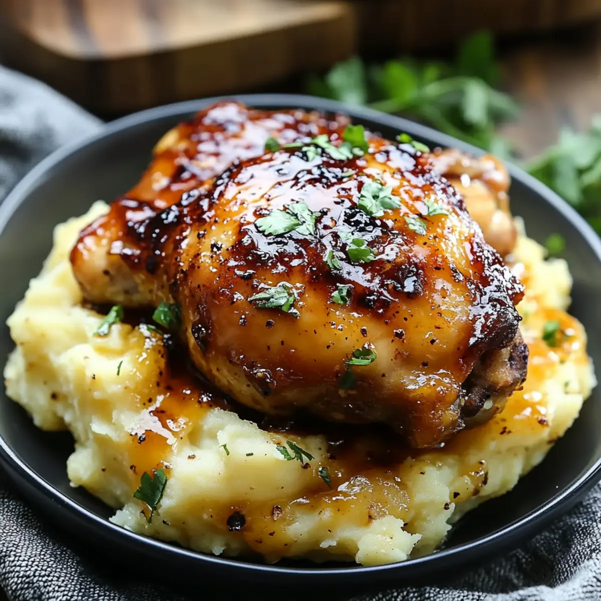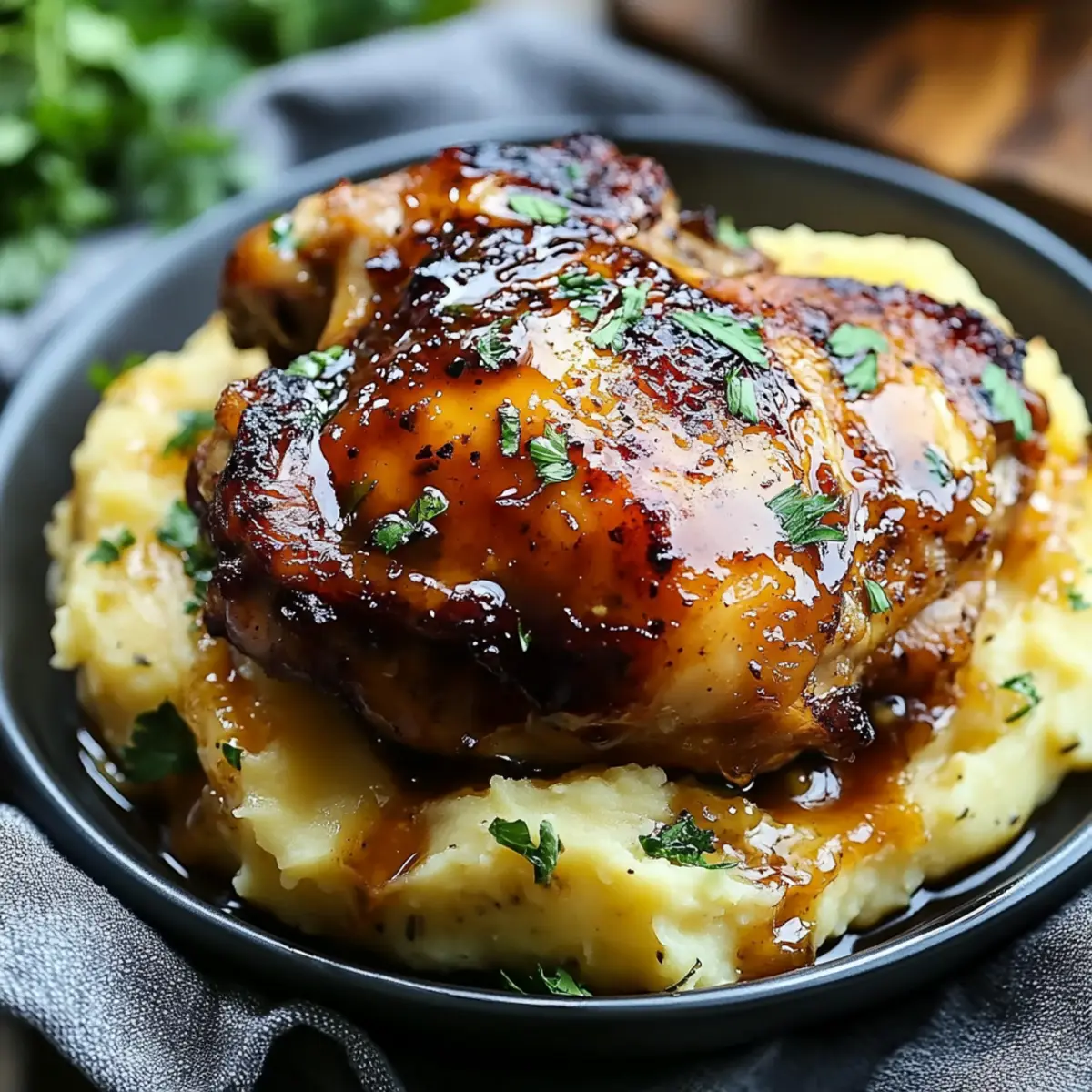 Jump to Recipe Print RecipeAs I pulled the succulent chicken thighs from the oven, the air filled with an irresistible blend of smoky chipotle and sweet honey. This comforting dish, Chipotle Honey Chicken Thighs with Smoked Gouda Mashed Potatoes, promises not only an explosion of flavors but also a satisfying family meal that can easily transition from a casual weeknight dinner to a special occasion feast. With its customizable spice level, you can cater to everyone’s taste buds, making it a true crowd-pleaser. The creamy, velvety smoked gouda mashed potatoes perfectly complement the chicken, transforming each bite into a delightful experience. Are you ready to elevate your dinner table with this mouthwatering duo? Let’s dive into the recipe that will have everyone asking for seconds! Why make Chipotle Honey Chicken Thighs? Flavor Explosion: The sweet and spicy glaze elevates ordinary chicken to extraordinary heights, making it perfect for any occasion. Creamy Bliss: Smoked gouda mashed potatoes add a rich, decadent touch that perfectly balances the dish. Customization: Adjust the spice level to suit your family’s preferences, ensuring everyone enjoys this meal. Quick Prep: With minimal marinating time and simple cooking methods, you can whip this up on a busy weeknight or for guests. Crowd-Pleasing: This dish is bound to impress, whether you’re hosting a family dinner or a casual gathering with friends. You might even want to pair it with some sides like Baked Smashed Potatoes for added comfort! Chipotle Honey Chicken Thighs Ingredients Want to bring this delicious dish to life? Here’s what you’ll need! For the Chicken • Bone-In Chicken Thighs – Around 2 pounds; choose skin-on for extra flavor. • Honey – Adds sweetness to the glaze; can be replaced with agave nectar for a vegan alternative. • Chipotle Chili Powder – Delivers smoky heat; adjust based on your spice preference. • Olive Oil – Keeps the chicken moist while cooking; substitute with canola or avocado oil if needed. • Garlic Powder – Enhances overall flavor; fresh garlic is a wonderful swap for a robust taste. • Salt – Non-negotiable for seasoning; adjust to your liking. • Black Pepper – Offers mild heat and flavor; freshly cracked is the best choice. For the Mashed Potatoes • Russet Potatoes – The base for creamy mash, peeled and chunked for even cooking; Yukon gold is a creamy substitute. • Milk – Creates that silky smooth texture; plant-based milk can be used for a dairy-free version. • Smoked Gouda Cheese – Brings a rich, smoky flavor; cheddar can be swapped for a sharper taste. • Unsalted Butter – Enriches your potatoes; olive oil is a great dairy-free alternative. Dive into this recipe and create the mouthwatering Chipotle Honey Chicken Thighs paired with those luscious smoked gouda mashed potatoes! Step‑by‑Step Instructions for Chipotle Honey Chicken Thighs With Smoked Gouda Mashed Potatoes Step 1: Preheat the Oven Begin by preheating your oven to 400°F (200°C) to prepare a hot cooking environment for the delicious Chipotle Honey Chicken Thighs. This temperature ensures that your chicken thighs cook evenly and develop a crispy skin, while the marinated flavors become enhanced. Step 2: Marinate the Chicken In a mixing bowl, combine honey, chipotle chili powder, olive oil, garlic powder, salt, and black pepper. Whisk these ingredients together until a smooth, glossy marinade forms. Coat your bone-in chicken thighs thoroughly in the marinade, ensuring each piece is well-covered. Allow the chicken to marinate for at least 15 minutes to absorb the rich flavors. Step 3: Boil the Potatoes While the chicken marinates, fill a large pot with water and add a generous pinch of salt. Bring the water to a boil and add the peeled and chopped russet potatoes. Cook for 15-20 minutes, or until the potatoes are fork-tender and easily break apart, creating a perfect base for your creamy smoked gouda mashed potatoes. Step 4: Prepare the Mashed Potatoes Once the potatoes are cooked, drain them thoroughly and return them to the pot over low heat. Add milk, unsalted butter, and smoked gouda cheese, then mash with a potato masher or ricer until smooth and creamy. Taste and season with additional salt and black pepper as needed, ensuring the flavors are perfectly balanced. Step 5: Bake the Chicken Transfer the marinated chicken thighs to a baking dish, arranging them skin-side up for optimal crispiness. Bake in the preheated oven for 25-30 minutes, or until the internal temperature reaches 165°F (75°C) and the skin turns golden brown and crispy. Keep an eye on them to avoid overcooking. Step 6: Serve and Enjoy Once the chicken thighs are beautifully baked, remove them from the oven. Serve the chipotle honey chicken thighs alongside the creamy smoked gouda mashed potatoes, drizzling any delicious pan juices over the dish for added flavor. This hearty meal is sure to impress everyone at your dinner table! Chipotle Honey Chicken Thighs Variations Feel free to explore these fun twists and substitutions that will enhance your Chipotle Honey Chicken Thighs and mashed potatoes! Sweet Potatoes: Swap russet potatoes with sweet potatoes for a delightful sweetness that pairs beautifully with the spicy chicken. Herb Infusion: Sprinkle some freshly chopped cilantro or parsley over the chicken before serving for a burst of freshness and color, making each bite even more enjoyable. Cheesy Mashed Potatoes: Add a touch of cream cheese along with smoked gouda for extra creaminess and a rich flavor that your family will love. Grill Option: Instead of baking, throw the marinated chicken thighs on the grill for a smoky flavor and those lovely grill marks that everyone adores. Spicy Kick: Increase the chipotle chili powder for a hotter glaze, or add some diced jalapeños into the mashed potatoes for an unexpected spicy surprise. Creamy Vegan Version: For a plant-based meal, swap the chicken for grilled to