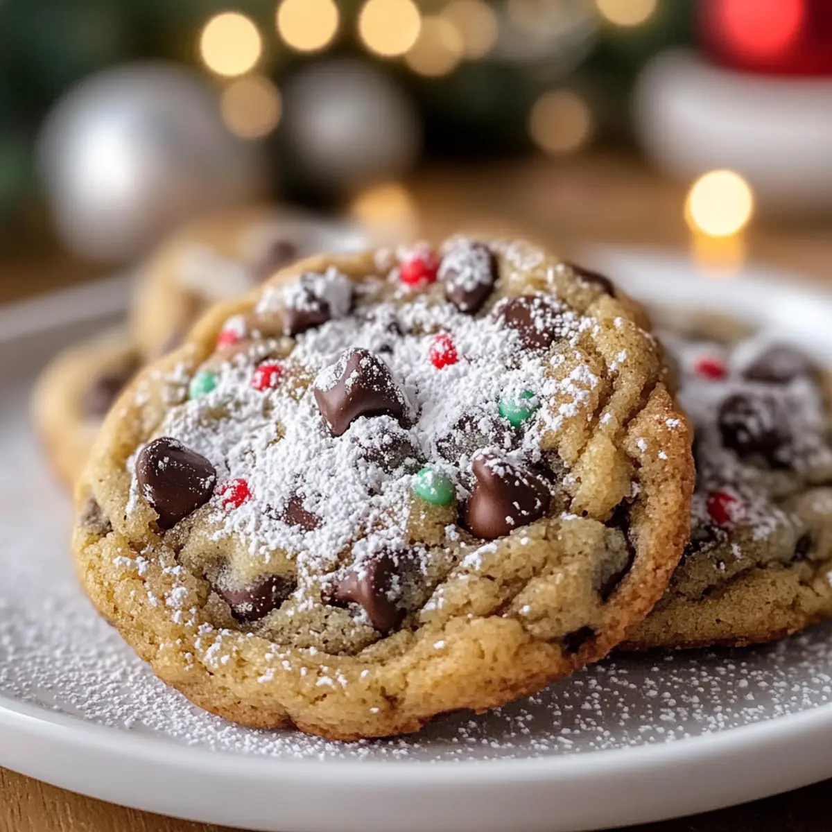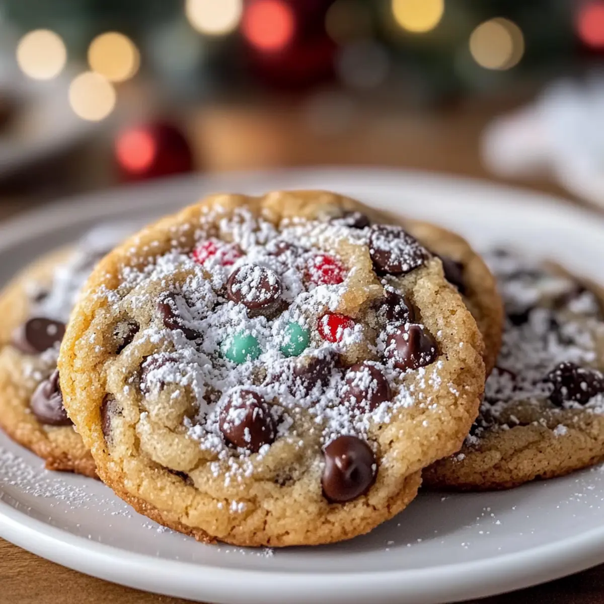 Jump to Recipe Print RecipeAs I unwrapped the pouch of chocolate chips, the sweet aroma instantly transported me to cozy kitchens filled with laughter and love. There’s something magical about baking during the holidays, especially when it involves Winter Wonderland Chocolate Chip Christmas Cookies. These delightful treats are not only a labor of love but also a breeze to whip up, taking just 32 minutes from start to finish. Picture a warm, gooey center enveloped in a snow-covered dusting of powdered sugar—perfect for those busy days leading up to festive gatherings. Not only are these cookies a guaranteed crowd-pleaser, but they also offer room for creativity with delightful variations. Who wouldn’t want to experiment with different chocolate types or add a merry splash of peppermint? Ready to sprinkle some holiday cheer into your baking? Let’s dive into this joyful recipe! Why are these cookies a holiday must? Quick to Prepare: With just 32 minutes from start to finish, these cookies fit perfectly into your busy holiday schedule. Irresistibly Gooey: The combination of chocolate chips and a powdery sugar finish creates a delightful contrast that’ll have everyone coming back for seconds. Endless Variations: Want to mix it up? Add butterscotch chips or crushed peppermint for a festive twist that keeps the seasonal spirit alive. Perfect for Sharing: Bring them to cookie exchanges or holiday parties, and watch as smiles light up the room. Baking Nostalgia: Each bite transports you back to cherished memories of sweet family gatherings, making these cookies a true holiday classic. Whether you’re enjoying them with a warm drink or gifting them to friends, these cookies are sure to make your festive days even sweeter. Looking for more sweet ideas? Check out my delightful Chocolate Chip Cookie recipe for another irresistible treat! Chocolate Chip Christmas Cookies Ingredients • For the Cookie Dough All-purpose flour – Provides structure; substitute with gluten-free flour for a tasty alternative. Baking soda – Helps the cookies rise for a fluffy texture; always check for freshness. Unsalted butter – Adds richness and moisture; ensure it’s softened for optimal mixing. Granulated sugar – Delivers sweetness and a nice crisp edge; can swap with coconut sugar for added depth. Brown sugar – Brings moisture and caramel undertones; use light or dark interchangeably for similar results. Salt – Amplifies flavors; reduce it if using salted butter. Eggs – Essential for structure and moisture; no substitutes recommended for the best cookie experience. Vanilla extract – Adds comforting flavor; opt for pure vanilla for superior taste. Chocolate chips – The star of the show! Use dark, milk, or white chocolate chips, or add crushed peppermint for fun. • For the Finishing Touch Powdered sugar – Dust the cooled cookies for that delightful snowy appearance, adding a festive feel to your Chocolate Chip Christmas Cookies. Now, let the spirit of holiday baking inspire you! Step‑by‑Step Instructions for Winter Wonderland Chocolate Chip Christmas Cookies Step 1: Preheat the Oven Begin by preheating your oven to 350°F (175°C), ensuring it’s ready for even baking. This is crucial for achieving that perfect balance of slightly crisp edges and soft, gooey centers in your Winter Wonderland Chocolate Chip Christmas Cookies. While the oven heats, gather your baking sheets to prepare for the dough. Step 2: Prepare the Dry Ingredients In a medium bowl, whisk together 2 cups of all-purpose flour and 1 teaspoon of baking soda until well combined. This step helps ensure the baking soda is evenly distributed, preventing any clumping in your cookies. Set this mixture aside as you move on to the wet ingredients, allowing the flavors to meld. Step 3: Cream the Butter and Sugars In a large mixing bowl, cream together ¾ cup of softened unsalted butter with ½ cup of granulated sugar and ¾ cup of brown sugar using a hand mixer or stand mixer. Beat the mixture until it’s light and fluffy, approximately 3-5 minutes. You should see a pale, airy texture that signals it’s time to add the eggs. Step 4: Incorporate the Eggs and Vanilla Add 2 large eggs, one at a time, mixing well after each addition to ensure they’re fully incorporated. Then, blend in 1 teaspoon of pure vanilla extract. This addition infuses the cookie dough with a warm, comforting aroma, making your kitchen feel festive as you prepare your Winter Wonderland Chocolate Chip Christmas Cookies. Step 5: Blend in the Dry Ingredients Gradually add the flour mixture to the wet ingredients, mixing on low speed until just combined. Be careful not to overmix, as this could lead to tough cookies. You want a dough that’s soft and slightly sticky, inviting the rich chocolate goodness that’s about to be added. Step 6: Fold in the Chocolate Chips Gently stir 1 cup of chocolate chips into the dough using a spatula or wooden spoon. Ensure they are evenly distributed throughout the mixture, creating that classic chocolatey surprise in every bite of your Christmas cookies. If you’re feeling festive, this is a great opportunity to mix in some crushed peppermint candies as well. Step 7: Portion the Dough Using a cookie scoop or a spoon, drop rounded dollops of dough onto ungreased baking sheets, leaving about 2 inches of space between each dollop. This spacing allows the cookies to spread without merging into one another as they bake, resulting in beautifully shaped Winter Wonderland Chocolate Chip Christmas Cookies. Step 8: Bake the Cookies Place the baking sheets in your preheated oven and bake for 10-12 minutes, watching closely as the edges turn golden but the centers remain slightly soft. This is the secret to achieving that perfect chewy texture. When done, the cookies will look set but may appear underbaked in the middle. Step 9: Cool and Dust the Cookies Allow the cookies to cool on the baking sheets for about 5 minutes before transf