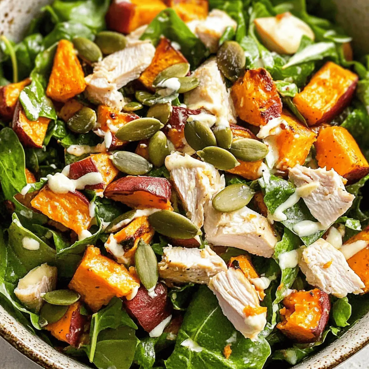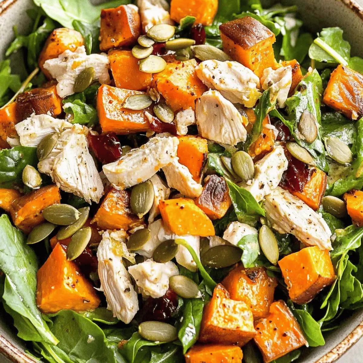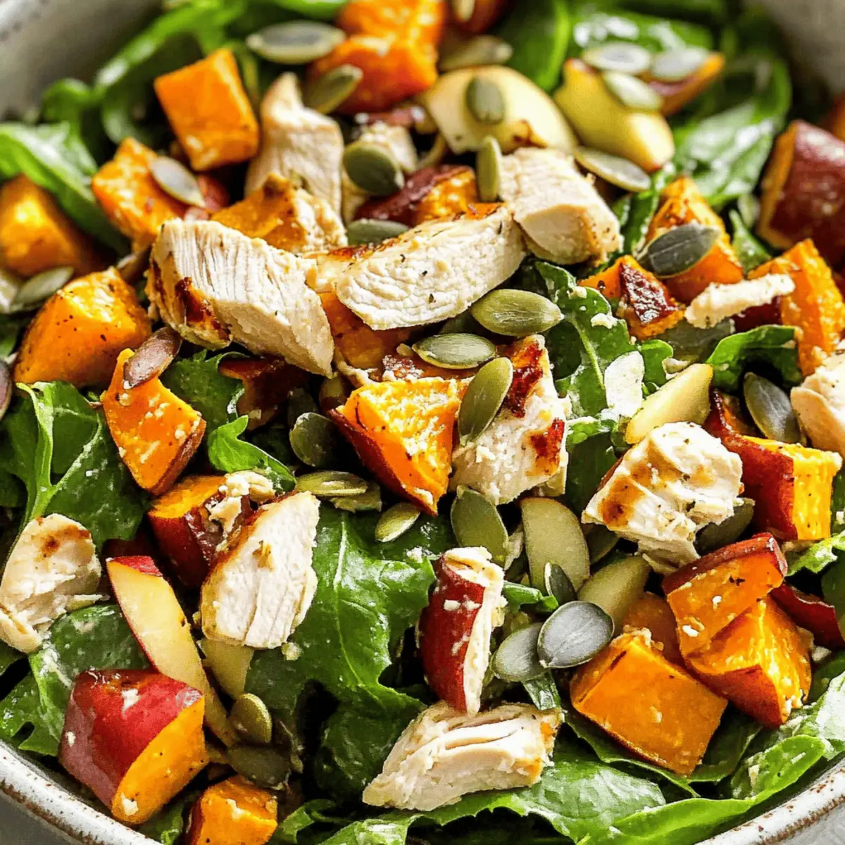 Jump to Recipe Print RecipeAs the leaves begin to turn vibrant shades of orange and gold, I find myself craving a salad that captures the essence of autumn. Enter my Chopped Fall Harvest Salad with Chicken—a delightful blend of roasted sweet potatoes, juicy apples, and creamy goat cheese, all tossed together with a zesty orange vinaigrette. This gluten-free, high-protein dish is perfect for meal prep, allowing me to savor the season’s bounty without spending hours in the kitchen. Not only is this colorful creation satisfying and nutritious, but it also brings a comforting warmth to your dining table during crisp fall evenings. Are you ready to embrace the flavors of fall and elevate your salad game? Why will you love this salad? Colorful, Flavorful Delight: This Chopped Fall Harvest Salad bursts with the vibrant colors and flavors of autumn, making it not just a meal but a celebration of the season on your plate. Nutritious & Satisfying: Packed with high protein from chicken and nutritious ingredients, it makes for a hearty dish that even the pickiest eaters will enjoy. Meal Prep Friendly: Whip it up in 40 minutes (or just 10 with a head start), perfect for those busy weeks! Consider also making a batch of my Garlic Parmesan Chicken to add to your meal routine. Versatile Recipe: Swap ingredients based on your preference—add quinoa for a boost or try different nuts for extra crunch. Unexpected Comfort: With its cozy combination of roasted sweet potatoes and creamy goat cheese topped with zesty vinaigrette, this salad is truly comfort food in disguise. Start embracing the season with this wholesome dish! Chopped Fall Harvest Salad Ingredients This delightful Chopped Fall Harvest Salad with Chicken is not only a feast for the eyes but also packed with wholesome goodness! For the Salad • Diced Sweet Potatoes (2 cups) – Adds a natural sweetness and a hearty texture. Note: Butternut squash makes a great substitution. • Olive Oil (1/2 tablespoon) – Essential for roasting sweet potatoes, contributing heart-healthy fats. Tip: Try avocado oil for a different flavor profile. • Mixed Greens (6 cups) – Forms the refreshing base of the salad, offering crunch and nutrients. Substitution: Swap in spinach or kale based on your taste. • Shredded Chicken (1 1/2 cups) – Packs a protein punch, keeping this salad filling. Tip: Use rotisserie chicken for a quicker option. • Diced Apple (1 cup) – Brings that sweet, crisp bite that plays well with other ingredients. Note: Honeycrisp or Granny Smith varieties are best for a balance of sweet and tart. • Dried Cranberries (2 tablespoons) – Adds chewiness and a festive touch. Substitution: Feel free to use raisins or pomegranate seeds for a twist. • Pumpkin Seeds (2 tablespoons) – Introduces a satisfying crunch and healthy fats. Tip: Sunflower seeds or slivered almonds can also work beautifully here. • Goat Cheese (1/3 cup) – This creamy ingredient elevates the flavor profile, making it irresistible. Tip: Feta cheese can be a delightful alternative. • Orange Vinaigrette (1/4 cup) – Ties all the flavors together with a refreshing citrus note. Note: Adjust sweetness using honey or maple syrup as per your taste. • Salt and Pepper – These essentials are key for seasoning to your liking. This Chopped Fall Harvest Salad with Chicken is the perfect dish to enjoy the bounties of the season while keeping your meals satisfying and healthy! Step‑by‑Step Instructions for Chopped Fall Harvest Salad with Chicken Step 1: Roast Sweet Potatoes Preheat your oven to 400°F (200°C). On a parchment-lined baking sheet, toss 2 cups of diced sweet potatoes with ½ tablespoon of olive oil, salt, and pepper. Spread them out in a single layer and roast for 25-35 minutes, or until they are browned and tender, stirring halfway through for even cooking. Step 2: Make Dressing While the sweet potatoes are roasting, prepare the orange vinaigrette. In a jar, combine ¼ cup of orange vinaigrette ingredients along with any desired sweetener like honey or maple syrup. Seal the jar tightly and shake vigorously until well blended. Taste and adjust the seasoning, adding a pinch of salt or a splash of vinegar if necessary. Step 3: Prep Ingredients As the sweet potatoes delightfully roast, it’s time to prepare the fresh components of your salad. Chop 6 cups of mixed greens and dice 1 cup of your chosen apple. Arrange them in a large mixing bowl. This will combine beautifully later with the roasted sweet potatoes. Step 4: Assemble Salad In the bowl with the mixed greens and diced apples, add the roasted sweet potatoes, 1 ½ cups of shredded chicken, 2 tablespoons of dried cranberries, 2 tablespoons of pumpkin seeds, and ⅓ cup of crumbled goat cheese. Drizzle the freshly made orange vinaigrette over the top, ensuring everything is coated. Step 5: Toss and Serve Gently toss all ingredients together until well mixed, allowing the flavors to combine beautifully. Serve your vibrant Chopped Fall Harvest Salad with Chicken immediately for the best texture. If meal prepping, consider storing the components separately to maintain freshness until you’re ready to enjoy! Storage Tips for Chopped Fall Harvest Salad with Chicken Fridge: Store the chopped fall harvest salad components separately in airtight containers; they can last for up to 3 days. This helps keep the freshness intact. Dressing: The orange vinaigrette can be stored in the refrigerator for up to a week. Shake well before using to recombine the ingredients, ensuring vibrant flavor. Freezer: While it’s best to enjoy the salad fresh, you can freeze the roasted sweet potatoes for up to 2 months. Thaw in the fridge before adding them to the salad. Reheating: If you prefer warm elements in your salad, reheat the sweet potatoes in the oven or microwave before assembling. Variations & Substitutions for Chopped Fall Harvest Salad Feel free to play around with this salad and make it your own—there’s a w