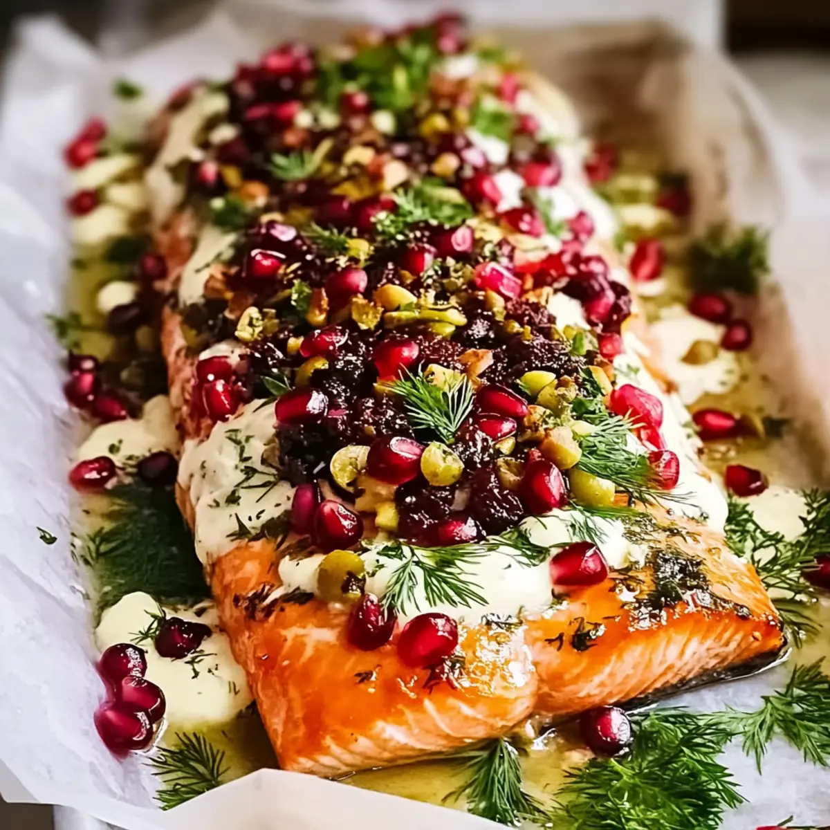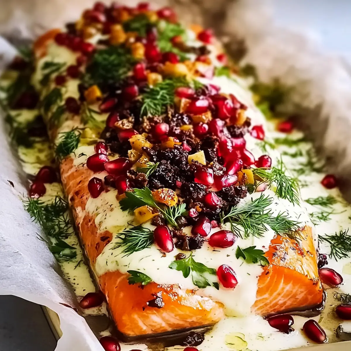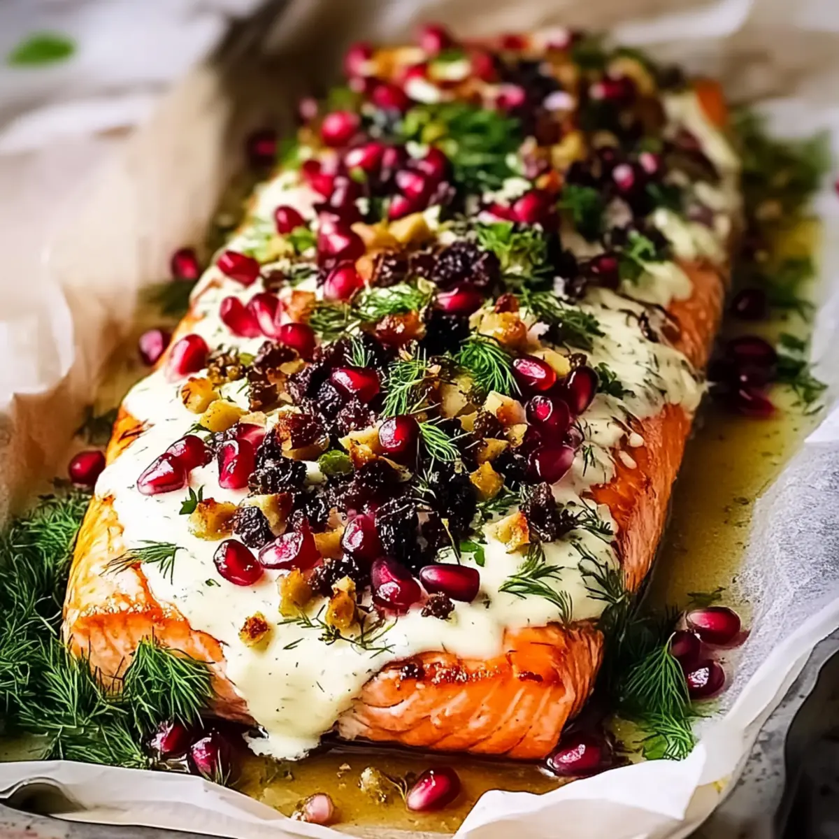 Jump to Recipe Print RecipeAs I walked into my kitchen, the scents of garlic and honey danced in the air, promising a feast that would celebrate the season. This Christmas Baked Salmon recipe is my go-to festive centerpiece, effortlessly transforming gatherings into unforgettable moments. With its beautiful honey butter glaze and creamy dill sauce, this dish not only looks stunning but also offers the ultimate convenience—prep it ahead of time and let it shine on your holiday table. Perfect for feeding a crowd of twelve, this lighter alternative to heavy holiday fare allows everyone to indulge without the guilt. Curious about how to create this eye-catching and delicious showstopper? Let’s dive into the steps to bring a touch of elegance to your holiday celebrations! Why is this salmon a holiday showstopper? Elegant, Festive Appeal: This Christmas Baked Salmon is not only a feast for the taste buds but an eye-catching centerpiece that will impress your guests. Effortless Prep: Prepare the glaze and sauces ahead of time, allowing you to enjoy the festivities without stress. Flavorful Harmony: The combination of honey, garlic, and dill creates a deliciously balanced flavor profile that complements the salmon beautifully. Perfect for a Crowd: Easily feeds 12, making it ideal for large gatherings or family celebrations. Guilt-Free Indulgence: With lighter ingredients and fewer calories, it’s a delightful way to enjoy holiday feasting without the heaviness of traditional meals. Pair it with a Festive Christmas Salad with Oranges, Pomegranate, and Feta for a refreshing contrast. Christmas Baked Salmon Ingredients For the Salmon • Salmon – 1.2–1.5 kg side, skin on, bones removed; ensure the skin is on for best results. • Kosher Salt – 2 1/4 tsp; enhances flavor—reduce if using table salt. • Black Pepper – 1 tsp; adds a mild heat. For the Honey Butter Glaze • Unsalted Butter – 150g; creates a rich glaze—use unsalted for better control of seasoning. • Honey – 1/2 cup; provides sweetness and promotes caramelization. • Garlic – 3 cloves, minced; adds aromatic depth. For the Creamy Dill Sauce • Full-Fat Sour Cream – 1 1/2 cups; serves as the base for the creamy dill sauce. • Fresh Dill – 1/2 cup, chopped; imparts a fresh, herbaceous flavor. • Eshallot – 1/2, grated; introduces sweetness and a mild onion flavor. • Lemon Zest – 1 1/2 tbsp; brightens the dish. • Additional Kosher Salt – 1/2 tsp (for sauce); enhances overall flavor. For the Festive Tapenade • Dried Cranberries – 1 cup; adds sweetness and acidity—soak in orange juice for a festive touch. • Hot Orange Juice – 1 cup; used to soak cranberries for enhanced flavor. • Slivered Almonds – 1 cup, toasted; provides crunch and depth—toast for intensified flavor. • Parsley – 1/3 cup, chopped; adds freshness—can substitute with other herbs. • Olive Oil – 1 tbsp; helps bind the tapenade ingredients. For Garnish and Serving • Pomegranate Seeds – Seeds from 1 pomegranate; beautiful garnish that adds tartness. • Additional Parsley – 1/4 cup, chopped (for garnish); enhances visual appeal. • Lemon Juice – 3 tbsp; brightens and freshens the dish. • Lemons – 2, cut into wedges; for serving—adds a refreshing touch. With this delightful Christmas Baked Salmon recipe, you’re one step closer to crafting a stunning holiday centerpiece that will leave your guests in awe! Step‑by‑Step Instructions for Christmas Baked Salmon Step 1: Preheat and Prepare Start by preheating your oven to 180°C (350°F). Line a large baking tray with aluminum foil, then layer it with parchment paper for easy clean-up. This setup ensures that your Christmas Baked Salmon will cook evenly and release effortlessly when done. Step 2: Prepare the Salmon Place the salmon skin-side down on the prepared tray. In a small saucepan, melt the unsalted butter over low heat and stir in honey and minced garlic until well combined. Pour this luscious honey butter glaze over the salmon, allowing it to coat the fish fully for maximum flavor. Step 3: Season the Salmon Generously season the salmon with kosher salt and black pepper for enhanced taste. To keep the moisture locked in, cover the salmon with a layer of aluminum foil. This step helps create a tender fillet that will be bursting with flavor when it emerges from the oven. Step 4: Bake the Salmon Bake the covered salmon in the preheated oven for 15 minutes. This initial baking ensures that the fish cooks through gently. After this, carefully uncover the salmon and switch the oven to broil, cooking for an additional 7-10 minutes until the top is golden and crispy, and the fish flakes easily with a fork. Step 5: Rest the Salmon Once the salmon is beautifully golden, remove it from the oven and let it rest for at least 15 minutes. Allowing the Christmas Baked Salmon to rest is crucial, as it helps enhance the flavor and allows the juices to redistribute, ensuring each bite is moist and tender. Step 6: Prepare the Dill Sauce While the salmon rests, mix together the full-fat sour cream, chopped dill, grated shallot, lemon zest, and an additional 1/2 teaspoon of kosher salt in a bowl. This creamy dill sauce will add that fresh and tangy contrast to the rich flavors of the salmon; cover and refrigerate it until you’re ready to serve. Step 7: Create the Festive Tapenade Next, soak the dried cranberries in a cup of hot orange juice for about 15 minutes, then drain. In a bowl, combine the soaked cranberries with toasted slivered almonds, chopped parsley, and olive oil. Season it lightly, mixing until everything is well coated. This tapenade adds a bright and festive touch to your dish. Step 8: Assemble and Garnish Once the salmon has cooled slightly, carefully spread the chilled dill sauce over the top. Next, layer the vibrant tapenade, sprinkle pomegranate seeds, and a handful of chopped parsley on top for a pop of color. Finally, drizzle fresh lemon 