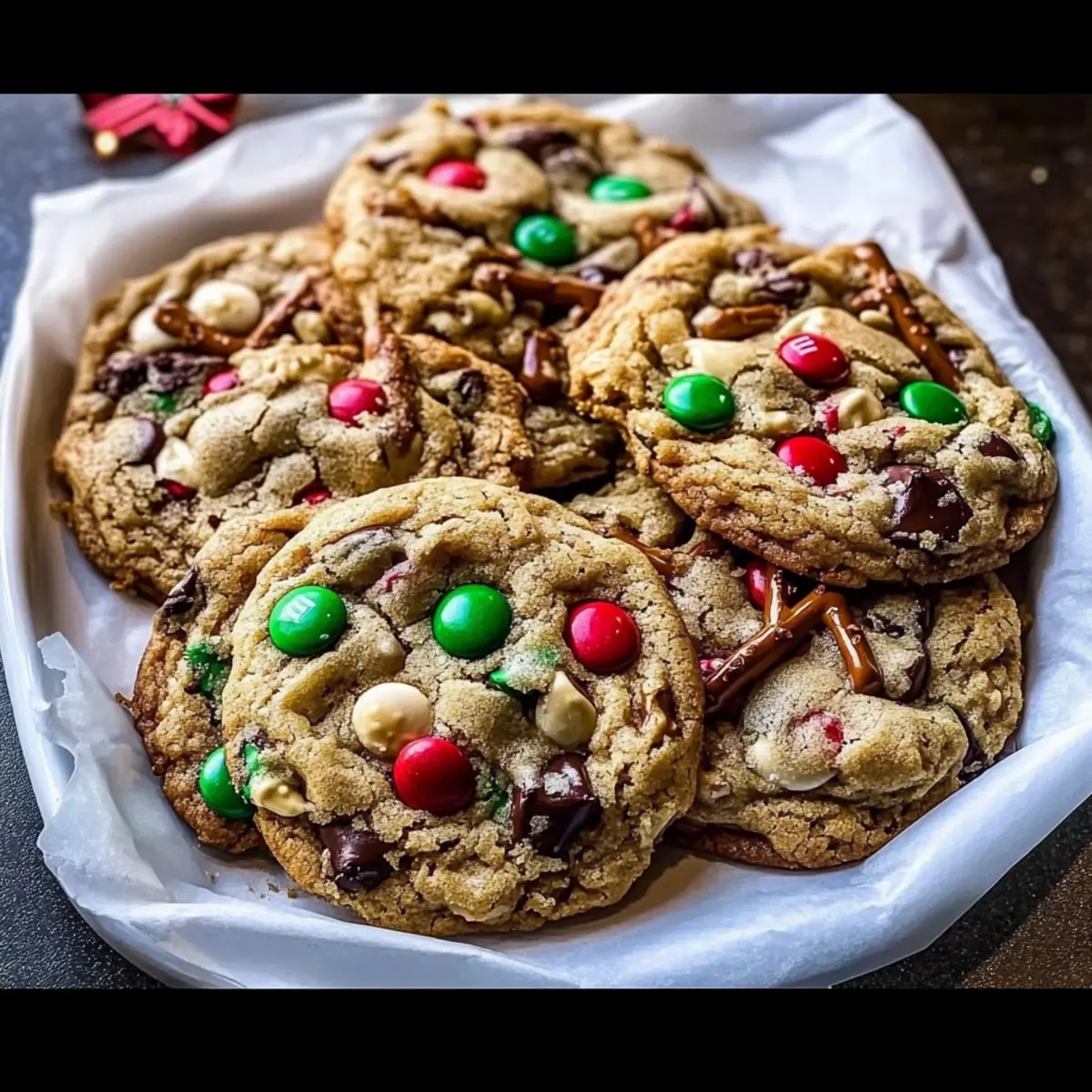 Jump to Recipe Print RecipeI’ll never forget the moment I first pulled a tray of Christmas Monster Cookies from the oven, their warm aroma wrapping around me like a festive hug. These cookies are the perfect blend of crispy edges and soft, chewy centers, packed with oats, chocolate chunks, vibrant M&Ms, and crunchy pretzel pieces. Ideal for novice bakers, this Christmas Monster Cookies recipe is not only fun to make but also a reliable crowd-pleaser during the bustling holiday season. With simple prep and a burst of colorful cheer, they make for great gifts or sweet treats for your holiday gatherings. Ready to create a batch that’ll have everyone asking for seconds? Let’s dive into this delicious adventure! Why Are These Cookies So Irresistible? Deliciously Fun: Each bite of these Christmas Monster Cookies is a festive explosion of flavors and textures, combining rich chocolate, colorful M&Ms, and crunchy pretzels. Baker-Friendly: Perfect for novice bakers, the simple steps make it easy to create cookie magic without stress. Crowd-Pleasing: Their vibrant appearance and delightful taste guarantee they’re a hit at any holiday gathering, sparking joy in every bite! Endless Customization: Feel free to switch up the ingredients, perhaps experimenting with different chocolate varieties like in my Cosmic Brownie Cookies for a fun twist. Perfect for Gifting: Pack them up in festive boxes and give as cheerful homemade gifts that anyone would adore! Make-Ahead Magic: With storage tips for up to four days at room temperature or freezing them for later, you’ll always have a treat ready to share! Christmas Monster Cookies Ingredients For the Cookie Dough • Unsalted Butter (1 cup) – Use room temperature for the best mixing results. • Dark Brown Sugar (3/4 cup, packed) – Adds moisture and deep flavor, keeping cookies soft. • Granulated Sugar (1/2 cup) – Balances sweetness and helps with caramelization. • Vanilla Extract (2 tsp) – Enhances the overall flavor profile beautifully. • Eggs (2 large) + Extra Egg Yolk (1) – Provides structure and moisture; the extra yolk ensures a tender center. • All-Purpose Flour (2 cups) – The crucial building block for cookie structure. • Baking Soda (1 tsp) & Baking Powder (1/2 tsp) – These leavening agents create that delightful light texture. • Salt (1 tsp) – Balances sweetness and amplifies flavor. For the Fun Add-ins • Old Fashioned Oats (1 cup) – Adds texture and a boost of protein; larger oats hold their shape better. • Holiday M&Ms (1 1/4 cups, divided) – Their colorful burst of sweetness brightens the cookies; some are reserved for topping. • Salted Pretzel Twists (1 cup) – Delivers that necessary salty crunch to offset the sweetness; break into bite-sized pieces. • Semi-Sweet Chocolate Chunks (1 cup) – Melts beautifully into rich pockets of chocolate, better than chips for distribution. • White Chocolate Chips (1/2 cup) – Provides a sweet contrast and adds visual charm. These Christmas Monster Cookies are just waiting to become a beloved treat in your holiday repertoire! Step‑by‑Step Instructions for Christmas Monster Cookies Step 1: Preheat and Prepare Begin by preheating your oven to 350°F (175°C). While the oven warms, line two baking sheets with parchment paper to ensure easy removal of your Christmas Monster Cookies once baked. This process will help them achieve their perfect golden edges while maintaining a soft, chewy center. Step 2: Cream the Butters and Sugars In a large mixing bowl, beat together 1 cup of room temperature unsalted butter, 3/4 cup of packed dark brown sugar, and 1/2 cup of granulated sugar until the mixture is light and fluffy, about 2-3 minutes. Add 2 teaspoons of vanilla extract, then continue mixing until everything is well combined, creating a rich, creamy base for your cookies. Step 3: Incorporate the Eggs Next, add in 2 large eggs and 1 extra egg yolk one at a time, mixing thoroughly after each addition. This step is crucial for building the structure and moisture in your Christmas Monster Cookies. The batter should be smooth and slightly thick, ready to accept the dry ingredients. Step 4: Mix in the Dry Ingredients Gradually sift in 2 cups of all-purpose flour, 1 teaspoon of baking soda, 1/2 teaspoon of baking powder, and 1 teaspoon of salt. Mix gently until the dry ingredients are just incorporated, being careful not to overmix, which could lead to tougher cookies. The dough should be thick with a slightly sticky texture. Step 5: Add the Fun Stuff Now it’s time to fold in the delicious add-ins! Carefully mix in 1 cup of old-fashioned oats, 1 1/4 cups of Holiday M&Ms (reserving some for later), 1 cup of broken salted pretzel twists, 1 cup of semi-sweet chocolate chunks, and 1/2 cup of white chocolate chips. This festive blend should make your dough colorful and enticing! Step 6: Shape the Cookie Dough Scoop the cookie dough using a quarter-cup measure, rolling them into balls. Place each dough ball about 3 inches apart on your prepared baking sheets to allow space for spreading. You’ll want to see a playful, colorful mix peeking out from each mound as you prepare to bake your Christmas Monster Cookies. Step 7: Bake to Perfection Slide the baking sheets into your preheated oven and bake the cookies for 8 minutes. After that, carefully rotate the pans to ensure even baking, and let them bake for an additional 2 minutes. Watch closely for the cookies to look slightly set but still soft in the center; this is the secret to a chewy cookie. Step 8: Add Extra M&Ms Once you pull the trays from the oven, press the reserved M&Ms into the tops of the warm cookies, which will create a delightful visual appeal. Return the cookies to the oven for an additional 2-3 minutes to allow them to just finish baking, ensuring they remain soft and delicious. Step 9: Cool and Set Allow the cookies to cool on the baking sheets for 10 minutes. This step is vital as the cookies will co