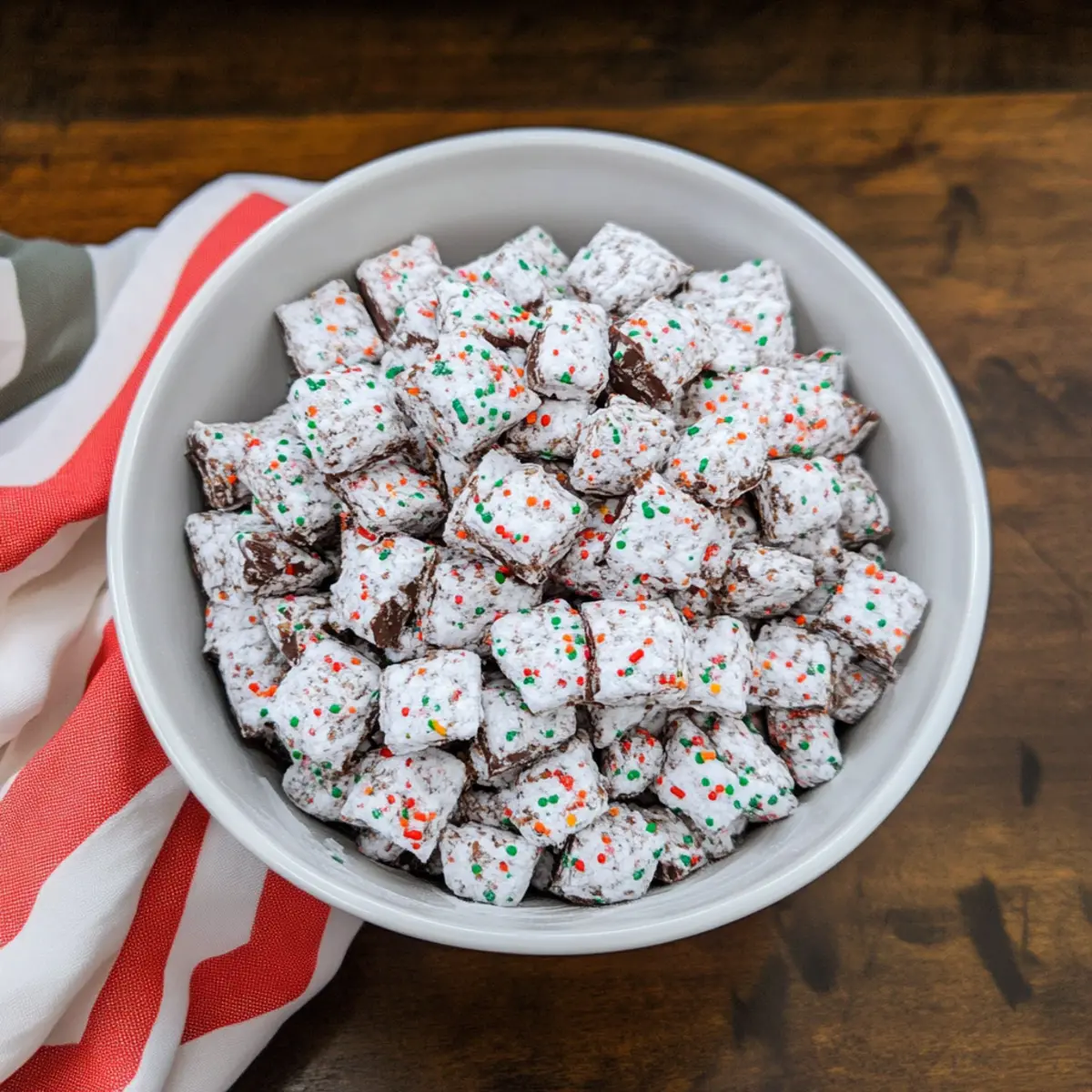 Freezer: For longer storage, freeze the Christmas Puppy Chow in an airtight bag for up to 6 months. Thaw it in the fridge overnight before enjoying it again.