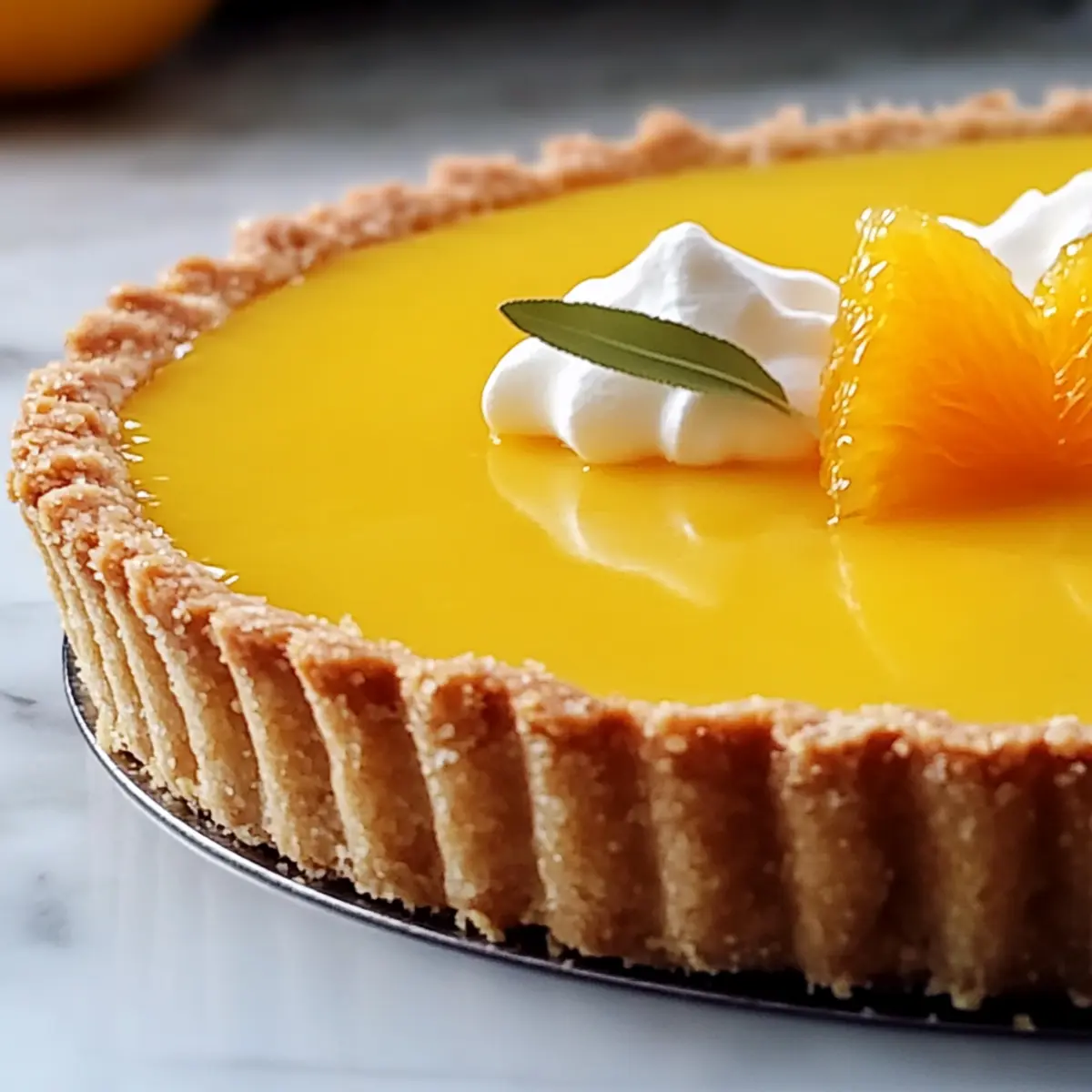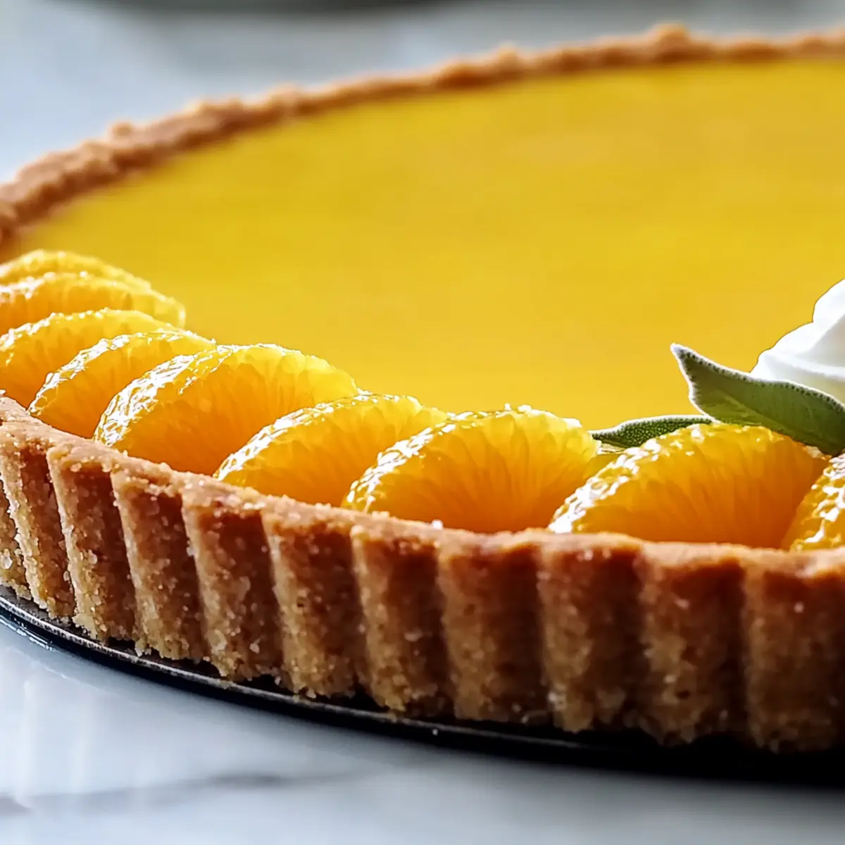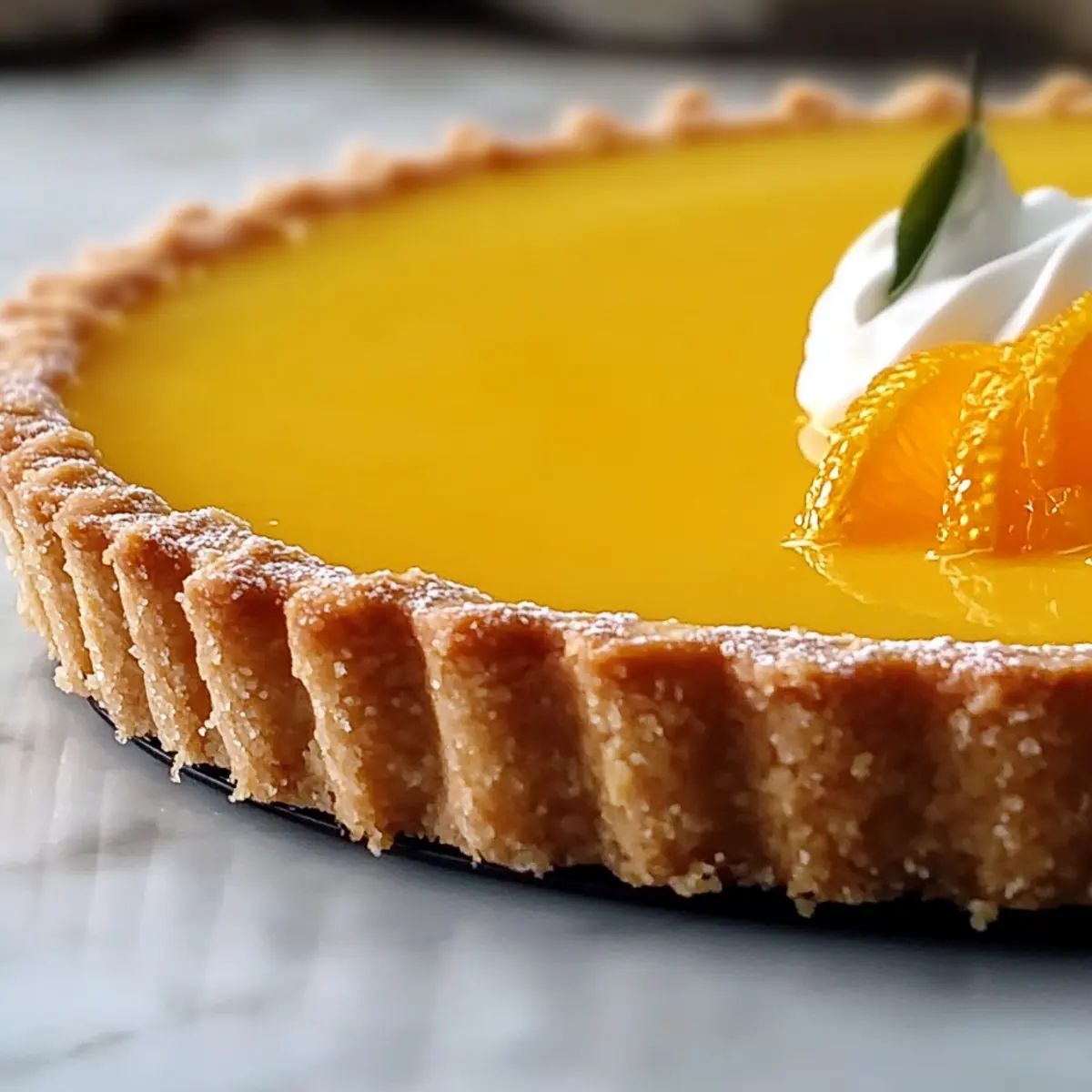 Jump to Recipe Print RecipeChasing the last rays of summer sun always leaves me with a craving for something zesty and refreshing. Enter the Classic Orange Tart, an elegant dessert that effortlessly combines the bright essence of oranges with a flaky, tender crust. What I adore most about this recipe is its simplicity—made with everyday ingredients, it’s not only easy to prepare but also a stunning make-ahead option for gatherings! This tart strikes a perfect balance of sweetness and tartness, transforming ordinary events into memorable culinary experiences. Imagine impressing your friends or family with slices of this citrus beauty at your next dinner party! Want to know how to make this showstopper? Let’s dive in! Why is This Orange Tart a Must-Try? Simplicity at Its Best: This Classic Orange Tart requires minimal effort, making it perfect for both novice bakers and seasoned chefs alike. Impressive Presentation: The glossy orange curd and flaky crust create a stunning centerpiece for any gathering that will leave your guests in awe. Make-Ahead Marvel: Prepare this tart a day or two in advance to save time, letting the flavors meld beautifully while you focus on other aspects of your event. Versatile Flavor: While orange is a star ingredient, feel free to swap in other citrus fruits for a unique twist, offering endless possibilities! Crowd-Pleaser: Everyone loves a citrus dessert, and this tart is sure to delight at your next dinner party or potluck. If you’re looking for more easy home-cooked ideas, check out these delicious Big Mac Wraps or Tomato Basil Bruschetta for inspiration! Classic Orange Tart Ingredients For the Tart Crust Oranges – Juicy citrus fruit providing the essential flavor of the tart; look for Navel or Valencia for the best results. Flour – Forms the base of the tart crust for structure; all-purpose flour works well here. Powdered Sugar – Adds sweetness to the crust while ensuring a fine texture; substitution not typically recommended. Almond Flour – Contributes a nutty flavor and tenderness to the crust; swap with all-purpose flour if needed, but this may alter the flavor. Salt – Enhances the tart flavor of the crust and balances sweetness. Butter – Essential for a rich, flaky crust; use cold, unsalted butter for optimal results. Egg Yolk – Adds richness and moisture to the dough, helping it bind together. Cold Water – Adjust moisture content to create the crust without overworking the dough. For the Orange Curd Filling Superfine Sugar – Used in the filling for smooth sweetness; regular granulated sugar can be substituted. Cornstarch – Serves to thicken the orange curd filling, resulting in a silky texture. Gelatin – Stabilizes the curd filling, ensuring it sets well; a vegetarian substitute can be used. For the Topping Heavy Cream – Whipped to top the tart, adding creaminess and elegance. With these delicious ingredients, you’ll be well on your way to creating a stunning Classic Orange Tart that will impress everyone at your table! Step‑by‑Step Instructions for Classic Orange Tart Step 1: Prepare Tart Dough Begin by combining flour, powdered sugar, almond flour, salt, and grated orange zest in a food processor. Cut cold, unsalted butter into cubes, adding it to the mixture. Pulse until it resembles coarse breadcrumbs, about 10 seconds. Add the egg yolk and a few tablespoons of cold water, pulsing briefly until the dough just comes together. Chill the dough in plastic wrap for at least 30 minutes. Step 2: Blind Bake Tart Shell Preheat your oven to 375°F (190°C). Roll out the chilled dough on a floured surface to a 12-inch circle, then carefully transfer it to a tart pan. Prick the bottom with a fork and chill the pan for another 15 minutes. Line the crust with parchment paper, fill with pie weights, and bake for 12-15 minutes until the edges are set. Remove the weights and parchment, then bake for an additional 10-12 minutes until golden brown. Step 3: Make Orange Curd Filling In a saucepan, gently heat fresh orange juice over medium heat. In a separate bowl, whisk together eggs, superfine sugar, and cornstarch until smooth. Gradually pour the hot orange juice into the egg mixture, whisking continuously to prevent curdling. Return the mixture to the saucepan, cooking over low heat while stirring constantly until it thickens, about 5-7 minutes. Remove from heat, and stir in softened gelatin and butter until fully incorporated. Step 4: Chill and Serve Once the orange curd is slightly cooled, pour it into the prepared tart shell, smoothing the top with a spatula. Cover the tart with plastic wrap and refrigerate for at least 3 hours, or preferably overnight, to allow the filling to set properly. Before serving, whip heavy cream with a dash of sugar until soft peaks form, then garnish the tart with whipped cream, fresh orange segments, and a sprinkle of crushed pistachios for a delightful touch. Expert Tips for Classic Orange Tart Proper Chilling: Chill the dough thoroughly before baking; this helps maintain its shape and ensures a flaky texture. No Overmixing: When combining the dough ingredients, mix until just combined to avoid a tough crust. Blind Bake Wisely: Remember to use weights while blind baking; it prevents the crust from puffing up and ensures even cooking. Temperature Control: Use low heat when making the orange curd; this prevents eggs from scrambling and gives a silky texture. Slicing Technique: For neat slices, use a sharp knife and wipe it clean after each cut; this preserves the integrity of your Classic Orange Tart. Classic Orange Tart Variations Customize your Classic Orange Tart with these delicious twists that will keep your taste buds tingling! Lemon Infusion: Swap oranges for fresh lemons to create a zesty Lemon Tart. The bright flavor will tickle your palate delightfully. Tropical Medley: Combine a mix of juicy citrus fruits, like grapefruit and lime, for a refreshing tropical twist. Each bite will transpo