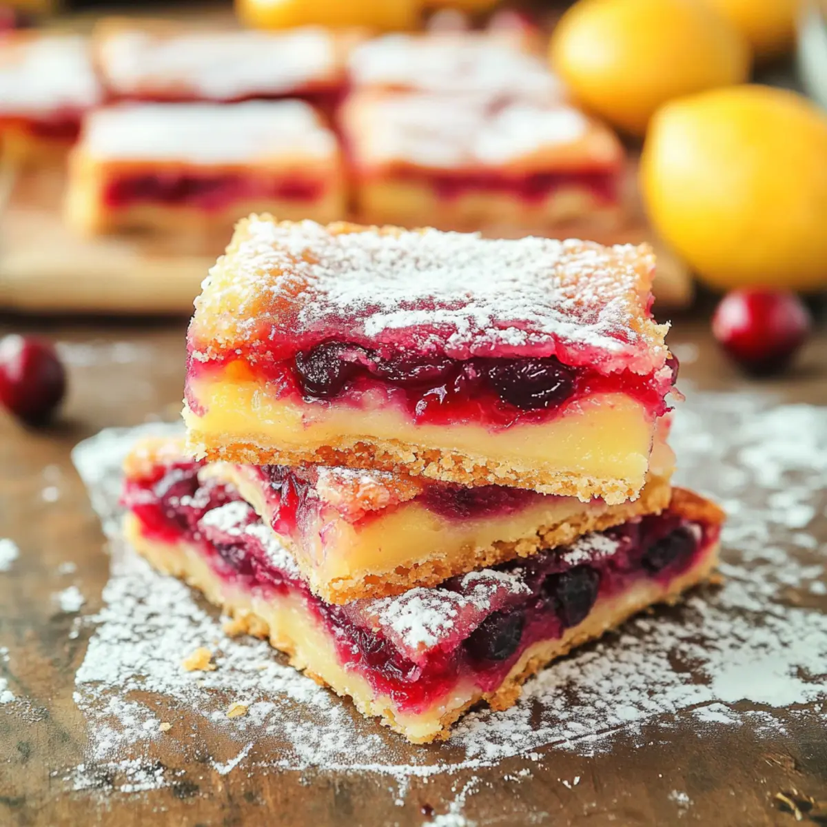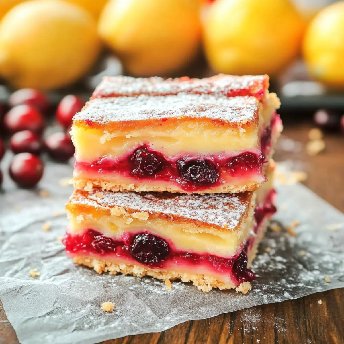 Jump to Recipe Print RecipeAs I sifted through holiday recipes, I stumbled upon a simple truth: fresh cranberries and zesty lemons create a dance of tangy flavors that is simply irresistible. Enter my Tangy Cranberry Lemon Bars with Buttery Shortbread Crust—a delightful dessert that’s a refreshing twist in a sea of rich holiday sweets. With quick prep that leaves you ample time for festive fun and a beautiful presentation that impresses any crowd, these bars are sure to become a staple in your culinary repertoire. Picture a golden buttery crust giving way to luscious layers of vibrant cranberry and smooth lemon custard, perfect for enjoying at gatherings or indulging in a cozy night in. Are you ready to elevate your dessert game and bring a burst of flavor to your table? Why are Cranberry Lemon Bars unforgettable? Bursting with flavor: The combination of tart cranberries and zesty lemons creates a refreshing taste that dances on your palate, making it the perfect treat after heavier holiday meals. Quick and easy prep: With straightforward steps, you’ll be whipping these up in no time, leaving you with hours to enjoy your festive gatherings. Impressive presentation: Their beautiful layers and dusting of powdered sugar make these bars not just delicious but visually stunning, sure to impress your friends and family. Versatile options: Use leftover cranberry sauce or lemon curd for a unique twist; these bars can be customized to fit your pantry. Crowd-pleasing delight: Ideal for holiday parties or cozy nights in, these bars are a sweet treat that everyone will love, much like our delightful Lemon Blueberry Muffins or the scrumptious Lemon Truffles. Cranberry Lemon Bars Ingredients For the Cranberry Layer • Fresh Cranberries – Use quality fresh cranberries for the best flavor; frozen cranberries can work too when not thawed. • Water – Necessary for simmering the cranberries to create a sweet filling. • Granulated Sugar – Adjust quantity to balance tartness of cranberries for your ideal sweetness. For the Buttery Shortbread Crust • Unsalted Butter – Adds richness and moisture; substitute with margarine for a dairy-free alternative. • Granulated Sugar – Essential for sweetness and texture; don’t skip this for the best crust. • Vanilla Extract – Enhances the crust’s flavor; using pure vanilla will elevate the taste. • Salt – Balances sweetness; a crucial ingredient for flavor enhancement. • All-Purpose Flour – Provides structure; substitute with gluten-free 1:1 flour if required. For the Lemon Layer • Granulated Sugar – Sweetness that balances the acidity of the lemons; tweak to match your taste. • All-Purpose Flour – Acts as a thickening agent for the custard. Same gluten-free substitution note applies. • Eggs – Adds richness and creaminess; skip substitutes for best results. • Fresh Lemon Juice – Vital for tanginess; fresh juice truly makes a difference in flavor. • Powdered Sugar (optional) – Dust over the bars just before serving for a touch of sweetness and presentation. Remember, these Cranberry Lemon Bars are not just a recipe; they’re a celebration of flavors that will brighten any holiday table! Step‑by‑Step Instructions for Cranberry Lemon Bars Step 1: Prepare the Cranberry Filling Rinse and sort one cup of fresh cranberries, placing them in a saucepan with ½ cup of water and ¾ cup of granulated sugar. Simmer on medium heat for about 10-15 minutes, stirring occasionally. The cranberries will burst and soften into a chunky sauce; remove from the heat when the mixture thickens slightly. Allow it to cool while you prepare the crust. Step 2: Preheat the Oven and Prepare the Baking Dish Preheat your oven to 325°F (163°C). Line a 9-inch square baking dish with parchment paper, leaving some overhang on the sides for easy removal later. This makes getting your vibrant Cranberry Lemon Bars out of the pan worry-free. Prepare for the buttery shortbread crust while that oven heats up to perfection. Step 3: Make the Shortbread Crust In a mixing bowl, combine ½ cup of melted unsalted butter, ⅓ cup of granulated sugar, 1 teaspoon of vanilla extract, and a pinch of salt. Gradually stir in 1 cup of all-purpose flour until the mixture forms a soft dough. Press this dough evenly into the prepared baking dish, ensuring it covers the corners. Bake for 16-18 minutes, or until it’s golden brown on the edges. Step 4: Layer the Cranberry Mixture Once the crust has baked and cooled slightly, spread the cooled cranberry filling evenly over the top. This vibrant layer will provide a delightful tartness that complements the lemon custard. Cover with plastic wrap and place the dish in the refrigerator for at least 45 minutes to chill and set before adding the lemon layer. Step 5: Prepare the Lemon Custard Mixture Now that the cranberry layer is chilled, preheat your oven to 350°F (175°C). In a large bowl, whisk together 1 cup of granulated sugar, 2 tablespoons of all-purpose flour, 3 large eggs, and ½ cup of freshly squeezed lemon juice until smooth. This combination will create a luscious, tangy custard that will top your beautiful Cranberry Lemon Bars. Step 6: Bake the Lemon Layer Pour the lemon custard mixture over the chilled cranberry layer in the baking dish, ensuring it covers evenly. Carefully transfer the dish to the preheated oven and bake for 43-45 minutes, or until the custard is set and slightly jiggly in the center. It’s ready when the edges start to brown slightly and the surface looks firm but not dry. Step 7: Cool and Refrigerate After baking, remove the dish from the oven and let it cool at room temperature for about 30 minutes. Once cool, refrigerate the bars for at least 1-2 hours to ensure they firm up beautifully. This resting time will help meld the flavors together and make them easier to slice. Step 8: Serve the Bars When ready to serve your delectable Cranberry Lemon Bars, carefully lift them out using the p