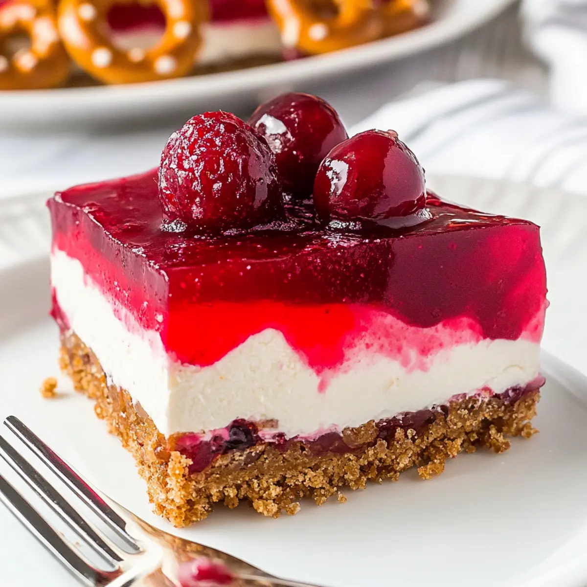 Jump to Recipe Print Recipe“Wait, is that dessert or a salad?” I overheard a friend exclaim at our last holiday gathering, her eyes sparkling with curiosity. That’s exactly the magic of my Cranberry Pretzel Salad, a delightful no-bake treat that elegantly blurs the lines between sweet and savory. Combining a crunchy pretzel crust, a smooth cream cheese filling, and a vibrant raspberry Jello topping, this dessert is not just visually stunning—it’s a crowd-pleaser that whips up in no time. Perfect for those busy holiday weeks, this salad offers an irresistible way to bring festive cheer to your table while ensuring you don’t spend hours in the kitchen. Are you ready to create a stunning dish that will leave everyone asking for seconds? Why is Cranberry Pretzel Salad so special? Unique Layers: The Cranberry Pretzel Salad beautifully combines salty and sweet, creating an unforgettable taste experience. No-Bake Ease: With simple steps and no oven required, this dessert is a breeze to prepare, leaving you more time to enjoy your holiday festivities. Crowd-Pleasing Appeal: It’s a guaranteed hit at gatherings, often becoming the star of the dessert table! Versatile Flavors: Feel free to mix it up! Swap the raspberry Jello for Summer Berry Salad for a vibrant twist, or use different Jello flavors for a unique twist. A Festive Visual: The colorful layers make it as much a feast for the eyes as for the palate, attracting everyone’s attention. Impress your guests this holiday season with an eye-catching dessert that balances flavors and excitement! Cranberry Pretzel Salad Ingredients • Get ready to dive into the delicious layers of this festive treat! For the Crust Pretzel Minis – Provide a crunchy, salty foundation for the salad. Substitution: Crushed pretzel crumbs create a different texture. Granulated Sugar – Adds sweetness to the crust. Substitution: Brown sugar offers a deeper flavor. Dark Brown Sugar – Introduces moisture and caramel notes to the crust. Substitution: Light brown sugar can also be used. Salted Butter – Binds the crust while enhancing flavor. Prep Note: Melt it before mixing for better consistency. For the Cream Cheese Filling Powdered Sugar – Sweetens the filling for a creamy texture. Cream Cheese – Provides a rich and tangy base for the layer. Note: Make sure it’s soft for easy mixing. Cool Whip – Contributes lightness and creaminess to the filling. Almond Extract – Adds a delightful nutty flavor that complements the cranberries. Substitution: Vanilla extract is a great alternative. Lemon Juice – Balances the sweetness with a hint of acidity for a perfect flavor profile. For the Jello Layer Water – Used to dissolve the Jello powder, creating a smooth topping. Raspberry Jello Powder – Forms the fruity layer that gives the salad its name. Whole Cranberry Sauce – Incorporates fresh cranberry flavor with delightful texture into the Jello. With these ingredients at hand, you’re set to create a stunning Cranberry Pretzel Salad that will wow your guests and invigorate your holiday table! Step‑by‑Step Instructions for Cranberry Pretzel Salad Step 1: Prepare the Crust Start by preheating your oven to 350°F (175°C). In a large bowl, crush the pretzel minis into coarse crumbs, then mix them together with granulated sugar, dark brown sugar, and melted salted butter until fully combined. Press this mixture firmly into the bottom of a greased 9×13 casserole dish. Bake for 10 minutes until lightly golden, then remove and let it cool completely before chilling in the refrigerator for 1 hour. Step 2: Make the Cream Cheese Layer Once the crust is chilled, it’s time to create the smooth cream cheese layer! In a mixing bowl, beat softened cream cheese with powdered sugar, Cool Whip, almond extract, and lemon juice until the mixture is creamy and well-blended, about 2-3 minutes. Spread this luscious filling evenly over the cooled pretzel crust, smoothing it out with a spatula. Refrigerate the layered dish for an additional 1 hour to set. Step 3: Create the Jello Layer For the fruity topping, bring 2 cups of water to a boil in a small saucepan. Remove from heat and stir in raspberry Jello powder until completely dissolved, about 2 minutes. Mix in the whole cranberry sauce until well incorporated. Allow the mixture to cool slightly—this is essential to prevent melting the cream cheese layer—before gently pouring it over the cream cheese filling, creating a vibrant top layer. Step 4: Chill Cover the entire dessert with plastic wrap and place it in the refrigerator. Allow the Cranberry Pretzel Salad to chill for at least 6 hours, or ideally, overnight. This chilling time is crucial because it allows the layers to set beautifully, giving you that delightful contrast in textures when you slice into it. Step 5: Serve When ready to serve, take the salad out of the refrigerator. Use a sharp knife, warmed under hot water for easier cutting, to slice through the layers with precision. Garnish each serving with a dollop of whipped cream or a sprinkle of extra pretzel crumbs for crunch if desired. This stunning Cranberry Pretzel Salad is now ready to impress your guests! What to Serve with Cranberry Pretzel Salad Elevate your holiday meal with these delightful pairings that beautifully complement the sweet and salty layers of this festive salad. Roasted Turkey: A classic holiday centerpiece that enhances the flavors of your meal while offering a satisfying savory contrast to the cranberry sweetness. Green Bean Almondine: The crispness of green beans tossed with toasted almonds provides a fresh, crunchy element, balancing the creamy richness of the salad. Savory Stuffing: A herb-infused stuffing filled with veggies brings warmth and heartiness, making the perfect foil for the sweetness of the Cranberry Pretzel Salad. Creamy Mashed Potatoes: Luxuriously smooth, buttery mashed potatoes add comfort and a light seasoning to create a harmonious blend with y