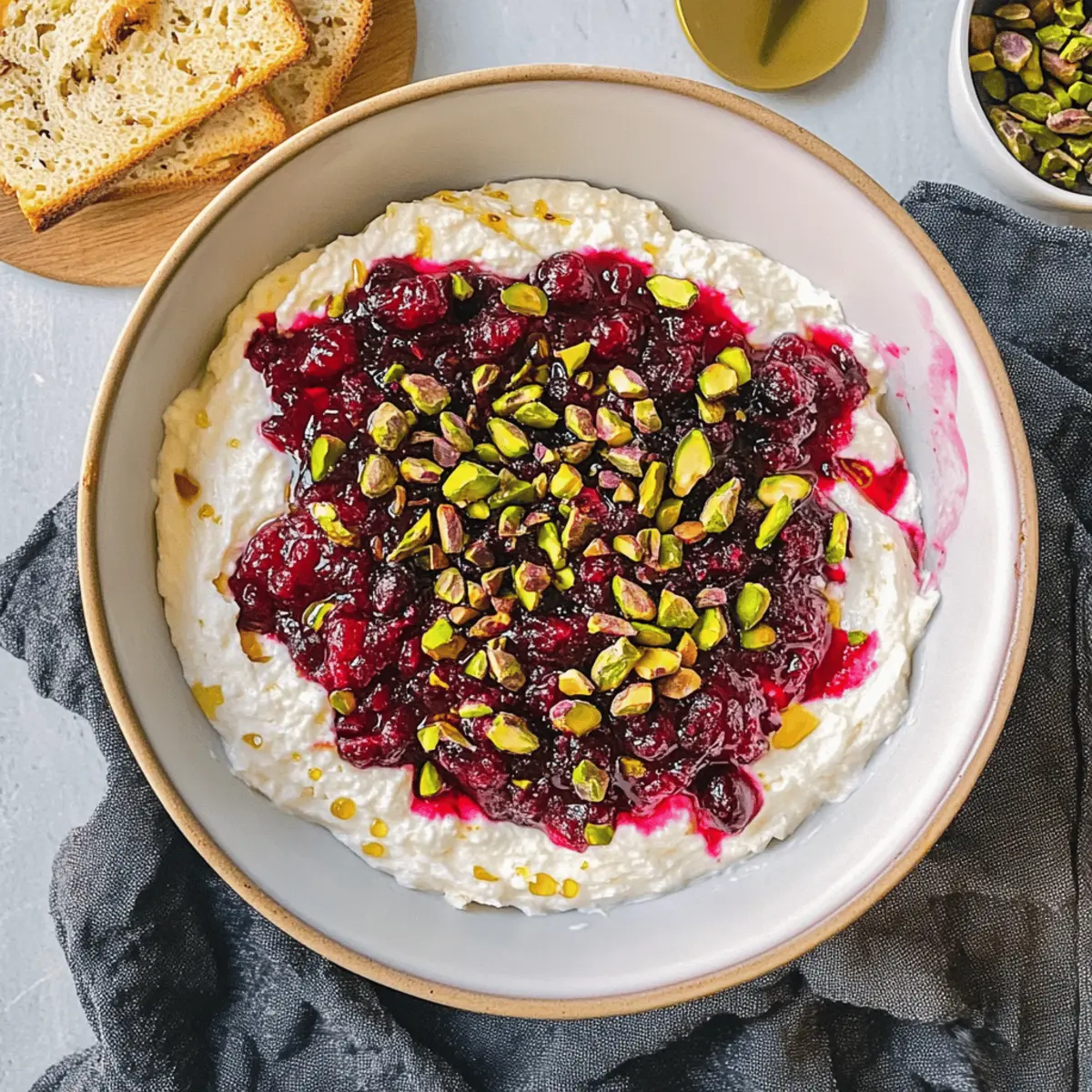 For a delightful crunch, sprinkle 1/4 cup of chopped pistachios over the cranberry layer. Drizzle honey generously across the top to add a sweet touch that beautifully complements the tartness of the cranberries. If desired, finish with a few sprigs of fresh thyme or minced rosemary for a pop of color and flavor.