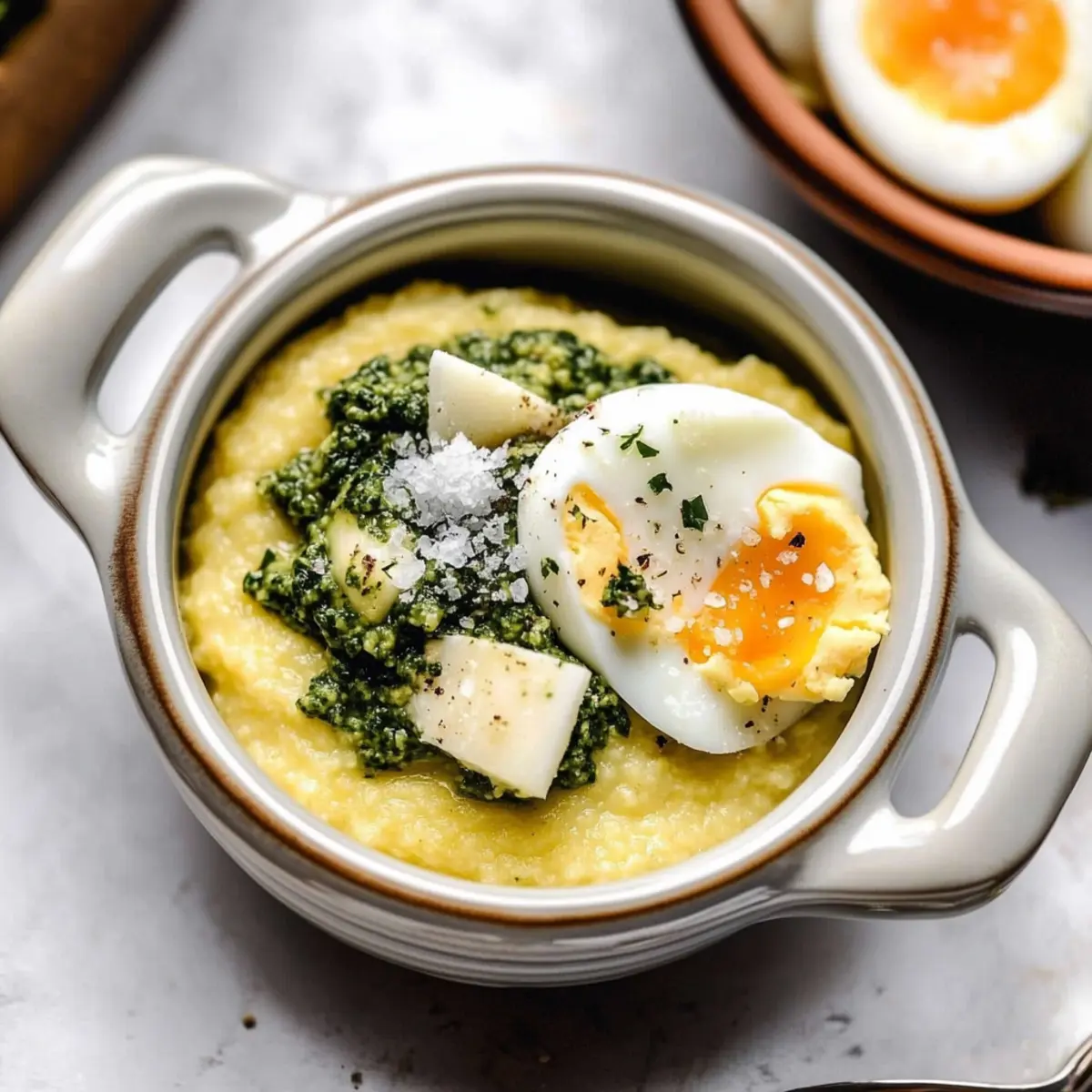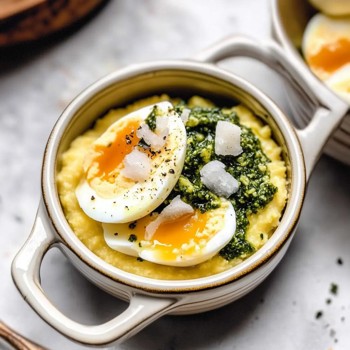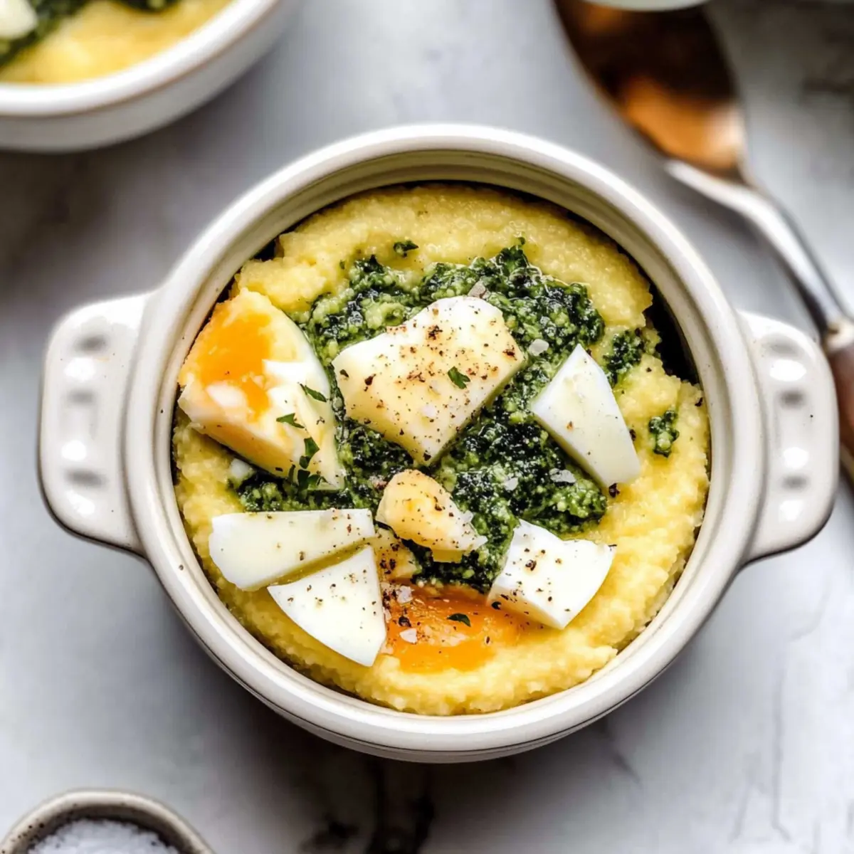 Jump to Recipe Print RecipeAs I stood in my kitchen, the aroma of simmering polenta began to fill the air, instantly transporting me to sun-soaked mornings where a hearty meal was the centerpiece of conversation. My Creamy Breakfast Polenta with Pesto & Eggs is not just food; it’s the perfect blend of comfort and vibrancy that delights the senses. With a velvety texture enriched by melted Parmigiano Reggiano and a pop of freshness from homemade pesto, this dish stands out as a wholesome, gluten-free breakfast option or a quick brunch that can be whipped up in just 45 minutes. The beauty of this recipe lies not only in its simplicity but also in its make-ahead potential—allowing you to enjoy the comforting goodness with minimal fuss. Ready to elevate your breakfast game? Let’s dive into this delightful recipe! Why Is This Breakfast a Game Changer? Savory Delight: Each spoonful of creamy polenta, enriched with Parmigiano Reggiano, offers a comforting start to your day. Quick & Easy: In just 45 minutes, you can prepare a delicious brunch that impresses guests while being simple enough for a weekday breakfast. Make-Ahead Friendly: Prep ahead to enjoy this dish anytime without the morning rush—just reheat your polenta and pesto! Versatile Options: Customize your pesto to elevate flavors; try swapping in arugula or even sun-dried tomato pesto for a delicious twist. Healthy Indulgence: With gluten-free goodness, protein-rich eggs, and wholesome fats, this recipe is both nourishing and satisfying. Plus, it’s perfect with a side of fresh fruit or a light salad, creating a balanced meal. Embrace comfort with this delightful dish and check out additional recipes like Garlic Parmesan Chicken or Burrata with Brown Butter for more comforting options! Creamy Breakfast Polenta Ingredients • Get ready to whip up a cozy dish that’s perfect for any morning! For the Polenta Cornmeal Polenta/Yellow Grits – This serves as the base and brings a creamy texture; feel free to substitute with coarse or medium coarse ground corn if needed. Water – Essential for cooking the polenta to a perfect consistency. Kosher Salt – A pinch enhances the flavor of the polenta; it’s also vital for soft boiling the eggs. Unsalted Butter – Adds richness and creaminess; olive oil can replace butter for a dairy-free option. Parmigiano Reggiano (Grated) – Brings cheesy goodness to the dish; you can swap this out for any aged cheese you have on hand. For the Eggs Eggs (Large) – Provides protein and richness; you can use medium eggs if that’s what you have available. White Vinegar – Aids in coagulating the egg whites during the soft-boiling process. For the Pesto Arugula Pesto – Brightens every bite with fresh herby flavors; don’t hesitate to use store-bought or your favorite homemade variation instead. For Garnish Flaky Sea Salt – Just a sprinkle at the end enhances the dish’s overall flavor finish. With all these Creamy Breakfast Polenta with Pesto & Eggs ingredients ready, you’re just a few steps away from a comforting breakfast experience! Step‑by‑Step Instructions for Creamy Breakfast Polenta with Pesto & Eggs Step 1: Prepare the Pesto Begin by making the arugula pesto if you’re opting for homemade. In a food processor, combine fresh arugula, garlic, nuts, Parmesan, olive oil, and a pinch of salt. Blend until smooth, adjusting the consistency with additional olive oil if needed. This vibrant pesto can be made ahead and stored in the refrigerator for up to a week, enhancing the flavor of your Creamy Breakfast Polenta with Pesto & Eggs. Step 2: Soft Boil the Eggs In a medium pot, bring water to a rolling boil, adding a generous pinch of kosher salt and a splash of white vinegar. Gently lower large eggs into the bubbling water and set a timer for 7 minutes. The eggs should be perfectly soft-boiled, providing a luscious, runny yolk that complements the creamy texture of the polenta. Step 3: Prepare the Ice Bath While the eggs boil, fill a bowl with ice cubes and cold water—this is your ice bath. Once the timer goes off, use a slotted spoon to transfer the eggs immediately into the ice bath. Let them sit for about 5 minutes to halt the cooking process, ensuring a tender egg that pairs beautifully with your Creamy Breakfast Polenta with Pesto & Eggs. Step 4: Cook the Polenta In a medium saucepan, combine cornmeal polenta, water, and a pinch of salt over medium heat. Stir frequently as the mixture comes to a gentle boil, then reduce the heat to low. Allow it to simmer while constantly stirring for about 20 minutes, until the polenta thickens and achieves a creamy, velvety consistency that will serve as the base for your dish. Step 5: Finish the Polenta Once your polenta reaches the right texture, remove it from heat and stir in unsalted butter and grated Parmigiano Reggiano. Mix thoroughly until the butter melts and the cheese is fully incorporated, resulting in a luxurious, creamy polenta. This rich base will perfectly complement the vibrant pesto and soft-boiled eggs in your Creamy Breakfast Polenta with Pesto & Eggs. Step 6: Assemble the Dish To serve, spoon the creamy polenta into individual bowls and generously top with the arugula pesto. Carefully peel the cooled soft-boiled eggs, slicing them in half, and place them atop the polenta. Finish with a sprinkle of flaky sea salt to bring out all the flavors, and prepare to dig into this delightful meal. Make Ahead Options These Creamy Breakfast Polenta with Pesto & Eggs are perfect for busy mornings! You can prepare the polenta and homemade pesto up to 3 days in advance. Simply cook the polenta as directed, then let it cool and store it in an airtight container in the refrigerator. The pesto can be made ahead as well—just refrigerate it in a sealed jar, and it will stay fresh. To enjoy this delightful meal, simply reheat the polenta on the stove until warm, top it with the pesto, and prepare your soft-boiled eggs just before serving. T