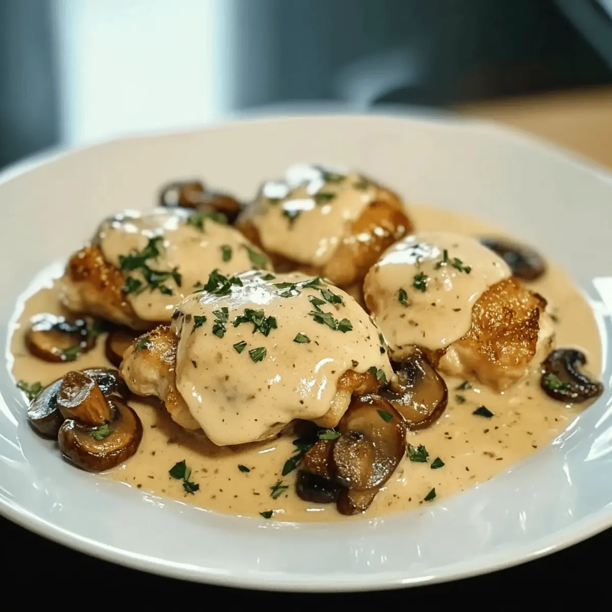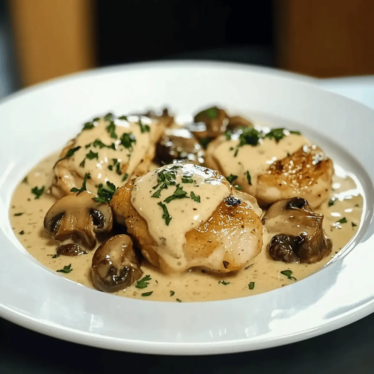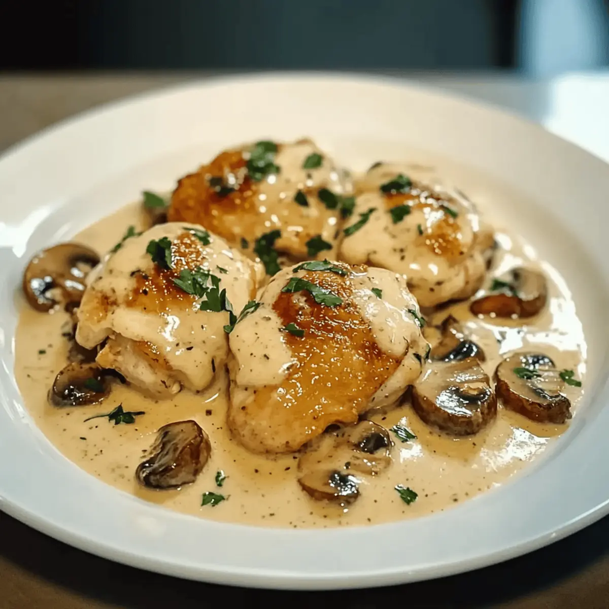 Jump to Recipe Print RecipeAs the aroma of sizzling garlic and earthy mushrooms fills the air, you know you’re in for a culinary treat. This Creamy Garlic Mushroom Chicken Thighs recipe is my go-to for turning a simple weeknight into a delightful dining experience. Tender chicken thighs bathed in a velvety sauce create the ultimate comfort food that both family and friends will adore. One of the best parts? It comes together in just about 30 minutes, making it a perfect pick for those busy evenings when you still want to impress. Plus, it’s wonderfully adaptable, with options for gluten-free and dairy-free alternatives, ensuring everyone can savor every bite. Ready to elevate your dinner game with a dish that wraps you in warmth and satisfaction? Let’s dive in! Why is This Chicken Dish Irresistible? Comforting Flavor: The creamy garlic sauce brings a rich, savory essence that clings decadently to the juicy chicken thighs. Quick Preparation: Whip it up in just 30 minutes—perfect for those hectic weeknights! Versatile Ingredients: Easily adaptable to fit gluten-free or dairy-free diets, so everyone can enjoy. Impressive Presentation: Serve it directly from the skillet for a rustic, homey appeal. Crowd-Pleasing Delight: With flavors that please both family and guests, this is sure to be a repeat favorite! If you’re looking for more delicious options, you might also enjoy Garlic Parmesan Chicken or perhaps Cheesy Chicken Garlic for a tasty twist. Creamy Garlic Mushroom Chicken Ingredients For the Chicken Chicken Thighs – The star of the dish; tender and full of flavor. Substitute with chicken breasts for a leaner option, adjusting the cooking time to maintain juiciness. Olive Oil – Adds a fruity note and helps with browning; swap for more olive oil if going dairy-free. Butter – Riches the flavor in the sauté; use ghee as a lactose-free alternative. For the Sauce Mushrooms (Cremini, Button, Baby Bella) – Brings earthy depth and texture; feel free to mix in shiitake or portobello for variety. Garlic – Enhances the dish with its aromatic essence; fresh garlic provides the best flavor. Chicken Broth – Forms the sauce base; opt for low-sodium or gluten-free when needed. Heavy Cream – Delivers that luxurious creamy texture; can be replaced with coconut cream or cashew cream for a dairy-free version. Salt & Pepper – Essential for boosting flavors; adjust to your taste preference. For Garnish Fresh Parsley or Thyme – Adds a touch of color and freshness to the finished dish; use any fresh herb you prefer for personalized flair. With these ingredients, you’re just a step away from preparing a warm and inviting meal! Dive in, and enjoy the experience of creating your own comforting plate of Creamy Garlic Mushroom Chicken. Step‑by‑Step Instructions for Creamy Garlic Mushroom Chicken Step 1: Prepare Chicken Begin by patting the chicken thighs dry with paper towels, which ensures a beautifully crispy skin. Season both sides generously with salt and pepper, allowing the seasoning to enhance each bite. This simple step is crucial as it sets the flavor profile for the entire dish, which will soon transform into a delectable Creamy Garlic Mushroom Chicken. Step 2: Sear Chicken Heat a large skillet over medium-high heat and add olive oil and butter, allowing them to melt and combine. Once the mixture is shimmering, place the seasoned chicken thighs skin-side down in the skillet. Sear them for about 5-7 minutes until the skin is golden and crispy. Carefully flip and sear the other side for an additional 2-3 minutes before removing the chicken to rest on a plate. Step 3: Sauté Vegetables In the same skillet, add the diced mushrooms and minced garlic, stirring to combine with the flavorful remnants left in the pan. Sauté the mixture for 4-5 minutes until the mushrooms become browned and the garlic is fragrant, releasing its aromatic oils. This step is essential for building the rich flavors of the creamy sauce that will envelop your chicken. Step 4: Make Sauce Pour in the chicken broth, using a wooden spoon to scrape up any browned bits stuck to the bottom of the skillet, as this adds depth to the sauce. Allow the broth to simmer for a minute before adding the heavy cream. Stir to incorporate everything together and continue to simmer on medium-low heat until the sauce thickens slightly, which should take about 3-4 minutes. Step 5: Combine & Cook Return the seared chicken thighs to the skillet, nestling them into the luscious sauce. Cover the skillet and reduce the heat to low, allowing the chicken to cook through for another 10-12 minutes. The cooking time may vary depending on the thickness of your chicken thighs, so ensure they reach an internal temperature of 165°F for safety. Step 6: Finish & Serve Once the chicken is cooked through and the sauce has thickened to your desired consistency, take the skillet off the heat. Garnish the dish generously with freshly chopped parsley or thyme, adding a pop of color and flavor. Serve the Creamy Garlic Mushroom Chicken directly from the skillet for a rustic presentation that’ll impress your family and friends. Make Ahead Options These Creamy Garlic Mushroom Chicken Thighs are perfect for time-strapped cooks looking to enjoy homemade goodness! You can season and sear the chicken thighs up to 24 hours in advance, then store them in an airtight container in the refrigerator. Additionally, prepare the garlic mushroom sauce and refrigerate it for up to 3 days for maximum flavor retention. When you’re ready to serve, simply reheat the sauce and return the chicken to the skillet, allowing it to simmer gently—this method ensures the chicken remains juicy and the sauce retains its creamy texture. With this prep, you can enjoy a comforting meal with minimal effort on busy weeknights! Creamy Garlic Mushroom Chicken Variations Feel free to make this recipe your own with these delightful twists that enhance flavor, texture, and dietary ne