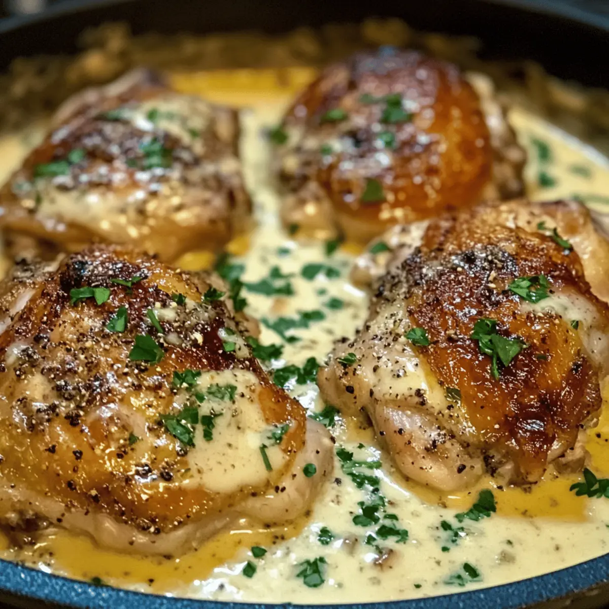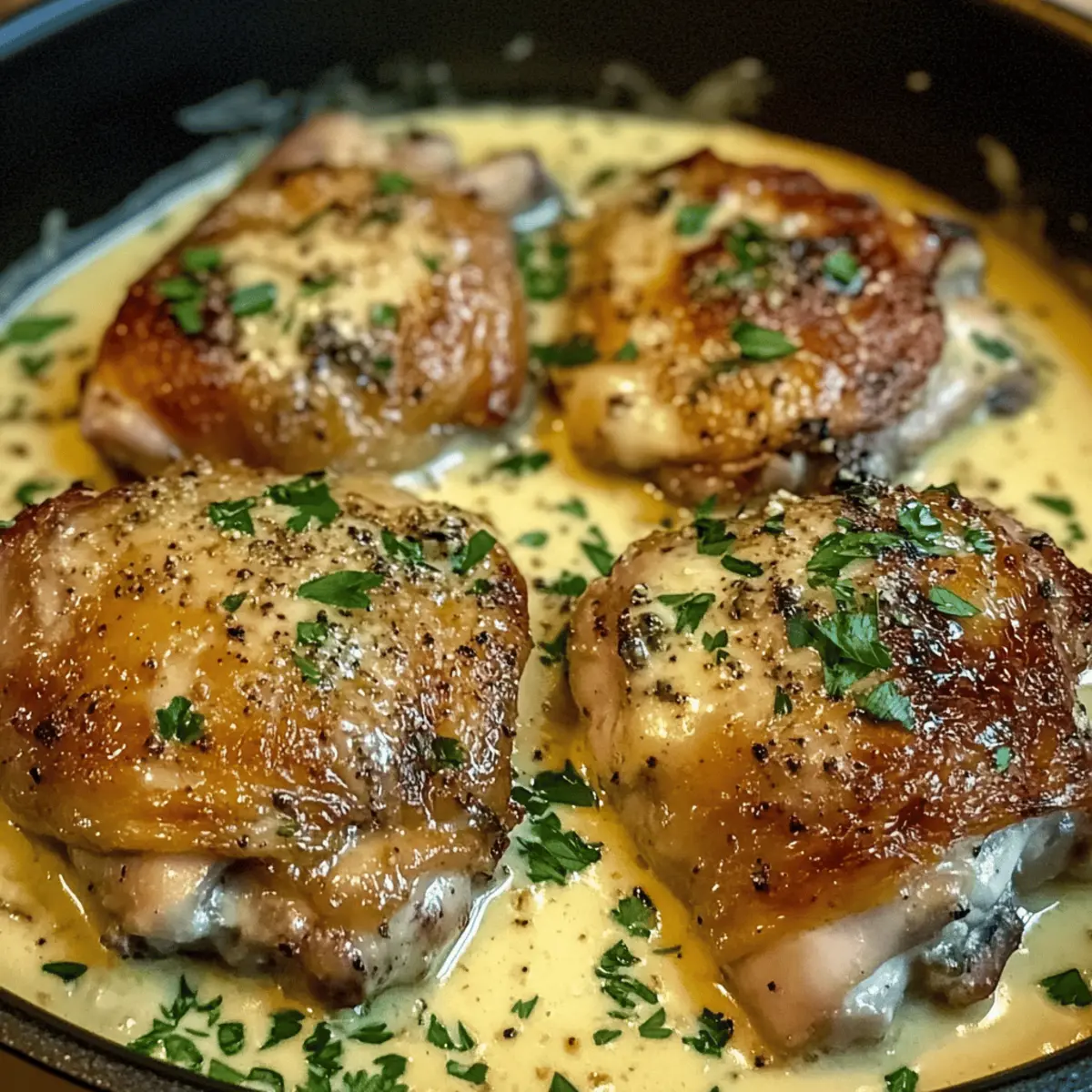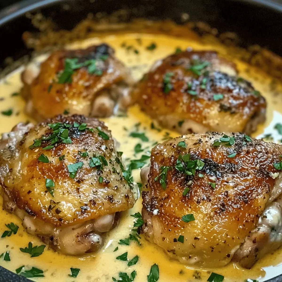 Jump to Recipe Print RecipeThere’s something about oven-baked meals that instantly transforms a regular weeknight into a cozy feast. My Creamy Oven Baked Chicken Thighs are a perfect example of this magic—juicy, well-seasoned thighs seared to golden perfection and nestled in a rich, garlicky cream sauce. What I love most about this dish is how easy it is to prep, making it an ideal choice for busy evenings without sacrificing flavor. Plus, it’s a family-friendly recipe that even the pickiest eaters will want seconds of! Serve it alongside some fluffy mashed potatoes or crusty bread to soak up that luscious sauce, and you’ve got a meal that everyone will look forward to. Curious about how to recreate this comforting classic at home? Let’s dive into the details! Why are creamy chicken thighs so comforting? Cozy Weeknight Instant Hit: This recipe transforms ordinary weeknights into memorable family dinners with minimal effort. Flavor-Packed Sauce: The garlicky cream sauce envelops tender chicken thighs, creating a symphony of flavors that satisfies every palate. Versatile Options: Choose between bone-in for juicy richness or boneless for quicker cooking—perfect for your family’s preferences! Easy Prep: With just a few simple steps, your dinner can go from skillet to oven, giving you more time to relax. Crowd-Pleaser: Serve it with mashed potatoes or crusty bread, and watch everyone at the table go back for seconds! If you’re looking for more comforting recipes, try my Garlic Parmesan Chicken or Honey BBQ Chicken. Creamy Oven Baked Chicken Thighs Ingredients For the Chicken • Chicken Thighs – Choose bone-in for more moisture or boneless for quicker cooking. • Olive Oil – Essential for searing, enhancing flavor and texture. • Salt and Black Pepper – Key for seasoning, elevating the overall taste. For the Seasoning • Paprika – Adds a mild smokiness and warmth to the dish. • Garlic Powder – Delivers a savory depth for added flavor. For the Sauce • Garlic Cloves – Freshness and aromatic notes for a robust sauce. • Butter – Enriches the sauce and aids emulsification for creaminess. • All-Purpose Flour – Thickens the sauce to achieve that creamy consistency. • Chicken Broth – Forms the sauce base—opt for low-sodium for better control. • Heavy Cream – Create a rich, creamy texture; substitute with milk or half-and-half for a lighter touch. • Dried Thyme – Offers an earthy flavor; feel free to swap with fresh thyme if desired. • Onion Powder – Introduces a gentle sweetness and depth. • Parmesan Cheese – Optional for that extra layer of delicious flavor. For Garnish • Chopped Parsley – Adds freshness and vibrant color to the finished dish. Embrace the cozy magic of this creamy oven baked chicken thighs recipe—perfect for any weeknight dinner! Step‑by‑Step Instructions for Creamy Oven Baked Chicken Thighs Step 1: Preheat the Oven Start by preheating your oven to 400°F (200°C). This temperature is perfect for achieving that golden-brown crust on your chicken thighs while ensuring they remain juicy inside. While the oven heats, gather your ingredients to streamline the cooking process later on. Step 2: Season the Chicken Generously season both sides of the chicken thighs with salt, black pepper, paprika, and garlic powder. Massage the spices into the meat to enhance absorption. The seasoning should be fragrant and well-distributed for maximum flavor in your Creamy Oven Baked Chicken Thighs. Step 3: Sear the Chicken In a large skillet, heat a couple of tablespoons of olive oil over medium-high heat. Once the oil shimmers, carefully add the seasoned chicken thighs. Sear for 4-5 minutes on each side until they develop a beautiful golden color. This step locks in moisture, so remove the chicken and set it aside when done. Step 4: Make the Creamy Sauce In the same skillet, lower the heat to medium and add butter. Once melted, introduce minced garlic and sauté for about 1 minute until fragrant. Sprinkle in flour and whisk for 1-2 minutes, forming a roux. Gradually whisk in chicken broth, followed by heavy cream, thyme, onion powder, and optional parmesan. Simmer for 2-3 minutes until the sauce thickens beautifully. Step 5: Return the Chicken and Bake Place the seared chicken thighs back into the skillet, skin-side up. Spoon the creamy sauce generously over each piece, ensuring they are well coated. Transfer the skillet to the preheated oven and bake for 25-30 minutes if using bone-in thighs, or 20-25 minutes for boneless, until the chicken reaches an internal temperature of 165°F (74°C). Step 6: Rest and Garnish Once baked, remove the skillet from the oven and let the chicken rest for about 5 minutes. This allows the juices to redistribute, enhancing tenderness. Before serving, garnish your Creamy Oven Baked Chicken Thighs with chopped parsley for a fresh touch and a beautiful presentation to your comforting meal. Expert Tips for Creamy Oven Baked Chicken Thighs Check Doneness: Always use a meat thermometer to ensure the chicken reaches 165°F (74°C), avoiding undercooked or dry meat. Choose Wisely: Opt for bone-in thighs for juiciness; boneless cooks faster but may dry out if overbaked—adjust time accordingly. Sear Properly: Get the skillet really hot before adding chicken. A good sear locks in flavor and moisture for these creamy oven baked chicken thighs. Enhance the Sauce: Feel free to introduce seasonal veggies to the sauce—think spinach or mushrooms—for extra nutrition and flavor. Rest the Chicken: Allow the chicken to rest post-baking for at least 5 minutes—this enhances tenderness and flavor absorption. What to Serve with Creamy Oven Baked Chicken Thighs? Fluffy mashed potatoes or a fresh salad can elevate your meal into a comforting feast everyone will adore. Fluffy Mashed Potatoes: Creamy and buttery potatoes soak up the savory sauce perfectly, creating an irresistible combination. Steamed Green Beans: Cris