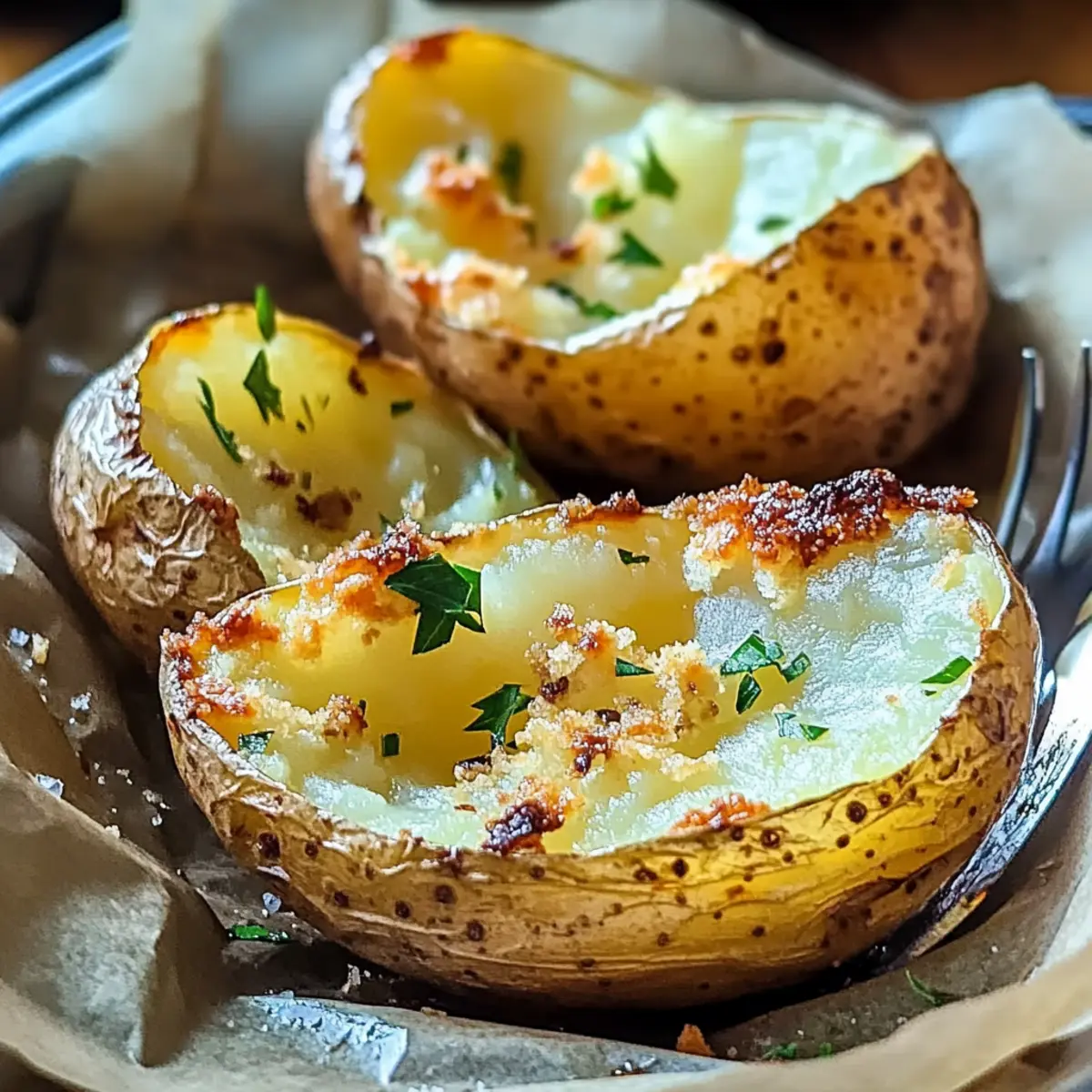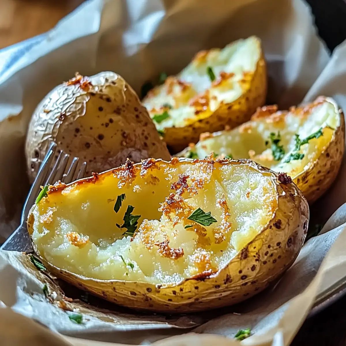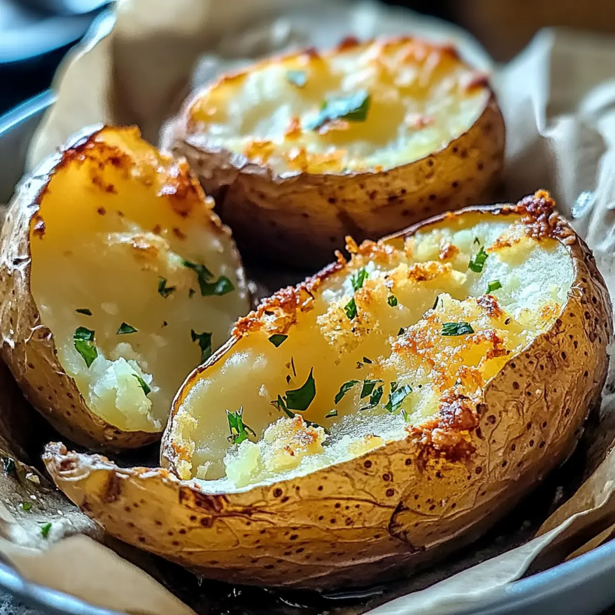 Jump to Recipe Print RecipeAs the aroma of roasting potatoes fills the kitchen, my heart races with anticipation, a feeling I suspect many home chefs share. There’s something magical about Crispy Baked Potatoes, with their golden, crunchy skin and soft, fluffy inside. This simple recipe transforms ordinary russet potatoes into a glorious side dish that’s both comforting and versatile. Perfect for busy weeknights, these crispy delights can be topped with everything from fresh herbs to gooey cheese, making them a true crowd-pleaser. Plus, they’re naturally gluten-free and an excellent alternative to heavy takeout. Are you ready to elevate your potato game and indulge in this wholesome comfort food? Let’s dive in! Why Are Crispy Baked Potatoes So Amazing? Versatile Toppings: Whether you fancy a sprinkle of fresh herbs or a dollop of sour cream, the topping possibilities are endless. Crowd-Pleasing: Everyone loves crispy potatoes! They pair perfectly with dishes like Cheesy Ranch Potatoes or a hearty steak. Easy Preparation: Just toss your seasoned potatoes in the oven and relax while they cook—perfect for busy weeknights! Irresistible Crunch: The golden, crispy skin contrasts perfectly with the soft interior, making each bite a delightful experience. Healthier Option: With no additives or heavy oils, these potatoes are a guilt-free side that can complement any meal. Gluten-Free Goodness: Enjoy them without worry; these crispy baked potatoes are naturally gluten-free, suitable for all gatherings and diets! Crispy Baked Potatoes Ingredients For the Potatoes Russet Potatoes – The star of this dish, russets guarantee a fluffy inside and a fool-proof crispy skin. Olive Oil – Key for enhancing flavor and achieving that coveted crunch; avocado oil works as a great alternative too. Sea Salt – This essential seasoning elevates the potatoes’ natural flavor, creating a satisfying taste. Black Pepper – A must for seasoning, adding a hint of warmth and depth to your crispy baked potatoes. For the Seasoning Garlic Powder (optional) – For a hint of aromatic flavor; fresh garlic can offer a more robust twist if you prefer! For the Garnish Fresh Herbs (rosemary or thyme) – These fragrant herbs add a fresh touch and burst of flavor just before serving. With these carefully selected ingredients, you’ll transform simple potatoes into a delicious, crowd-pleasing side dish that fits any meal. Enjoy! Step‑by‑Step Instructions for Crispy Baked Potatoes Step 1: Preheat the Oven Begin by preheating your oven to 425°F (220°C). This high temperature is essential for achieving that perfect crispy skin on your baked potatoes. As the oven warms up, gather your medium-sized russet potatoes and prepare to transform them into a delightful side dish. Step 2: Prepare the Potatoes Wash and scrub the russet potatoes thoroughly under running water to remove any dirt. Once they’re clean, dry them carefully with a towel. A well-dried potato is key to achieving that sought-after crispiness, so take your time on this step for perfect results! Step 3: Prick and Season Using a fork, prick holes all over each potato. This allows steam to escape during baking, preventing any unwanted explosions. In a mixing bowl, combine olive oil, sea salt, black pepper, and optional garlic powder. Rub this flavorful mixture generously over each potato, ensuring an even coat. Step 4: Bake the Potatoes Place the seasoned potatoes directly on the oven rack or on a lined baking sheet for convenience. Bake for 45-60 minutes, checking for doneness when the skin turns golden and a fork easily pierces through. If desired, rotate the potatoes halfway through to ensure they cook evenly. Step 5: Cool and Fluff Once the Crispy Baked Potatoes are fully cooked, remove them from the oven and allow them to cool slightly for about 5 minutes. Carefully squeeze the sides of each potato to fluff the insides, allowing the steam to escape and creating a perfect soft and airy interior. Step 6: Garnish and Serve Finally, sprinkle fresh herbs like rosemary or thyme over the crispy skin of your baked potatoes for an aromatic finish. These delicious, golden wonders are now ready to be served alongside your favorite meal. Enjoy the crispy exterior paired with the fluffy interior—and watch them disappear! Crispy Baked Potatoes Variations Feel free to let your culinary creativity shine as you explore these flavorful twists on Crispy Baked Potatoes! Herb-Infused: Incorporate fresh herbs like dill or parsley into the olive oil for an aromatic touch. The fragrance of the herbs will elevate the classic flavor profile and make your dish even more enticing. Sweet Potato Swap: Substitute russet potatoes with sweet potatoes for a naturally sweeter, healthier version. This alternative adds a beautiful color and a delightful hint of sweetness that pairs well with savory toppings. Spicy Kick: Add chili powder or cayenne pepper to the oil mixture for an exciting heat level. Fire up your taste buds and enjoy a delectable spicy potato that complements a range of meals, from BBQ to taco night. Cheesy Delight: Midway through baking, sprinkle a generous amount of your favorite cheese over the potatoes for an indulgent twist. As the cheese melts, it creates a crispy, irresistible topping that adds richness to every bite. Mediterranean Flair: Top the baked potatoes with feta cheese, olives, and cherry tomatoes once they’re out of the oven. This combination adds a zesty freshness, perfect for those warm summer evening meals that remind you of vacation dinners by the sea. Creamy Dips: Serve your crispy baked potatoes with a side of herbed butter or a tangy sour cream dip. These creamy companions elevate the experience, ensuring you savor every crunchy bite! Grandma’s Classics: Think outside the box and try topping your crispy baked potatoes with traditional pot roast or beef stew. This comfort-food classic takes the humble potato to a whole new level. Veggie-Pac