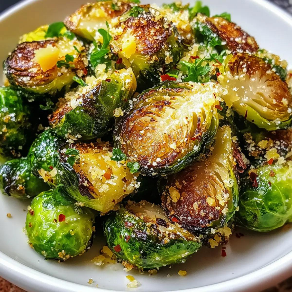 Jump to Recipe Print RecipeAs I opened my fridge, a forgotten bag of Brussels sprouts caught my eye, and instantly, a crunchy revelation struck me: Crispy Garlic Parmesan Brussels Sprouts! This easy recipe is a delightful way to breathe new life into an often-overlooked vegetable, turning it into a healthy side dish everyone will love. With the zesty kick of lemon, savory garlic, and the nutty richness of Parmesan, these beauties pack a flavor punch while keeping things light at just 220 calories per serving. Plus, they’re perfect for a beginner, so you can impress your family or guests with minimal effort. Curious about how to achieve that satisfying crunch and irresistible taste? Let’s dive in! Why are Brussels sprouts so delicious? Crispy texture: These Garlic Parmesan Brussels Sprouts achieve a perfect crunch that will have everyone reaching for seconds. Easy-to-make: This recipe is beginner-friendly, taking minimal time and effort to create a show-stopping side dish. Flavor infused: Seasoned with garlic, zesty lemon, and Parmesan, each bite bursts with savory goodness, making it hard to resist. Versatile pairing: They complement a variety of main dishes such as roasted chicken or grilled fish, enhancing any meal effortlessly. Health-conscious: At only 220 calories per serving, you can indulge without guilt while enjoying a nutritious vegetable. Crispy Garlic Parmesan Brussels Sprouts Ingredients For the Brussels Sprouts • Brussels Sprouts – Trim and halve them for even roasting, ensuring all pieces cook uniformly. For the Seasoning • Olive Oil – This rich oil promotes browning; choose extra-virgin for deeper flavor. • Garlic – Freshly minced adds a sweet-savory aroma that elevates the dish when roasted. • Salt – Essential for enhancing flavor and drawing out moisture, ensuring a crisp texture. • Black Pepper – Gives mild heat; feel free to adjust according to your taste. • Italian Seasoning – A fragrant herb blend that enhances the overall taste profile remarkably. For the Topping • Parmesan Cheese – Grated for nutty savoriness and an irresistible crust when melted. • Lemon Zest – This bright addition balances the richness with its citrus oils, elevating the dish. • Red Pepper Flakes (optional) – Add a kick of heat if you enjoy a bit of spice in your crispy garlic Parmesan Brussels sprouts! Step‑by‑Step Instructions for Crispy Garlic Parmesan Brussels Sprouts Step 1: Preheat the Oven Begin by preheating your oven to 400°F (200°C). While the oven warms up, line a baking sheet with parchment paper to prevent sticking and ensure easy cleanup. This setup is essential for achieving that perfect crispy texture in your Crispy Garlic Parmesan Brussels Sprouts. Step 2: Prepare the Brussels Sprouts In a large mixing bowl, toss together the halved Brussels sprouts, high-quality olive oil, freshly minced garlic, salt, black pepper, and Italian seasoning. Mix well until all the sprouts are evenly coated in the flavorful oil and seasonings. This not only enhances taste but also aids in achieving crispiness during roasting. Step 3: Arrange on the Baking Sheet Spread the seasoned Brussels sprouts out on the prepared baking sheet in a single layer, making sure not to overcrowd them. This step is crucial for even roasting, allowing each sprout to develop a beautifully golden-brown exterior while keeping the insides tender. Step 4: Roast Until Crisp Place the baking sheet in the preheated oven and roast the Brussels sprouts for 25-30 minutes. Halfway through, give them a quick stir to ensure they bake evenly. You’ll know they’re done when they appear crispy and golden, with tender insides that promise delightful flavor. Step 5: Add Finishing Touches Once roasted, remove the Brussels sprouts from the oven and immediately sprinkle them with grated Parmesan cheese and fresh lemon zest. This step not only adds delicious nutty flavors but also brightens the dish with citrus notes. The cheese will melt slightly, creating that irresistible crust. Step 6: Serve and Enjoy Serve the Crispy Garlic Parmesan Brussels Sprouts hot from the oven, optionally garnished with red pepper flakes for those who like a bit of heat. These flavorful sprouts make a fantastic side dish that complements many meals, or enjoy them as a healthy snack. How to Store and Freeze Crispy Garlic Parmesan Brussels Sprouts Fridge: Store leftovers in an airtight container for up to 3 days to retain freshness and flavor. Freezer: For longer storage, place cooled Brussels sprouts in a single layer on a baking sheet to freeze before transferring to a freezer-safe bag. They’ll keep for up to 3 months. Reheating: To restore the crispiness of your Crispy Garlic Parmesan Brussels Sprouts, reheat in the oven at 350°F (175°C) for 10-15 minutes, ensuring they become delightfully crispy again. Thawing: If frozen, thaw in the fridge overnight before reheating to ensure even warming without losing texture. Crispy Garlic Parmesan Brussels Sprouts Variations Feel free to get creative with these variations that can elevate your dish to new flavorful heights! Vegan Option: Replace Parmesan with nutritional yeast for a cheesy flavor without the dairy. It brings a delightful umami boost! Spicy Twist: Add a teaspoon of cayenne pepper or chili powder to the oil mixture for an exciting heat that complements the garlic perfectly. Your taste buds will dance! Balsamic Glaze: Drizzle balsamic reduction over the sprouts before serving for a tangy-sweet finish that enhances their crunch. The acidity pairs beautifully with the savory flavors. Lemon Garlic Zest: Increase the amount of lemon zest for an extra bright kick. This variation brings out the freshness in every bite, making it irresistible! Herb Infusion: Swap Italian seasoning for a combination of rosemary and thyme. Their earthy scents will create a heartwarming aroma in your kitchen. Cheesy Blend: Mix Parmesan with a little mozzarella for a gooey, cheesy crus