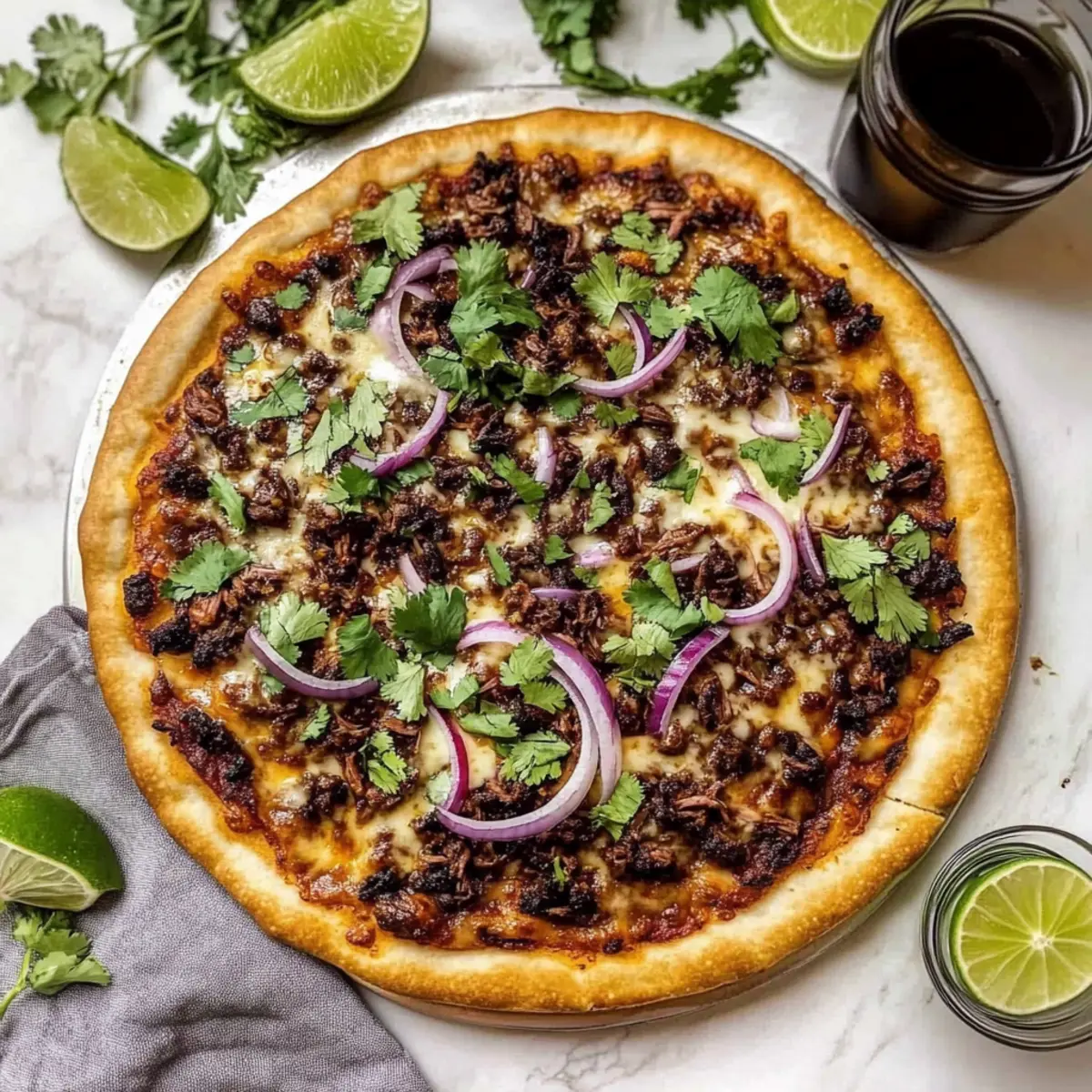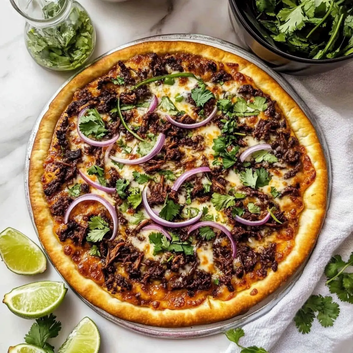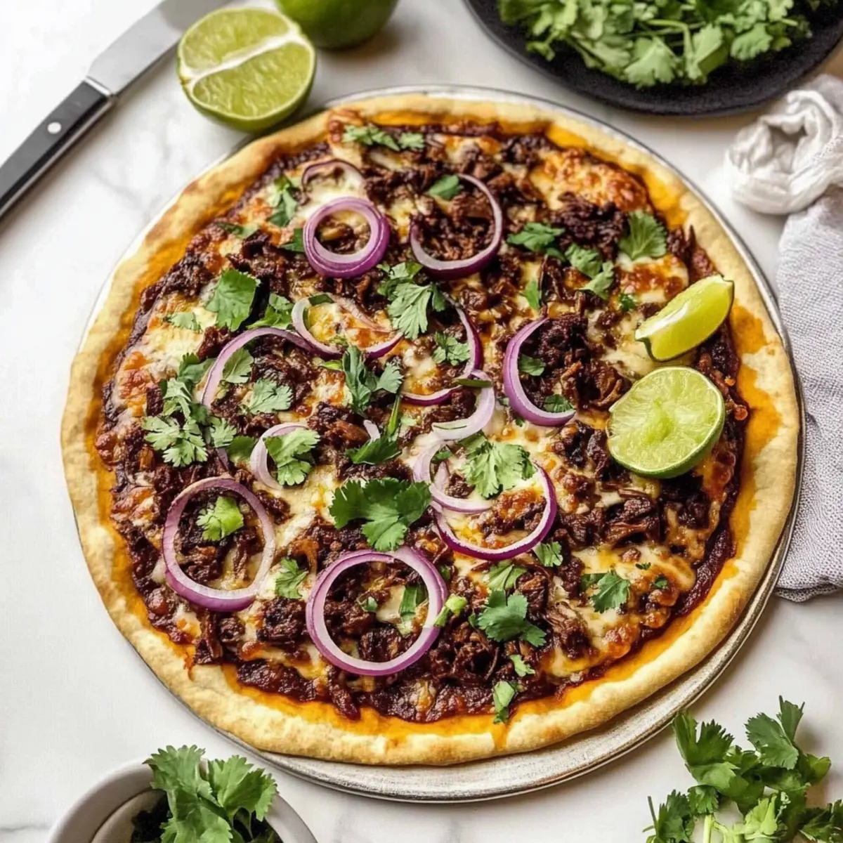Jump to Recipe Print RecipeAs I unearthed the leftovers from last night’s feast, inspiration struck with a delicious jolt: Crispy Oven-Baked Birria Pizza! This dish is like a love letter to comfort food, transforming yesterday’s beef birria into an utterly irresistible pizza. With a crispy crust and a delicious blend of savory beef, gooey cheese, and that aromatic birria sauce, this recipe not only delights the senses but is also an incredible way to breathe new life into your meal prep game. Plus, it’s an effortlessly quick and easy meal that both cooks and eaters can enjoy, making it the perfect solution for busy evenings or laid-back weekends. Why settle for takeout when a flavorful feast awaits right from your own kitchen? Ready to dive into this savory slice of heaven? Why is Birria Pizza So Irresistible? Flavor Explosion: This recipe marries the rich, savory flavors of leftover birria with the comforting appeal of pizza, making each bite deeply satisfying. Crispy Perfection: The oven-baked crust delivers that perfect crunch, holding the scrumptious toppings while ensuring you savor every moment. Quick & Easy: It transforms leftover birria into a delightful meal in under 30 minutes, perfect for busy weeknights. Crowd-Pleasing: Whether hosting friends or feeding the family, this pizza is sure to be a hit, delighting both pizza lovers and taco fans alike. Versatility at Its Finest: Feel free to customize with your favorite toppings! Want to spice it up? Add jalapeños or serve it with a side of Air Fryer Zucchini for a fresh twist. This Crispy Oven-Baked Birria Pizza is not just food; it’s an experience you’ll want to repeat! Crispy Oven-Baked Birria Pizza Ingredients • Here’s everything you need to recreate this comfort food masterpiece! For the Crust Fresh Pizza Dough – This serves as the hearty base for your pizza; feel free to use store-bought or make your own! Cornmeal – Sprinkle 2-3 tablespoons on your baking surface to ensure a non-stick experience. For the Toppings Birria Consommé – Use 1½ cups, divided, to add irresistible moisture and flavor to your pizza while also doubling as a delectable dipping sauce. Shredded Cheese (Oaxaca or Mozzarella) – About 1½ cups, these cheeses melt beautifully; you can even use a 4-Cheese Mexican Blend for a flavor twist. Leftover Beef Birria – The star of the show! This gives the pizza its savory depth; any leftover birria works perfectly. Red or White Onion – Thinly slice half a medium onion for that crunchy, fresh topping that enhances flavor. Fresh Cilantro – A must-have for garnish; it brings a pop of freshness that perfectly complements the rich toppings. Lime Wedges – Serve these on the side to add a refreshing zing to each bite. Make sure to gather these ingredients to bring your Crispy Oven-Baked Birria Pizza to life! Step‑by‑Step Instructions for Crispy Oven-Baked Birria Pizza Step 1: Preheat the Oven Begin by preheating your oven to a fiery 500°F (260°C). This high temperature is key for achieving the perfect crispy crust. Position a pizza stone in the oven and allow it to heat for about 45 minutes, ensuring it’s extremely hot for optimal baking. Step 2: Prepare the Dough While the oven heats, roll or stretch your fresh pizza dough to about ¼-½ inch thick, creating slightly thicker edges for a crust that holds up beautifully. To make transferring easier, place the dough on a piece of parchment paper. This will help slide it effortlessly onto the hot pizza stone later. Step 3: Assemble the Pizza Now it’s time to bring your Crispy Oven-Baked Birria Pizza to life! Start by spreading ⅓ cup of birria consommé evenly over the dough. Next, sprinkle 1½ cups of shredded cheese over the sauce, followed by 1½ cups of leftover beef birria. Finish assembling with a final layer of ½ cup of cheese on top for that gooey melt. Step 4: Bake Carefully transfer the assembled pizza onto the preheated pizza stone in the oven. Bake it for 10-15 minutes, watching closely as the crust turns golden brown and the cheese becomes bubbly and slightly browned. The delightful aroma will fill your kitchen, letting you know that your Crispy Oven-Baked Birria Pizza is nearly ready. Step 5: Heat the Consommé While your pizza bakes to crispy perfection, take a small saucepan and gently warm the reserved birria consommé over low heat on the stove. This will serve as a delicious dipping sauce, enhancing the flavors when serving your pizza. Step 6: Garnish and Serve Once out of the oven, let the pizza cool for a minute before topping it with thinly sliced onion and a generous sprinkle of fresh cilantro. Cut the pizza into slices and serve it with lime wedges and the warmed consommé alongside for that perfect burst of flavor! How to Store and Freeze Crispy Oven-Baked Birria Pizza Fridge: Store leftover birria pizza in an airtight container for up to 3 days. This helps maintain its flavor and prevents it from drying out. Freezer: If you want to save it for later, wrap individual slices tightly in plastic wrap or aluminum foil, then place in a freezer bag. It can last for up to 2 months in the freezer. Reheating: When ready to enjoy, reheat in the oven at 350°F (175°C) for about 10-15 minutes until the cheese is gooey and the crust is crispy again. Dipping Sauce: Remember to warm up your reserved birria consommé before serving to enhance the flavor experience alongside your reheated crispy oven-baked birria pizza! Expert Tips for the Best Crispy Oven-Baked Birria Pizza Preheat Properly: Ensure your oven is preheated to 500°F (260°C) with a pizza stone inside for a crispy crust that stands up to toppings. Avoid Dough Stickiness: Dust your baking surface with cornmeal and use parchment paper to prevent sticking while transferring the pizza to the oven. Monitor Baking Time: Keep an eye on your pizza as it bakes; cooking times can vary by oven. Aim for that golden, bubbly perfection to avoid burning. Layer Wisely: Distrib