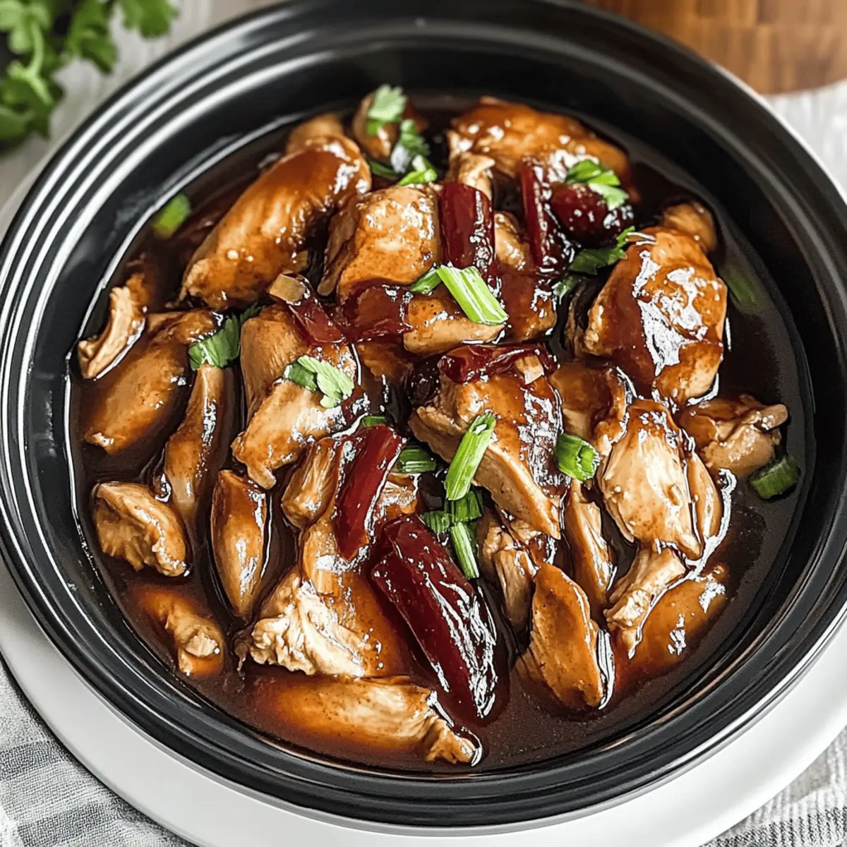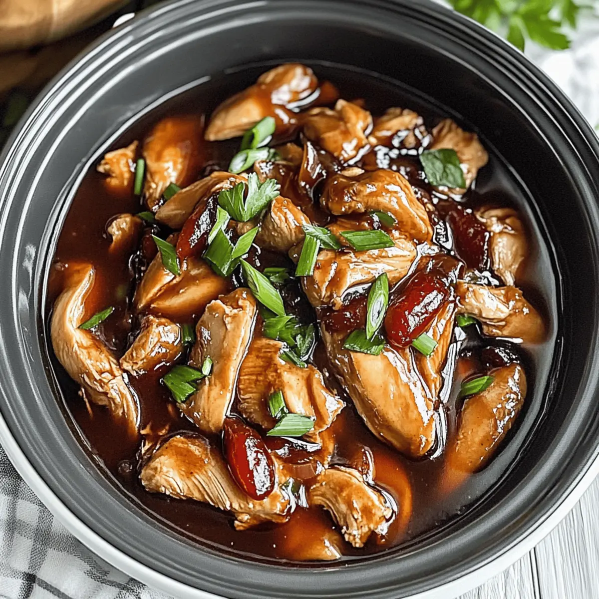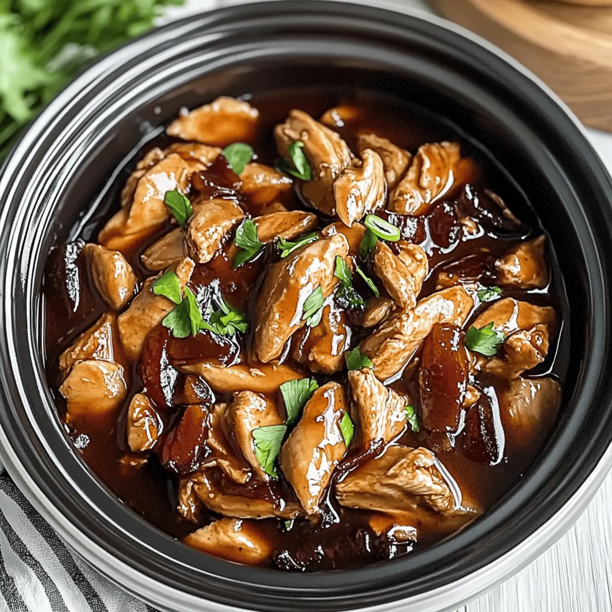 Jump to Recipe Print RecipeThere’s something magical about coming home to the smell of dinner already cooking away in the kitchen, isn’t there? Today, I’m excited to share my Slow Cooker Bourbon Chicken recipe—a delicious fusion of Southern and American-Chinese flavors that transforms tender chicken thighs into a mouthwatering masterpiece. Not only is this dish effortlessly easy to make, but it also offers a delightfully customizable heat level, making it perfect for everyone at the dinner table. Whether you’re winding down after a hectic day or looking to impress guests with minimal fuss, this crock pot bourbon chicken is your go-to meal. Curious about how a splash of bourbon can elevate your weeknight dinners? Let’s dive into the details! Why Is This Bourbon Chicken So Special? Ease of Preparation: Just toss your ingredients in the slow cooker; dinner practically makes itself! Bursting with Flavor: The rich bourbon-infused sauce offers a delectable balance of sweet and savory that’s truly irresistible. Customizable: Want more heat? Toss in some jalapeños or red pepper flakes. Prefer a sweeter bite? Adjust the sugar to your liking! Crowd-Pleasing: This dish has universal appeal—perfect for family dinners or entertaining guests. Serve it over rice, like with Honey Bbq Chicken, for a satisfying meal everyone will enjoy. Nutritional Comfort: It’s not only tasty but also relatively healthy, fitting nicely into your meal prep routine without guilt. Try it alongside a colorful salad to boost your veggie intake! Savor the joy of a home-cooked meal while embracing simplicity and flavor with this unforgettable crock pot bourbon chicken! Crock Pot Bourbon Chicken Ingredients • Here’s everything you’ll need for this delicious dish! For the Chicken Boneless Skinless Chicken Thighs – The star of the show, bringing tenderness and flavor; for a healthier twist, use chicken breasts. For the Sauce Light Brown Sugar – This adds the perfect touch of sweetness to the sauce; feel free to increase slightly for a sweeter finish. Soy Sauce – An essential for that salty umami base; opt for low-sodium soy sauce for a healthier choice. Bourbon Whiskey – Infuses the dish with a rich depth; substitute with apple juice for a non-alcoholic version. Apple Cider Vinegar – Adds a tangy kick to balance the sweetness; no substitutions necessary here! Ground Ginger – Provides warmth and a spice element; fresh ginger can elevate the flavor even more. Honey – Sweetens and deepens the sauce flavor; consider replacing it with maple syrup for a unique twist. Red Pepper Flakes – Adds just the right amount of heat; customize based on your spice preference. Garlic (minced) – For aromatic flavor; always use fresh garlic for optimal taste. For Thickening Cornstarch – Necessary for thickening your luscious sauce at the end; arrowroot powder can be used as a gluten-free alternative. Water – Needed to create a cornstarch slurry; there are no substitutes for this. For Garnish Chopped Green Onions – Adds a pop of freshness and color; sesame seeds can also be used for a crunchy alternative. Now, you’re all set to whip up this comforting crock pot bourbon chicken! Step‑by‑Step Instructions for Crock Pot Bourbon Chicken Step 1: Setup the Chicken Begin by placing the boneless skinless chicken thighs at the bottom of your slow cooker. Arrange them in a single layer for even cooking. This step is essential as the chicken is the star of this crock pot bourbon chicken, ensuring it gets coated beautifully in the sauce. Step 2: Whisk Together the Sauce In a mixing bowl, whisk together the light brown sugar, soy sauce, bourbon, apple cider vinegar, ground ginger, honey, red pepper flakes, and minced garlic until the mixture is smooth and well combined. This aromatic sauce will envelop and infuse the chicken with sweet and savory flavors, setting the stage for a delightful meal. Step 3: Pour the Sauce Over Chicken Carefully pour the sauce mixture over the chicken thighs in the slow cooker, ensuring that each piece is well coated. Cover the slow cooker with its lid and set it to cook on low for 6 hours or high for 4 hours. The tantalizing aroma will fill your kitchen as it cooks, ensuring a mouthwatering dish. Step 4: Shred the Chicken Once cooking is complete, remove the chicken from the slow cooker and place it on a cutting board. Use two forks to chop or shred the chicken into bite-sized pieces; it should be incredibly tender and easy to pull apart. This will allow the chicken to better absorb the flavorful sauce when combined later. Step 5: Thicken the Sauce To achieve a glossy finish for your crock pot bourbon chicken, create a cornstarch slurry by mixing the cornstarch with water in a small bowl. Stir this slurry into the sauce remaining in the slow cooker, and continue cooking on high for an additional 5 to 10 minutes until thickened. This step is key for that perfect, clingy sauce consistency. Step 6: Combine and Serve Return the shredded chicken to the slow cooker, stirring it well to mix with the thickened sauce. Cook for another 5 minutes to allow all the flavors to meld beautifully. Serve your delectable crock pot bourbon chicken over freshly cooked rice, garnishing with chopped green onions or sesame seeds for that extra touch of color and crunch. Crock Pot Bourbon Chicken Variations Feel free to personalize your dish with these delightful twists and substitutions that will elevate your slow-cooked masterpiece! Vegetable Addition: Add bite-sized pieces of bell peppers, carrots, or snap peas to enrich the dish. They’ll bring color and added nutrition to your plate while complementing the sauce beautifully. Spicy Variation: Increase red pepper flakes or introduce sliced jalapeños for a hotter version. Heat enthusiasts will love the extra kick, making each bite a flavor explosion! Sour Alternative: Swap bourbon for apple cider or a splash of flavored vinegar for different flavor prof