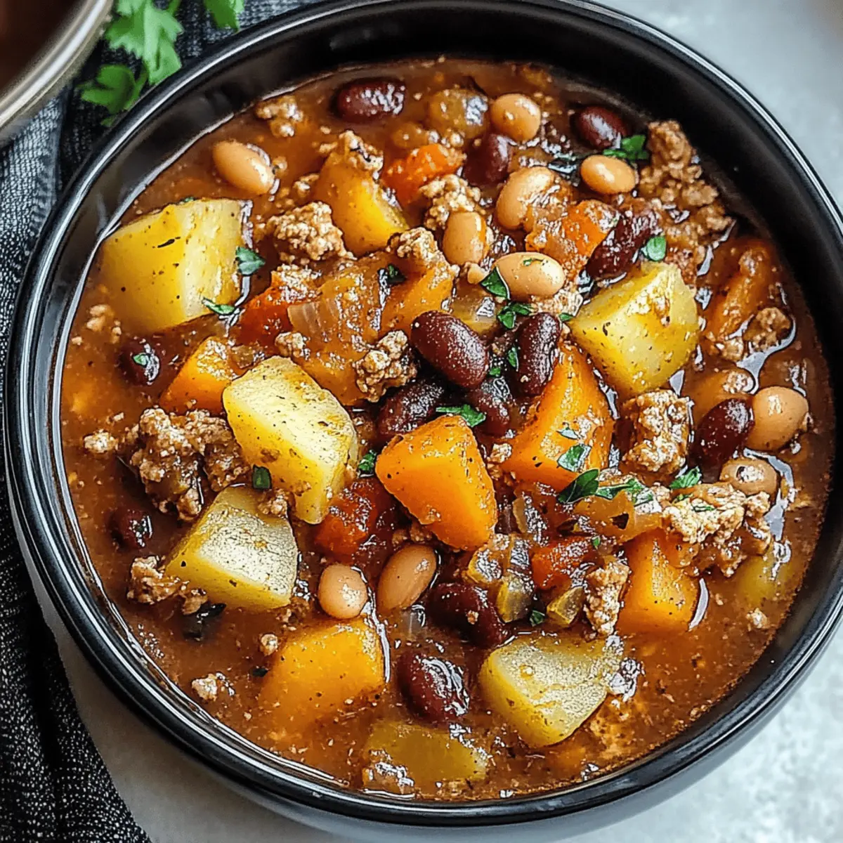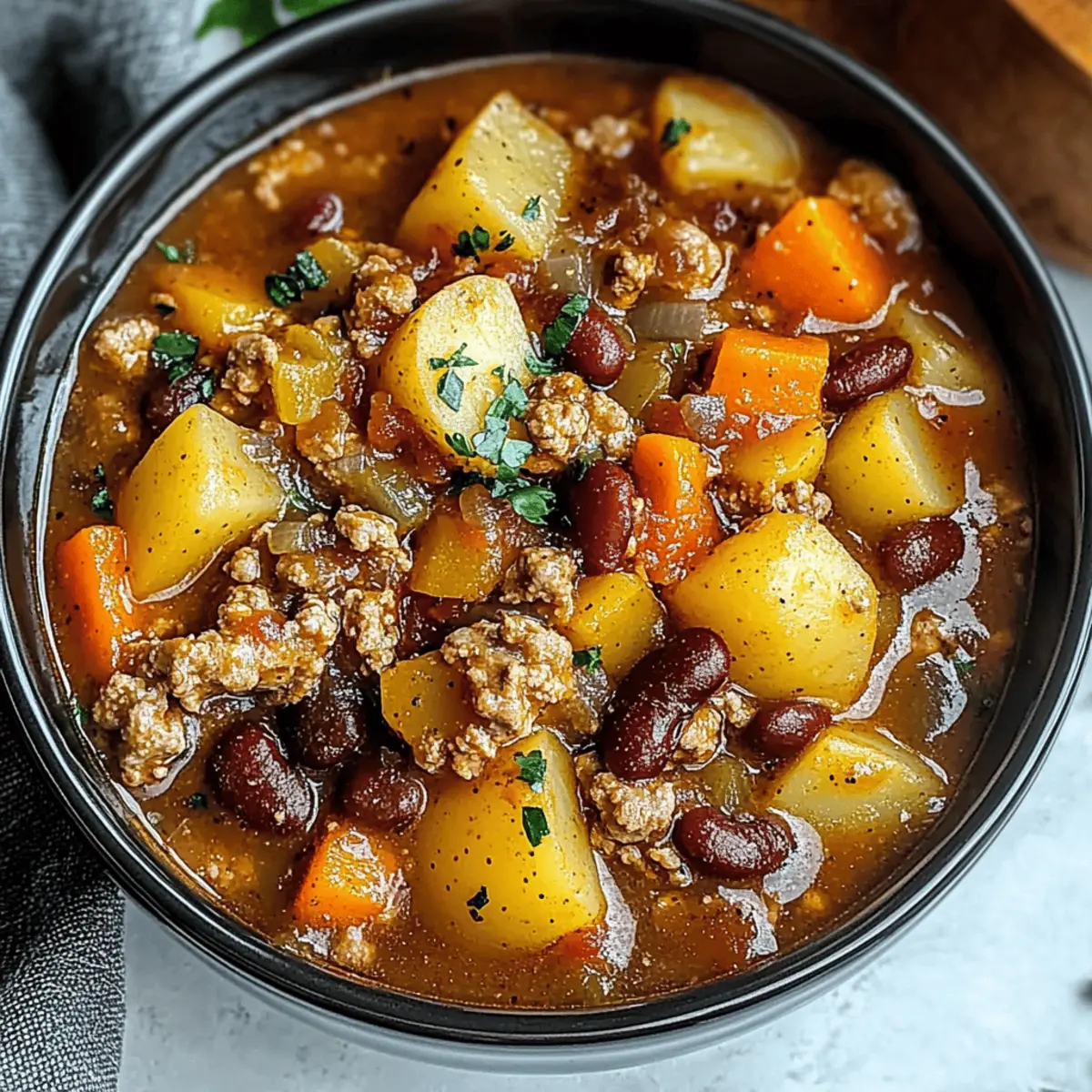 Jump to Recipe Print RecipeAs the chill of autumn settles in, there’s nothing quite like the aroma wafting through your home from a bubbling pot of Crock Pot Shipwreck Stew. This hearty one-pot meal is not only a delightful way to warm up, but it’s also budget-friendly and incredibly versatile, allowing you to use whatever ingredients you have on hand. With lush potatoes, sweet carrots, and savory ground beef mingling in a rich tomato broth, this stew becomes the ultimate comfort food. Whether you’re savoring it on a cozy night in or serving it at your next game day gathering, you’ll appreciate the minimal prep and maximum satisfaction it brings. Curious about how to make this cozy classic your own? Let’s dive in! Why Is Crock Pot Shipwreck Stew Perfect? Hearty Flavor: This stew brims with robust ingredients, creating a deeply satisfying taste that will have everyone asking for seconds. Budget-Friendly: Using simple pantry staples, this recipe makes feeding the family far easier on your wallet. Effortless Cooking: Just toss everything in the slow cooker and let it do the work—perfect for busy days or when you want to relax! Versatile: With endless variations, feel free to swap ground beef with turkey or add any veggies you have on hand for a personalized twist. Crowd-Pleaser: Whether it’s game day or a family gathering, this one-pot meal is sure to impress and leave everyone feeling warm and content. For side ideas, consider serving it with some Cheesy Ranch Potatoes or cornbread for the ultimate comfort meal! Crock Pot Shipwreck Stew Ingredients For the Beef • Ground Beef – This is your primary protein source; substitute with ground turkey, chicken, or plant-based crumbles for a lighter dish. For the Vegetables • Russet Potatoes – They add thickness and tenderness; feel free to swap in Yukon gold or red potatoes, ensuring red potatoes are cut smaller. • Carrots – Sweet and hearty, they complement the stew; use other root vegetables if preferred. • Celery – Provides a lovely crunch; if you’re out, substitute with extra onion or a pinch of celery seed. • Yellow Onion – This builds savory depth; sweet onion or shallots can make a great alternative. • Garlic – Fresh minced garlic is ideal; in a pinch, use garlic powder (1 tsp). For the Broth • Diced Tomatoes – They form the base of your broth; crushed tomatoes or tomato soup can work too, just add a pinch of sugar if needed. • Tomato Sauce – A key component of the broth; try using tomato purée for a thicker consistency if desired. • Beef Broth – Adds robust flavor; swap for chicken or vegetable broth, but adjust seasoning as necessary. For the Beans • Kidney Beans – These boost protein and fiber; pinto or black beans can also be used as substitutes—don’t forget to rinse them to reduce sodium. For Seasoning • Worcestershire Sauce – It adds a kick of umami flavor; if avoiding gluten, use soy sauce or coconut aminos instead. • Spices – Include paprika, bay leaf, and thyme for a depth of flavor; feel free to tweak according to your taste preferences. This Crock Pot Shipwreck Stew is not just a recipe; it’s a canvas for your culinary creativity! Step‑by‑Step Instructions for Crock Pot Shipwreck Stew Step 1: Brown the Beef Heat a large skillet over medium heat, adding the ground beef. Break it up with a wooden spoon and cook for 4 to 5 minutes until it’s mostly browned. Add the diced yellow onion and cook for an additional 3 minutes until the onion is soft and translucent. Stir in the minced garlic, cooking for 30 seconds until fragrant, then drain any excess fat if necessary. Step 2: Prepare the Slow Cooker In your slow cooker, layer the chopped russet potatoes, sweet carrots, and diced celery. Then, add in the kidney beans, diced tomatoes, tomato sauce, and beef broth. Drizzle the Worcestershire sauce over the top, followed by sprinkling paprika, bay leaf, and thyme. Gently spoon the browned beef mixture on top, and stir everything together until well combined. Step 3: Cook Cover the slow cooker with its lid and set it to cook on LOW for 7 to 8 hours, or on HIGH for 3 to 4 hours. Avoid lifting the lid during cooking to ensure the heat remains consistent. You’ll know it’s ready when the vegetables are fork-tender and the broth has thickened slightly, filling your kitchen with mouthwatering aromas. Step 4: Finish Up Once the cooking time is complete, carefully remove the bay leaf from the stew. Taste the Crock Pot Shipwreck Stew and adjust the seasoning with salt and pepper as needed. Ladle the hearty stew into bowls, and serve it hot, relishing in the warmth and flavors of this comforting dish. What to Serve with Crock Pot Shipwreck Stew As the heartiness of this stew warms your kitchen, consider these delightful pairings to round out your meal. Crusty Bread: Perfect for sopping up the rich broth, a loaf of crusty bread brings a satisfying crunch and a touch of comfort. Warm Cornbread: Sweet and fluffy, cornbread provides a delightful contrast to the savory stew, making every bite incredibly satisfying. Simple Green Salad: A fresh salad with crisp greens and a light vinaigrette balances the hearty stew, adding a refreshing touch and color to your table. Garlic Bread: The buttery, garlicky flavors of garlic bread complement the stew perfectly, bringing an indulgent element to your dining experience. Creamy Mashed Potatoes: For an extra layer of comfort, serve with creamy mashed potatoes; they soak up the flavors while adding a rich, velvety texture. Apple Crisp: Finish with a warm apple crisp sprinkled with cinnamon for a sweet ending that contrasts beautifully with the savory stew. Make Ahead Options These Crock Pot Shipwreck Stew components are perfect for busy home cooks looking to save time! You can chop the vegetables (potatoes, carrots, celery, and onions) and store them in an airtight container in the refrigerator up to 3 days in advance. Additionally, feel fr