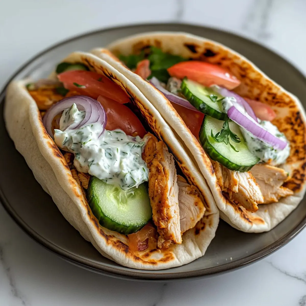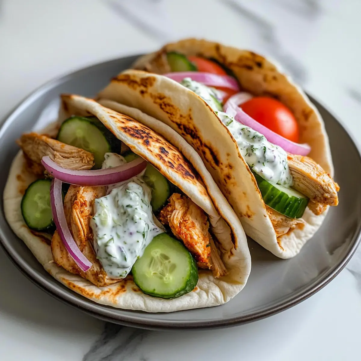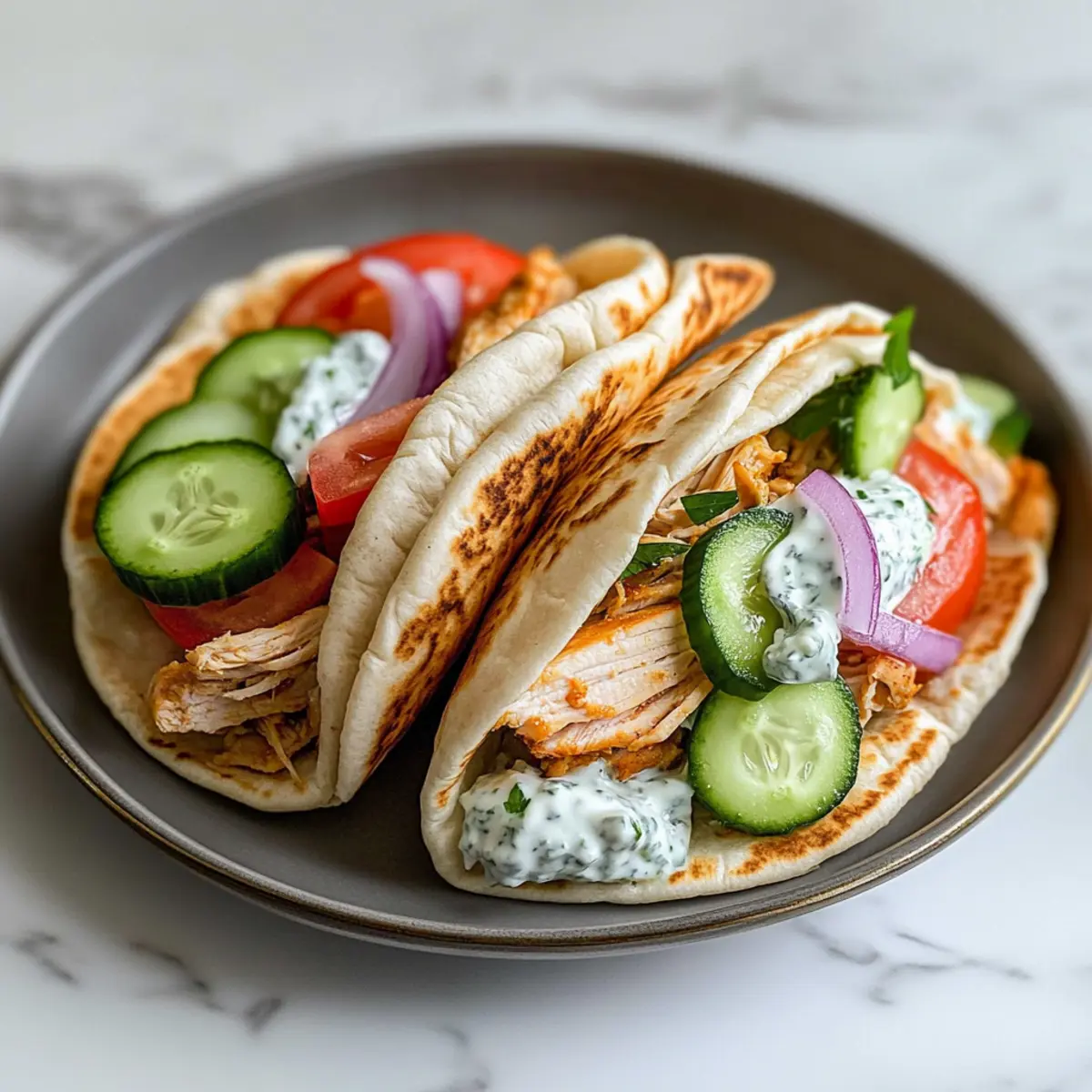 Jump to Recipe Print RecipeAs I heard the gentle simmering of my crockpot, anticipation filled the air—tonight, we were set to enjoy Crockpot Greek Chicken Pitas with Creamy Tzatziki Sauce. This recipe transforms weeknight chaos into a soothing experience, marrying tender, marinated chicken thighs with warm pita bread and fresh veggies. One of the best parts? It’s incredibly easy to prepare, making it perfect for busy families seeking a healthy, delicious dinner without the fuss. Plus, the zesty tzatziki adds a delightful twist that elevates every bite. Are you ready to step into the aroma of the Mediterranean right in your kitchen? Let’s dive into this simple yet satisfying affair that promises to become a mealtime favorite! Why Choose Crockpot Greek Chicken Pitas? Simplicity at Its Best: The slow-cooking method makes this recipe a breeze, allowing even novice cooks to shine. Flavor Explosion: The combination of marinated chicken thighs and creamy tzatziki brings Mediterranean flavors to your table. Healthy and Wholesome: Packed with lean protein and fresh veggies, this dish caters to health-conscious families without sacrificing taste. Versatile Options: Customize your pitas with toppings of your choice or switch proteins for a personal twist. Consider pairing with a refreshing Greek salad for a well-rounded meal. Perfect for Busy Nights: With minimal prep time and the ability to cook throughout the day, you can effortlessly serve a delightful dinner, leaving you with more time for family. Time-Saving Delight: Let your crockpot do the hard work while you focus on other tasks, ensuring a satisfying meal is always within reach! Crockpot Greek Chicken Pitas Ingredients For the Chicken Marinade • Boneless, Skinless Chicken Thighs – This tender protein becomes juicy and flavorful when cooked slowly in the crockpot. • Plain Greek Yogurt – Adds creaminess and tang; can substitute with dairy-free yogurt for a lactose-free option. • Lemon Juice – Brightens flavors and adds acidity; fresh lemon juice is best for the most vibrant taste. • Garlic, Minced – Provides aromatic depth; fresh garlic yields a stronger flavor than powdered options. • Olive Oil – Enhances moisture and flavor; extra virgin offers a richer, more robust taste. • Dried Oregano – Imparts earthy notes typical of Greek cuisine; fresh oregano can be used for a lighter flavor. • Salt & Black Pepper – Essential for balancing the dish’s flavors; adjust to personal taste. For Serving • Pita Bread – Perfect for wrapping the flavorful filling; whole wheat or traditional varieties work well. • Toppings (Sliced Cucumber, Tomato, Red Onion, Feta) – Adds freshness and crunch; consider adding olives or parsley for an extra burst of flavor. • Tzatziki Sauce – Complements the dish with its creamy, refreshing taste; store-bought or homemade can be used. Explore the delightful blend of flavors in these Crockpot Greek Chicken Pitas, making dinnertime a joyous experience for the whole family! Step‑by‑Step Instructions for Crockpot Greek Chicken Pitas Step 1: Prepare the Chicken Start by placing your boneless, skinless chicken thighs directly into the crockpot. This sturdy kitchen appliance will work its magic, allowing the chicken to become wonderfully tender. Ensure the thighs are evenly spread out in the bottom, creating an ideal foundation for the vibrant Greek flavors to soak in. Step 2: Make the Marinade In a mixing bowl, combine plain Greek yogurt, fresh lemon juice, minced garlic, olive oil, dried oregano, salt, and black pepper. Whisk the ingredients together until smooth and well blended. This marinade is essential for infusing the chicken with delicious Mediterranean flavors, creating a creamy texture that invites indulgence. Step 3: Marinate the Chicken Pour the marinade over the chicken thighs in the crockpot, making sure each piece is nicely coated. Use a spatula or your hands to spread the mixture evenly. Cover the crockpot and set it to cook on low for 6-8 hours or high for 3-4 hours, until the chicken is tender and easily shreds with a fork. Step 4: Prepare Toppings While the chicken is cooking, take some time to prepare your fresh toppings. Slice cucumbers, tomatoes, and red onions into thin rounds, and crumble the feta cheese into small pieces. Arrange the components on a platter for easy assembly later, ensuring a pop of color and freshness for your Crockpot Greek Chicken Pitas. Step 5: Assemble the Pitas Once the chicken is cooked to perfection, remove it from the crockpot and shred it using two forks. Spoon the tender, flavorful chicken into warm pita bread pockets. Add a generous handful of your prepared toppings and finish with a delightful drizzle of tzatziki sauce for that creamy, zesty touch. Step 6: Serve and Enjoy! Serve the assembled Crockpot Greek Chicken Pitas on a large platter for a festive feel. Encourage your family to customize their pitas with extra toppings or sauces of their choice. This meal is not just about feeding the body; it’s about sharing a delicious experience together, filled with Mediterranean flavors! What to Serve with Crockpot Greek Chicken Pitas Nothing complements the savory allure of Greek flavors like a delicious array of side dishes and drinks, enhancing your culinary experience. Greek Salad: A refreshing combination of cucumbers, tomatoes, olives, and feta, this salad creates a bright contrast to the savory chicken. Roasted Vegetables: Toss seasonal veggies like zucchini and bell peppers with olive oil and herbs, enhancing the meal’s hearty, rustic feel. Hummus with Pita Chips: Creamy and flavorful, hummus pairs beautifully with the pita pockets, offering a delightful dip and a touch of extra protein. Quinoa Tabbouleh: A fresh, herby salad made with parsley, mint, and bulgur, it brings in vibrant flavors and healthy grains, complementing the chicken’s tenderness. Stuffed Grape Leaves (Dolmas): These tender grape leaves wrapped aroun