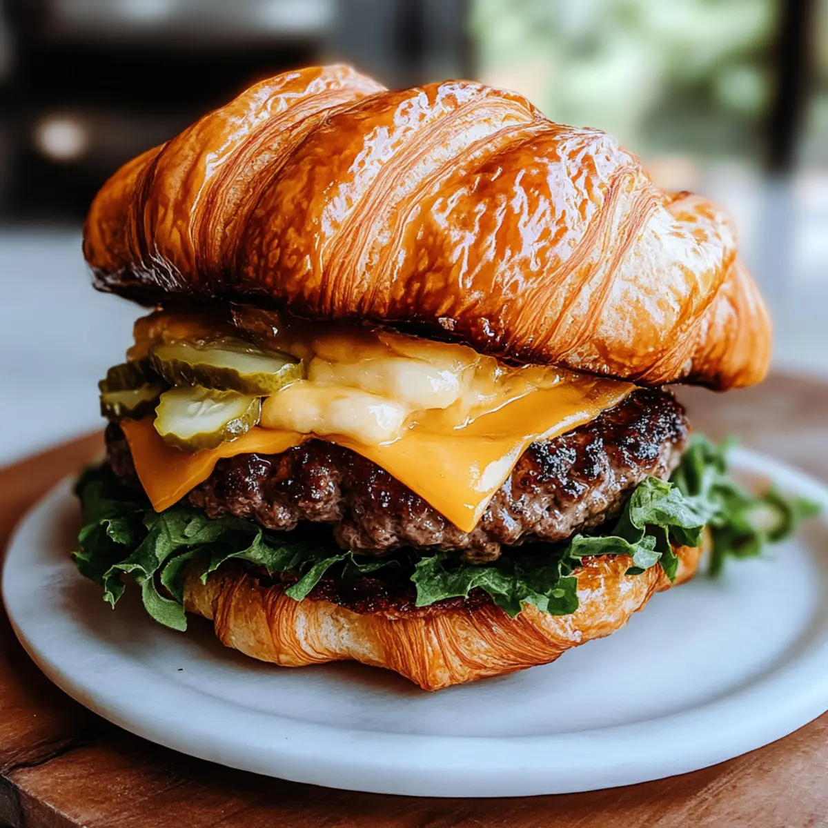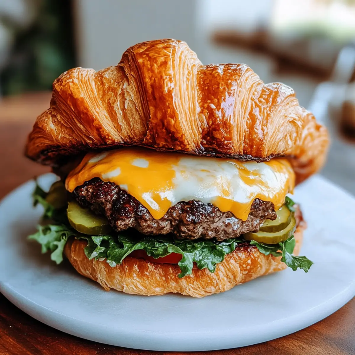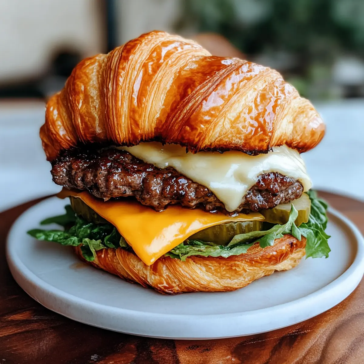 Jump to Recipe Print RecipeYou won’t believe how effortlessly a bit of French flair can turn an American staple into a comforting masterpiece! Meet my Croissant Smash Burgers, where tender, buttery croissants replace traditional buns, cradling juicy smashed beef patties that are all about flavor. These customizable delights are not only quick and easy to whip up but also add a gourmet touch to your weeknight dinners. Whether you choose to pile on fresh toppings or opt for a simple cheese melt, these burgers embrace your taste in the most delicious way. Ready to uncover a new family favorite that will leave everyone craving more? Let’s dive into making this delicious fusion! Why Will You Love Croissant Smash Burgers? Satisfying Comfort: The buttery croissant buns elevate your typical burger experience, delivering a melt-in-your-mouth texture that’s simply irresistible. Versatile Toppings: Customize to your heart’s content! Whether you prefer classic lettuce and tomato or adventurous jalapeños and garlic aioli, this recipe caters to every taste. Quick and Easy: Perfect for busy weeknights, these burgers come together in just a few simple steps, making them an ideal choice for families craving a delicious home-cooked meal. Gourmet Appeal: Impress your friends and family with this unique twist on a classic dish; they’ll think you’ve been cooking like a pro! Pair them with Baked Smashed Potatoes or a fresh salad for a complete meal. Crowd-Pleaser: From kids to adults, everyone loves a good burger. These Croissant Smash Burgers will quickly become a hit at your next gathering! Croissant Smash Burgers Ingredients For the Burger • Croissants – The star of the show, these buttery, flaky buns add a gourmet touch to your classic burger experience. • Ground Beef – The main protein, delivering savory goodness; consider ground turkey or veggie patties for lighter options. • Cheese – Perfect for melting over the beef; cheddar is a classic, but Swiss or gouda are great alternatives. For the Toppings • Lettuce – Adds a refreshing crunch; can be swapped with spinach or arugula for a nutritious twist. • Tomato – Juicy and flavorful, it brightens up the burger; use cherry tomatoes for a sweeter bite. • Pickles – Provide a delightful tang; if you’re not a fan, try jalapeños for some heat instead. For Extra Flavor • Optional Sauces – Elevate your burger with garlic aioli, sriracha mayo, or any favorite sauces. Feel free to experiment with flavors! With these ingredients for your Croissant Smash Burgers, you’re on your way to crafting a meal that will tantalize your taste buds and leave everyone craving more! Step‑by‑Step Instructions for Croissant Smash Burgers Step 1: Prepare the Patties Begin by shaping the ground beef into equal-sized patties, approximately 4 inches wide. Gently press a small indentation in the center of each patty to ensure even cooking and prevent shrinking. This initial preparation is essential for crafting delicious Croissant Smash Burgers, so keep your patties uniform in size. Step 2: Cook the Patties Heat a cast-iron skillet over medium-high heat until it’s hot but not smoking. Place the beef patties in the skillet, and using a spatula, smash each one down firmly for maximum contact with the surface. Cook for about 3-4 minutes per side until they develop a rich, golden-brown crust, and the internal temperature reaches 160°F, ensuring that they’re cooked through. Step 3: Add Cheese In the final minute of cooking, place your choice of cheese—like cheddar—on top of each patty. Cover the skillet briefly with a lid to allow the cheese to melt perfectly over the meat. This step is crucial for creating the cheesy, blissful layer that truly elevates your Croissant Smash Burgers! Step 4: Toast Croissants While the patties are cooking, slice the croissants in half. Once the patties are cooked, remove them from the skillet and keep them warm. In the same skillet, place the croissant halves cut-side down to lightly toast until they’re golden brown and slightly crispy, taking about 1-2 minutes. This adds texture to your burger assembly. Step 5: Assemble the Burgers Now it’s time to put together your Croissant Smash Burgers! On the bottom half of each toasted croissant, layer fresh lettuce, sliced tomatoes, and pickles. Next, place the cheesy beef patty on top of those crisp veggies. If desired, drizzle your favorite sauces onto the patty before placing the top half of the croissant to finish off your burger masterpiece. Step 6: Serve Immediately These delectable Croissant Smash Burgers are best enjoyed fresh and hot! Plate them up alongside crispy fries or a vibrant salad for a complete meal experience. Invite your loved ones to dig in, ensuring they savor every bite of this delicious and indulgent twist on a classic favorite! Make Ahead Options These Croissant Smash Burgers are ideal for meal prep, allowing you to enjoy deliciousness even on the busiest days! You can prepare the beef patties up to 3 days in advance—just form them and refrigerate them until you’re ready to cook. For even longer storage, freeze the formed patties for up to 3 months. To maintain their juicy texture, wrap each patty tightly in plastic wrap before refrigerating or freezing. When it’s time to serve, simply heat a skillet over medium-high heat, cook the patties for 3-4 minutes per side, and finish with cheese as they cook. Toast the croissants right before assembly to keep them crispy, and you’ll have flavorful Croissant Smash Burgers ready in no time! What to Serve with Croissant Smash Burgers Elevate your meal with these delicious sides and beverages that perfectly accompany your fantastic creation. Crispy French Fries: The classic side adds a satisfying crunch that contrasts beautifully with the soft croissant bun and juicy patty. Mixed Green Salad: A refreshing balance to the richness of the burger, a salad with fresh greens, tomatoes, and a lig