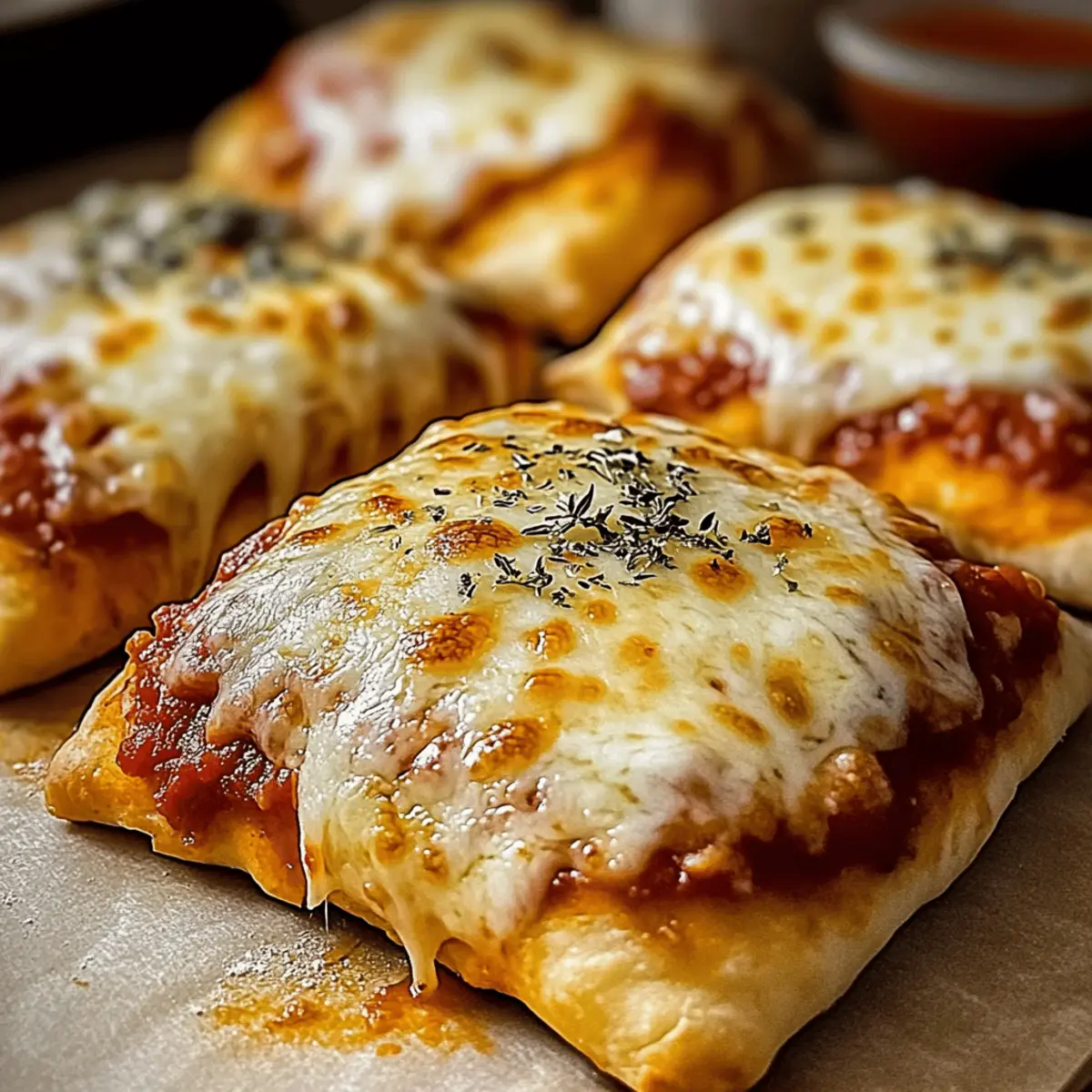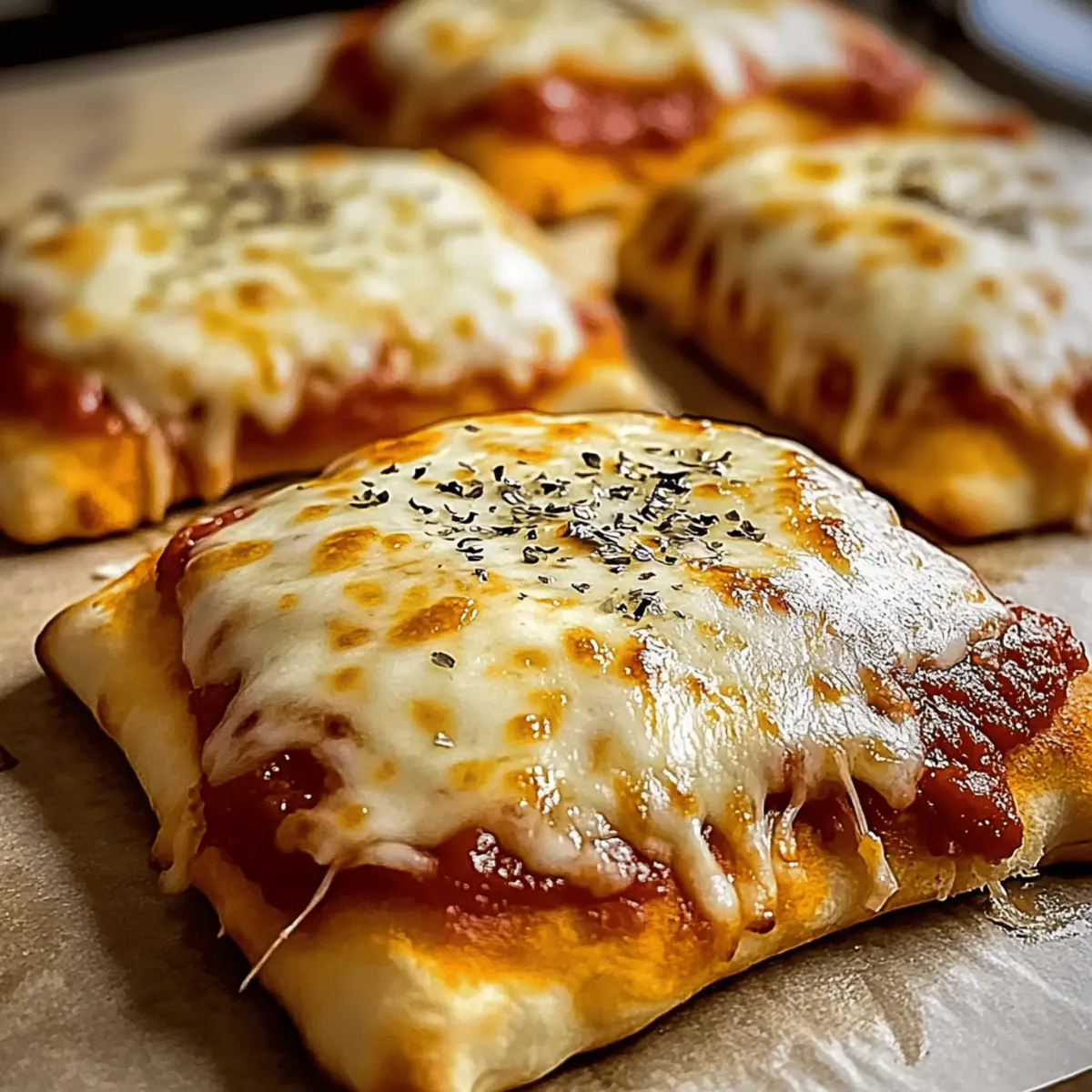 Jump to Recipe Print RecipeAs I pulled a tray of these golden Easy Cheesy Pizza Pockets from the oven, the delightful scent whisked me back to carefree childhood days, when every bite of gooey cheese and zesty sauce felt like a hug. Perfect for busy weeknights or a fun family lunch, these freezer-friendly pockets are not just a time-saver; they’re also incredibly customizable, letting your creativity run wild. Whether stuffed with classic mini pepperoni or vibrant veggies, they’re guaranteed to be a hit with kids and adults alike. Plus, when stored in your freezer, they’re always just minutes away from a satisfying meal. Ready to transform dinner time with these delicious pockets? Let’s dive into the ingredients and steps that will make your kitchen the new favorite hangout! Why Are These Pizza Pockets a Must-Try? Homemade Goodness: These Easy Cheesy Pizza Pockets bring a delightful taste of nostalgia right to your kitchen, making pizza night even more special. Endlessly Customizable: Stuff them with your favorite fillings, whether it’s mini pepperoni, veggies, or even breakfast eggs! The options are practically limitless! Kid-Approved: A guaranteed crowd-pleaser, these pockets are loved by kids and adults alike, making them perfect for family dinners or playdates. Time-Saving Snack: Assemble in advance and keep them in your freezer for quick meals. Just pop them in the oven whenever hunger strikes! Easy Cleanup: With parchment paper and minimal prep, you’ll be enjoying these delicious pockets with less fuss and more fun—just like with our Cheesy Taco Potatoes. Get ready to introduce your family to their new favorite treat! Easy Cheesy Pizza Pockets Ingredients For the Dough • Refrigerated pizza dough – This forms the delightful outer layer of your pizza pockets; crescent roll dough can make it flakier. For the Filling • Marinara or pizza sauce – Provides that classic flavor and moisture; homemade works beautifully if you have the time! • Shredded mozzarella cheese – Melts perfectly for that gooey goodness; part-skim is a lighter option. • Grated Parmesan cheese – Adds a sharp richness to your filling; optional but highly recommended. • Mini pepperoni or cooked sausage – A hearty protein choice; feel free to substitute with veggies or omit for a vegetarian twist. • Chopped bell peppers, mushrooms, or olives – Nutrient-packed add-ins that bring vibrant flavor; mix and match your favorites! • Italian seasoning – Enhances the aroma and herby notes; swap it out for dried oregano if you prefer. • Pinch of red pepper flakes – For a little kick; skip it if you’re looking for a milder flavor. For the Finishing Touch • Egg (beaten) – An egg wash that gives a beautiful golden finish; use plant-based milk for a vegan-friendly alternative. • Dried oregano or garlic powder – Optional garnish that adds an aromatic touch to your pizza pockets. These Easy Cheesy Pizza Pockets are customizable to suit all taste buds and dietary needs—now let’s get cooking! Step‑by‑Step Instructions for Easy Cheesy Pizza Pockets Step 1: Preheat and Prepare Begin by preheating your oven to 400°F (or set your air fryer to 375°F). While the oven heats up, line a baking sheet with parchment paper to prevent sticking and ensure easy cleanup. This step is crucial for achieving that crispy, golden finish on your Easy Cheesy Pizza Pockets, so don’t skip it! Step 2: Roll and Cut the Dough On a floured surface, roll out the refrigerated pizza dough until it’s about ¼ inch thick. Use a sharp knife or pizza cutter to slice the dough into rectangles measuring roughly 4×6 inches. This will give you the ideal size for each pocket to hold delicious fillings while ensuring a satisfying bite. Step 3: Add the Sauce Take a tablespoon of marinara or pizza sauce and spoon it onto the center of each dough rectangle. Be sure to leave about a half-inch border around the edges, which is vital for sealing your Easy Cheesy Pizza Pockets later. The sauce adds a burst of flavor and moisture, making each pocket irresistible. Step 4: Sprinkle the Cheeses Next, generously sprinkle shredded mozzarella cheese over the sauce on each rectangle. For an added depth of flavor, follow up with a sprinkle of grated Parmesan cheese. If you’re feeling adventurous, now is the perfect time to add those optional mini pepperoni, vegetables, or any other fillings you desire! Step 5: Fold and Seal Carefully fold each rectangle in half to create a pocket, ensuring the filling stays inside. Press the edges firmly to seal, and use the tines of a fork to crimp the edges for extra security. This step is essential to keep all the delicious fillings intact while baking your Easy Cheesy Pizza Pockets! Step 6: Brush and Season Now it’s time to brush the tops of the pockets with a beaten egg to give them a beautiful golden-brown finish. If you prefer a vegan option, you can use plant-based milk instead. For an extra hint of flavor, sprinkle dried oregano or garlic powder over the tops for a delightful aroma when baked. Step 7: Bake to Perfection Place your prepared pizza pockets on the lined baking sheet and pop them into the oven. Bake for 15-18 minutes, keeping an eye on them until they turn a glorious golden brown. If you’re using an air fryer, set them for 8-10 minutes, flipping halfway through for even cooking and crispiness. Step 8: Cool and Serve Once your Easy Cheesy Pizza Pockets are out of the oven, let them cool for about 5 minutes. This brief cooling time allows the fillings to set slightly, making them easier to handle. Serve them warm with extra marinara sauce on the side for dipping, and watch them disappear! Easy Cheesy Pizza Pockets Variations Feel free to get creative and make these pizza pockets your own – let’s explore some delightful twists! Breakfast Pockets: Fill with scrambled eggs and cheese for a delicious morning treat. These pockets are perfect for busy weekdays! BBQ Chicke