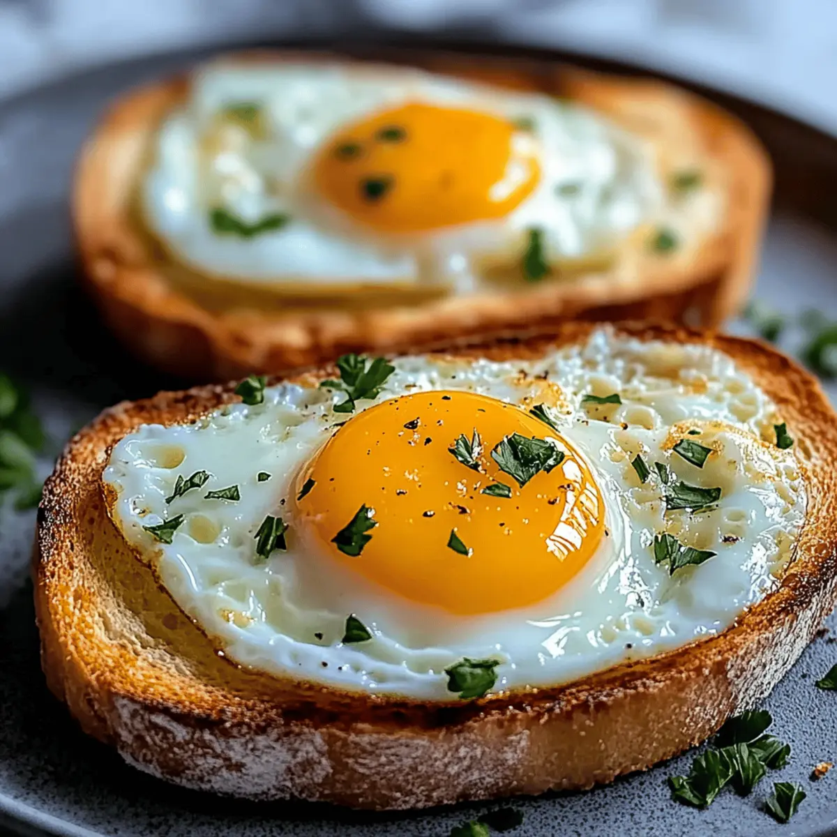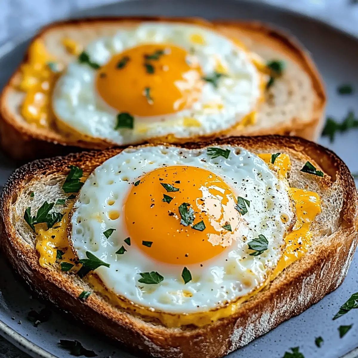 Jump to Recipe Print RecipeThe aroma of freshly toasted bread wafting through the kitchen can instantly lift spirits, don’t you agree? This is the magic of my Air Fryer Egg and Cheese Toast, a cozy breakfast that marries crunchy bread with a soft, runny egg and melted cheese in a delightful way. As someone who loves to whip up quick meals, I can’t stress enough how this recipe stands out. It’s not only a breeze to prepare in under 10 minutes, but it’s also fully customizable to suit whatever ingredients you have on hand. Whether you prefer a classic cheddar or a dairy-free option, this egg and cheese toast ticks all the boxes. Plus, it’s kid-friendly, making it a perfect candidate for those busy weekday mornings. So, why wait? Ready to dive into the deliciousness? Let’s get started! Why is this Egg and Cheese Toast a must-try? Quick and Easy: This recipe takes just under 10 minutes, making it perfect for busy mornings or lazy weekends. Customizable Delight: You can easily adjust it to meet your taste preferences—swap in your favorite cheese or add veggies like spinach for an extra nutrient boost. Try a sprinkle of paprika for a flavor upgrade! Crowd-Pleaser: Whether for a family breakfast or a brunch with friends, this dish caters to everyone’s cravings, just like my trendy Cheese Grape Skewers or Cream Cheese Salami Roll-Ups. Perfectly Crispy: The air fryer achieves that golden brown toastiness you crave, with the added bonus of an oozy egg yolk that elevates the entire meal. Healthier Option: Ditch the takeout! Enjoy a tasty breakfast while keeping it nutritious and potentially dairy-free, just like the options in my Broccoli Cheese Rounds. Egg and Cheese Toast Ingredients • Get ready to whip up an easy breakfast favorite! For the Toast Thick Bread – Use a hearty sourdough or sandwich bread to prevent sogginess. Butter – Optional, but a little butter adds richness and helps achieve that crispy finish. For the Egg Filling Eggs – The star of this dish; crack one into each slice for a delicious, runny center. Scrambled eggs also work well! Shredded Cheese – Cheddar is a classic choice for its meltability and flavor; alternatives like mozzarella or pepper jack will also elevate your egg and cheese toast. For Seasoning & Toppings Salt and Pepper – Essential for enhancing the flavor of your egg and cheese toast. Fresh Parsley or Chives – Chop some fresh herbs for a burst of color and freshness on top. Step‑by‑Step Instructions for Egg and Cheese Toast Step 1: Preheat the Air Fryer Begin by preheating your air fryer to 375°F (190°C). This essential step ensures that your Egg and Cheese Toast cooks evenly and achieves that delightful crispy texture. While the air fryer heats up, gather all your ingredients and prepare your workspace so you can assemble the toast efficiently. Step 2: Prepare the Bread Take your thick slices of bread and lightly butter one side of each. This will enhance the flavor and help them crisp up beautifully in the air fryer. Then, use a small glass or your finger to press a well into the center of each slice. This well is where your egg will sit, creating that perfect egg and cheese toast. Step 3: Add the Eggs Carefully crack an egg into the well you’ve created in each slice of bread. Make sure the yolk stays intact for that lovely runny center once cooked. If you prefer scrambled eggs, feel free to use those instead—just make sure you don’t overfill the well. This is the heart of your Egg and Cheese Toast, so take your time with this step! Step 4: Sprinkle the Cheese Next, sprinkle your shredded cheese around the edges of the egg in each well. This layer of cheese will melt beautifully during cooking, adding richness and flavor to your Egg and Cheese Toast. Cheddar works great, but feel free to experiment with mozzarella or other favorites—your toast will be delicious regardless! Step 5: Air Fry to Perfection Place the prepared slices of bread in the air fryer basket. Cook for 6-8 minutes at 375°F (190°C). Check at about 6 minutes for runny yolks and continue to air fry for up to 8 minutes if you prefer firm yolks. Keep an eye on the cheese—it should be bubbly and golden, giving you that irresistible look and smell. Step 6: Season and Serve Once done, carefully remove the toast from the air fryer. Season your freshly made Egg and Cheese Toast with salt and pepper to taste. Add freshly chopped parsley or chives as a vibrant finishing touch. This simple step brightens up the overall dish, enhancing both flavor and presentation. Enjoy your quick, satisfying breakfast! Expert Tips for Egg and Cheese Toast • Choose the Right Bread: Thicker slices prevent sogginess and provide a sturdy base, ensuring your Egg and Cheese Toast holds up nicely. • Perfect Egg Timing: Keep an eye on the cooking time; check your egg at the 6-minute mark for runny yolks or continue cooking for 8 minutes for firmer yolks. • Don’t Overload the Well: While it’s tempting to add extra fillings, avoid overfilling the well with egg to prevent spills and ensure even cooking. • Experiment with Cheese: Try different cheeses like mozzarella, pepper jack, or a dairy-free option to find your perfect flavor combination for Egg and Cheese Toast. • Add Fresh Toppings: Fresh herbs like parsley or chives not only enhance flavor but also add a pop of color to your dish, making it more appetizing. Egg and Cheese Toast Variations Ready to add your personal touch to the beloved Egg and Cheese Toast? Let your culinary creativity shine with these delicious variations! Dairy-Free: Opt for a dairy-free cheese alternative to cater to vegan diets without sacrificing flavor. Veggie-Loaded: Toss in diced bell peppers, spinach, or tomatoes into the egg well for a colorful nutrient boost. Spice It Up: Sprinkle paprika, chili powder, or even hot sauce around the egg for an extra kick of flavor! Herbed Delight: Substitute fresh parsley or chives with basil or cilantro f