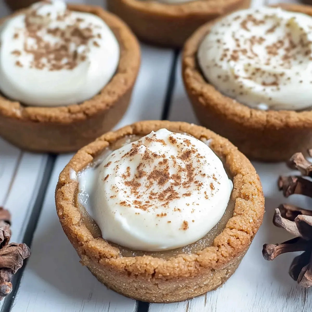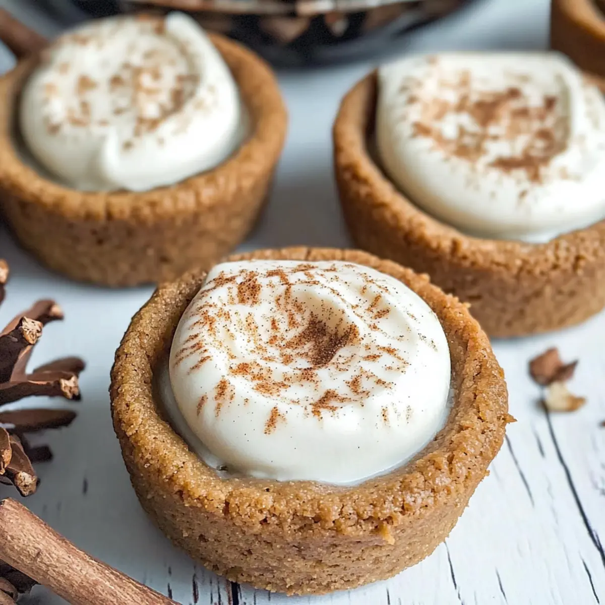 Jump to Recipe Print RecipeThe aroma of freshly baked gingerbread wafting through the house feels like a warm hug from the holidays. That’s exactly what you’ll experience with these delightful Eggnog Cheesecake Cookie Cups. Imagine a chewy gingerbread base cradling a light, fluffy no-bake eggnog cheesecake filling that’s perfect for festive gatherings. Not only are these cookie cups super easy to whip up, making them a fantastic last-minute treat, but they also beautifully blend classic holiday flavors in every irresistible bite. Imagine sharing these at your next holiday party, delighting family and friends with a dessert that’s sure to be the star of the show. Ready to bring some festive cheer into your kitchen? Let’s dive into this deliciously simple recipe! Why are Eggnog Cheesecake Cookie Cups irresistible? Festive Flavors: These cookie cups combine classic gingerbread and eggnog tastes, creating a dessert that’s bursting with holiday spirit. No-Bake Ease: The no-bake eggnog cheesecake filling saves time while delivering a creamy texture that’s simply divine. Perfect for Gatherings: These delightful treats are sure to impress guests at holiday gatherings, making them a popular choice among party desserts. Versatile Delight: Feel free to swap the gingerbread with other cookie bases, like chocolate or Oreo Cheesecake Decadent, to create your own twist! Make-Ahead Magic: Bake the cookie cups in advance and fill just before serving for an easy, stress-free dessert option that tastes fresh every time. Eggnog Cheesecake Cookie Cups Ingredients For the Gingerbread Cookie Base All-Purpose Flour – Provides structure; can be substituted with gluten-free flour for a gluten-free version. Baking Soda – Acts as a leavening agent for a lovely rise. Ground Cinnamon – Adds warmth and spice, enhancing the cookie flavor. Ground Ginger – Elevates the gingerbread essence. Ground Cloves – Offers a deep, aromatic flavor profile. Salt – Balances sweetness and enhances all the flavors. Unsalted Butter – Creates a tender cookie texture; make sure it’s at room temperature for easy mixing. Light Brown Sugar – Adds moisture and a hint of caramel; don’t substitute with white sugar for best results. Fancy Molasses – Gives the cookies their signature sweetness and gingerbread flavor; avoid blackstrap molasses as it’s too potent. Egg – Binds the ingredients and provides moisture; use a room temperature egg for a better mix. For the Eggnog Cheesecake Filling Heavy Whipping Cream – Whipped for a light filling; ensure it’s cold for perfect whipping. Cream Cheese – Forms the base of the rich cheesecake filling; soften it for easier blending. Granulated Sugar – Sweetens the cheesecake filling beautifully. Eggnog – Infuses that quintessential holiday flavor into the cream; can be replaced with a non-dairy variety for a vegan option. Ground Nutmeg – Complements the eggnog delightfully. Pinch of Ground Cinnamon – Elevates the overall flavor profile. Step‑by‑Step Instructions for Eggnog Cheesecake Cookie Cups Step 1: Preheat and Prepare Begin by preheating your oven to 350°F (175°C). While it heats, grease a standard muffin tin with non-stick spray or butter, ensuring each cup is well-coated. This will prevent your gingerbread cookie cups from sticking later. The warmth of the oven sets the stage for perfectly baked, chewy gingerbread bases. Step 2: Mix Dry Ingredients In a medium-sized mixing bowl, whisk together 2 cups of all-purpose flour, 1 teaspoon of baking soda, and a blend of spices: 1 teaspoon cinnamon, 1 teaspoon ground ginger, ½ teaspoon ground cloves, and a pinch of salt. This combination not only adds flavor but will also provide structure to your eggnog cheesecake cookie cups. Set aside for now, admiring the inviting scents of the spices. Step 3: Cream Butter and Sugar In a large mixing bowl, beat together ½ cup of room-temperature unsalted butter, ½ cup of light brown sugar, and ¼ cup of fancy molasses using an electric mixer. Mix on medium speed until the mixture becomes light and fluffy, which should take about 2-3 minutes. This step is crucial for achieving that tender cookie texture essential for your Eggnog Cheesecake Cookie Cups. Step 4: Combine Ingredients Next, crack in 1 room-temperature egg and mix it into your buttery sugar blend until fully combined. Gradually incorporate the dry mixture you prepared earlier, stirring until the dough comes together and shows no dry flour. The dough should feel soft yet slightly sticky, ready to be molded into delightful cookie cups. Step 5: Form Cookie Cups Using a cookie scoop or your hands, scoop about 1 tablespoon of dough into each muffin cup, slightly flattening the dough to ensure an even bake. Place the muffin tin in your preheated oven, baking for 9-10 minutes. The edges should appear set while the centers may look slightly underbaked; this is perfect for a chewy base. Step 6: Create Wells After baking, remove the muffin tin from the oven and let it cool for about 2 minutes. Gently press down the centers of each cookie cup using a small spoon to create a well for the eggnog cheesecake filling. Allow the cookie cups to cool completely in the tin, as this helps maintain their shape while cooling. Step 7: Make Filling While your cookie cups cool, prepare the creamy filling. In a chilled mixing bowl, whip 1 cup of heavy whipping cream on medium-high speed until stiff peaks form, which should take about 3-5 minutes. In a separate bowl, blend 8 ounces of softened cream cheese, ½ cup of granulated sugar, and ½ cup of eggnog until smooth. Then, gently fold in the whipped cream, ensuring the mixture remains light and airy. Step 8: Fill Cookie Cups Once the cookie cups have completely cooled, pipe or scoop your fluffy eggnog cheesecake filling into each well. Fill them generously, allowing the filling to overflow slightly for a lovely presentation. Refrigerate the filled Eggnog Cheesecake Cookie Cups 