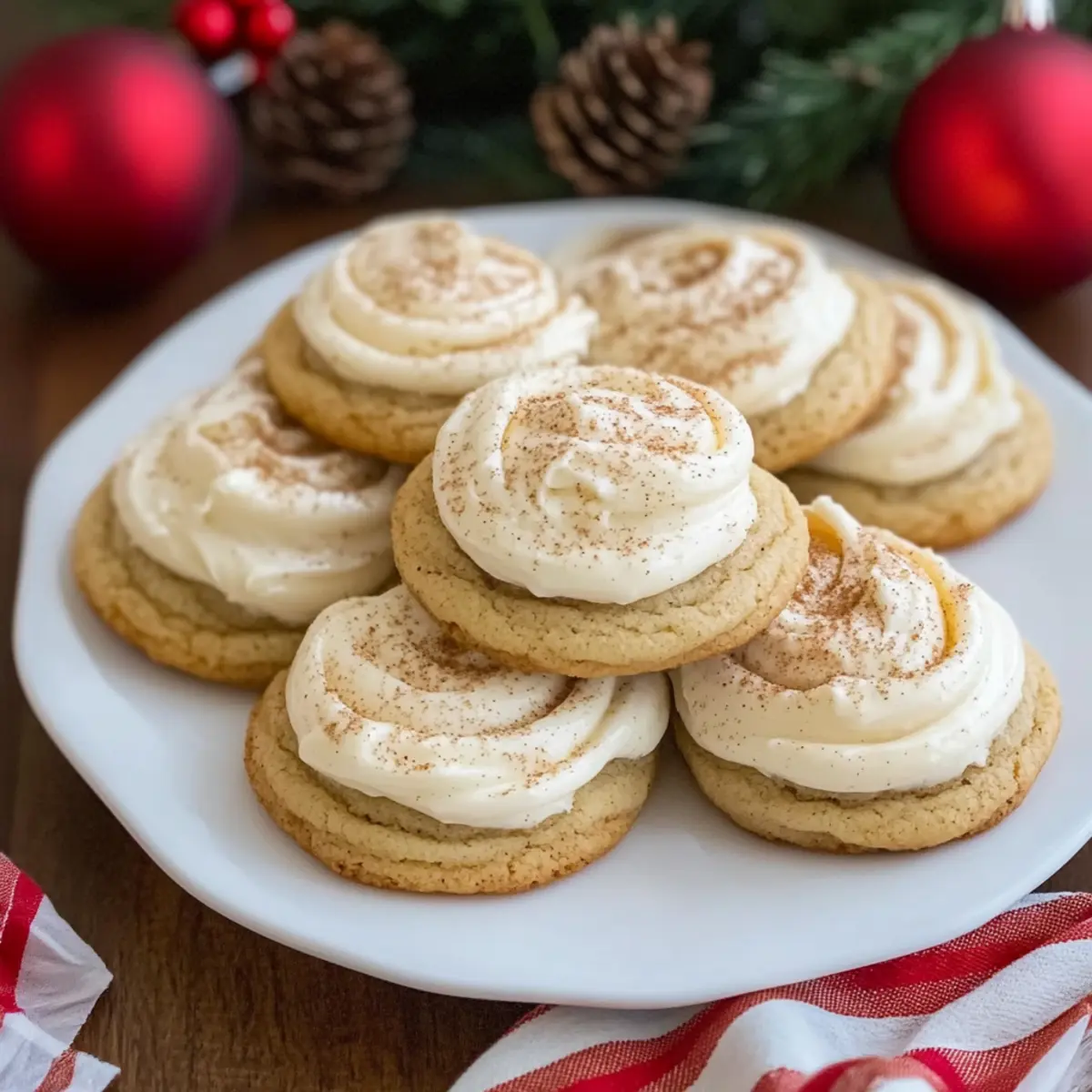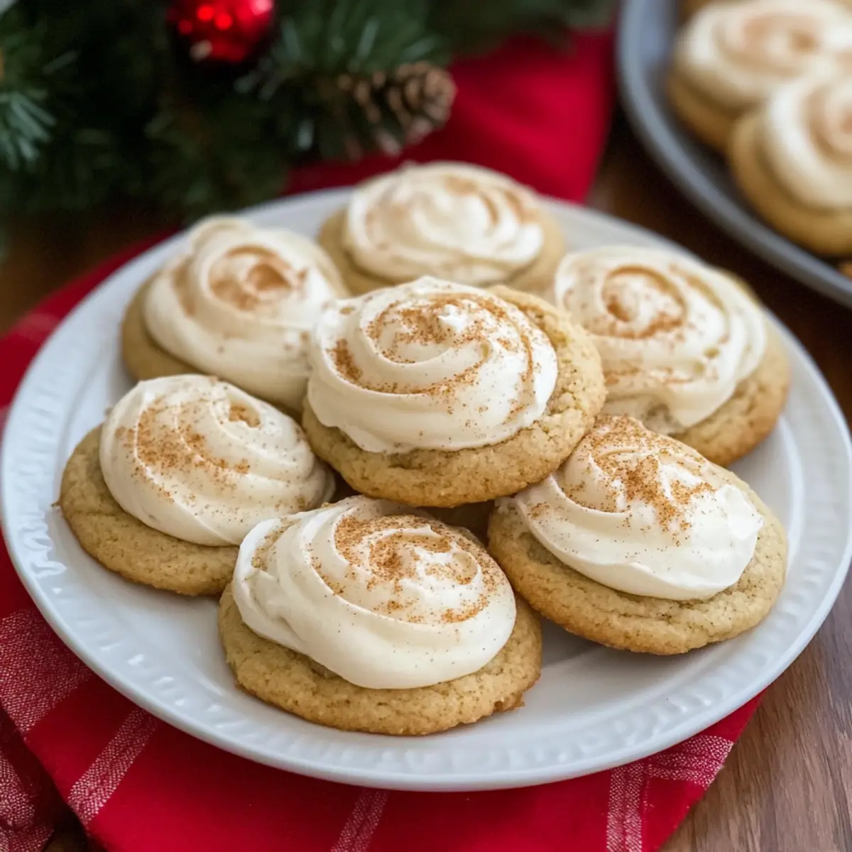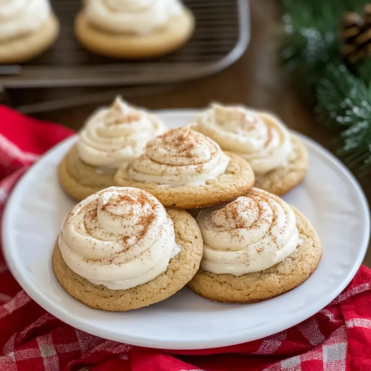 Jump to Recipe Print RecipeAs I whisk together the ingredients for these Soft Eggnog Cookies with Creamy Frosting, the cozy scent of nutmeg and cinnamon fills my kitchen, instantly transporting me to the heart of the holiday season. Perfectly soft and a joy to share, these festive treats are quick to whip up and even better to enjoy with loved ones. The creamy frosting adds an irresistible touch, making them a standout addition to any holiday gathering. Not only do they embrace the warm nostalgia of classic Christmas cookies, but they also bring a delightful twist that’s perfect for those looking to step away from the usual fast food offerings. Are you ready to transform your holiday baking with a recipe that’s sure to be a crowd-pleaser? Why Are These Eggnog Cookies Special? Irresistible flavors: Each bite of these Soft Eggnog Cookies bursts with warm spices like nutmeg and cinnamon, reminiscent of your favorite holiday drink. Easy to make: This simple recipe requires minimal effort, making it perfect for both seasoned bakers and beginners looking to impress. Creamy frosting: The silky frosting effortlessly elevates these cookies, creating a dessert that’s not only delicious but visually appealing as well. Perfect for sharing: Bake a batch for holiday parties or cozy family gatherings, and watch them disappear in no time! Versatile options: Don’t hesitate to swap spices or even whip up a chocolate version – the possibilities are deliciously endless! Dive into the festive spirit with these cookies and consider pairing them with chilled eggnog or a warm cup of coffee for a delightful treat! Eggnog Cookies with Creamy Frosting Ingredients • Grab your apron and let’s get started on these delightful Eggnog Cookies with Creamy Frosting! For the Cookies All-purpose flour – A key player that provides structure to your cookies; substitute with a gluten-free blend if needed. Baking powder – Ensures your cookies rise beautifully, offering that light texture. Salt – A pinch for balancing sweet flavors and enhancing overall taste. Ground nutmeg & cinnamon – These cozy spices give your cookies their classic eggnog flavor; feel free to swap with pumpkin spice if you want. Unsalted butter – This creates a tender cookie base; make sure it’s at room temperature for easy mixing. Granulated sugar – Sweetens the dough while adding moisture for that melt-in-your-mouth experience. Light brown sugar – Contributes extra richness and moisture to the cookies. Large egg yolks – Brings a custardy richness that mimics the creamy texture of eggnog. Vanilla extract – Enhances the flavor and rounds out the sweetness. Rum extract – Infuses authentic eggnog taste; optional, but highly recommended for a true holiday feel. Full-fat eggnog – Adds moisture and rich eggnog flavor; avoid low-fat for the best results. For the Creamy Frosting Powdered sugar – Sweetens and provides a silky texture for the frosting. Additional eggnog – Used to achieve the perfect frosting consistency; adjust to your preference. Get ready to bake some magic, and don’t forget that each bite of these Eggnog Cookies with Creamy Frosting will fill your holiday gatherings with warmth and joy! Step‑by‑Step Instructions for Eggnog Cookies with Creamy Frosting Step 1: Preheat and Prepare Start by preheating your oven to 350°F (180°C). While the oven warms up, line your baking sheets with parchment paper for easy cookie transfer. Make sure you have everything ready, as the warmth will set the stage for perfectly baked Eggnog Cookies with Creamy Frosting. Step 2: Whisk the Dry Ingredients In a mixing bowl, whisk together the all-purpose flour, baking powder, salt, ground nutmeg, and cinnamon. This essential step not only combines the dry ingredients but also aerates them, ensuring that your cookies will rise beautifully. Set this mixture aside for later use in your cookie dough. Step 3: Cream the Butter and Sugars In a stand mixer, beat the room-temperature unsalted butter, granulated sugar, and light brown sugar until the mixture is pale and fluffy, about 2-3 minutes. This creaming process is crucial as it creates a light texture for your Eggnog Cookies, so make sure to blend well before moving on. Step 4: Incorporate the Egg Yolks and Flavorings Add the large egg yolks one at a time to the butter-sugar mixture, mixing well after each addition. Follow this with the vanilla extract, rum extract, and full-fat eggnog. Continue mixing until the ingredients are fully combined, creating a rich, creamy batter that embodies the essence of holiday cheer. Step 5: Mix in the Dry Ingredients Gradually add the whisked dry ingredients to the wet mixture at low speed. Mix until just combined, ensuring you don’t overmix, as this will help keep your Eggnog Cookies tender. Look for a soft, cohesive dough that’s ready to be scooped onto your baking sheets. Step 6: Scoop and Shape the Cookies Using a cookie scoop or spoon, drop rounded portions of dough onto the prepared baking sheets, spacing them about 2 inches apart. The dough should look soft and slightly mounded, indicating that your cookies will puff up beautifully while baking in the oven. Step 7: Bake the Cookies Place the baking sheets in the preheated oven and bake for 11-13 minutes, or until the edges are just lightly golden. Be careful not to overbake; the centers should remain soft and cake-like. Once done, allow the cookies to cool on the baking sheets for a few minutes before transferring them to a wire rack. Step 8: Prepare the Creamy Frosting While the cookies cool, prepare the frosting by whipping the unsalted butter in a mixing bowl until fluffy, around 2 minutes. Gradually mix in the powdered sugar and just enough eggnog until you achieve a smooth, creamy consistency that’s ready to dollop on your cooled Eggnog Cookies. Step 9: Frost and Garnish the Cookies Once the cookies have completely cooled, generously frost each cookie with the creamy mixture. T