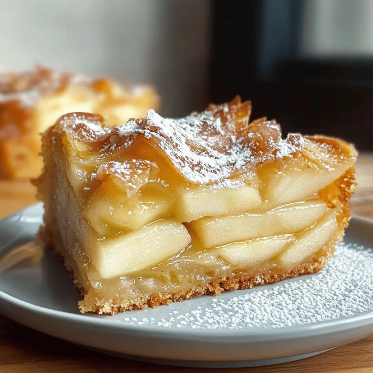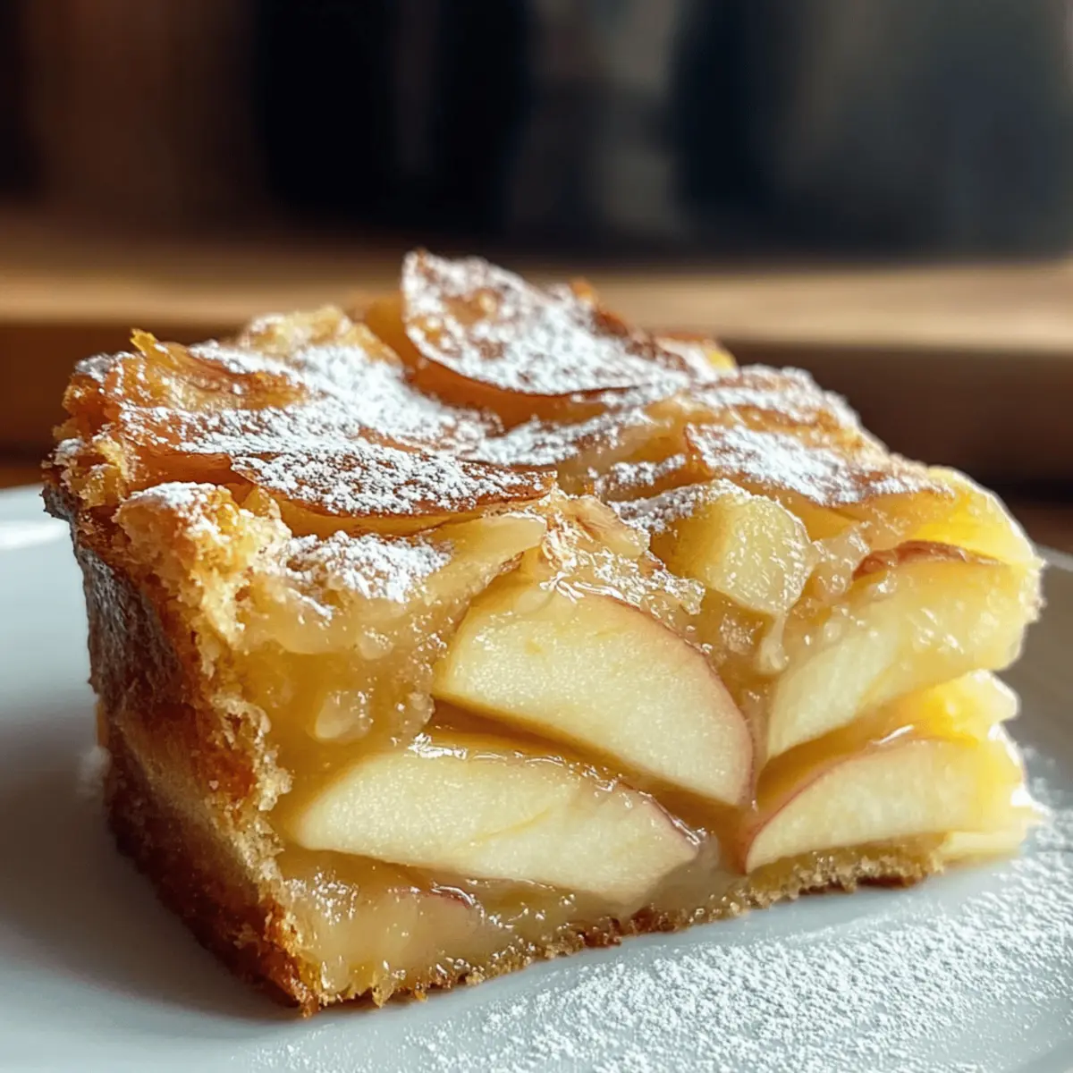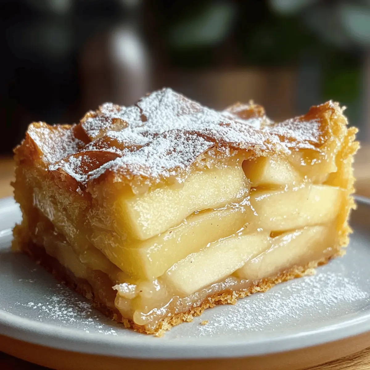 Jump to Recipe Print RecipeAs I stood in my kitchen, the aroma of buttery goodness and sweet apples wafted through the air, transporting me straight to the charming bakeries of France. The star of the day? The delightful French Apple Invisible Cake. This elegant creation features thinly sliced apples enveloped in a light batter, resulting in a dessert that’s both moist and airy. One of the best parts about this recipe is its quick prep time—perfect for those evenings when you want a homemade treat without the fuss! Additionally, it’s versatile enough for various dietary preferences, making it a crowd-pleaser at any gathering. So, are you ready to whip up something that beautifully combines simplicity and sophistication? Let’s dive into this delicious adventure together! Why is French Apple Cake so special? Lightness: This French Apple Invisible Cake is delightfully airy, making it the perfect dessert to enjoy without feeling weighed down. Flavorful: The balance of sweet apples and rich butter creates a uniquely luscious flavor profile that feels indulgent yet not overwhelming. Quick Prep: With a simple preparation process, it can be whipped up in no time—ideal for impromptu gatherings or cozy nights at home. Versatile: Adaptable for gluten-free and vegan diets, this recipe ensures everyone can share in the pleasure, making it a cookbook staple. Visual Appeal: The artistic layering of apples creates a stunning presentation, turning your dessert into an eye-catching centerpiece. Satisfying: Enjoy each slice knowing it’s a lighter option, combining the natural sweetness of fruit with a hint of cake—perfect served warm with a scoop of vanilla ice cream or a dollop of whipped cream for extra indulgence! French Apple Cake Ingredients • Delight in the simplicity of these ingredients that come together to create a delicious French Apple Invisible Cake! For the Cake Batter Apples – Provide moisture and sweetness; use firm varieties like Golden Delicious for best results. Eggs – Act as a binder; be sure to beat them until fluffy for an airy texture. Granulated Sugar – Adds the right amount of sweetness to the cake. Brown Sugar – Offers enhanced flavor with its caramel notes. Butter – Contributes richness and moisture; substitute with plant-based butter for a vegan option. Whole Milk – Ensures tenderness in the cake; can be replaced with non-dairy milk for a vegan adaptation. Vanilla Extract – Brings aromatic sweetness, elevating the overall flavor. All-Purpose Flour – Provides the necessary structure; a gluten-free flour blend works well for gluten-free versions. Baking Powder – Helps the cake to rise and achieve that lovely lightness. Salt – Enhances the cake’s overall flavor profile. For the Topping Sliced Almonds – Add a delightful crunch on top; feel free to use walnuts or pecans as alternatives. This French Apple cake comes together with these simple yet lovely ingredients. Enjoy the cozy moments that follow! Step‑by‑Step Instructions for French Apple Invisible Cake Step 1: Preheat and Prepare the Pan Start by preheating your oven to 350°F (175°C). While it warms, take a loaf or square baking pan and grease it generously with butter or non-stick spray, then line the bottom with parchment paper. This will ensure your French Apple Invisible Cake releases easily after baking. Step 2: Slice the Apples Next, prepare your apples by peeling, coring, and slicing them very thinly. For uniform slices that cook evenly, consider using a mandoline slicer. Aim for about 1/8-inch thickness, as this allows the apples to meld beautifully with the batter, creating that signature invisible look. Step 3: Whisk the Eggs and Sugars In a large mixing bowl, whisk together the eggs, granulated sugar, and brown sugar until the mixture is light, fluffy, and pale in color; this should take about 3-4 minutes. This whipped base provides the structure needed for our French Apple Invisible Cake, ensuring it rises nicely in the oven. Step 4: Combine Wet Ingredients Now, gently stir in the melted butter, whole milk, and vanilla extract into the egg mixture. Mix until these wet ingredients are fully incorporated, creating a smooth and creamy batter. This step adds richness and moisture to the cake, ensuring every bite is delectably light and flavorful. Step 5: Mix Dry Ingredients Sift the all-purpose flour, baking powder, and salt directly into the wet mixture, ensuring there are no lumps. Whisk until the batter is smooth and fully combined. This process is crucial for a light texture in your French Apple Invisible Cake, helping to create that airy sponge. Step 6: Fold in the Apples Gently fold the thinly sliced apples into the batter, ensuring each piece is well-coated. Be careful not to overmix; you want to maintain the fluffiness of the batter. The apples should be evenly distributed, creating a beautiful network of fruit throughout the cake. Step 7: Transfer to the Baking Pan Pour the apple mixture into the prepared baking pan, pressing down lightly to remove any air pockets. Sprinkle sliced almonds on top for added crunch, ensuring they’re evenly distributed over the surface. This will give your cake an inviting texture and aesthetic when baked. Step 8: Bake the Cake Place the baking pan in the preheated oven and bake for 45-50 minutes. The cake is done when it turns a lovely golden brown and springs back when gently pressed in the center. A toothpick inserted should come out clean, indicating a perfectly baked French Apple Invisible Cake. Step 9: Cool and Serve Once baked, allow the cake to cool completely in the pan on a wire rack. This resting period helps it set properly for slicing. Before serving, dust the cooled cake with powdered sugar to add a touch of sweetness and elegance. Enjoy it warm or at room temperature for the best flavor! Make Ahead Options These French Apple Invisible Cakes are perfect for meal prep enthusiasts! You can prepare the batter and slice the a
