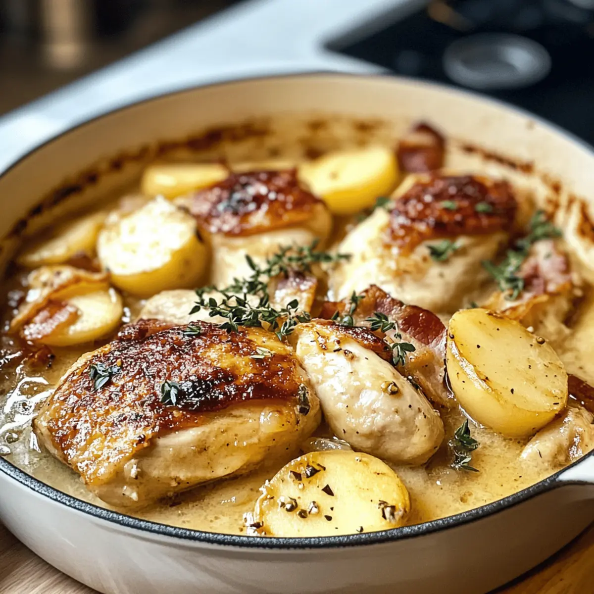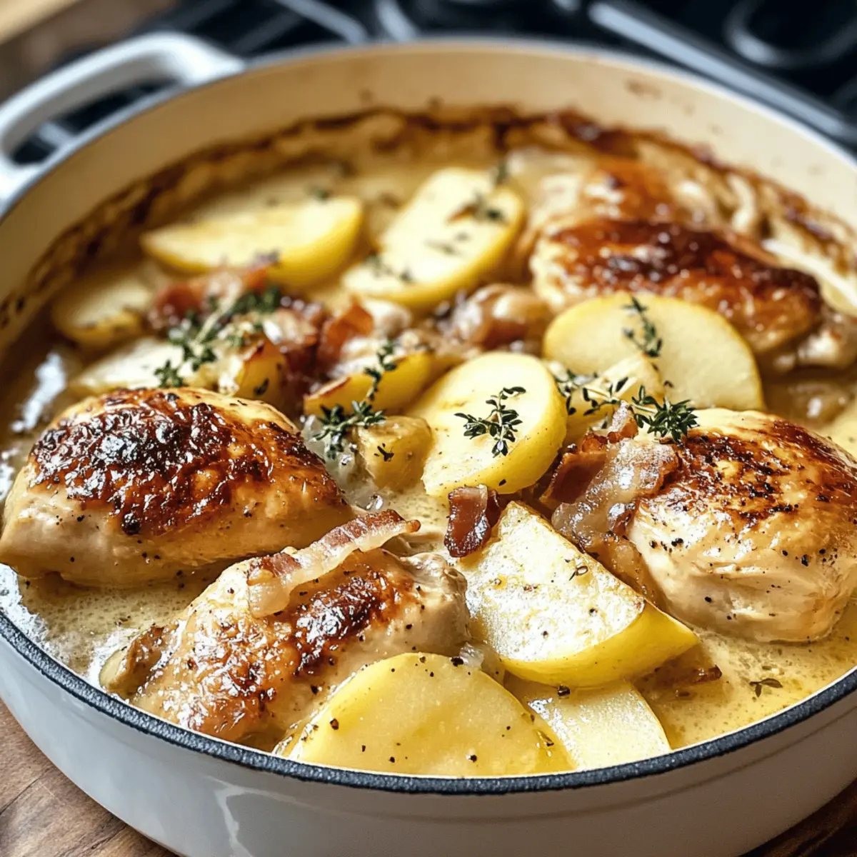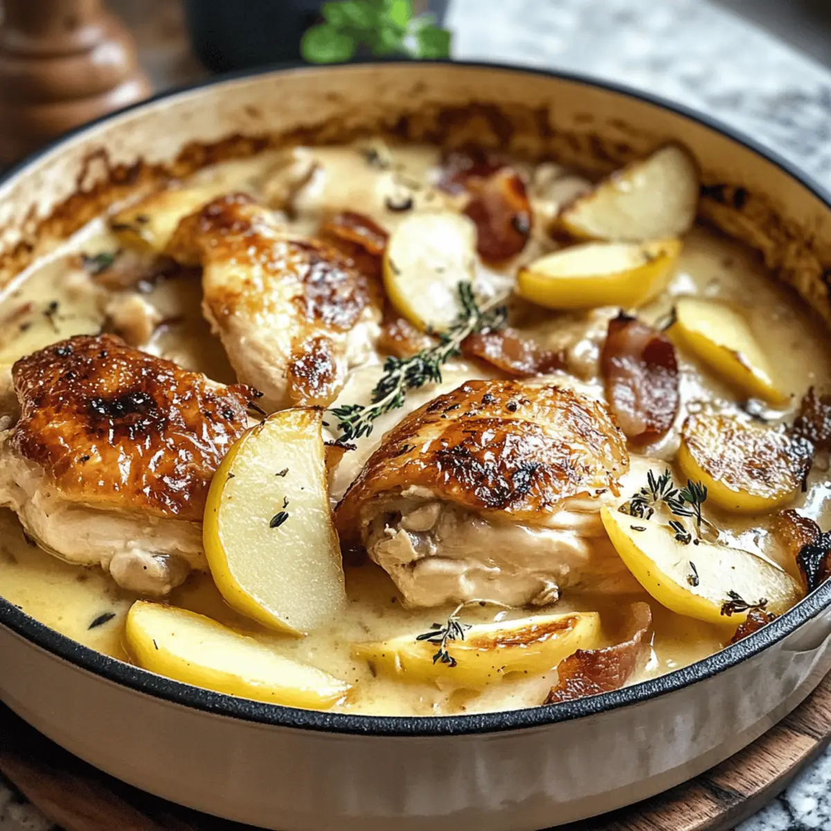 Jump to Recipe Print RecipeThe aroma wafting from the kitchen can transport me straight to the charming countryside of France, where comfort food reigns supreme. This French Chicken Casserole a la Normande is a delightful blend of tender chicken, smoky bacon, and sweet apples, all simmered together in a rich cider-infused sauce. It’s not just a meal; it’s a warm hug on a plate that brings joy to family dinners, making it a true crowd-pleaser, especially during cozy evenings. Plus, the prep is surprisingly quick, leaving you plenty of time to enjoy the company of your loved ones. Intrigued? Let’s dive into this heartwarming dish that’s sure to become a favorite in your kitchen! Why is this casserole a must-try? Cozy Comfort: This French Chicken Casserole a la Normande is the ultimate comfort food that warms the soul, combining tender chicken and sweet apples in a rich sauce. Flavor Explosion: With the delightful smokiness of bacon and aromatic thyme, each bite bursts with flavor that lingers on your palate. Quick Prep Time: Spend less time in the kitchen with this easy recipe that transitions seamlessly from prep to oven, freeing you to connect with loved ones. Endless Versatility: Try pairing it with mashed potatoes or crusty bread, making it adaptable to any side while still remaining the star of the show. Healthier Options: Want a lighter touch? You can easily swap in turkey bacon or non-dairy cream for a guilt-free twist. Each serving will leave family and friends asking for seconds—they won’t even notice there’s no fast food in sight! Want more cozy recipes? Check out this Garlic Parmesan Chicken or Fiery Chicken Ramen for more inspiration! French Chicken Casserole a la Normande Ingredients Discover the delightful combination of flavors in this comforting dish! For the Casserole Chicken Thighs and Legs – A juicy and tender protein source that brings richness to the dish. Bacon – Adds a smoky depth of flavor; feel free to use turkey bacon for a healthier alternative. Shallots – These lend a sweet, aromatic quality to the dish; onions can be swapped in if you’re out of shallots. Celery – Provides a subtle crunch; it can be omitted if needed, but enhances flavor depth. Thyme – This fresh herb brightens the dish; dried thyme works well too—just reduce the amount. Garlic – A must for adding depth; fresh is best, but garlic powder could work if you’re in a pinch. For the Sauce Brandy or Whiskey – Great for deglazing and adding flavor; substitute apple cider vinegar if you prefer to avoid alcohol. Flour – Thickens the sauce beautifully; cornstarch can serve as a gluten-free alternative. Chicken Stock – The flavorful base for the sauce; opt for low-sodium for a lighter touch. Apple Cider – Essential for authentic sweetness; make sure to use unfiltered cider for the best results. Heavy Cream – Adds wonderful creaminess; you can skip it or use a lighter option if preferred. For the Apples Apples – Choose a firm variety to balance the dish; Granny Smith apples are perfect for their tartness. This French Chicken Casserole a la Normande will warm your heart and home with every bite! Enjoy bringing this cozy dish to your table. Step‑by‑Step Instructions for French Chicken Casserole a la Normande Step 1: Prepare Chicken Begin by patting the chicken thighs and legs dry with paper towels and seasoning them generously with salt. In a large, oven-safe skillet or casserole dish, heat a splash of olive oil over medium-high heat. Add chicken pieces skin-side down and sear them for about 5-7 minutes, or until golden brown. Flip and cook for an additional 5 minutes before removing the chicken and setting it aside. Step 2: Cook Bacon In the same skillet, add chopped bacon pieces and cook over medium heat until they turn crispy, taking about 4-5 minutes. Stir occasionally to ensure even cooking. Once crispy, use a slotted spoon to remove the bacon and set it aside on a paper towel-lined plate, leaving the rendered fat in the pan. Step 3: Sauté Vegetables Next, add finely chopped shallots and diced celery to the skillet with the reserved bacon fat. Sauté for about 4-5 minutes, stirring occasionally, until they soften and become fragrant. Stir in fresh thyme and minced garlic, cooking for an additional 30 seconds until the garlic is aromatic but not burnt. Step 4: Deglaze Pour in the brandy or whiskey to deglaze the skillet, scraping up any brown bits from the bottom with a wooden spoon. Allow the alcohol to cook off for about 2 minutes. Next, whisk in flour to create a paste and cook for 1-2 minutes until it lightly browns, infusing the mixture with flavor. Step 5: Combine Liquids Gradually pour in chicken stock and apple cider, stirring continuously to avoid lumps. Bring the mixture to a gentle simmer—in about 3-4 minutes, it should begin to thicken slightly. Check the seasoning and adjust with salt and pepper to taste, ensuring a harmonious balance for the French Chicken Casserole a la Normande. Step 6: Bake Return the browned chicken and crispy bacon to the skillet. Bring everything to a boil over medium-high heat, then cover with a lid and transfer to a preheated oven at 350°F (180°C). Bake for 30 minutes, then remove the lid and continue baking for another 30 minutes, allowing the chicken to become tender and the sauce to deepen in flavor. Step 7: Apple Preparation While the dish bakes, core and slice the apples into wedges. In a small skillet, heat a splash of reserved bacon fat over medium heat. Fry the apple wedges for about 5-7 minutes until they turn golden and caramelized, stirring occasionally to ensure even cooking. Step 8: Finish Sauce Once the casserole is done baking, carefully remove it from the oven and stir in heavy cream for added richness. Cook the entire dish uncovered on the stovetop over low heat for an additional 20 minutes, allowing the flavors to meld beautifully. Finally, fold in the fried apple wedges just before serving to enha