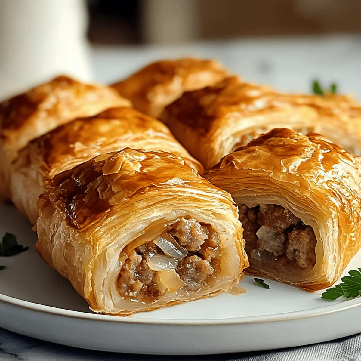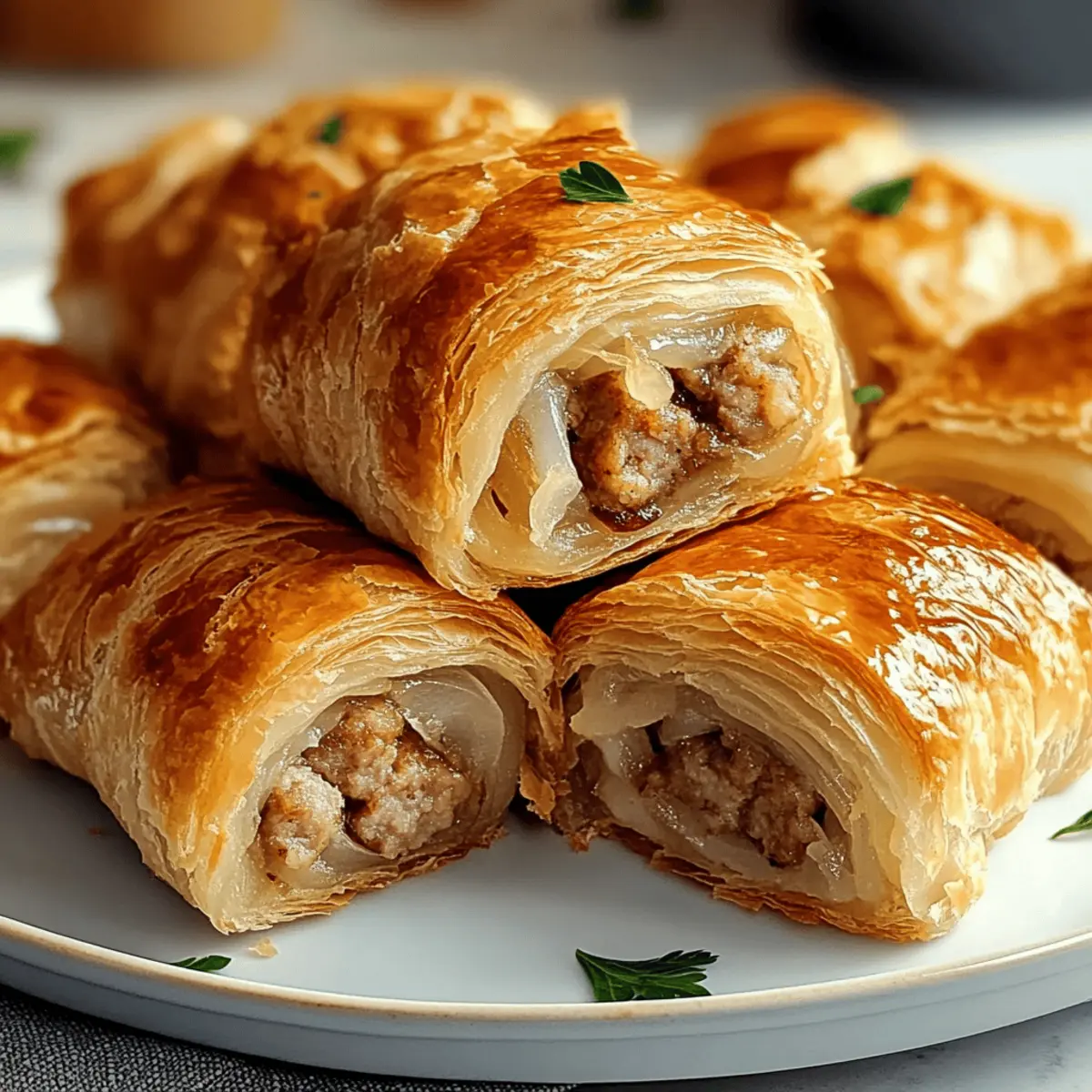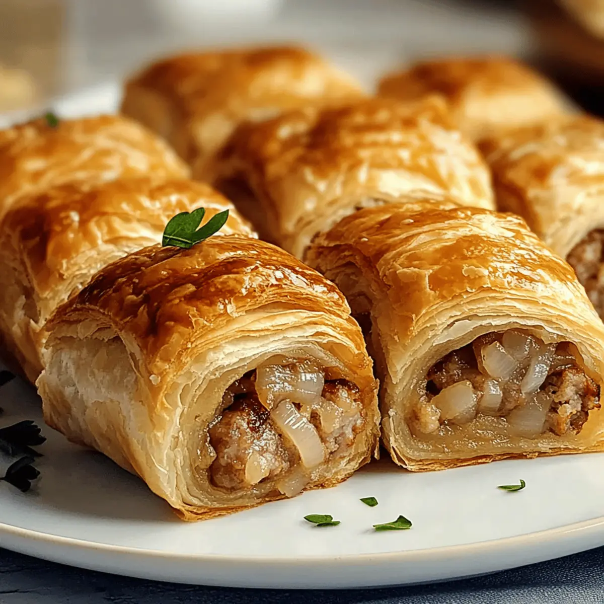 Jump to Recipe Print RecipeAs the aroma of caramelized onions wafts through my kitchen, a wave of comfort washes over me. French Onion Sausage Rolls are my go-to for any gathering, providing a perfect balance of flaky pastry and savory filling that pleases crowds and comforts the soul. Whether you’re hosting a game night or craving a cozy treat, this recipe stands out with its customizable options, allowing you to swap sausages, cheese, or even go vegetarian with ease. Plus, these delightful rolls come together quickly, making them an accessible yet impressive addition to your culinary repertoire. Are you ready to roll up your sleeves and dive into making these scrumptious bites? Why Try These Savory Rolls? Flavorful, the fusion of savory sausage and sweet caramelized onions wrapped in flaky pastry will make your taste buds dance. Customizable, whether you prefer pork, chicken, or plant-based sausage, this recipe adapts to your preferences. Crowd-Pleaser, they are perfect for parties and gatherings, guaranteed to impress your guests. Quick to make, you’ll have these gourmet snacks ready in just 30 minutes! Versatile, pair them with honey mustard or aioli for an extra flavor kick, or serve alongside a fresh salad for a complete meal. French Onion Sausage Rolls Ingredients For the Filling • Ground Sausage – Provides the savory base of the filling; try pork, chicken, turkey, or plant-based sausage for versatility. • Onions – Essential for caramelization; sweet or yellow onions work best for a rich flavor. • Olive Oil – Used for sautéing onions until beautifully caramelized, enhancing their sweetness. • Thyme – Adds an earthy depth; if fresh isn’t available, dried thyme will do the trick. • Salt and Pepper – Essential seasonings to enhance the overall flavor profile. For the Pastry • Puff Pastry – Forms the flaky exterior; pre-made, thawed sheets from the store save time. • Egg (Beaten) – Adds a golden-brown color when brushed on before baking. Optional Ingredients • Gruyère Cheese – Introduces richness and creaminess to the filling, elevating the flavor. • Dijon Mustard – A tangy contrast that beautifully offsets the sweet onions, enhancing the overall experience. Step‑by‑Step Instructions for French Onion Sausage Rolls Step 1: Caramelize the Onions In a large skillet, heat 2 tablespoons of olive oil over medium heat. Add 2 large sliced yellow or sweet onions and a pinch of salt. Cook, stirring occasionally, for about 15-20 minutes or until the onions are soft and golden brown. This will enhance their sweetness and develop rich flavors essential for your French Onion Sausage Rolls. Step 2: Prepare the Filling Once the onions have caramelized, remove them from heat and let them cool slightly. In a mixing bowl, combine the cooled onions with 1 pound of ground sausage, 1 teaspoon of thyme, and a sprinkle of salt and pepper. For added richness, mix in ½ cup of Gruyère cheese and 1 tablespoon of Dijon mustard if desired. Ensure everything is well combined for an even distribution of flavors. Step 3: Preheat the Oven While the filling cools, preheat your oven to 400°F (200°C). Line a baking sheet with parchment paper to prevent sticking and facilitate easy cleanup. The hot oven will help your French Onion Sausage Rolls achieve that perfect golden-brown finish. Step 4: Assemble the Rolls Lightly flour your work surface and roll out one sheet of thawed puff pastry to about ¼ inch thick. Cut the pastry into rectangles, approximately 4×6 inches each. Place a generous tablespoon of the sausage filling in the center of each rectangle. Fold the pastry over the filling, pressing the edges to seal tightly and prevent any leakage during baking. Step 5: Brush with Egg Wash In a small bowl, beat 1 egg to create an egg wash. Brush the tops of each sealed roll generously with the egg wash, which will give your French Onion Sausage Rolls a beautiful shiny and golden finish as they bake. Use a fork to poke a few small holes in the top to allow steam to escape. Step 6: Bake the Rolls Carefully transfer the assembled rolls to the prepared baking sheet, spacing them out to allow for expansion. Bake in the preheated oven for 20-25 minutes or until the pastry is puffed and golden brown. The aroma of savory sausage and caramelized onions will fill your kitchen, signaling that they’re almost ready to savor. Step 7: Cool and Serve Once baked, remove the French Onion Sausage Rolls from the oven and let them cool slightly on the baking sheet. This allows the filling to set slightly, making them easier to handle. Serve warm with your choice of dipping sauces like honey mustard or aioli, and watch everyone enjoy every delicious bite! French Onion Sausage Rolls Variations Feel free to get creative with these variations to make this delicious dish truly yours! Sausage Swap: Try spicy Italian or sweet chicken sausage for a flavor twist that fits your palate. The combination of spices in different sausages adds depth to the rolls that will surprise your taste buds! Vegetarian Delight: Replace ground sausage with sautéed mushrooms or lentils along with cheese. This veggie alternative captures the hearty essence while keeping it meat-free, allowing herbivores to indulge equally. Extra Veggies: Add finely chopped bell peppers, spinach, or grated zucchini to the filling for a nutritious boost. This not only enhances the texture but also packs in extra flavors that harmonize beautifully with the sweetness of the onions. Cheese Variation: Switch Gruyère for sharp cheddar or creamy mozzarella for a delightful cheese profile. Each cheese melts differently, giving your rolls a unique gooeyness that can be explored in every delicious bite. Herb Infusion: Mix in fresh herbs like dill or basil alongside the thyme for a fragrant filling. This aromatic addition brightens the flavors and adds a fresh note that complements the caramelized onions wonderfully. Spicy Addition: Add a teaspo