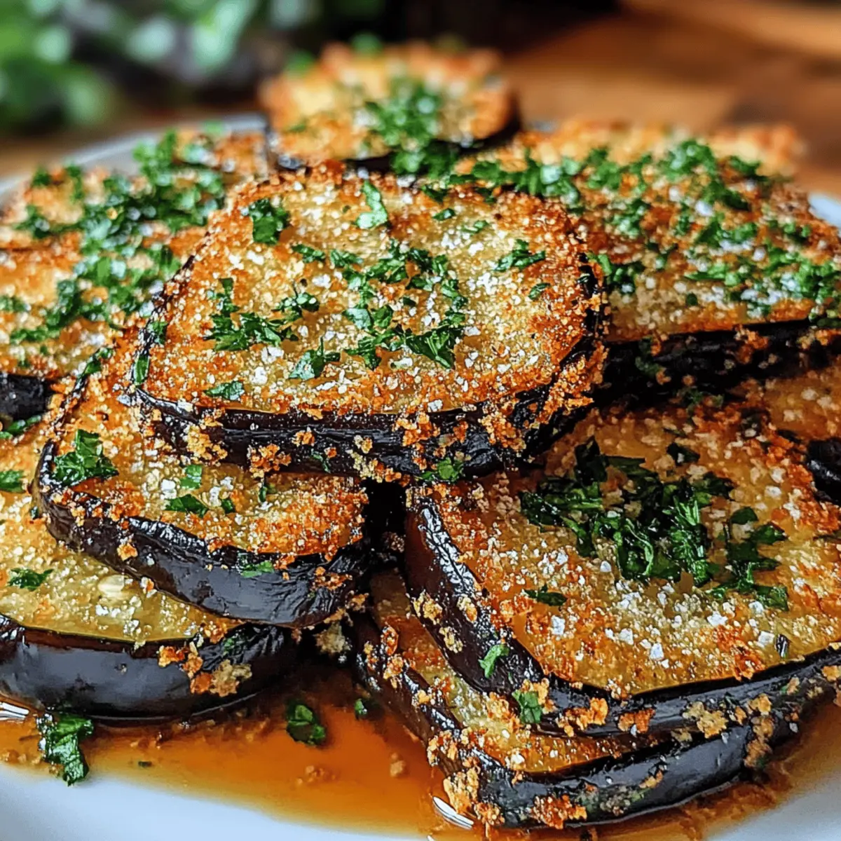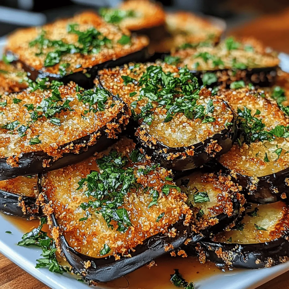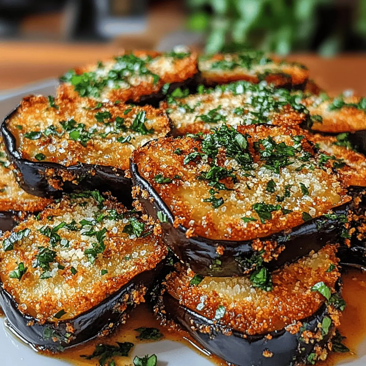Jump to Recipe Print RecipeThe aroma of baking eggplant wafts through the kitchen, transporting me to my favorite Italian trattoria. Today, I’m whipping up Garlic Herb Crusted Eggplant Slices, a recipe that’s become my go-to for impressing friends and family. These crispy delights are not only a feast for the senses, but they’re also a healthier alternative to fried snacks, making them perfect for any gathering or simple weeknight dinner. With their crunchy herb-infused crust and tender interior, they cater to both plant-based eaters and meat lovers alike. Plus, the easy prep means you can spend less time in the kitchen and more time enjoying the company of those you love. Are you ready to discover a new favorite that’s both delicious and nutritious? Let’s dive into this recipe! Why Are Garlic Herb Crusted Eggplant Slices Special? Deliciously Unique: These Garlic Herb Crusted Eggplant Slices are a true crowd-pleaser, combining a crispy texture with earthy flavors that everyone loves. Simple Preparation: With straightforward steps and minimal ingredients, this recipe is easy to follow, making dinner prep a breeze. Healthier Option: Enjoy all the crunch and flavor without the excessive calories—these baked slices are much lighter than traditional fried snacks. Versatile Serving: Whether as an appetizer, side dish, or topping for grain bowls or sandwiches, these slices fit perfectly into any meal. Endless Variations: You can cater to different diets by easily swapping cheese for nutritional yeast for a vegan twist or customizing herbs to your liking. Pair them with a nice dip like marinara sauce or tzatziki for a delightful touch, and you’ll be sure to impress your guests! Garlic Herb Crusted Eggplant Slices Ingredients • Dive into the flavorful world of Garlic Herb Crusted Eggplant Slices! For the Eggplant Eggplant – The star of the dish; choose firm, shiny varieties for best results. For the Crunchy Coating Panko Breadcrumbs – Offers an extra crispy texture that elevates your slices. Parmesan Cheese – Adds richness and umami; opt for rennet-free for vegetarian needs. Fresh Herbs (Parsley and Thyme) – Brings brightness and aromatic qualities; fresh herbs elevate flavor. Garlic – Provides depth and warmth; use fresh minced garlic for robust flavor. For Coating and Baking Eggs – Acts as an adhesive for the coating and a barrier for moisture during baking. Olive Oil – Essential for bringing crispiness; high-quality extra virgin is best for flavor. Salt & Pepper – Enhances the overall flavor; crucial for seasoning the mixture and eggplant. Now that you have these delicious ingredients on hand, you’re well on your way to creating a dish that’s not just tasty but also brings joy to your table. Whether it’s a cozy dinner with family or a gathering with friends, these Garlic Herb Crusted Eggplant Slices will surely delight! Step‑by‑Step Instructions for Garlic Herb Crusted Eggplant Slices Step 1: Preheat the Oven Begin by preheating your oven to 425°F (220°C). While the oven heats, prepare a baking sheet by lining it with parchment paper to prevent sticking. This step ensures a crispy base for your Garlic Herb Crusted Eggplant Slices, creating the perfect environment for baking. Step 2: Prepare the Eggplant Slice the firm eggplant into ½-inch rounds and place them in a colander. Sprinkle the slices generously with salt, allowing them to sit for about 30 minutes. This process draws out excess moisture, making your eggplant slices firmer and allowing the crust to adhere better once baked. Rinse and pat them dry with a paper towel after. Step 3: Make the Coating Mixture In a medium bowl, combine the panko breadcrumbs, grated Parmesan cheese, minced garlic, chopped fresh herbs like parsley and thyme, along with salt and pepper to taste. Mix well until the ingredients are evenly distributed, creating a flavorful coating that will elevate your Garlic Herb Crusted Eggplant Slices to the next level. Step 4: Prepare the Egg Wash In a separate bowl, whisk together the eggs and a splash of olive oil until well combined. This mixture serves as an adhesive that helps the breadcrumb coating stick to the eggplant slices, ensuring a delicious crunch when they come out of the oven. Step 5: Coat the Eggplant Slices Take each eggplant slice and dip it first into the egg wash, ensuring it’s fully coated. Then, transfer it to the breadcrumb mixture, pressing gently to make sure the crumbs adhere well to both sides. This double-dipping technique guarantees a hearty, crispy crust on each Garlic Herb Crusted Eggplant Slice. Step 6: Bake to Perfection Arrange the coated eggplant slices on the prepared baking sheet, leaving space between them to allow for even cooking. Bake in the preheated oven for about 20-25 minutes, flipping halfway through. You’re looking for a crispy golden-brown exterior that signifies they’re ready to be enjoyed. Step 7: Allow to Cool and Serve Once baked to perfection, remove the Garlic Herb Crusted Eggplant Slices from the oven and let them cool slightly on the baking sheet. This step helps them crisp up even more. Serve warm as a delightful appetizer, side dish, or topping for your favorite salads and sandwiches to impress your guests. Storage Tips for Garlic Herb Crusted Eggplant Slices Fridge: Store leftovers in an airtight container in the refrigerator for up to 3 days. This keeps your Garlic Herb Crusted Eggplant Slices fresh and ready to enjoy anytime. Freezer: If you want to save them for later, freeze the baked slices on a baking sheet in a single layer for 1-2 hours before transferring to a freezer-safe bag. They can last up to 2 months. Reheating: For best results, reheat in the oven at 350°F (175°C) for about 10-15 minutes to restore their crispiness; microwaving may lead to sogginess. Make Ahead Options These Garlic Herb Crusted Eggplant Slices are a fantastic meal prep option, allowing you to save valuable time on busy weeknights! 