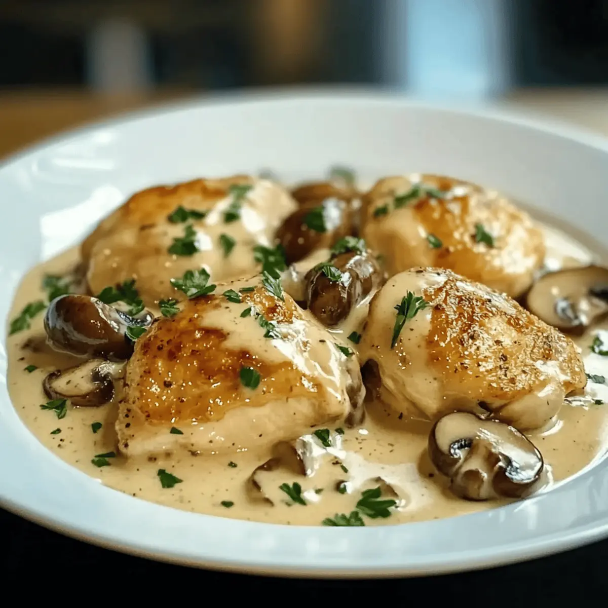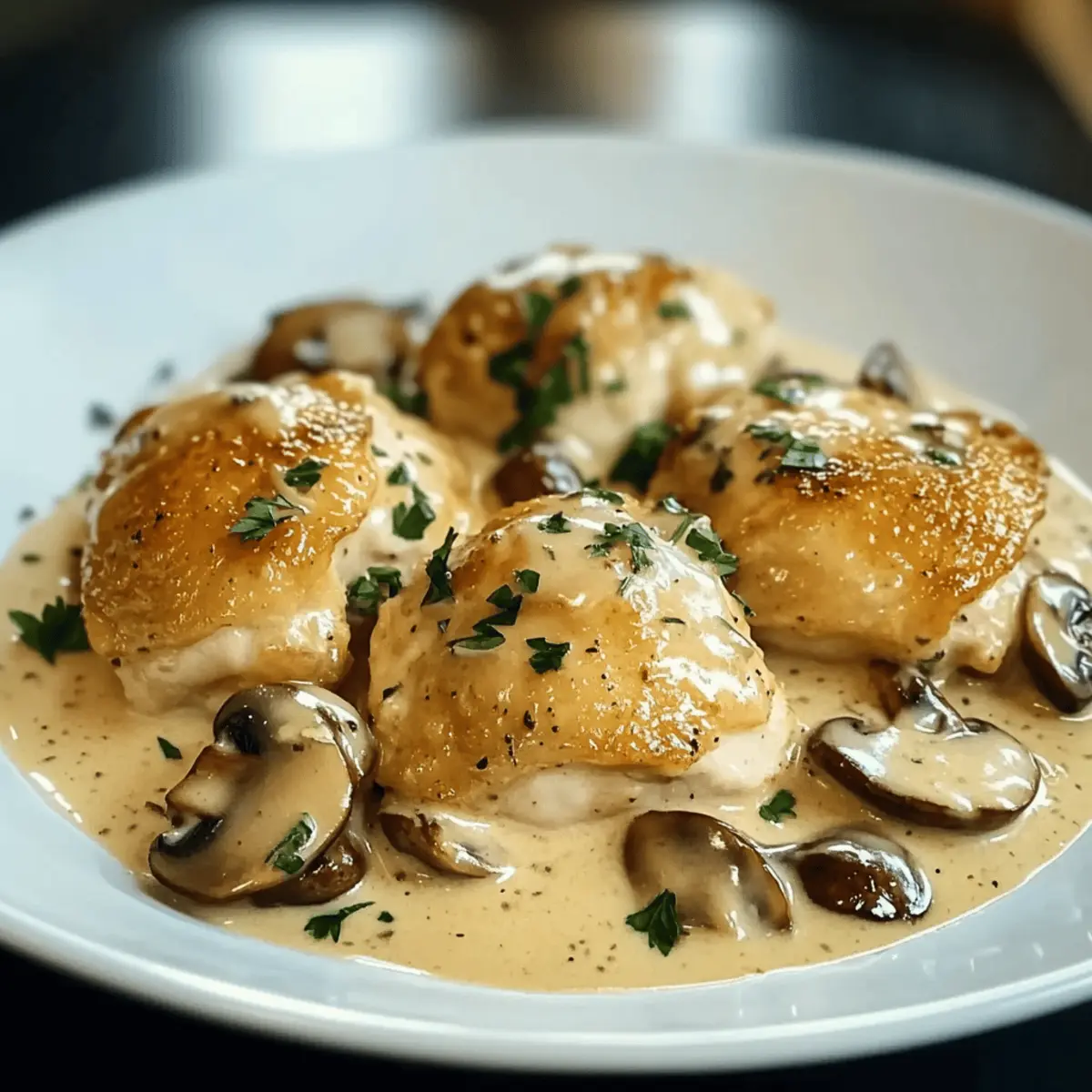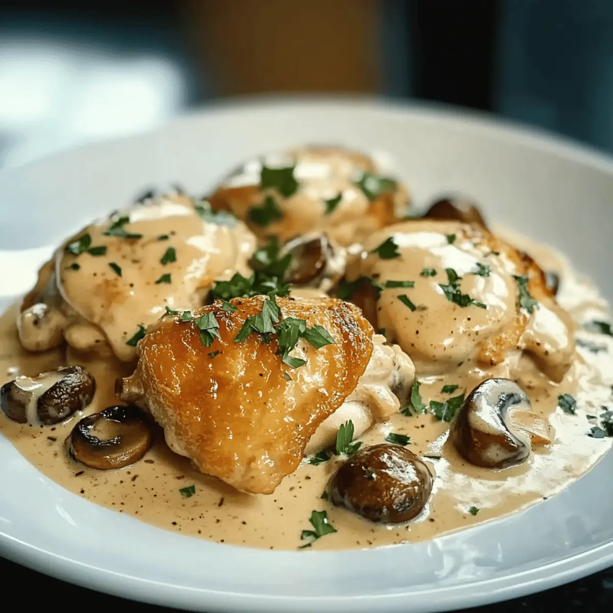 Jump to Recipe Print RecipeAs I stood over the stove, the air filled with a harmonious blend of garlic and earthy mushrooms, I couldn’t help but smile. This was the moment I always craved—a comforting, home-cooked meal with a touch of elegance. Today, I’m excited to share my recipe for Creamy Garlic Mushroom Chicken Thighs, which is not only gluten-free but also a show-stopping dish that can elevate a casual weeknight dinner to something special. With juicy chicken thighs coated in a velvety sauce, this dish is all about simplicity and flavor. You’ll love how quick it is to prepare, making it a perfect go-to when you want to impress without the stress. So, are you ready to create an unforgettable meal that everyone will rave about? Let’s dive in! Why is Garlic Mushroom Chicken So Irresistible? Comforting, rich flavors: The combination of garlic, creamy sauce, and tender chicken thighs makes this dish a true indulgence. Quick & easy: With straightforward steps and simple ingredients, you’ll have a delicious meal on the table in no time. Versatile & adaptable: Feel free to substitute the mushrooms or add your favorite veggies, making it your own! Crowd-pleaser: This dish is sure to impress family and friends, perfect for both casual and special occasions. Healthier option: Enjoy this creamy delight guilt-free by opting for gluten-free broth and dairy-free cream alternatives if needed. Whether you pair this with creamy mashed potatoes or a fresh salad, it’s bound to become a favorite in your home! Garlic Mushroom Chicken Ingredients • A creamy delight awaits! For the Chicken Chicken Thighs – Juicy and flavorful, they hold up beautifully in the creamy sauce. For the Sauce Mushrooms (Cremini/Button/Baby Bella) – These earthy gems add depth and texture; you can swap for shiitake or portobello if you like. Garlic – Fresh minced garlic brings unparalleled aromatic flavor; don’t skimp on this key ingredient! Chicken Broth – Use gluten-free broth for a deliciously rich sauce that’s safe for gluten-sensitive diets. Heavy Cream – Creates a rich and silky finish; substitute with coconut cream or cashew cream for a dairy-free option. Butter & Olive Oil – Essential for sautéing, enhancing the overall flavor of the dish. Seasoning & Garnish Salt & Pepper – These basics elevate the dish, rounding out the flavors perfectly. Fresh Parsley or Thyme – Garnish with herbs for a pop of color and a hint of freshness, making the dish as delightful to look at as it is to eat! This Garlic Mushroom Chicken recipe offers pure comfort in every bite, and it’s perfect for impressing your dinner companions or enjoying a simple yet elegant meal at home. Step‑by‑Step Instructions for Creamy Garlic Mushroom Chicken Thighs Step 1: Prepare the Chicken Begin by patting the chicken thighs dry with paper towels; this step ensures the skin crisps beautifully. Season both sides generously with salt and pepper, focusing on every corner for maximum flavor enhancement. Set the seasoned chicken aside while you prepare the skillet. Step 2: Sear the Chicken In a large skillet, heat 2 tablespoons of butter and 2 tablespoons of olive oil over medium-high heat until shimmering. Carefully place the chicken thighs skin-side down in the hot skillet and sear for 5-7 minutes, until the skin is crispy and golden brown. Flip the thighs and cook for another 2 minutes, then transfer them to a plate and set aside. Step 3: Cook the Aromatics Using the same skillet, add 8 ounces of sliced mushrooms to the leftover fat, cooking for about 4-5 minutes until they turn nicely browned. Stir in 3 minced garlic cloves and sauté until fragrant, approximately 1 minute. This combination will deepen the flavor profile of your Creamy Garlic Mushroom Chicken. Step 4: Build the Sauce Pour in 1 cup of chicken broth, scrapping any flavorful bits from the skillet’s bottom. Allow the mixture to cook for 2-3 minutes, reducing slightly. Next, stir in 1 cup of heavy cream, mixing well. Let the sauce simmer gently over medium heat until it thickens, about 5 minutes, creating a luscious consistency. Step 5: Combine & Simmer Return the seared chicken thighs to the skillet, nestling them into the creamy sauce. Cover the skillet with a lid, reduce the heat to low, and allow everything to simmer for 10-12 minutes, or until the chicken reaches an internal temperature of 165°F (75°C). The chicken will absorb the delicious flavors from the sauce during this step. Step 6: Garnish & Serve Once the chicken is cooked, remove the skillet from the heat. Sprinkle freshly chopped parsley or thyme over the top for a vibrant touch. Serve the Creamy Garlic Mushroom Chicken Thighs directly from the skillet, allowing your guests to enjoy this warm and inviting dish straight from the stovetop. Garlic Mushroom Chicken Variations Feel free to let your creativity shine by customizing this delicious dish with these fun variations! Dairy-Free Cream: Swap heavy cream with coconut cream for a lighter, dairy-free alternative. It adds a hint of tropical flavor that wonderfully complements the mushrooms. Gluten-Free Option: Use gluten-free broth to cater to dietary needs while retaining rich, comforting flavors in the sauce. Feel free to explore options that suit your taste! Extra Greens: Add fresh spinach or asparagus to the sauce for a burst of color and nutrition. These vegetables contribute delightful freshness and texture to the Creamy Garlic Mushroom Chicken. Herb Swap: Experiment with rosemary or tarragon instead of thyme for a unique herbal twist. Each herb brings its own distinct flavor profile, elevating your dish to new heights! Mushroom Mix: Try a variety of wild mushrooms like oyster, shiitake, or portobello for added depth and a gourmet touch. The more mushroom varieties, the more complex and delightful the flavor becomes. Spice It Up: Add a pinch of red pepper flakes or a dash of sriracha to the sauce for a fiery kick that balances the creamin