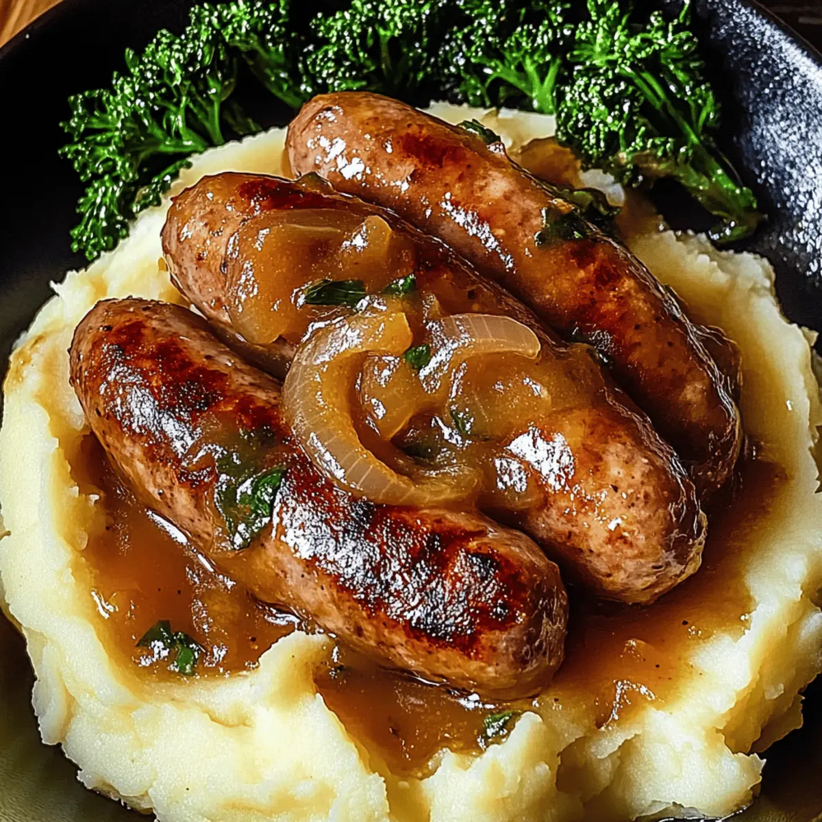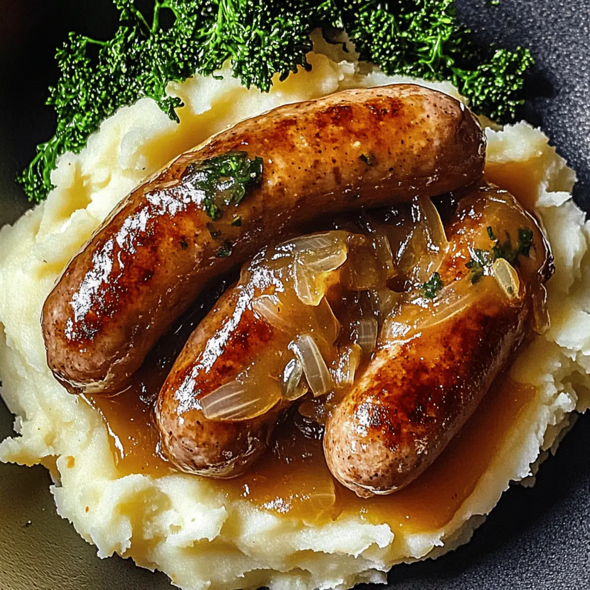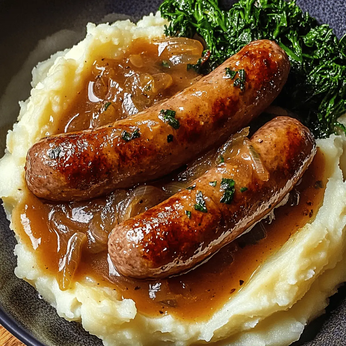 Jump to Recipe Print RecipeThe aroma of sizzling sausages and caramelized onions wafts through my kitchen, instantly transporting me to cozy evenings spent with loved ones. That’s the magic of Gordon Ramsay’s Sausage and Onion Gravy—this hearty dish elevates everyday ingredients into pure comfort food bliss. Perfectly rich and velvety, this sauce not only complements fluffy mashed potatoes like a dream, but it also offers the flexibility of gluten-free options for those looking to indulge without the guilt. As someone who cherishes the art of home cooking, I find this recipe to be a wonderfully satisfying way to embrace the joy of delicious homemade meals. Ready to turn your evening into an exquisite flavor experience? Grab your apron, and let’s dive in! Why Is This Recipe So Special? Simplicity at its core: With just a handful of ingredients, this recipe makes hearty comfort food accessible to everyone. Rich, complex flavors shine through when you let the sausages brown and the onions caramelize—transforming your kitchen into a warm haven. Versatile options are available; whether you prefer traditional pork sausages or gluten-free alternatives, there’s a flavor journey for everyone. Crowd-pleasing goodness: Serve this velvety gravy over mashed potatoes, and watch it disappear at dinner parties or family gatherings. Quick & satisfying: In under an hour, you can create a memorable meal that warms the heart as much as it fills the stomach. Why not explore similar favorites like Cheesy Ranch Sausage and Pepper Sausage Pasta for more delicious inspiration? Gordon Ramsay Sausage Onion Gravy Ingredients For the Gravy Olive Oil – Adds fat for sautéing; substitute with vegetable oil for a neutral flavor. Sausages (8) – The flavor base; Ramsay prefers high-fat British pork or Cumberland—try veggie sausages for a vegetarian option. Onions (2 large, thinly sliced) – Key for sweetness and body; essential for depth of flavor; substitute with shallots for a sweeter texture. Minced Garlic (1 tsp) – Enhances overall flavor with a bold punch; use garlic powder if fresh isn’t available. Unsalted Butter (2 tbsp) – Adds richness and helps in making the roux; olive oil can be used for a dairy-free version. Plain Flour (3 tbsp) – Acts as a thickening agent; substitute with gluten-free flour for a gluten-free option. Beef Stock (2 cups/500 ml) – Provides a savory backbone; swap with chicken stock for a lighter taste. Thyme (1 sprig, optional) – Adds aromatic herbaceous notes; can replace with rosemary or omit if unavailable. Worcestershire Sauce (1 tsp) – Introduces umami depth; skip for vegetarian versions or find a vegetarian alternative. Black Pepper (½ tsp) – Offers heat; adjust seasoning to your preference. Salt – To taste; crucial for proper seasoning. Now that you’ve got the essential ingredients ready, let’s uncover the mouthwatering steps to bring this Gordon Ramsay Sausage Onion Gravy to life! Step‑by‑Step Instructions for Gordon Ramsay Sausage Onion Gravy Step 1: Heat the Pan Begin by heating a wide non-stick pan over medium heat. Add a drizzle of olive oil and allow it to shimmer before introducing the sausages. Carefully place the sausages in the pan, ensuring they aren’t overcrowded. Brown them on all sides for approximately 6-8 minutes until they’re golden and cooked through. Once done, remove the sausages from the pan and let them rest on a plate. Step 2: Sauté Onions In the same pan, keep about 1 tablespoon of the sausage fat to enhance flavor. Add the thinly sliced onions along with a pinch of salt, then stir to coat. Cook for 3-4 minutes, allowing the onions to soften and become translucent. As they cook, stir occasionally to prevent sticking and promote even caramelization, which adds depth to the Gordon Ramsay Sausage Onion Gravy. Step 3: Add Garlic and Butter Next, introduce the minced garlic to the softened onions and stir for about 30 seconds until fragrant. Then, add the unsalted butter and stir until it melts completely. This addition enriches the gravy’s flavor profile, creating a luscious base for your sauce. Keep stirring for an even blend as the butter combines with the onions and garlic. Step 4: Create the Roux Sprinkle the plain flour over the onion mixture and quickly stir to form a paste. Allow this roux to cook for 1 minute; this step is crucial for eliminating any raw flour taste. The mixture will thicken slightly and take on a golden hue. This foundation strengthens the sauce, ensuring a rich consistency for your Gordon Ramsay Sausage Onion Gravy. Step 5: Incorporate Beef Stock Gradually pour in the beef stock while continuously whisking to avoid lumps. Ensure the mixture is smooth and homogeneous as the stock combines with the roux. Stir in the Worcestershire sauce, thyme, and black pepper for added flavor. Bring the mixture to a gentle simmer over low heat and let it cook for about 2-3 minutes until it thickens to your desired consistency. Step 6: Final Touches Once the gravy has thickened beautifully, taste and adjust seasoning with salt and pepper as needed. Now, return the browned sausages to the pan, stirring them gently into the gravy. Let them warm through for another 2 minutes, allowing them to soak up the luscious flavors of the Gordon Ramsay Sausage Onion Gravy. Step 7: Serve and Enjoy Your comforting dish is now ready! Serve the rich sausage and onion gravy hot over a generous scoop of creamy mashed potatoes. For a pop of color and nutrition, garnish with steamed greens on the side. Enjoy this ultimate comfort meal that’s sure to keep everyone coming back for more! How to Store and Freeze Gordon Ramsay Sausage Onion Gravy Fridge: Store leftovers in an airtight container for up to 3 days to keep the flavors fresh and the gravy creamy. Freezer: For longer storage, freeze in airtight containers for up to 3 months. Label with the date for easy tracking. Thawing: To enjoy later, thaw the gravy overnight in the 